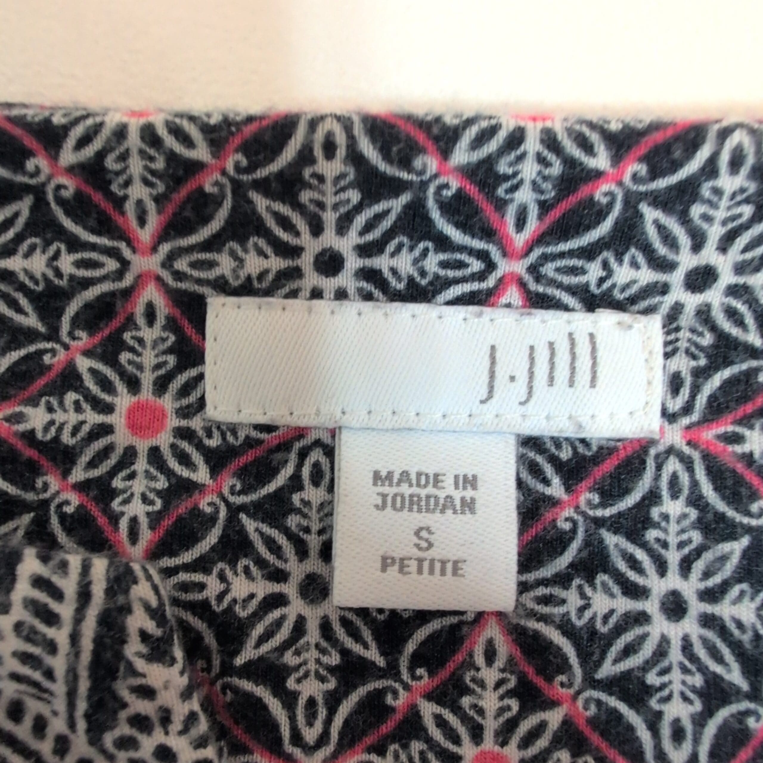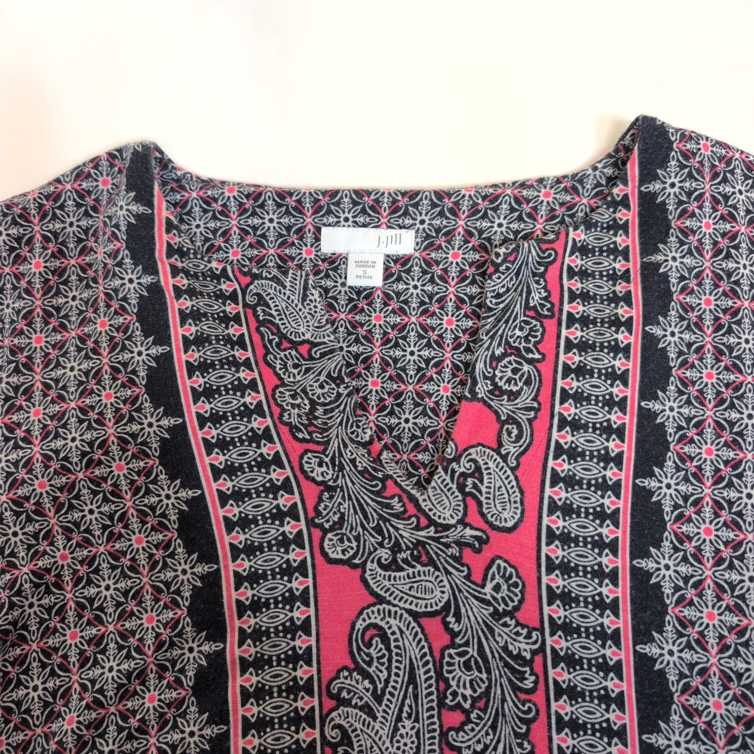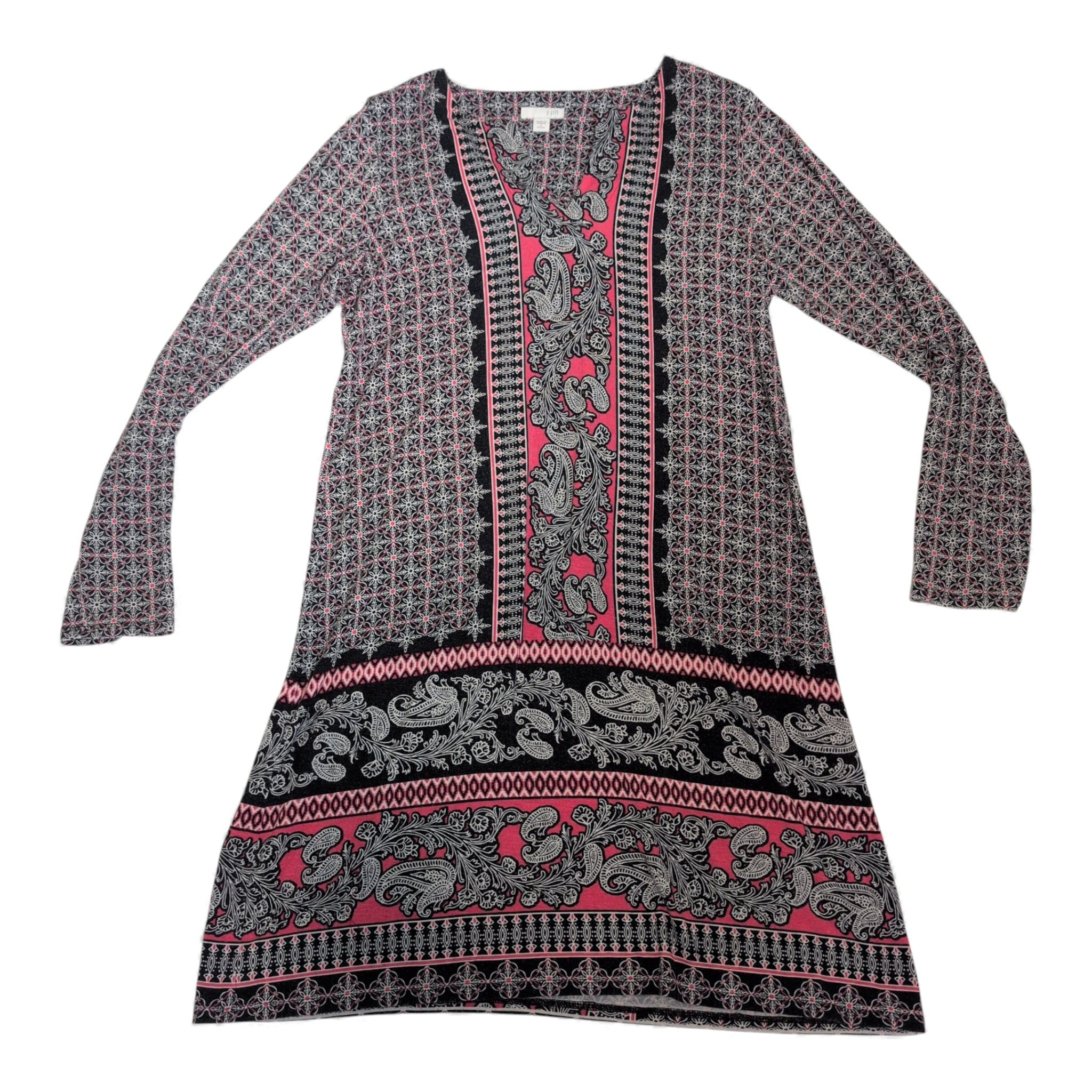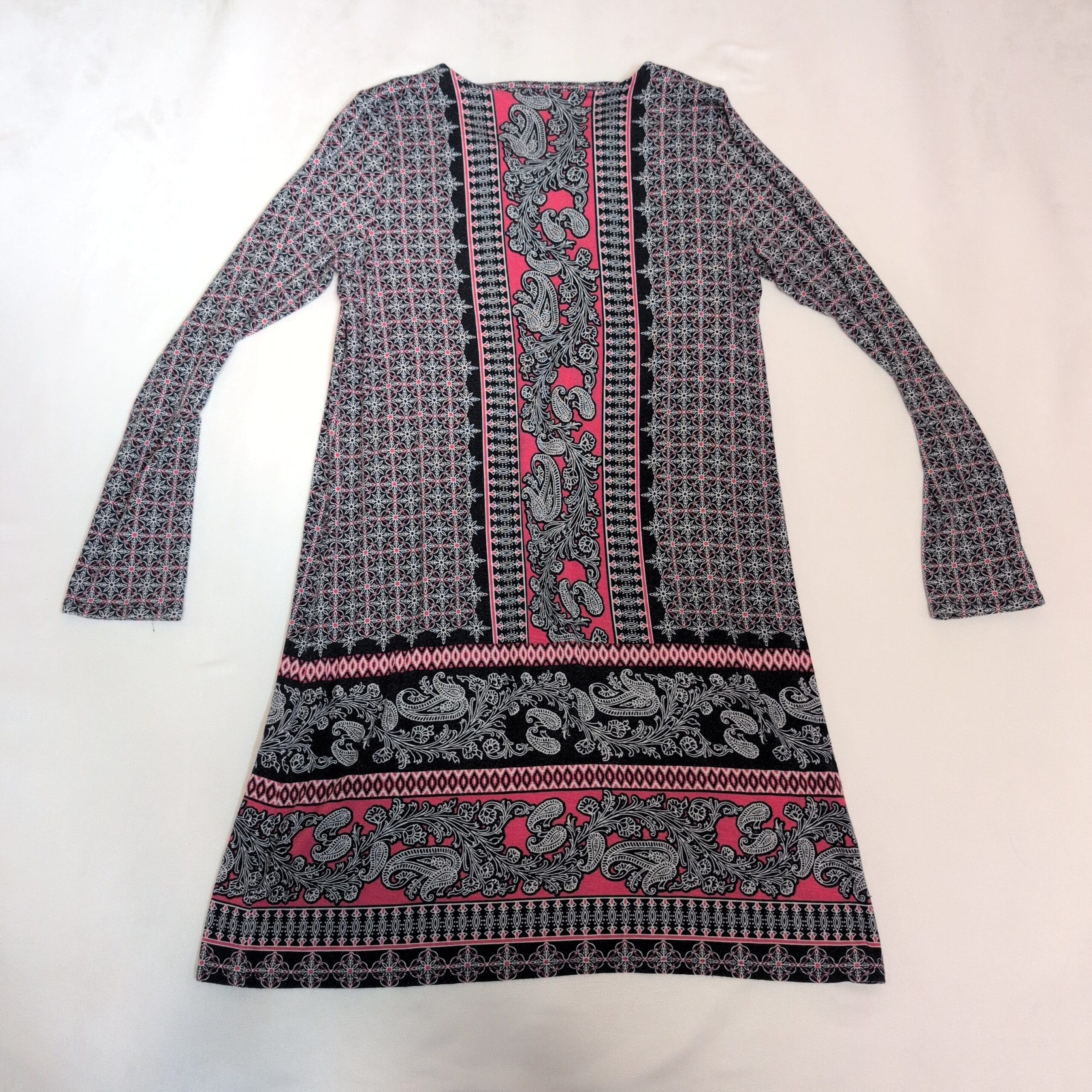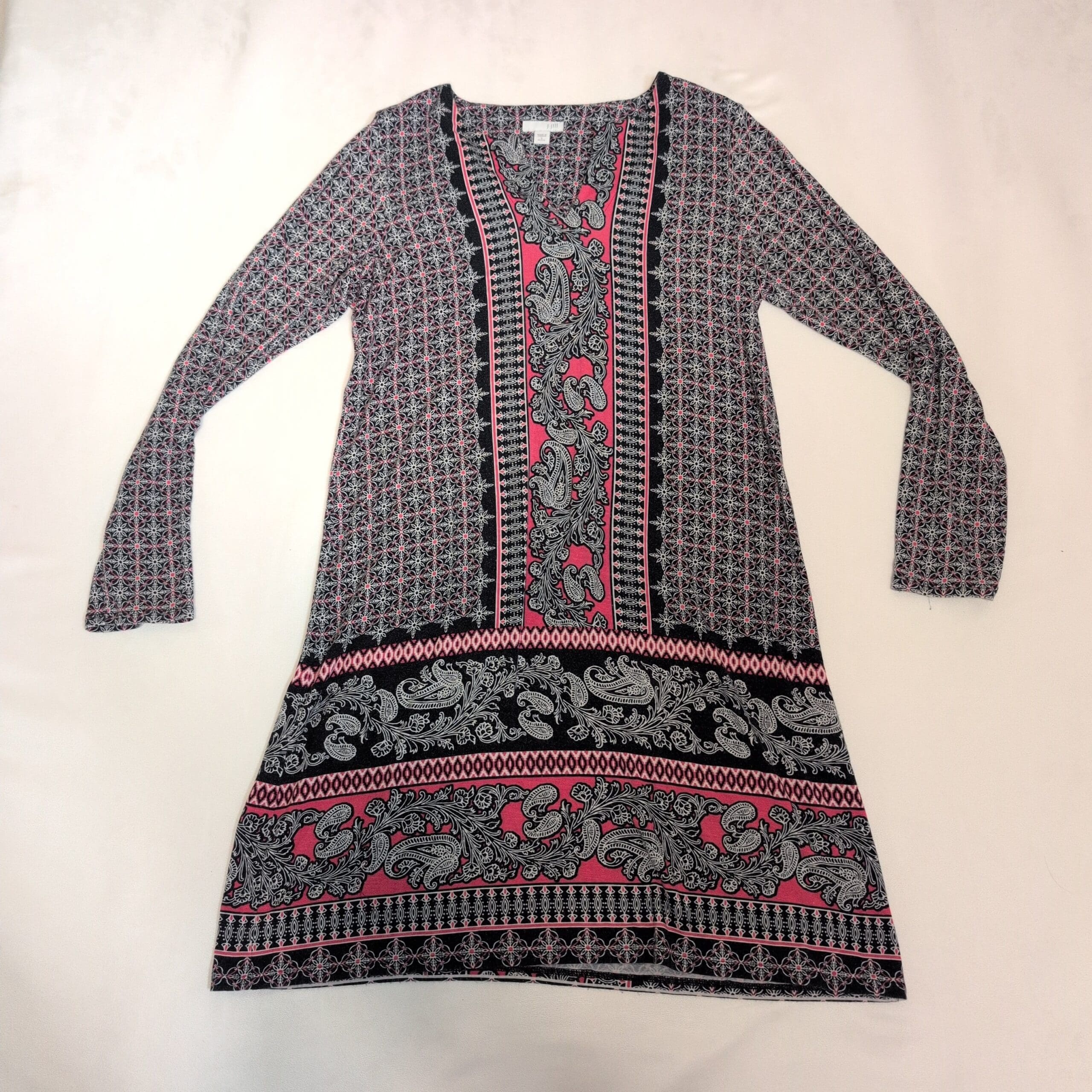 J. Jill women’s long sleeve dress in size S. Blue and pink printed design featuring central paisley panels and geometric motifs. V-neckline with long sleeves and a relaxed A-line silhouette—versatile for casual or office wear. Pre-owned; please see photos for details.