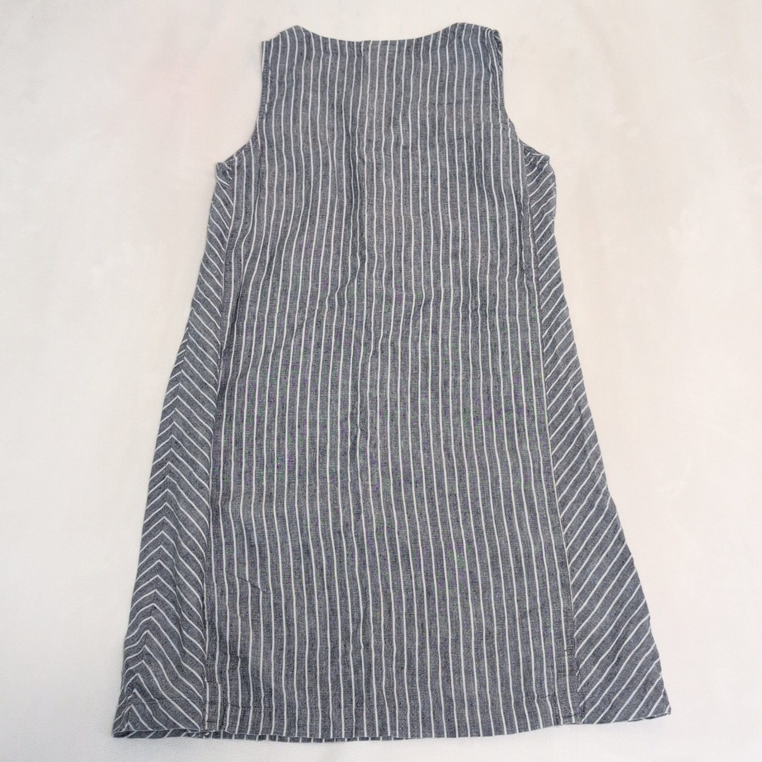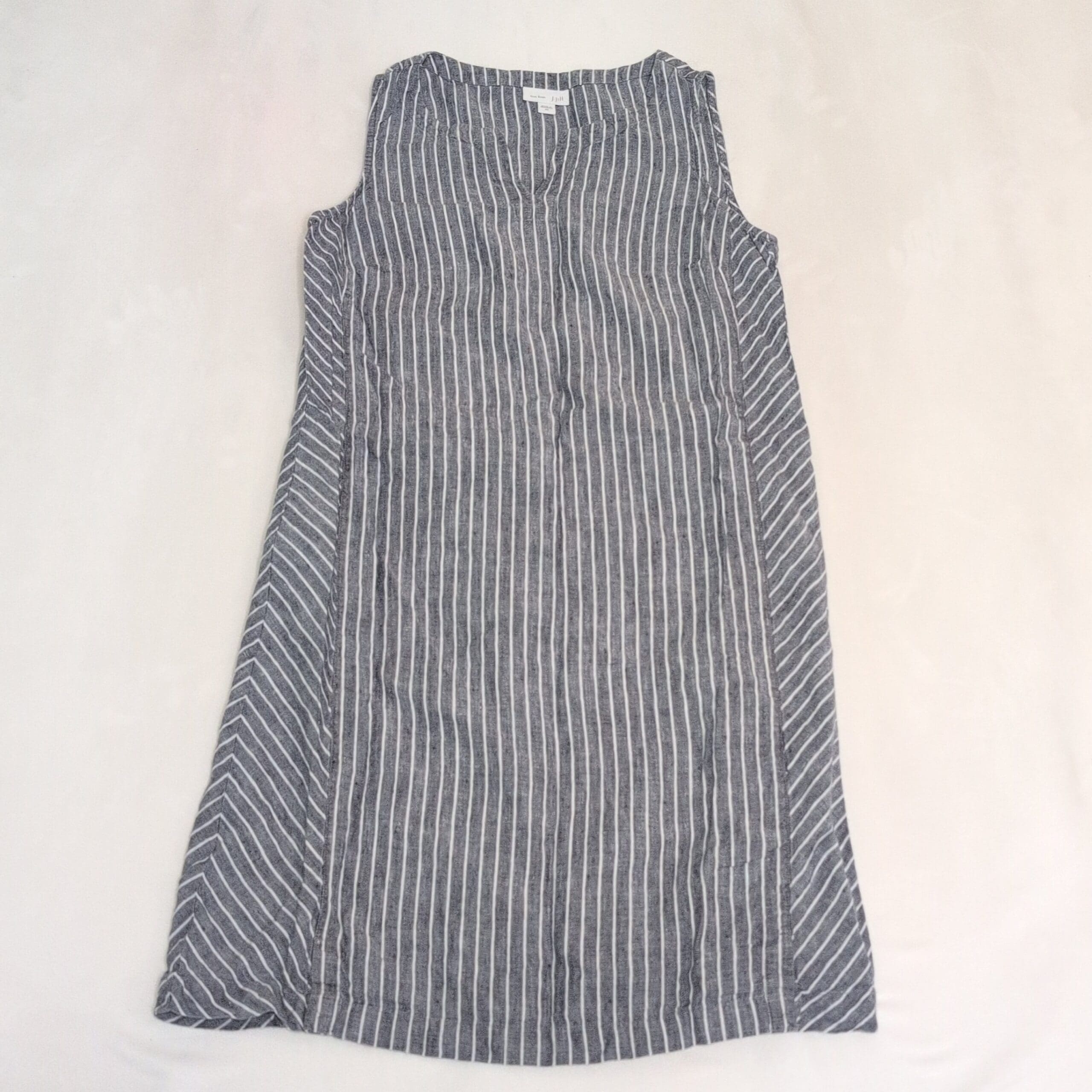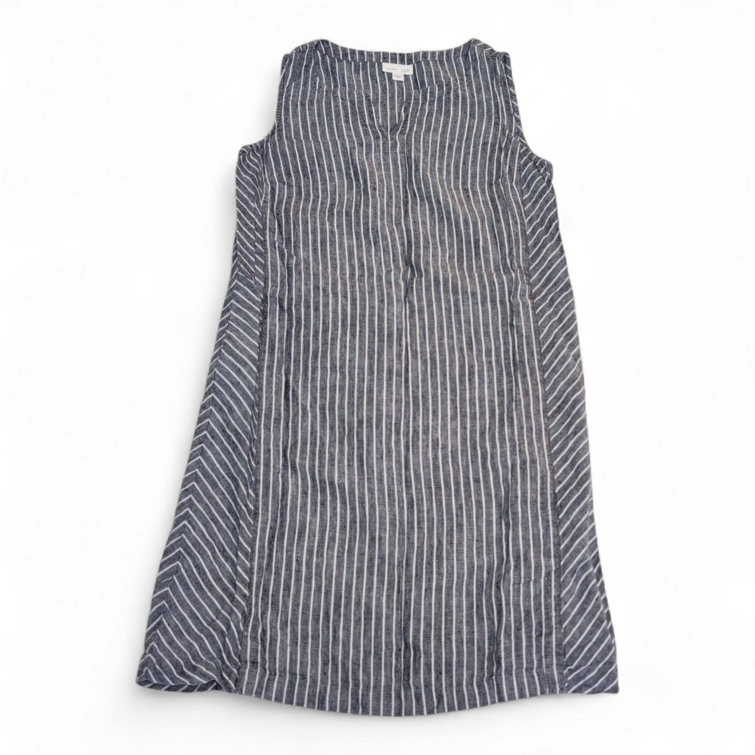 J. Jill sleeveless midi dress in gray with white vertical stripes. Lightweight woven fabric with a subtle texture and chevron-striped side panels for a flattering A-line drape. Scoop neckline and clean, simple lines make this a versatile piece for casual days or easy weekend dressing. Size: XS (standard).