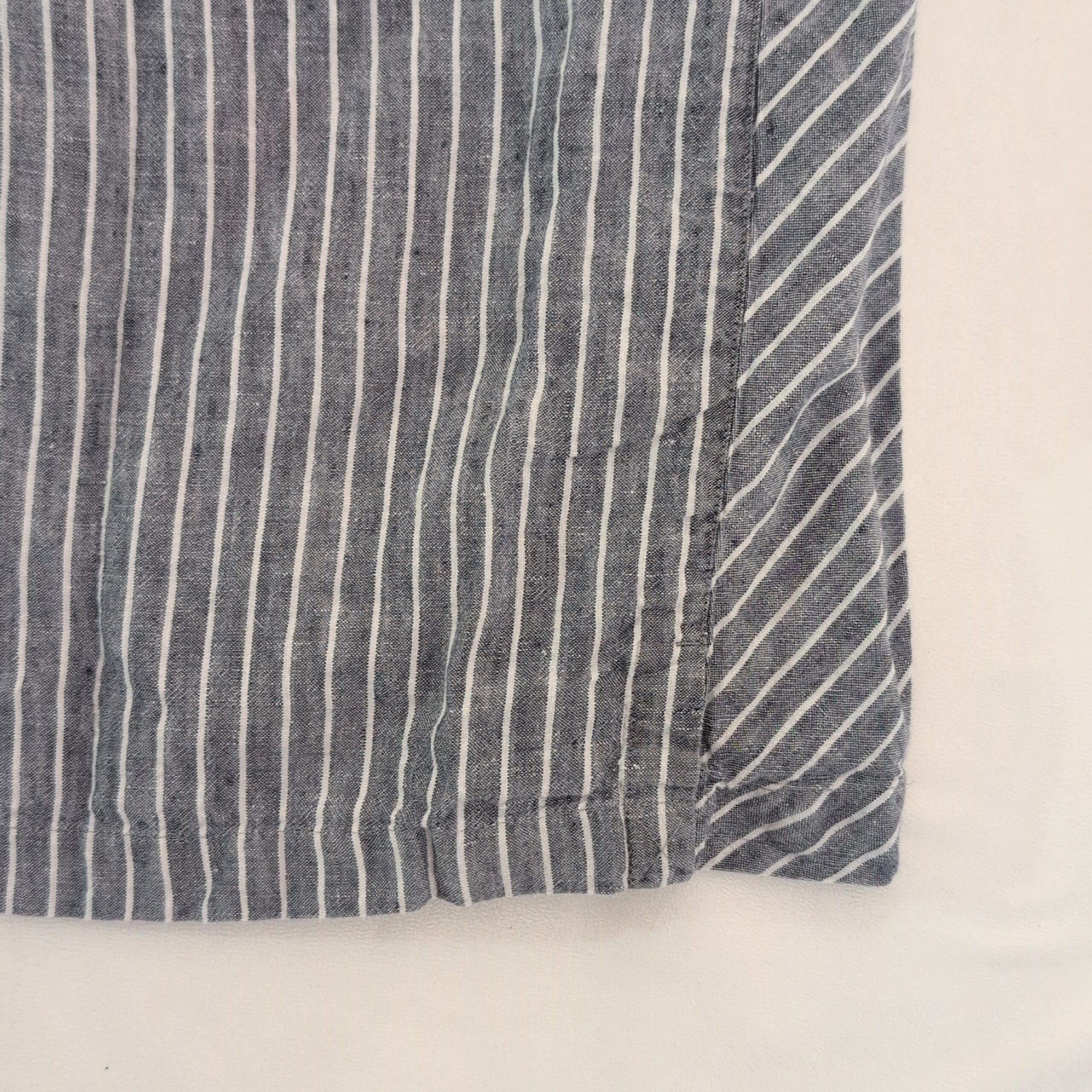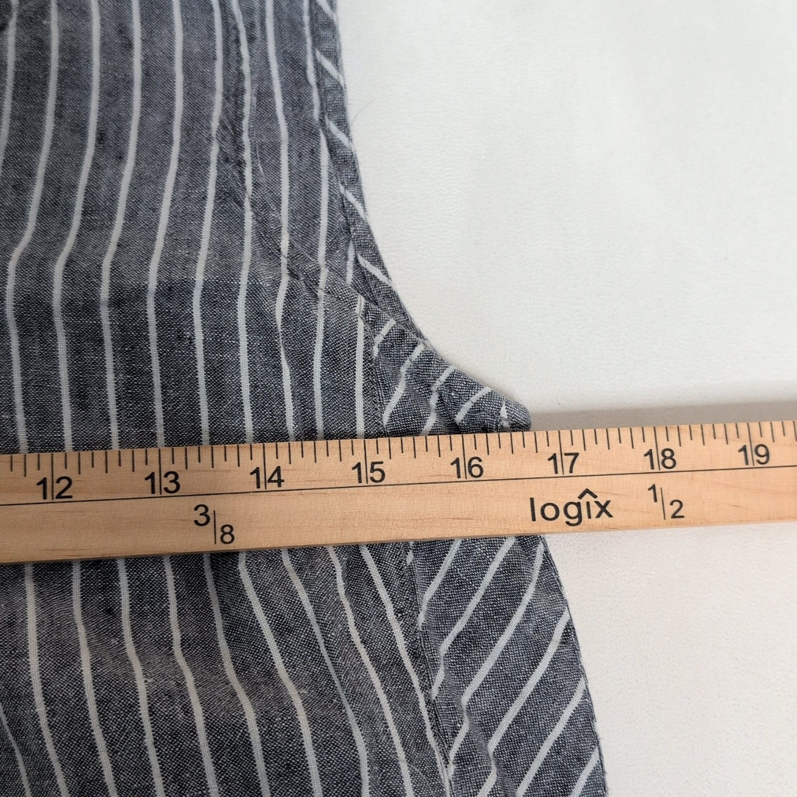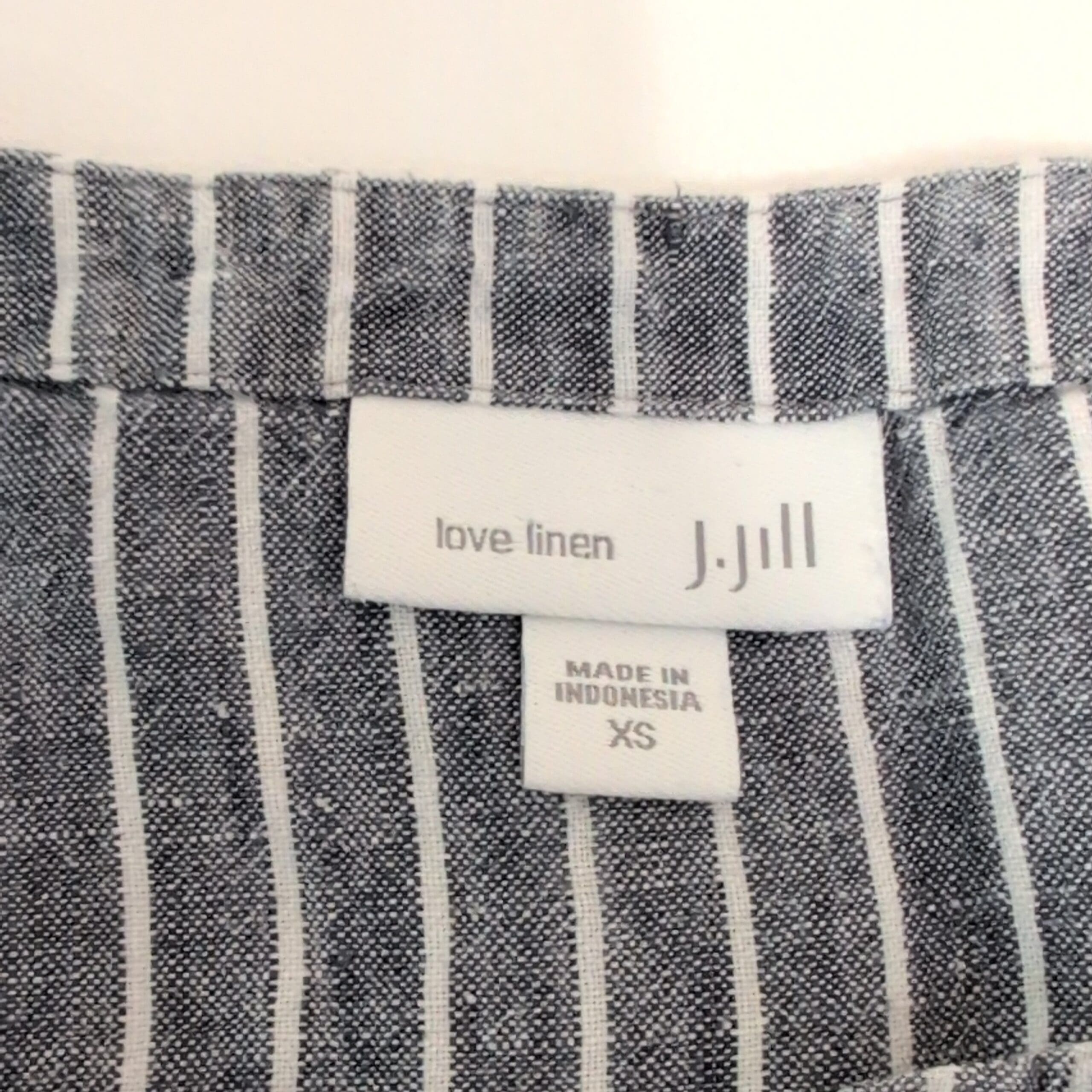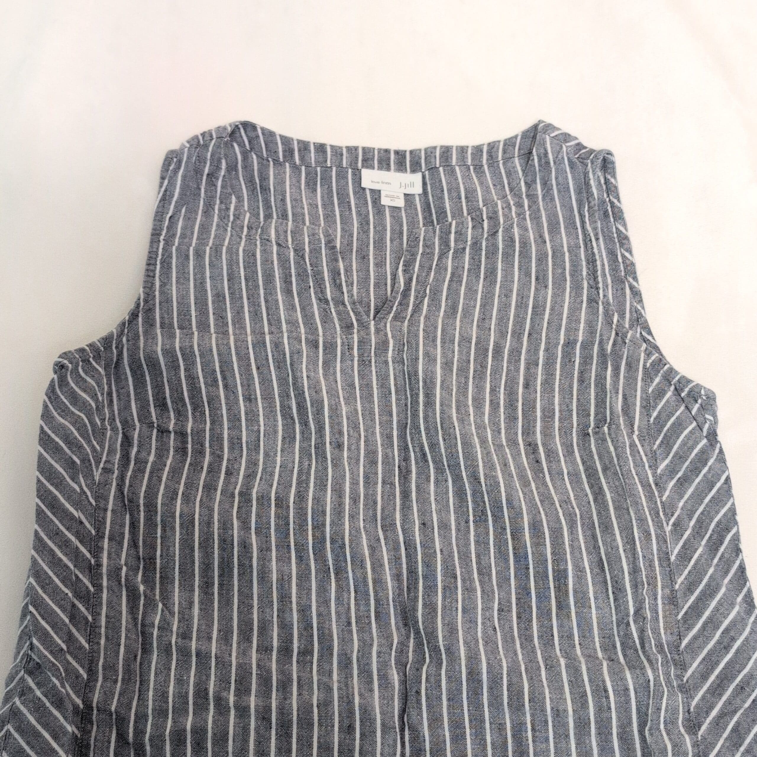 J. Jill sleeveless midi dress in gray with white vertical stripes. Lightweight woven fabric with a subtle texture and chevron-striped side panels for a flattering A-line drape. Scoop neckline and clean, simple lines make this a versatile piece for casual days or easy weekend dressing. Size: XS (standard).