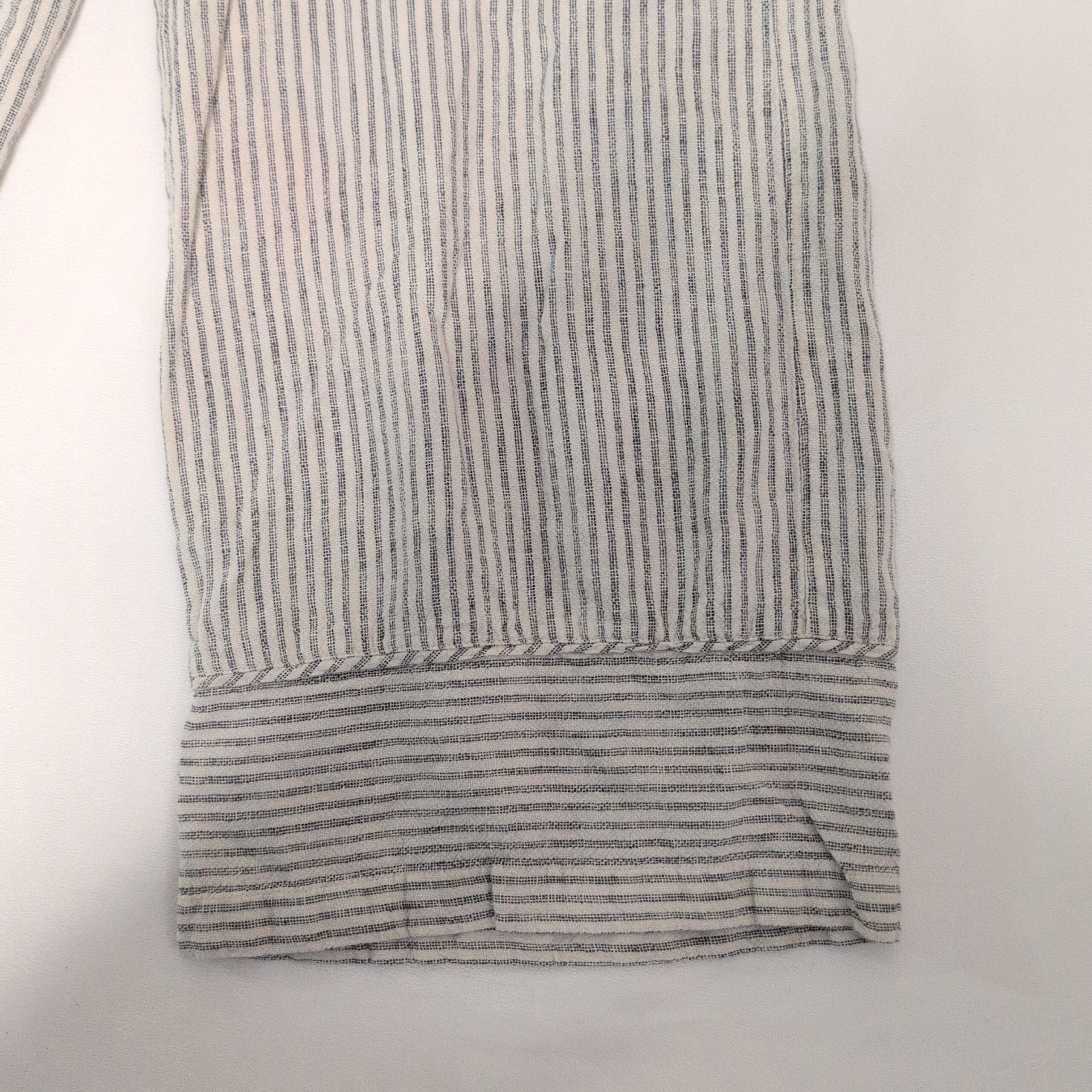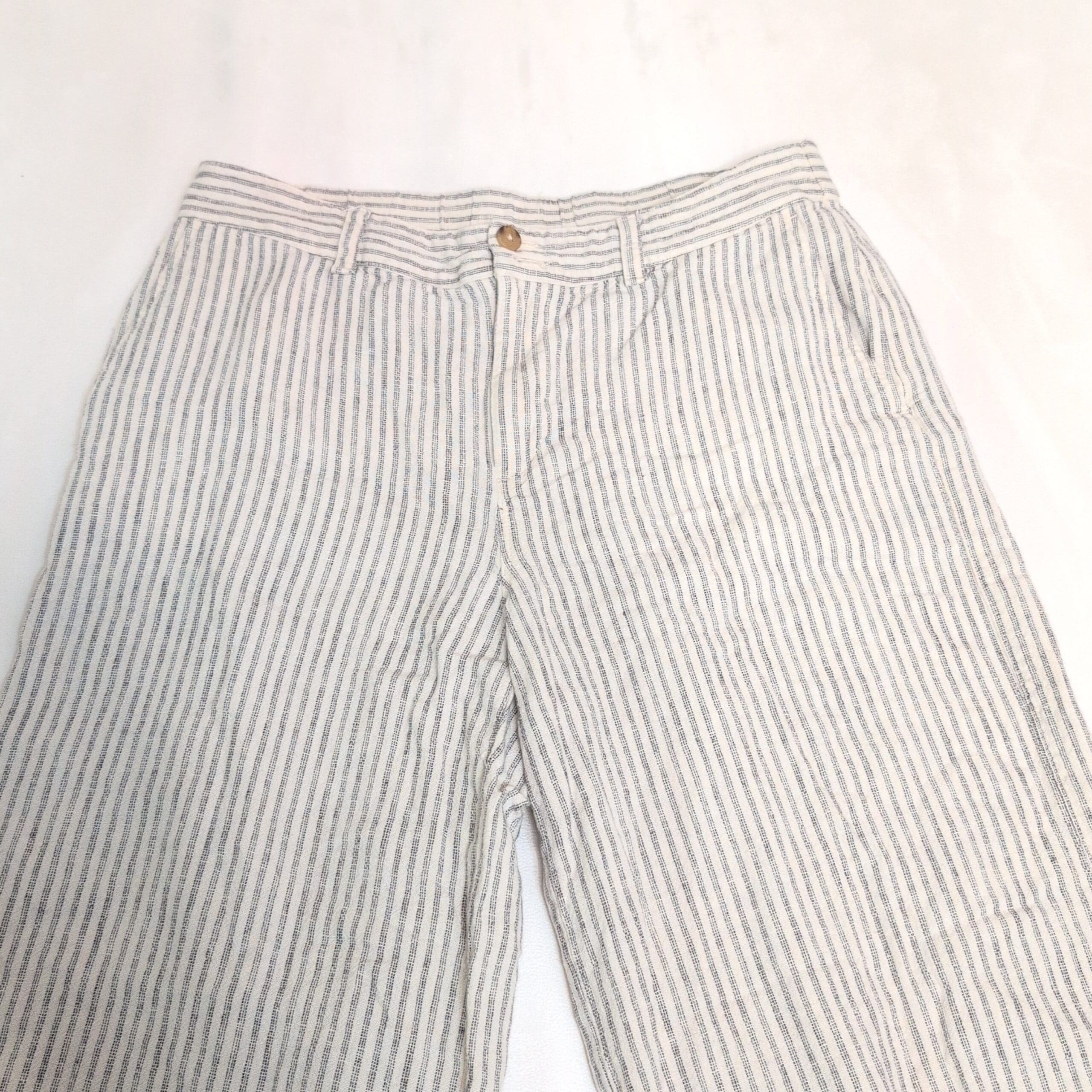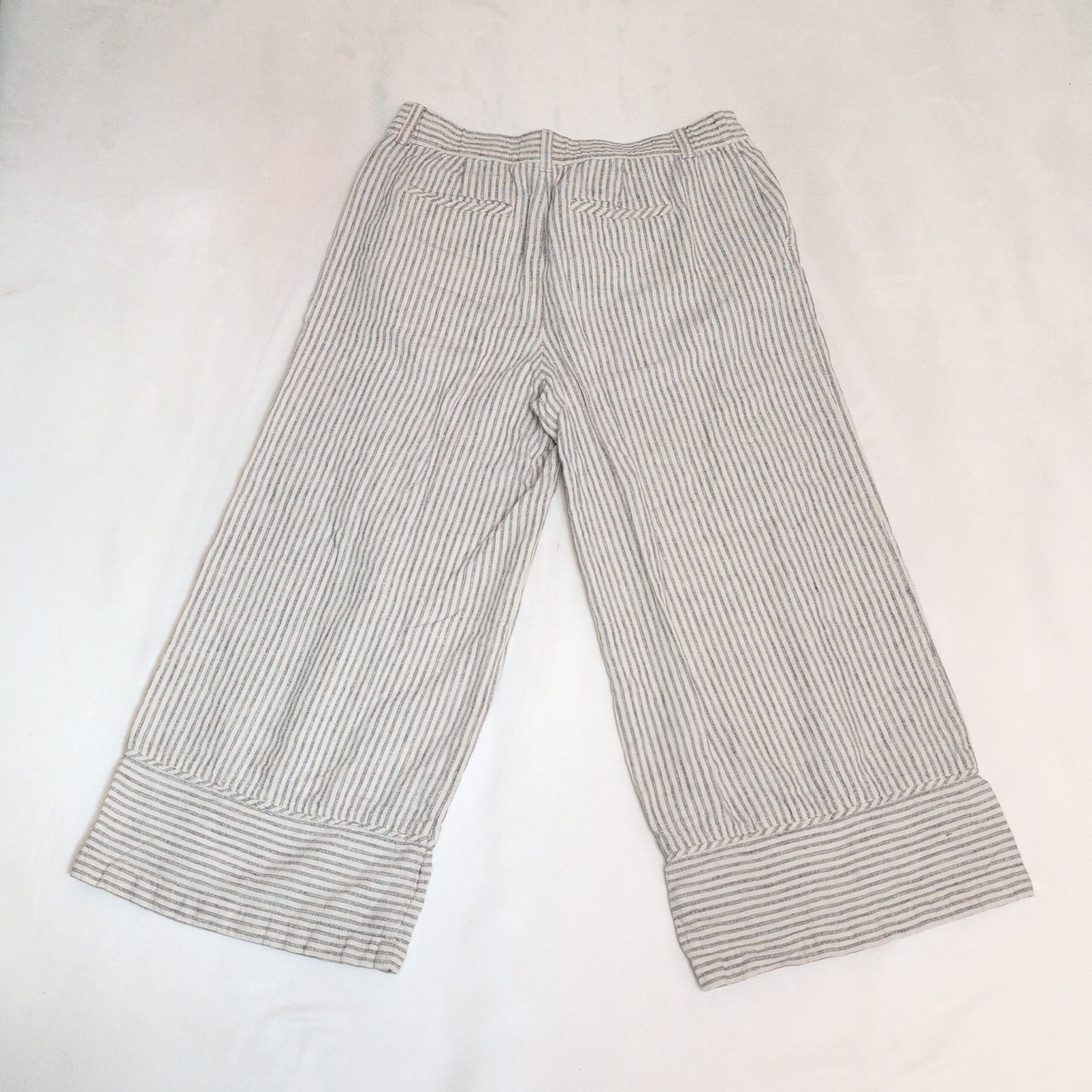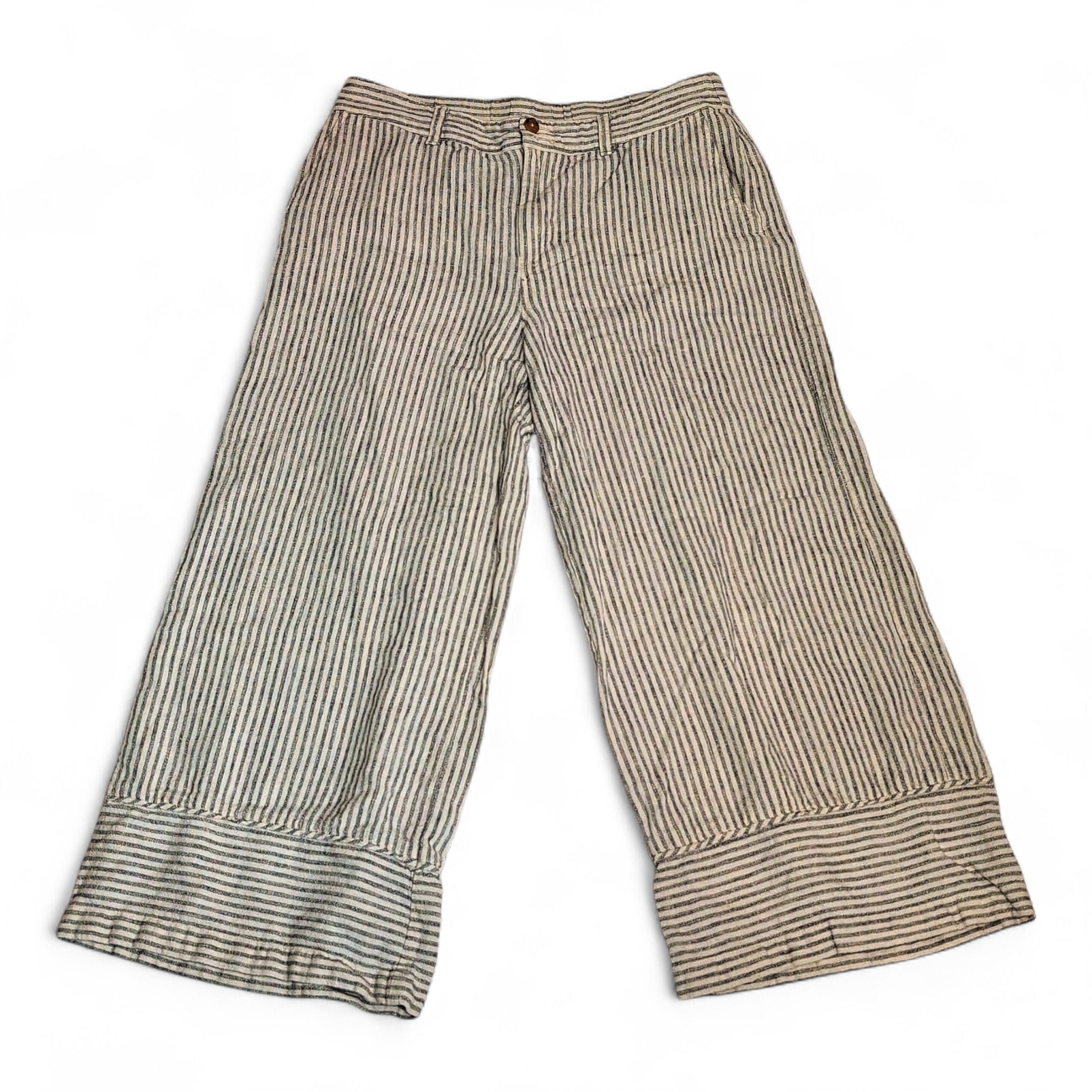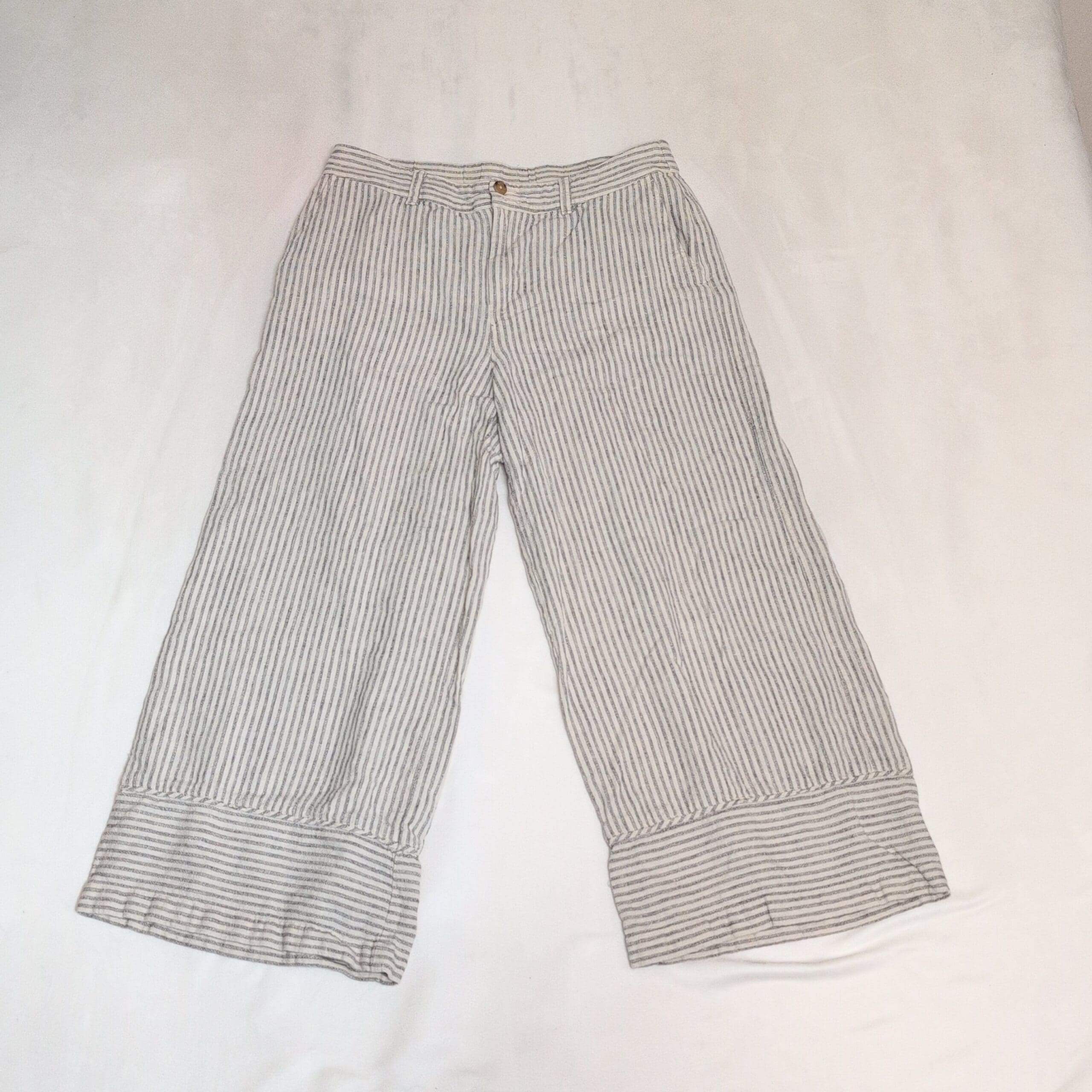 J. Jill women’s wide-leg cropped pants in white with narrow gray vertical stripes. Size S. Relaxed, breezy silhouette with cuffed hem, belt loops, front button closure, and side pockets — a versatile casual-to-resort piece.