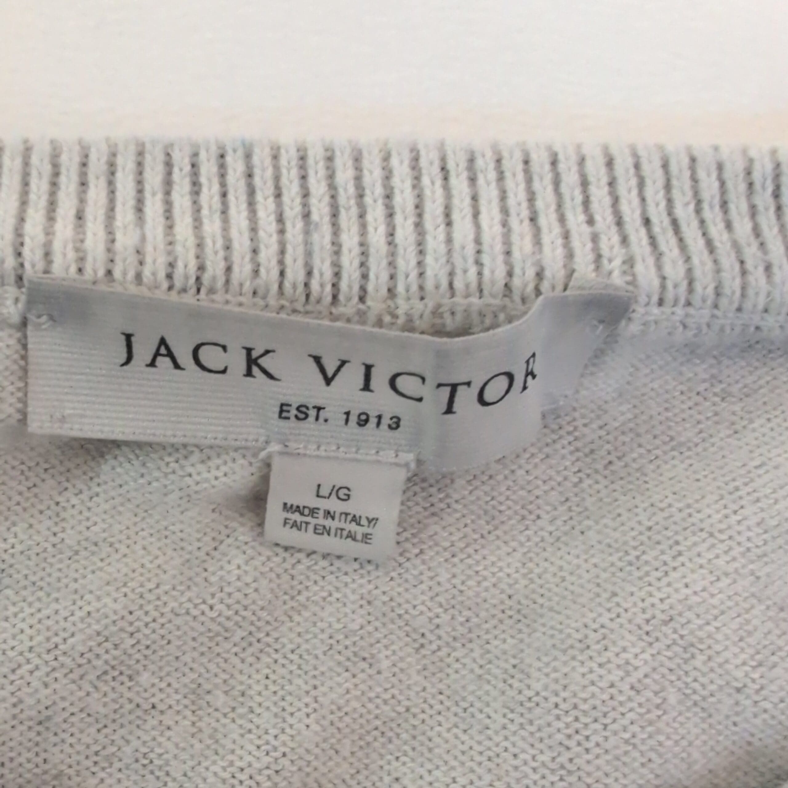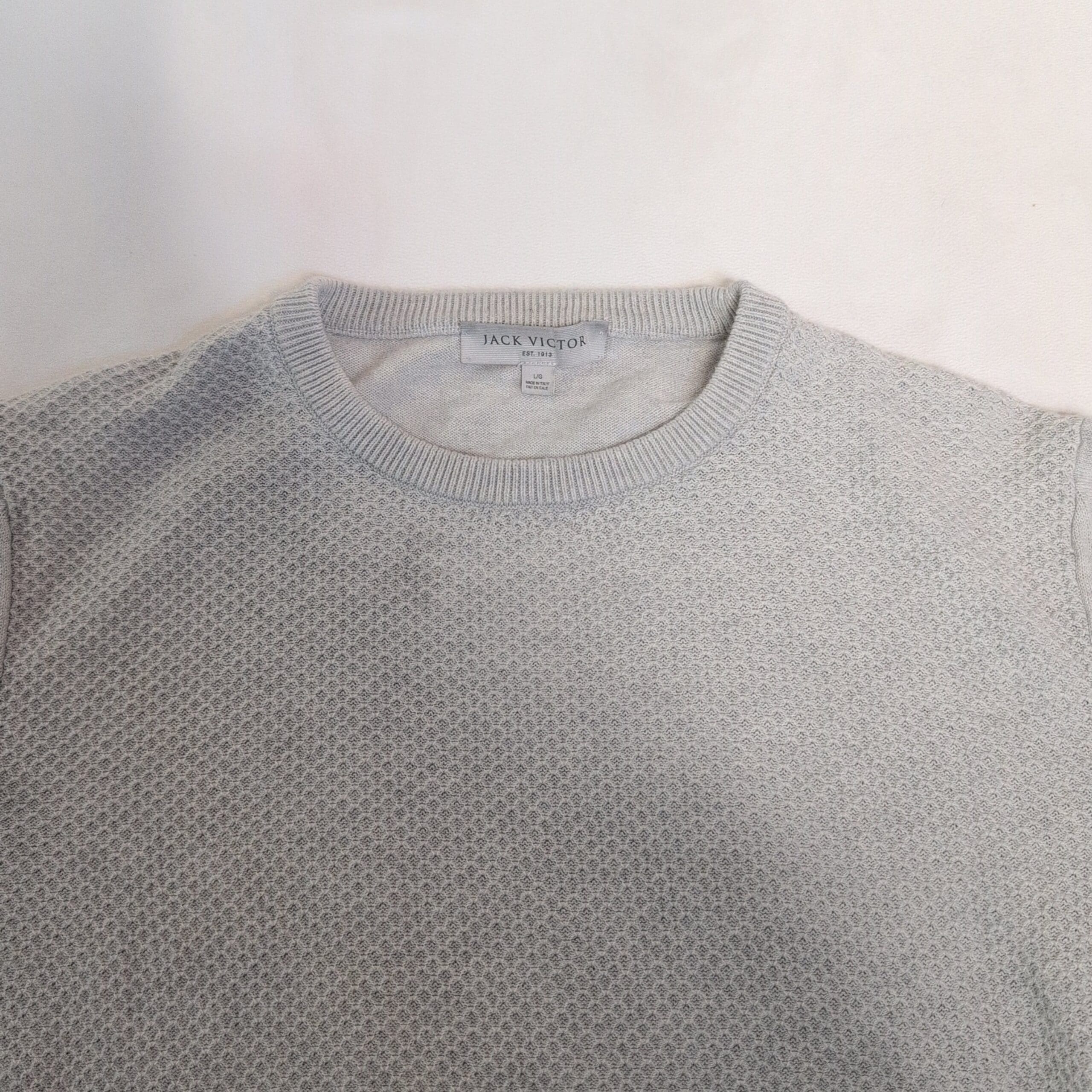Classic Jack Victor women’s crewneck sweater in light gray, size L. Features a textured knit front with ribbed crew neckline, cuffs and hem and long sleeves for comfortable layering. Versatile, polished piece that pairs easily with jeans, skirts, or workwear.