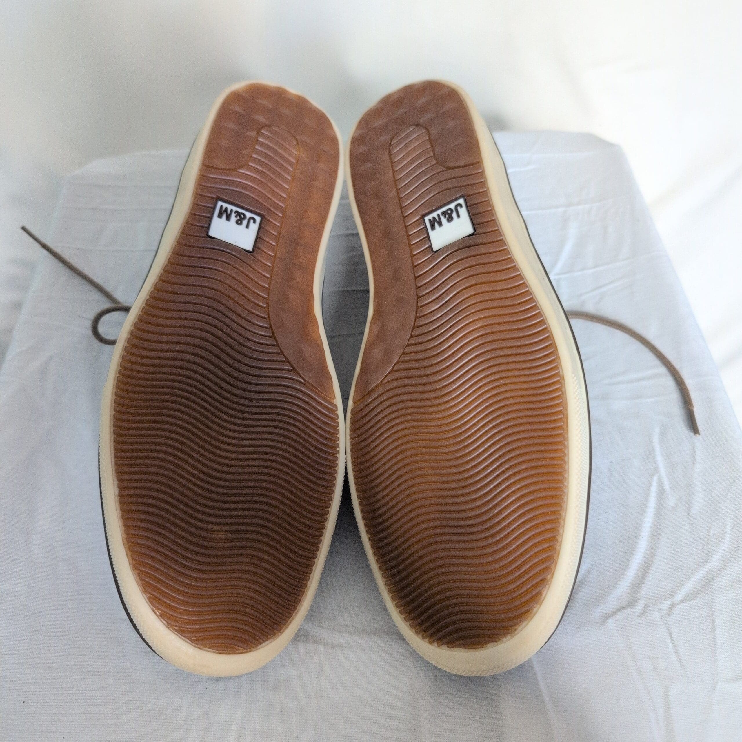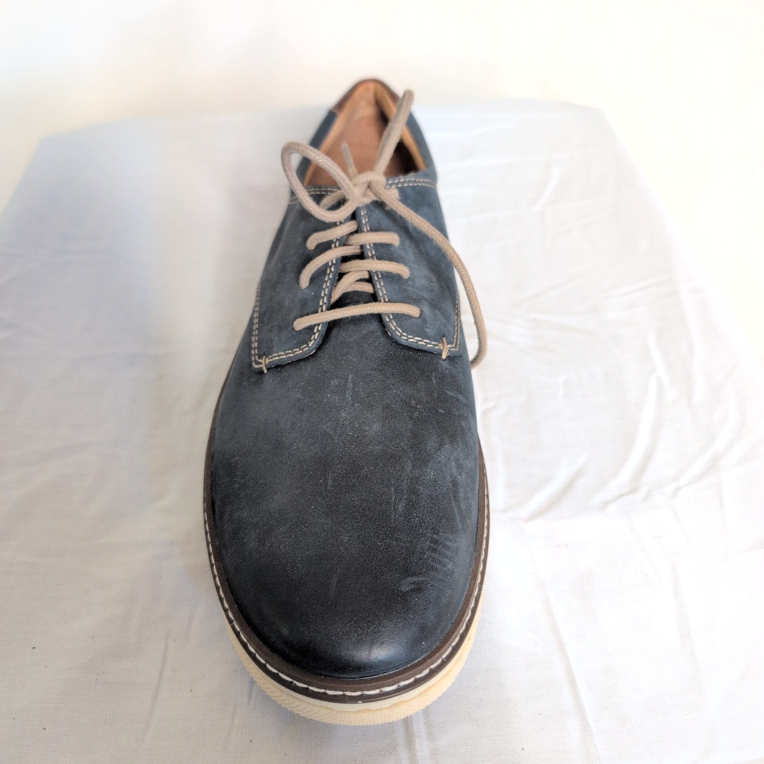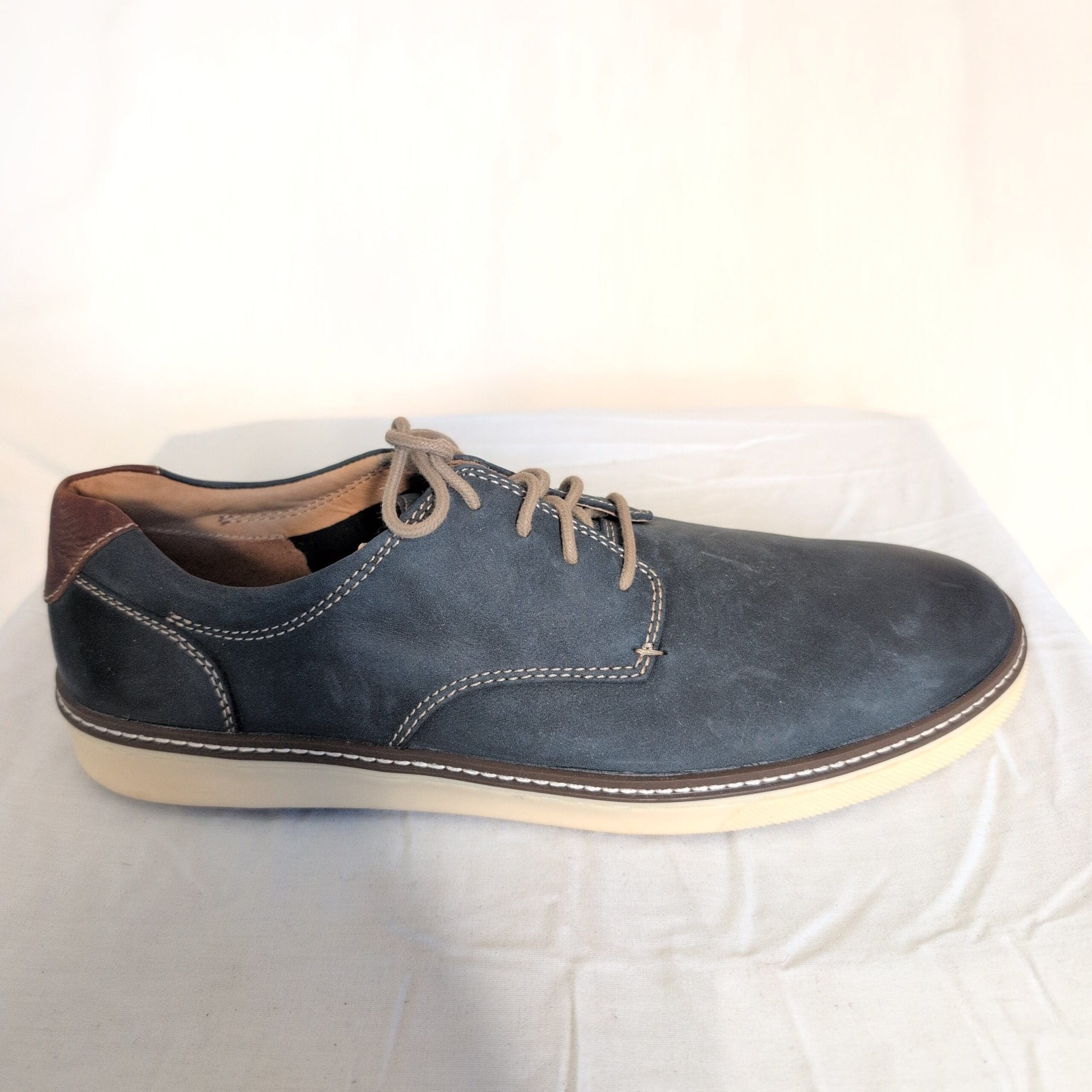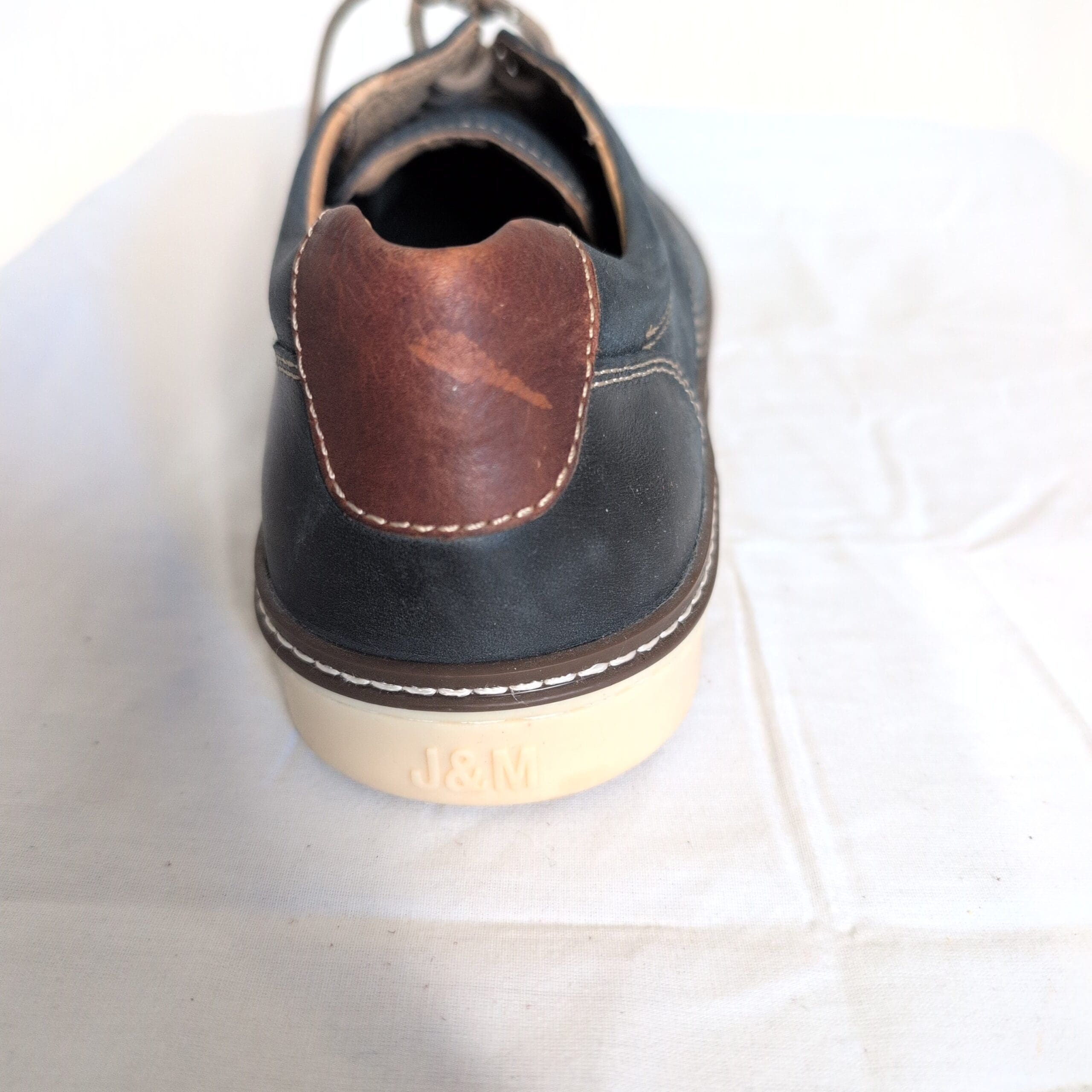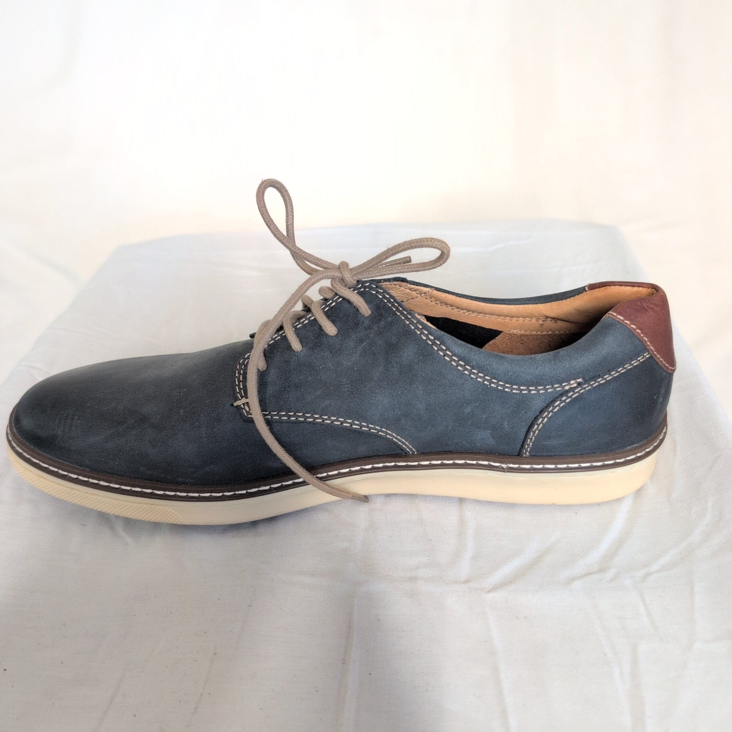 J&M men’s blue derby oxfords, size 11. Premium nubuck-like leather upper with contrast tan stitching and a lace-up closure. Cream rubber outsole provides lightweight cushioning and everyday comfort. Smart-casual silhouette pairs well with jeans, chinos, or business-casual looks. Condition: great used condition with minor wear consistent with light use (light scuffing and slight creasing). Includes matching laces and a clean interior.