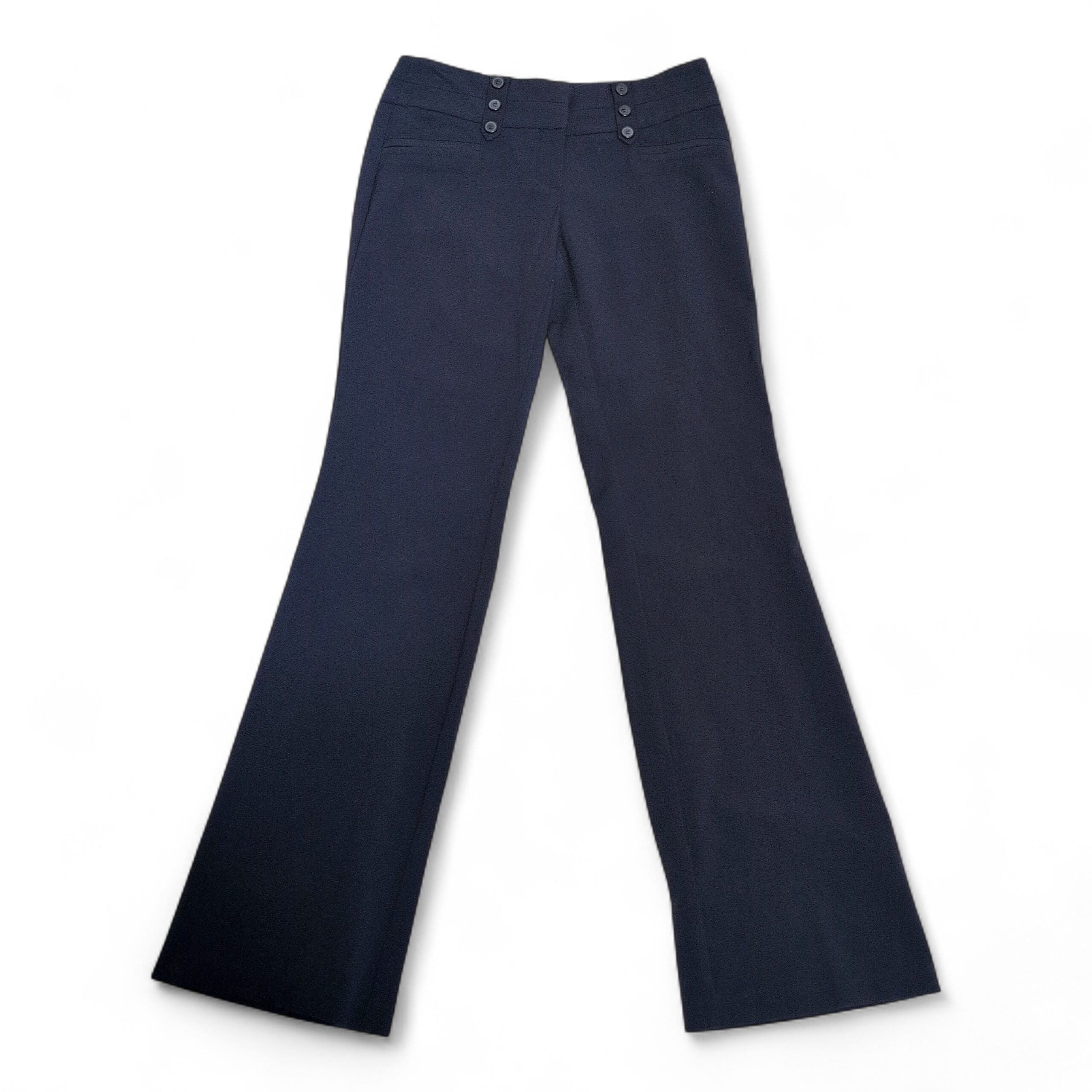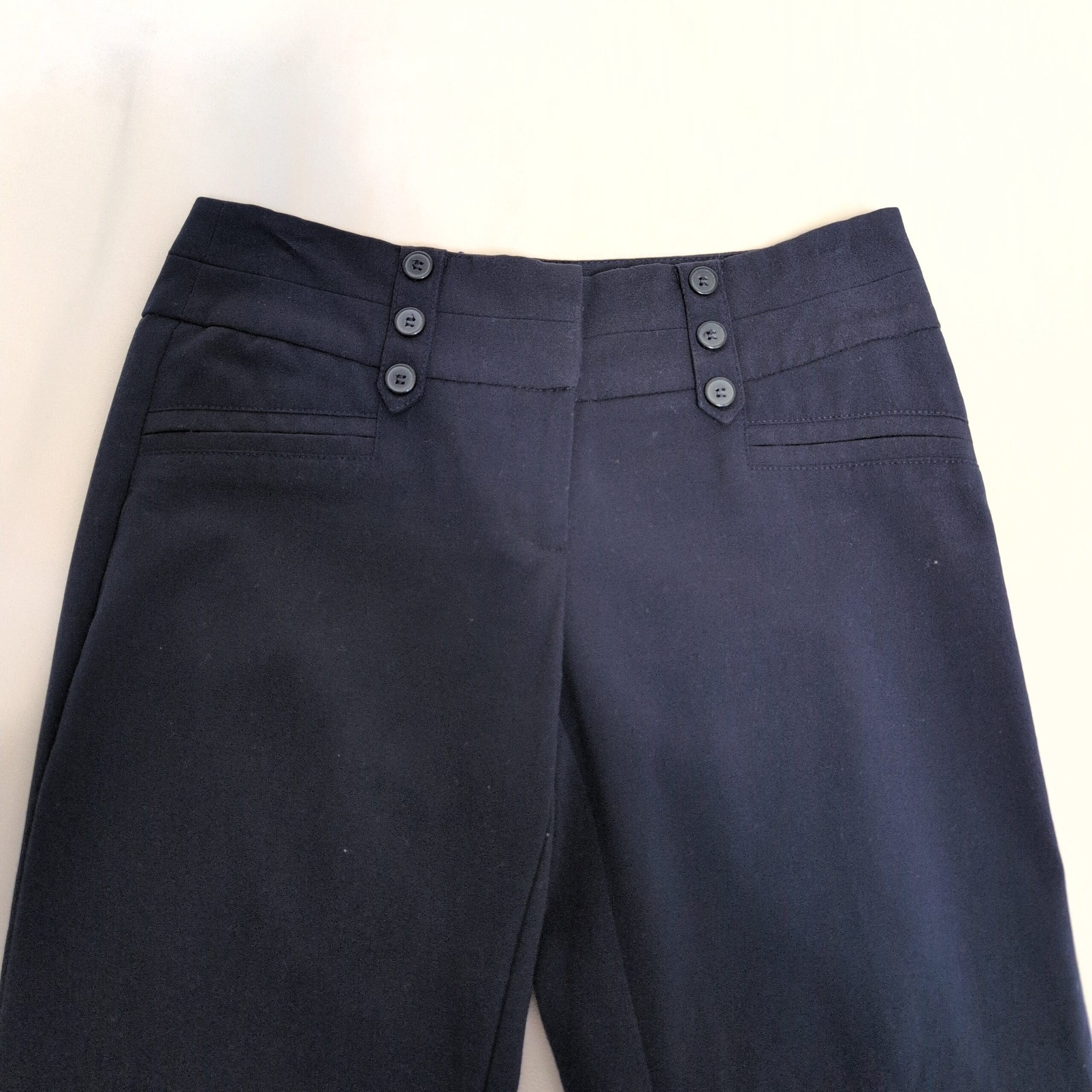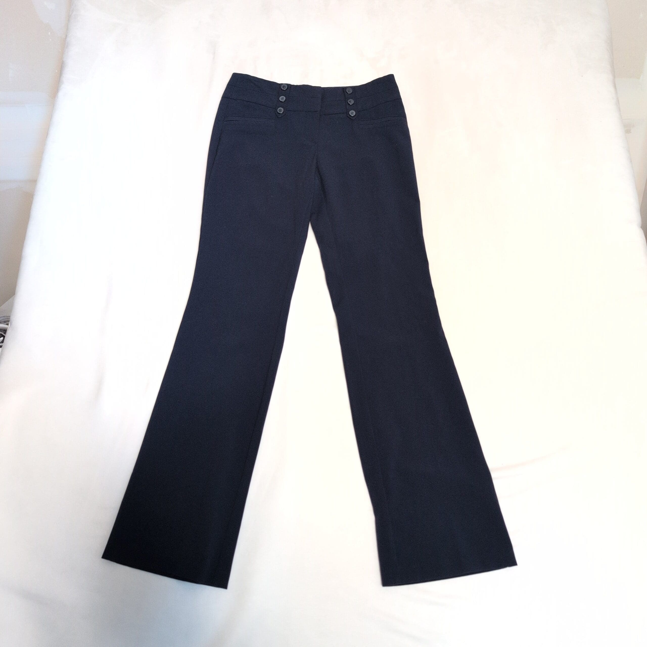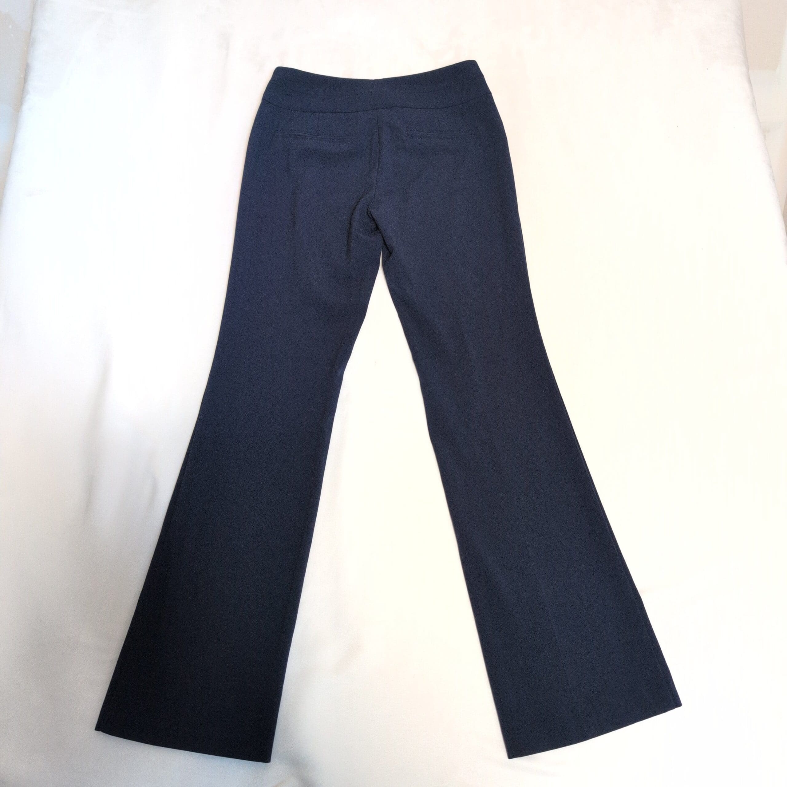 Joe’s Jeans women’s bootcut flare pants in a deep navy blue, size 1 (juniors). Features a tailored fit through the hips with a subtle flare from the knee, full-length leg, and decorative double-button waistband for a polished, versatile look. Clean styling that works for the office or more casual occasions. Gently used and in good condition — free of major rips, tears, stains, or flaws; normal light wear consistent with pre-owned items. See photos for details.