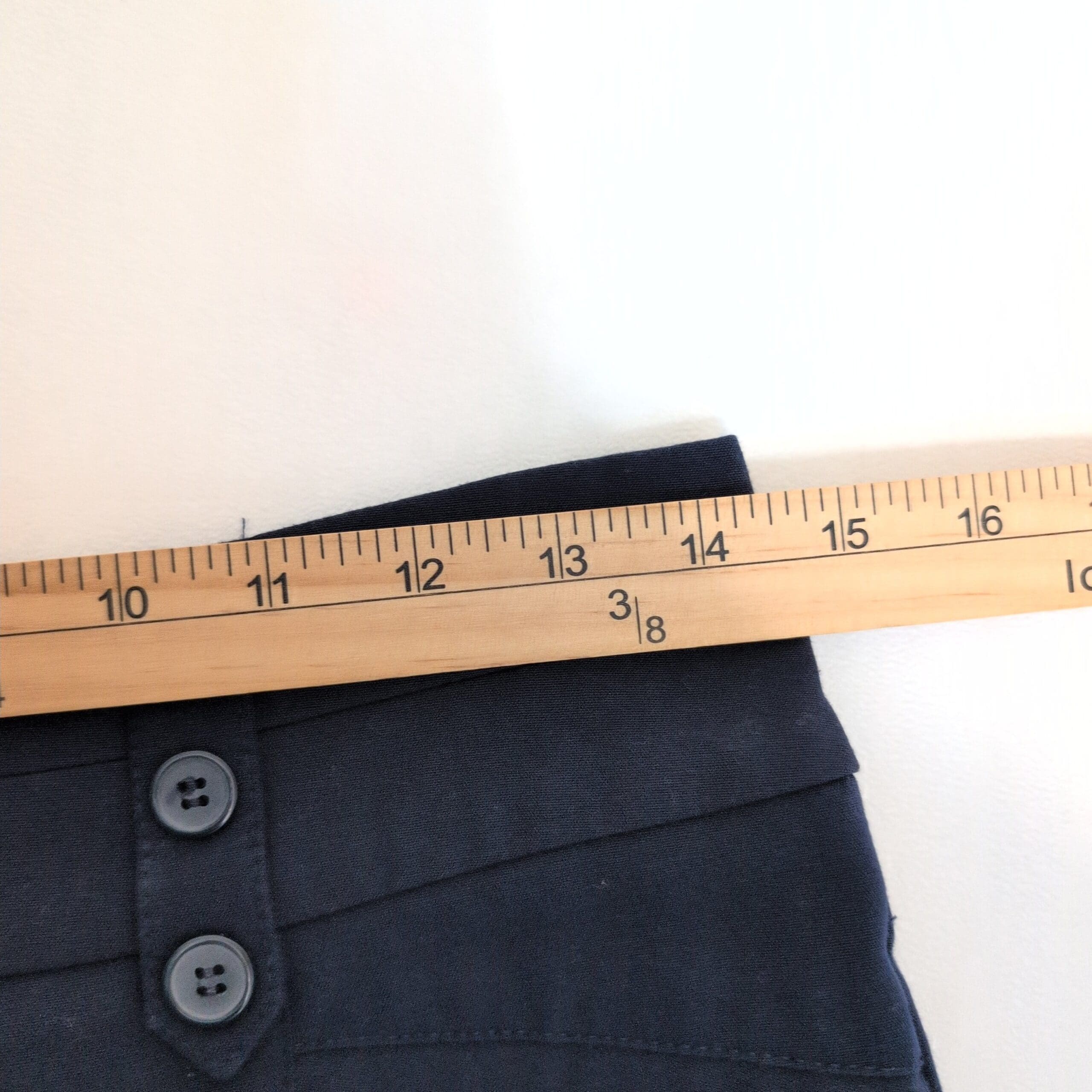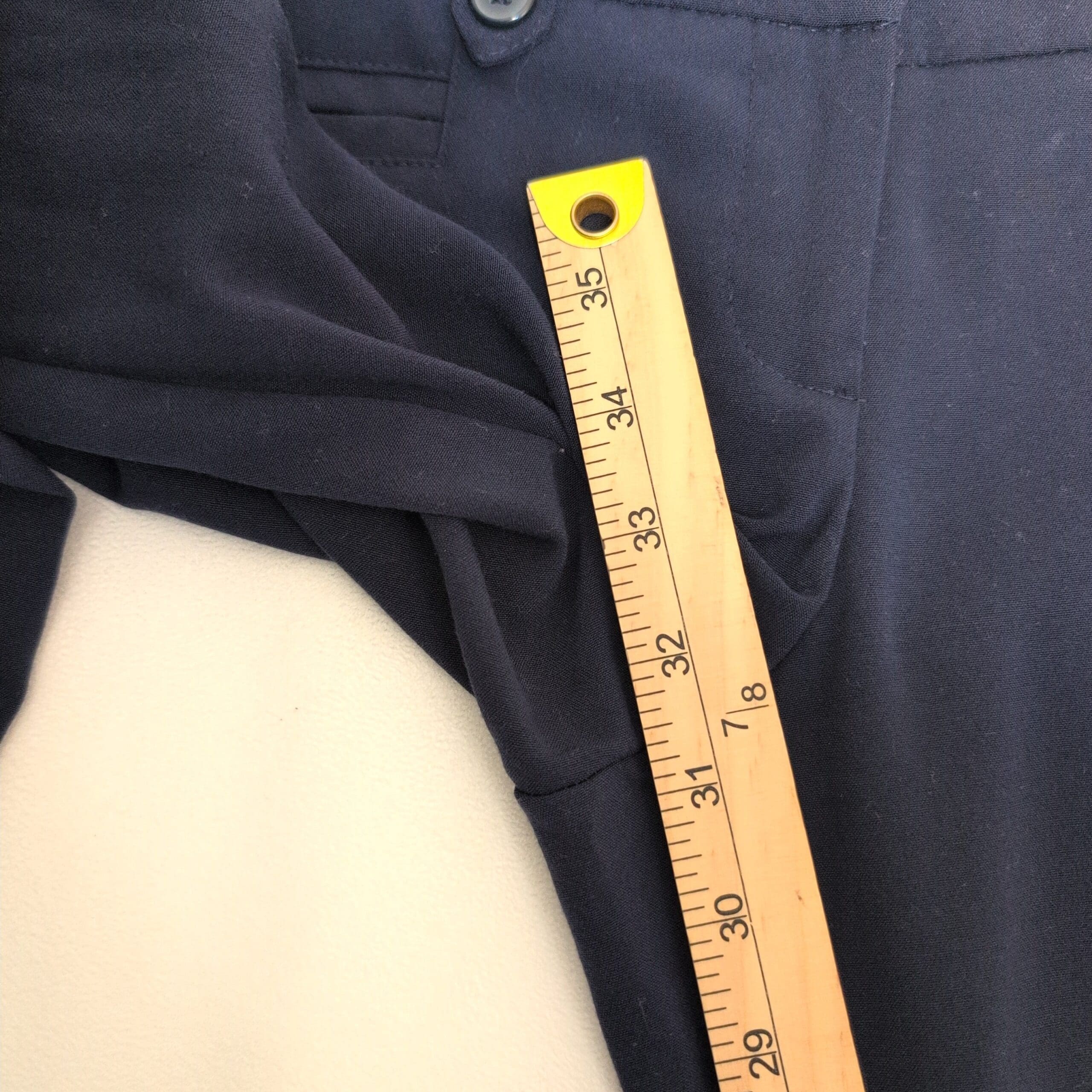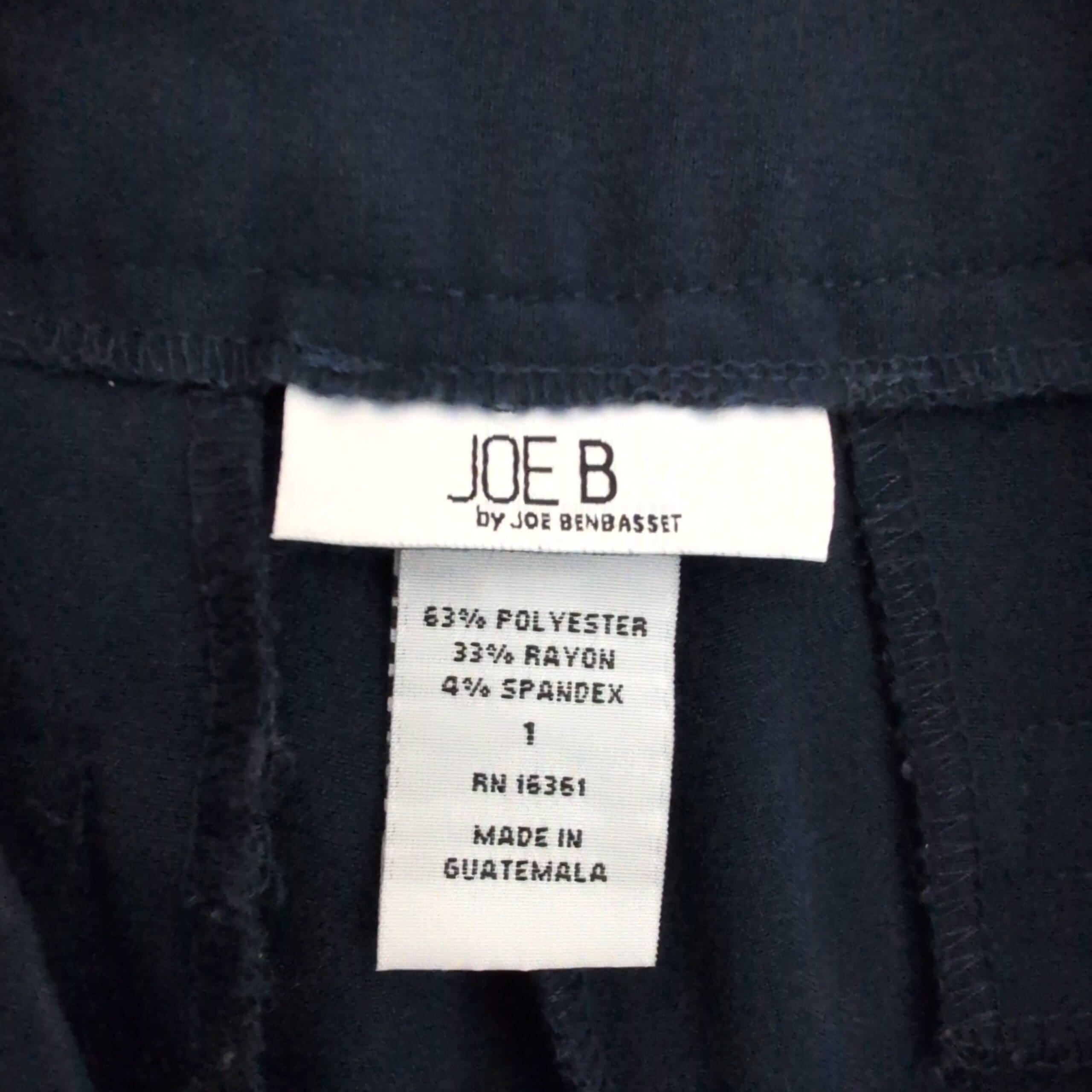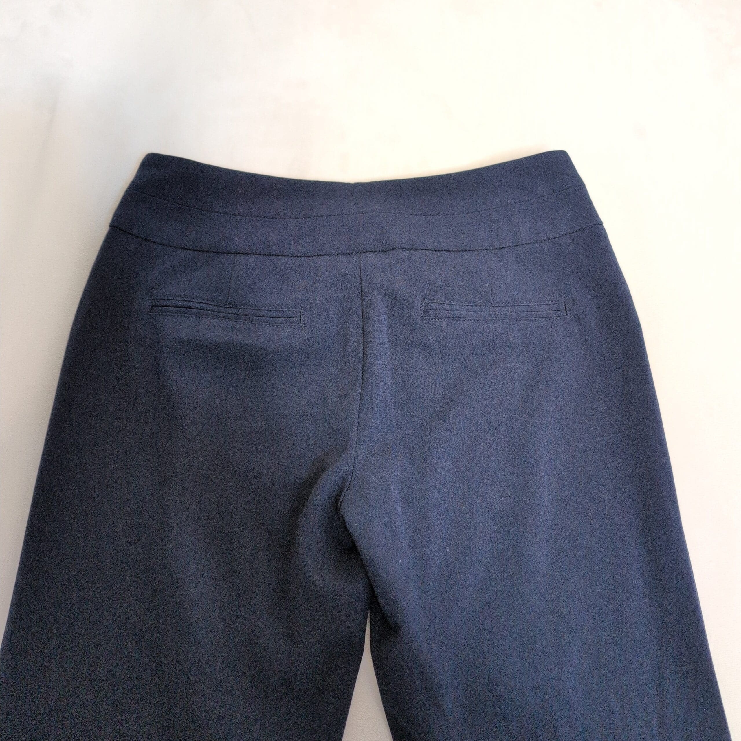 Joe’s Jeans women’s bootcut flare pants in a deep navy blue, size 1 (juniors). Features a tailored fit through the hips with a subtle flare from the knee, full-length leg, and decorative double-button waistband for a polished, versatile look. Clean styling that works for the office or more casual occasions. Gently used and in good condition — free of major rips, tears, stains, or flaws; normal light wear consistent with pre-owned items. See photos for details.