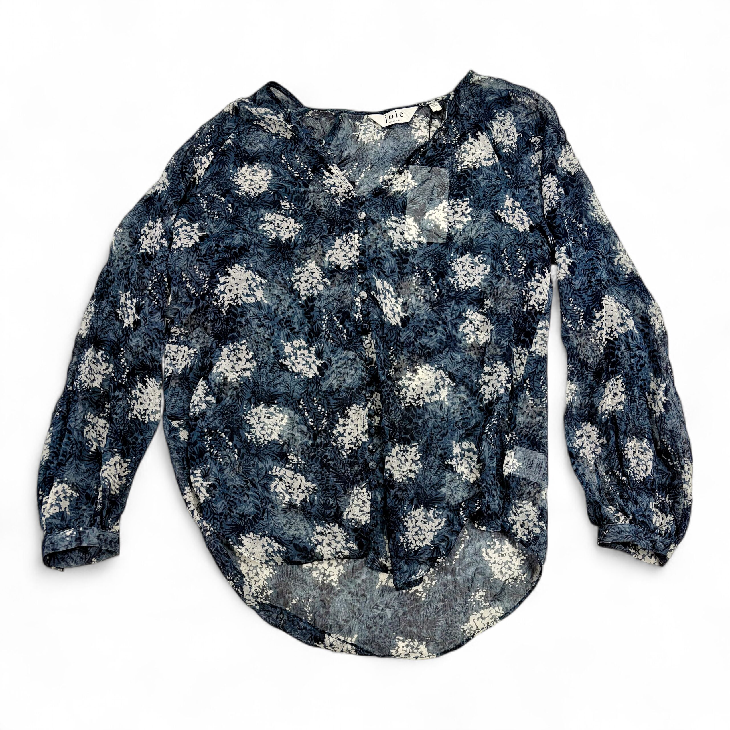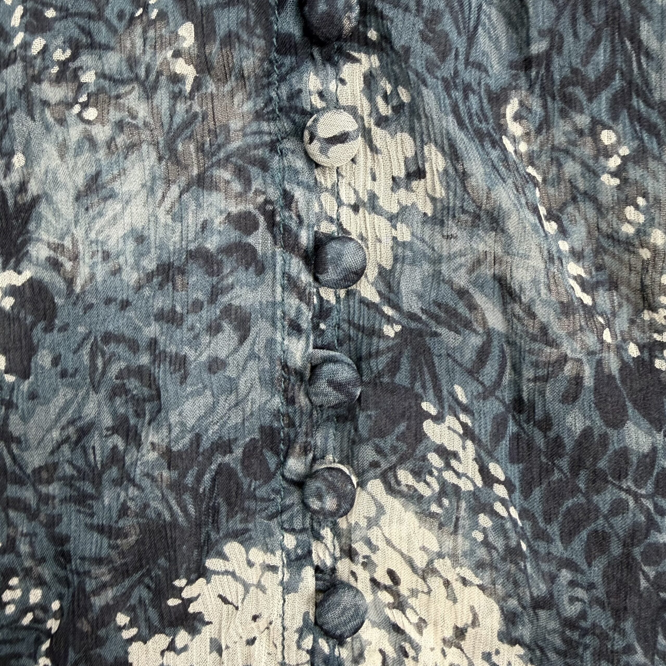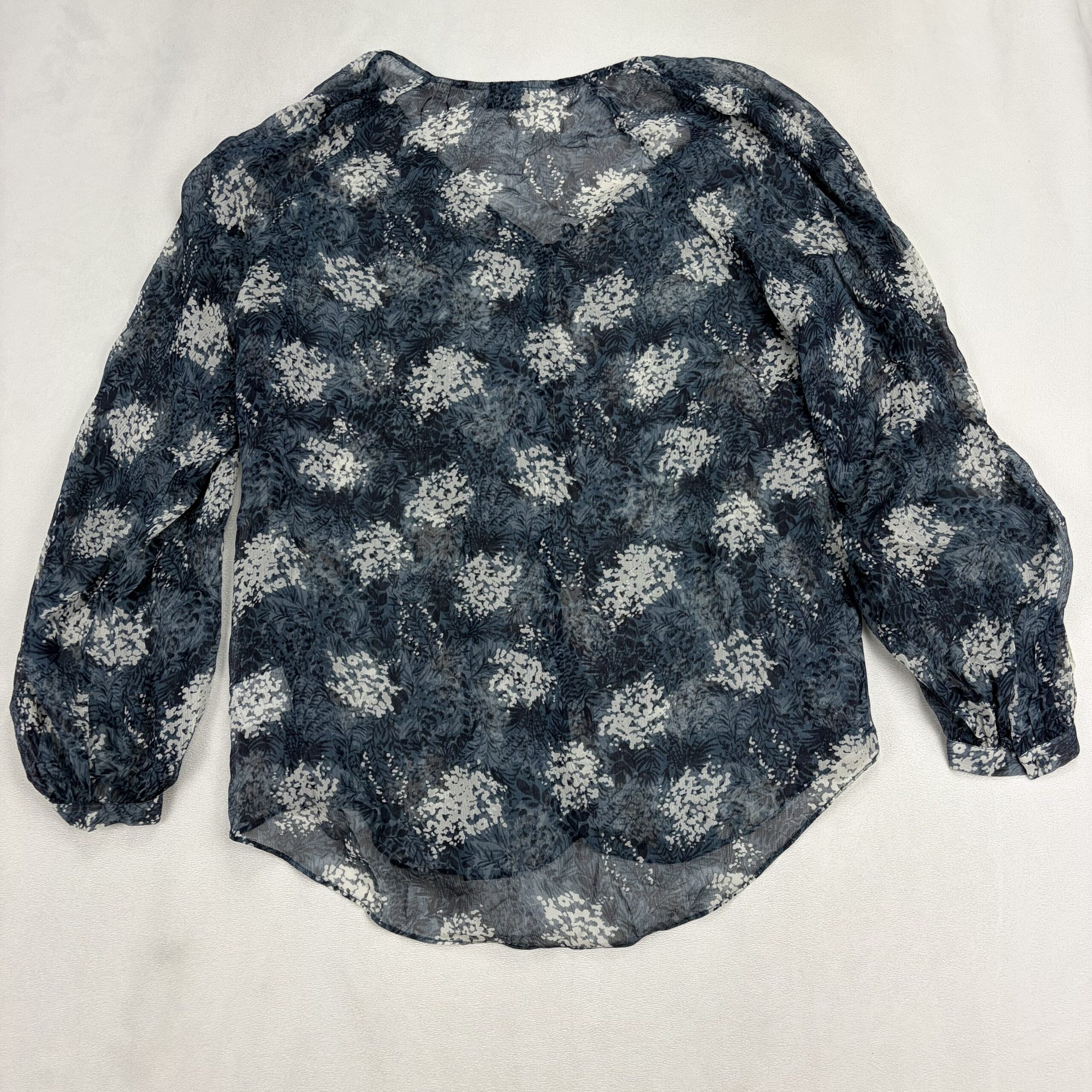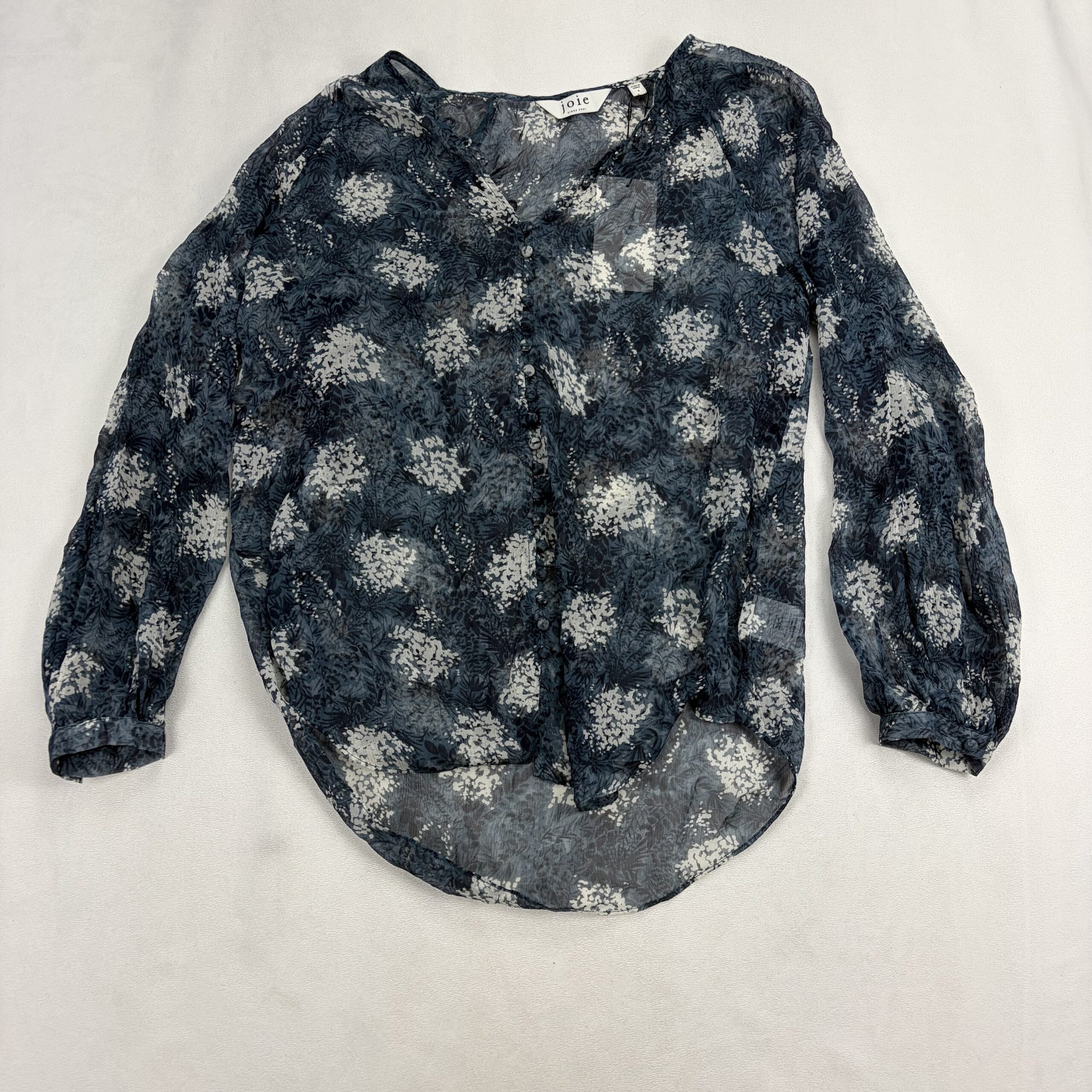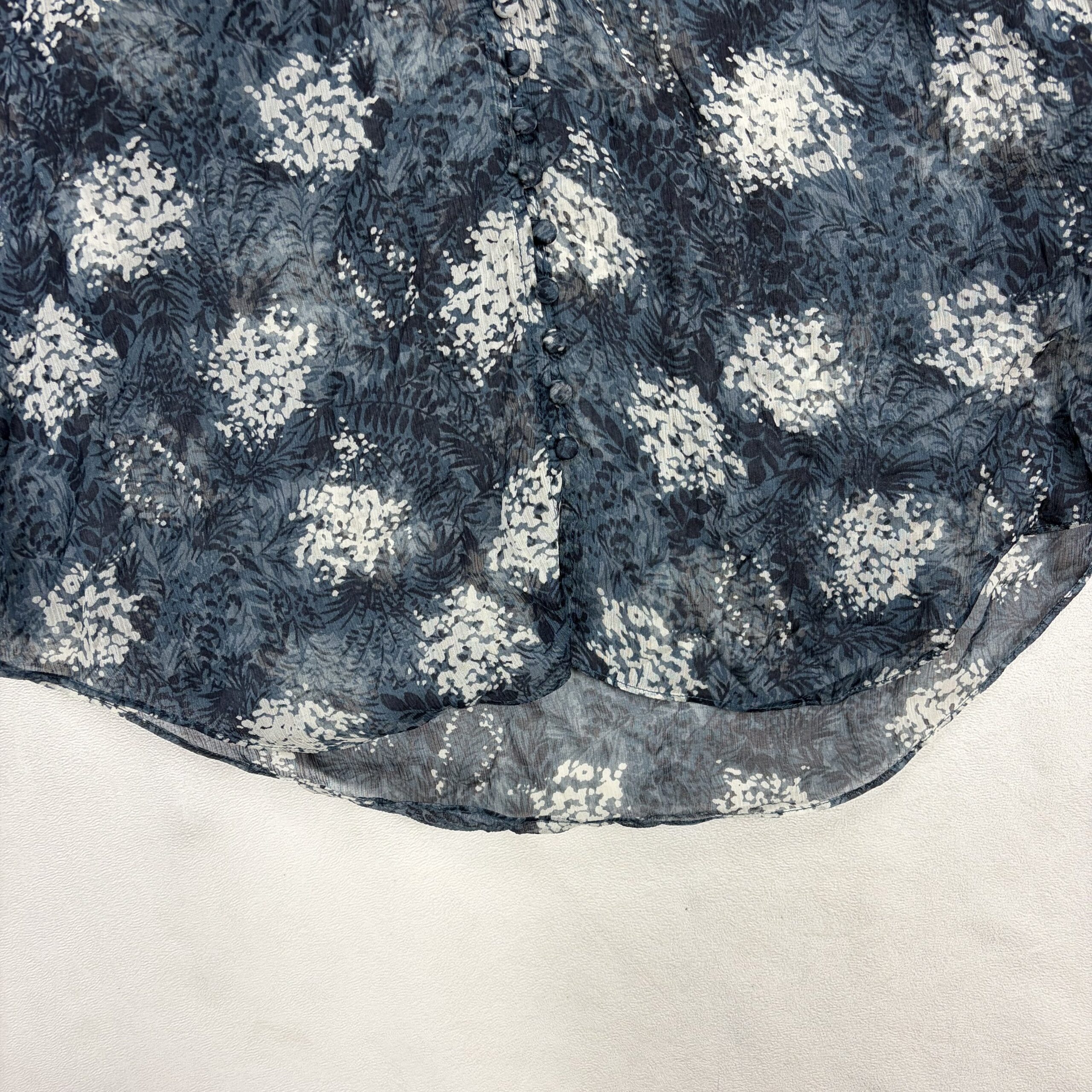 Joie 100% silk sheer floral blouse in Women’s size S. Lightweight, semi-sheer button-front with a V-neck, long blouson sleeves with button cuffs, and a subtle high-low hem. Soft navy/charcoal base with cream floral clusters — flowy, feminine silhouette perfect for layering over a cami.