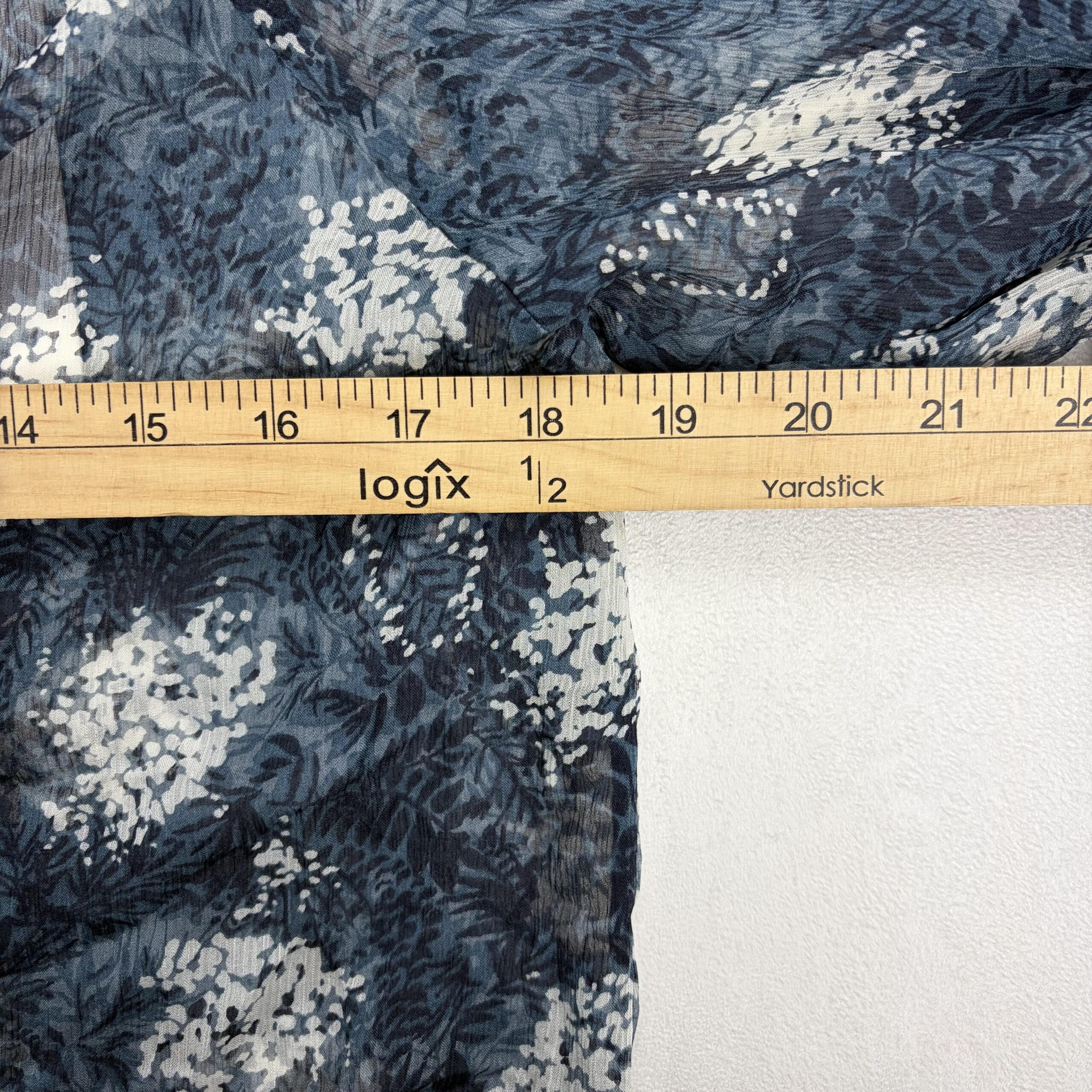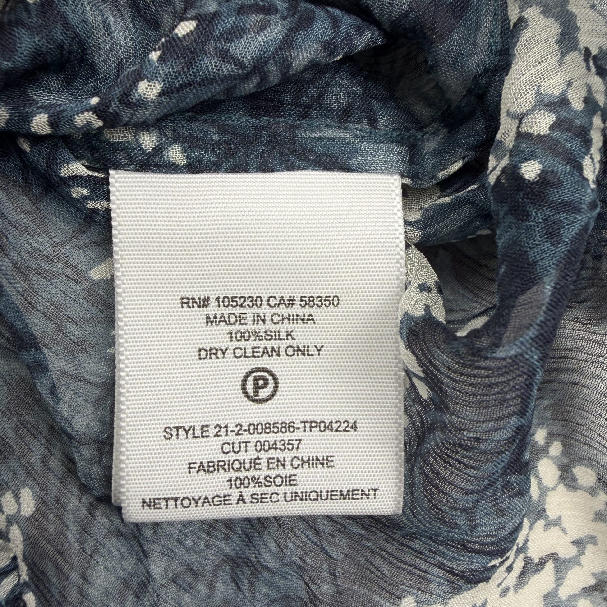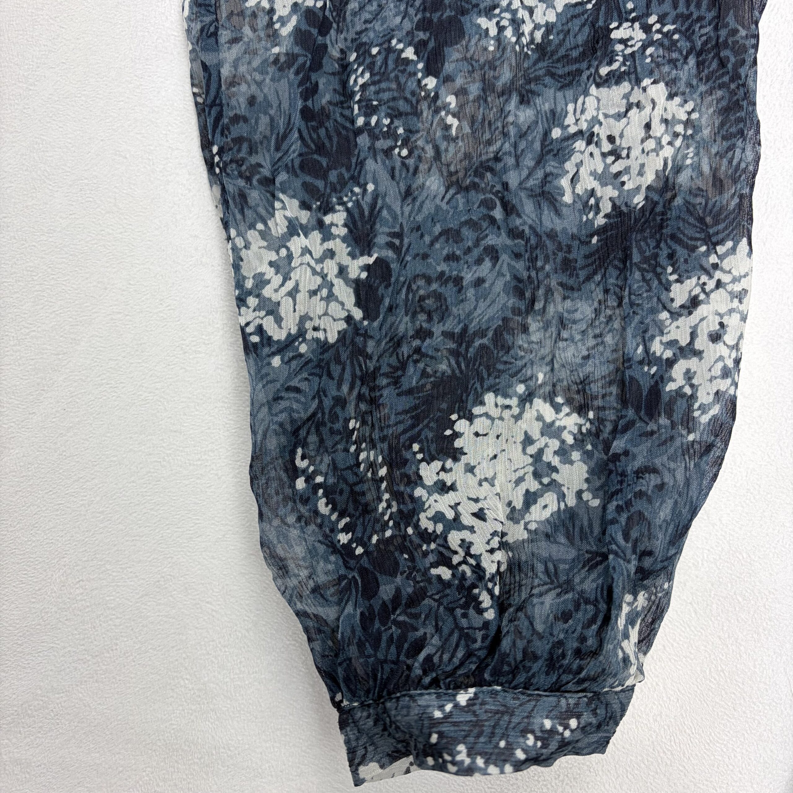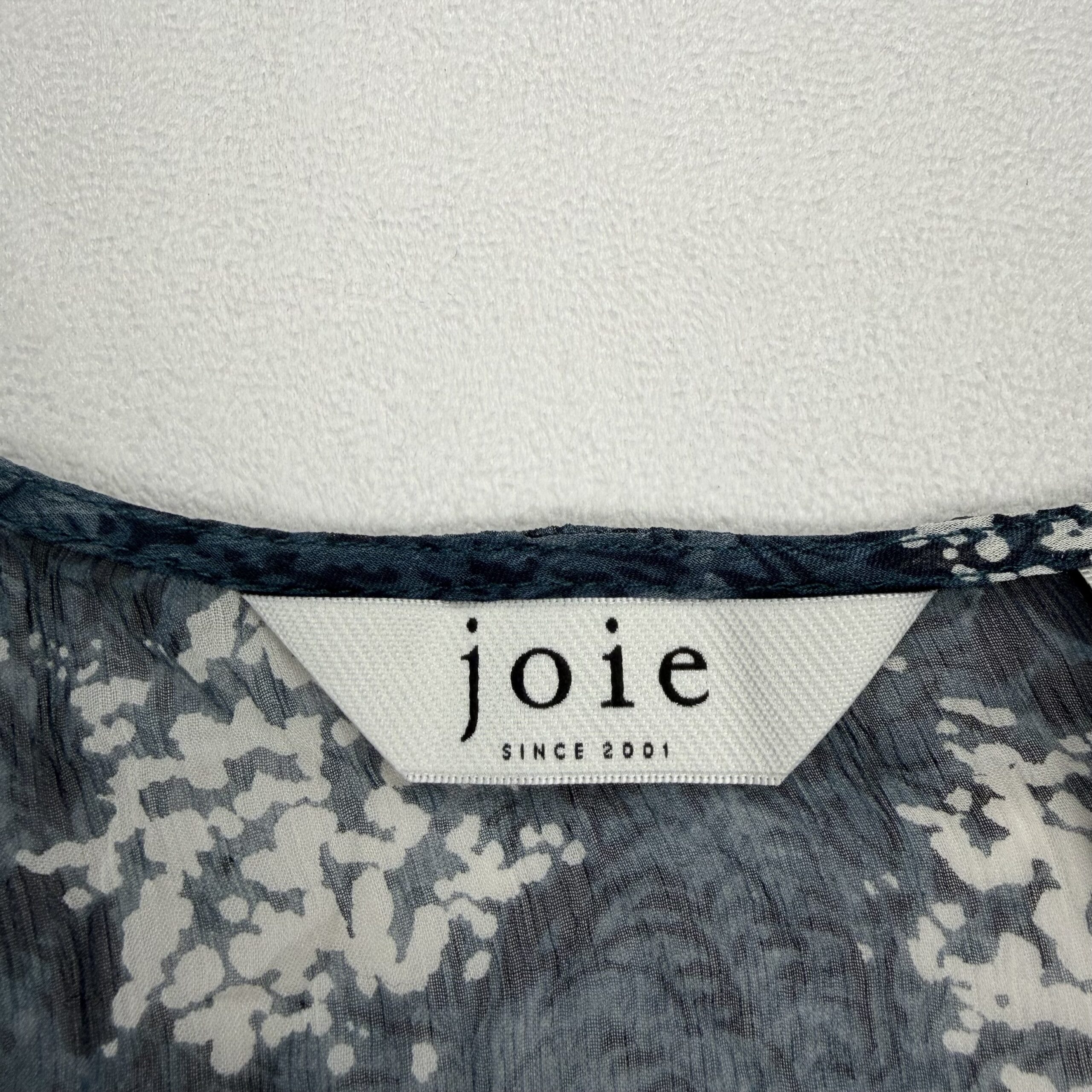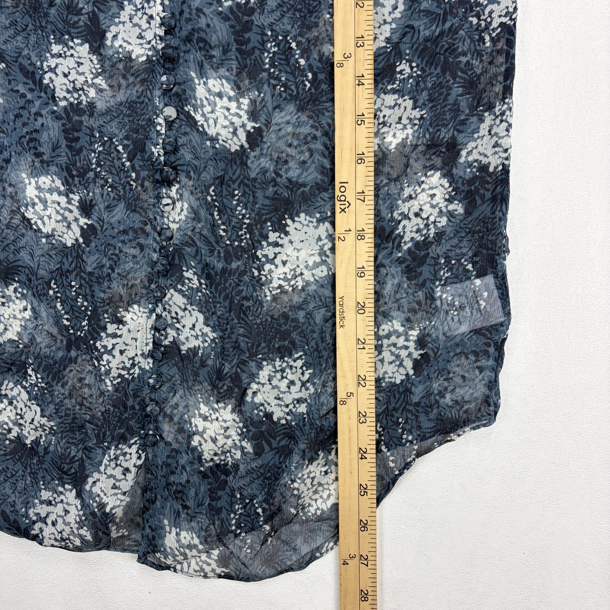 Joie 100% silk sheer floral blouse in Women’s size S. Lightweight, semi-sheer button-front with a V-neck, long blouson sleeves with button cuffs, and a subtle high-low hem. Soft navy/charcoal base with cream floral clusters — flowy, feminine silhouette perfect for layering over a cami.