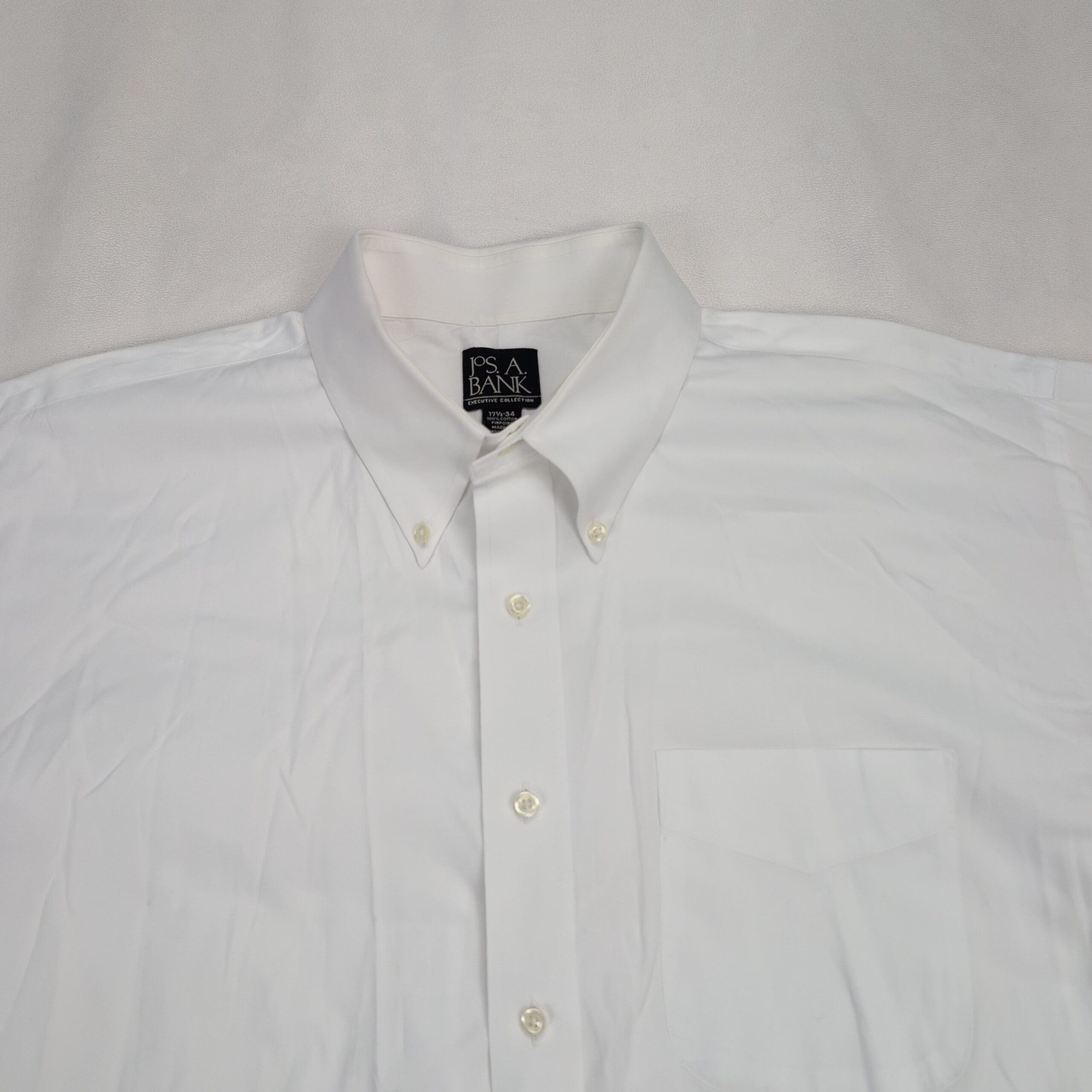 Jos. A. Bank Executive Collection men’s white dress shirt. Size: Neck 17.5 (Standard). Features a button-down collar, full button front, single chest pocket, and long sleeves with button cuffs — a classic, versatile dress shirt for office wear or formal occasions.