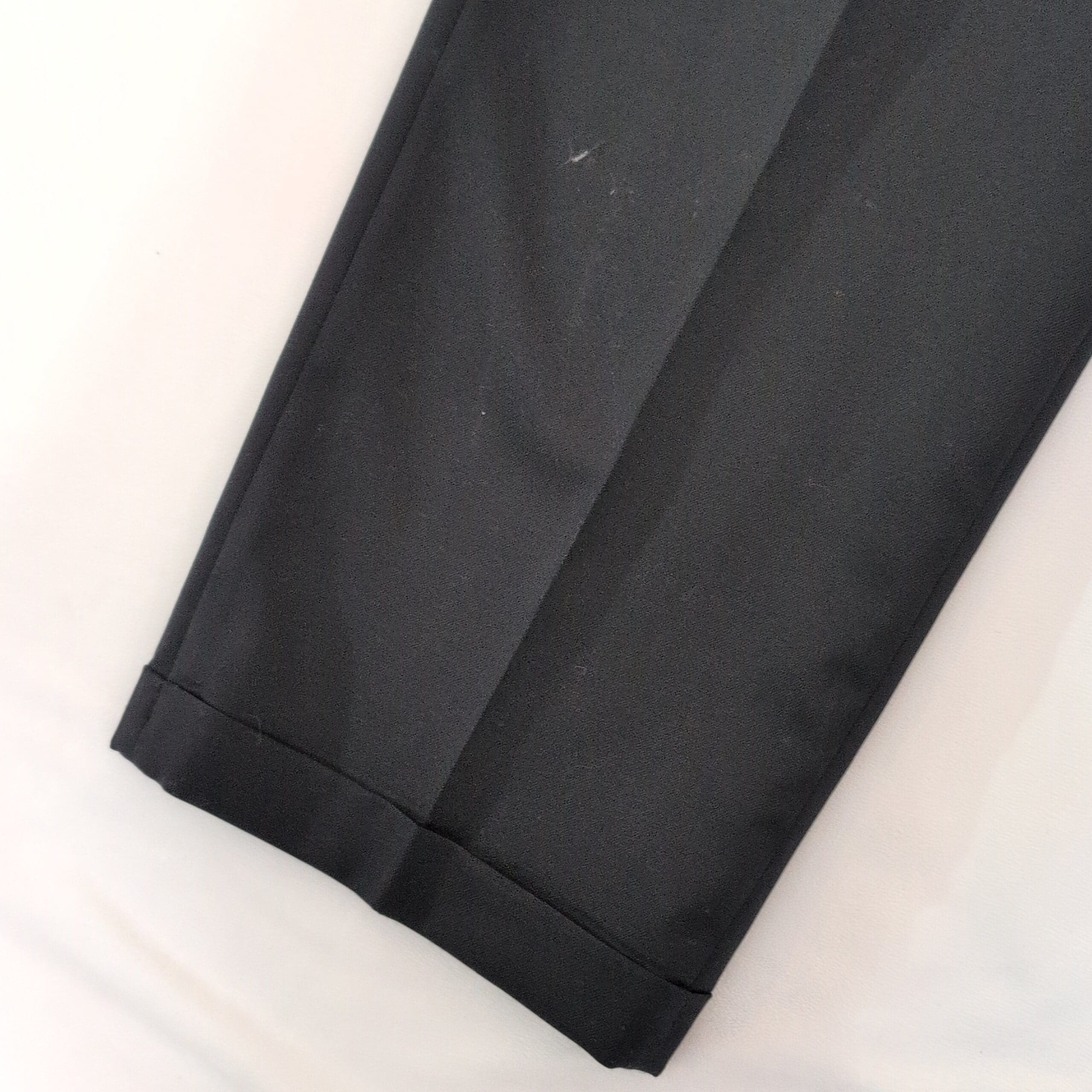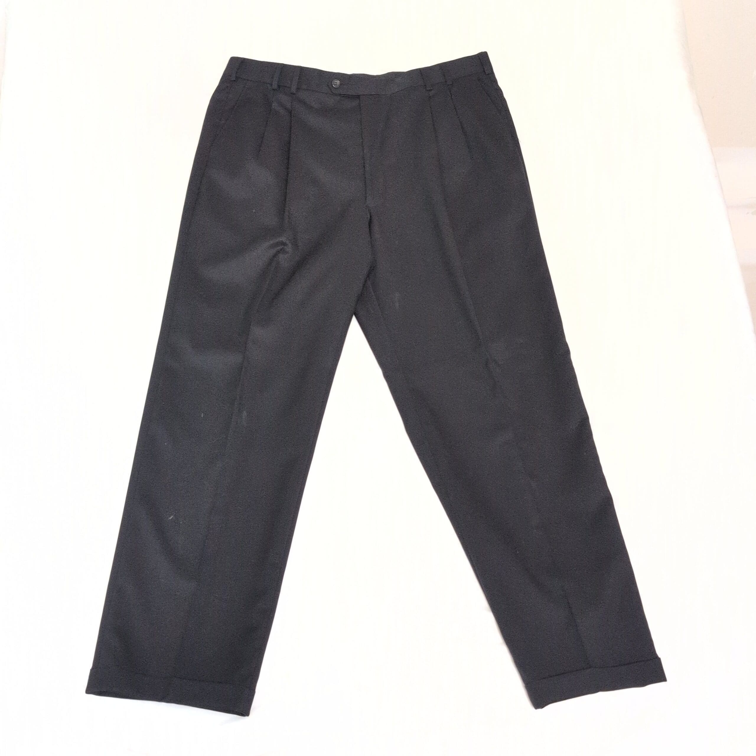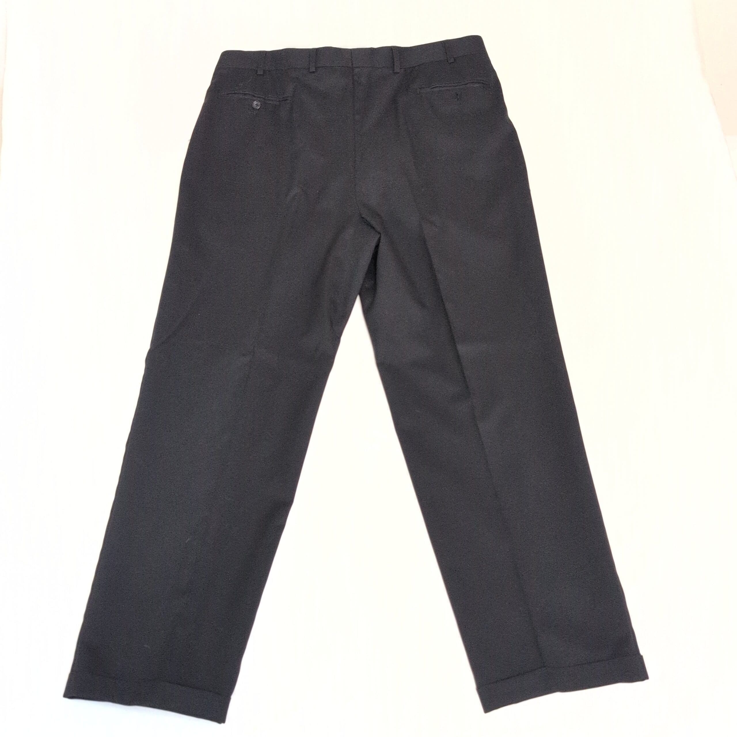 Features: Front pleats, belt loops, zip fly with button closure, cuffed hems, side pockets and back welt pockets. Straight leg with a tailored drape—ideal for office or formal wear.