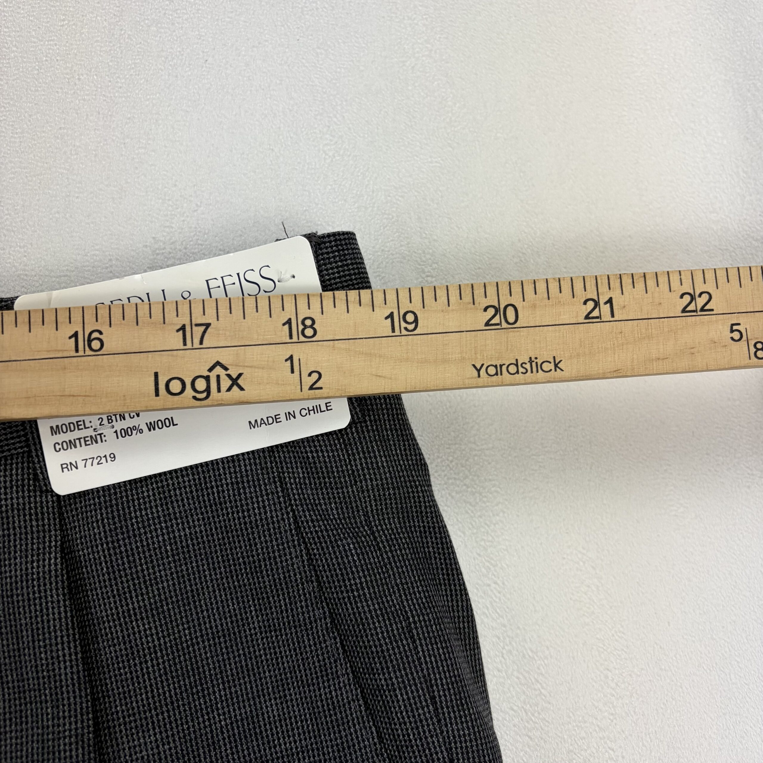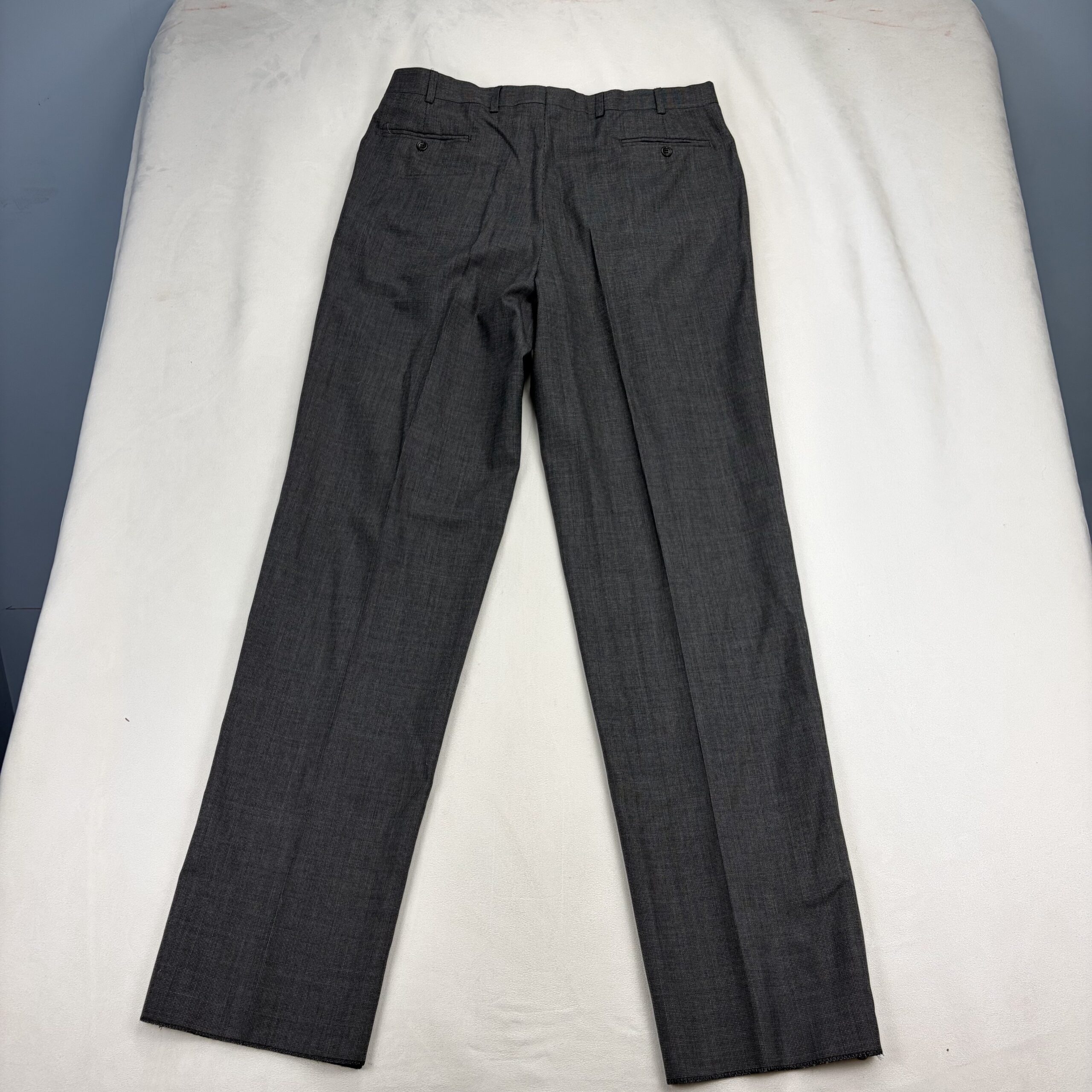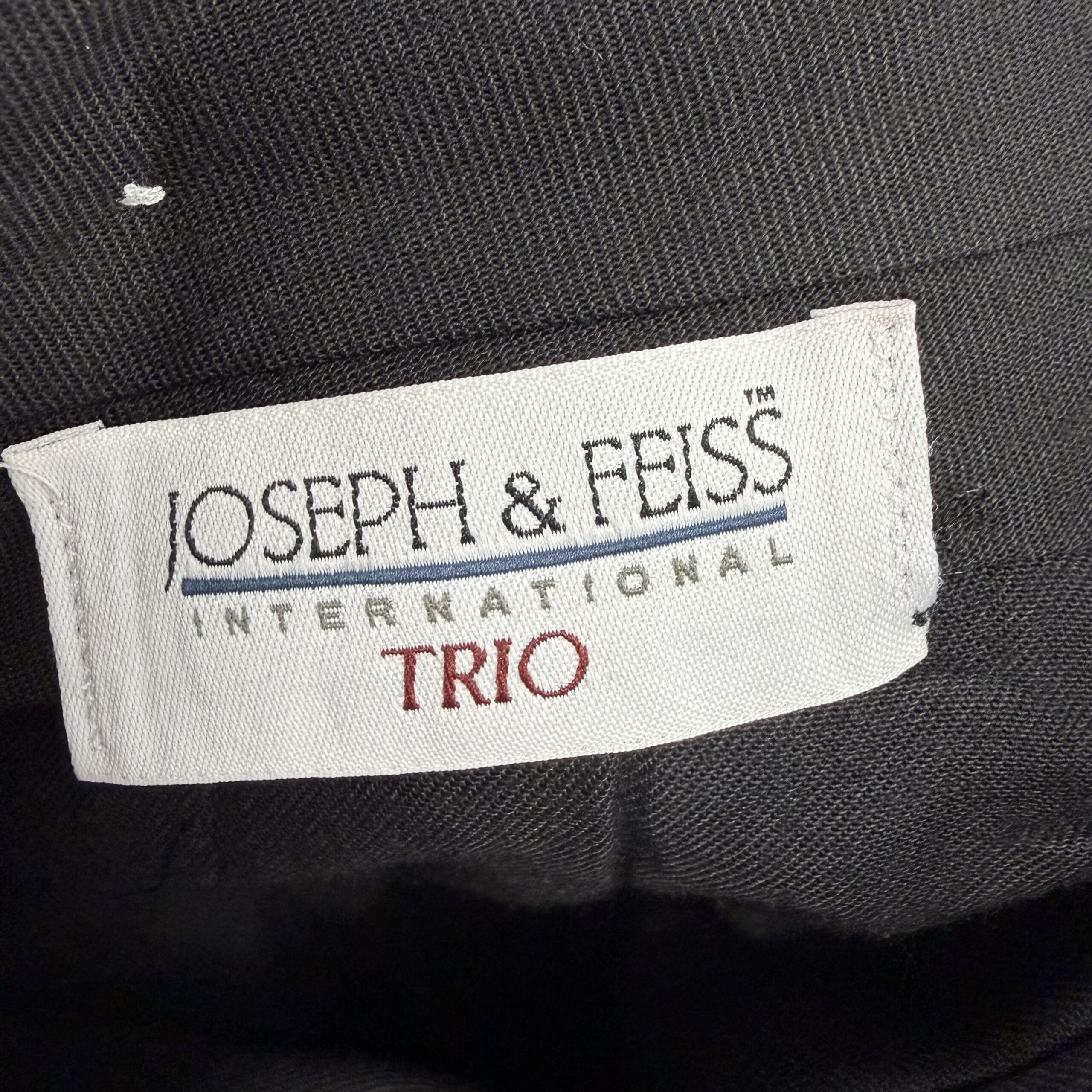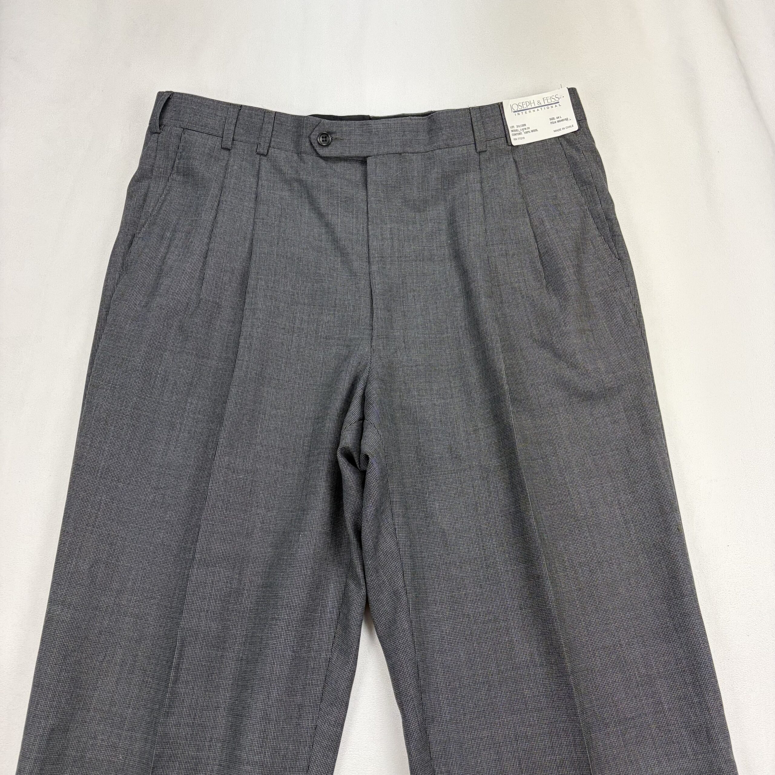 Charcoal gray Joseph & Feiss men’s dress pants. Classic pleated front with sharp center creases, belt loops, and button-and-zip fly. Size: Waist 39 (Long). Excellent used condition with typical light wear; minor fraying at the hem noted in photos. Fabric/content not listed. No major stains, rips, or odors — ready to wear or tailor for a perfect fit.