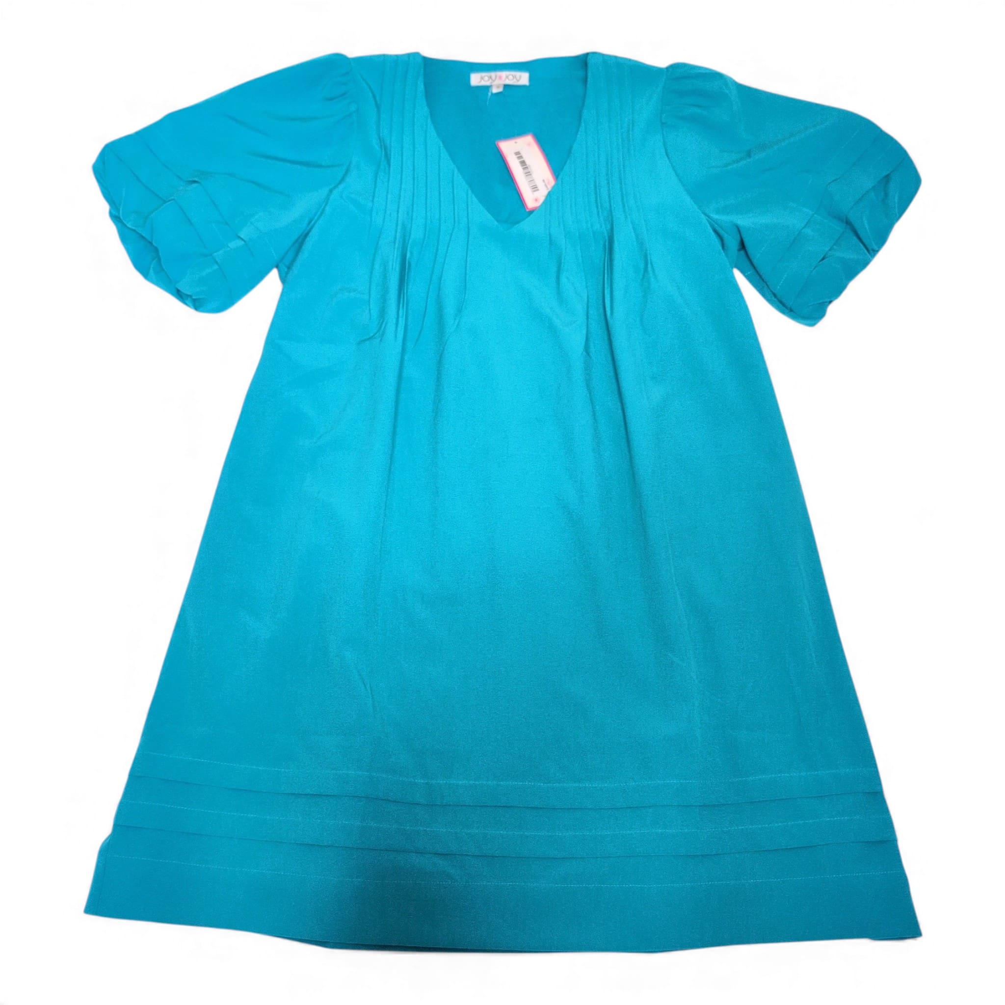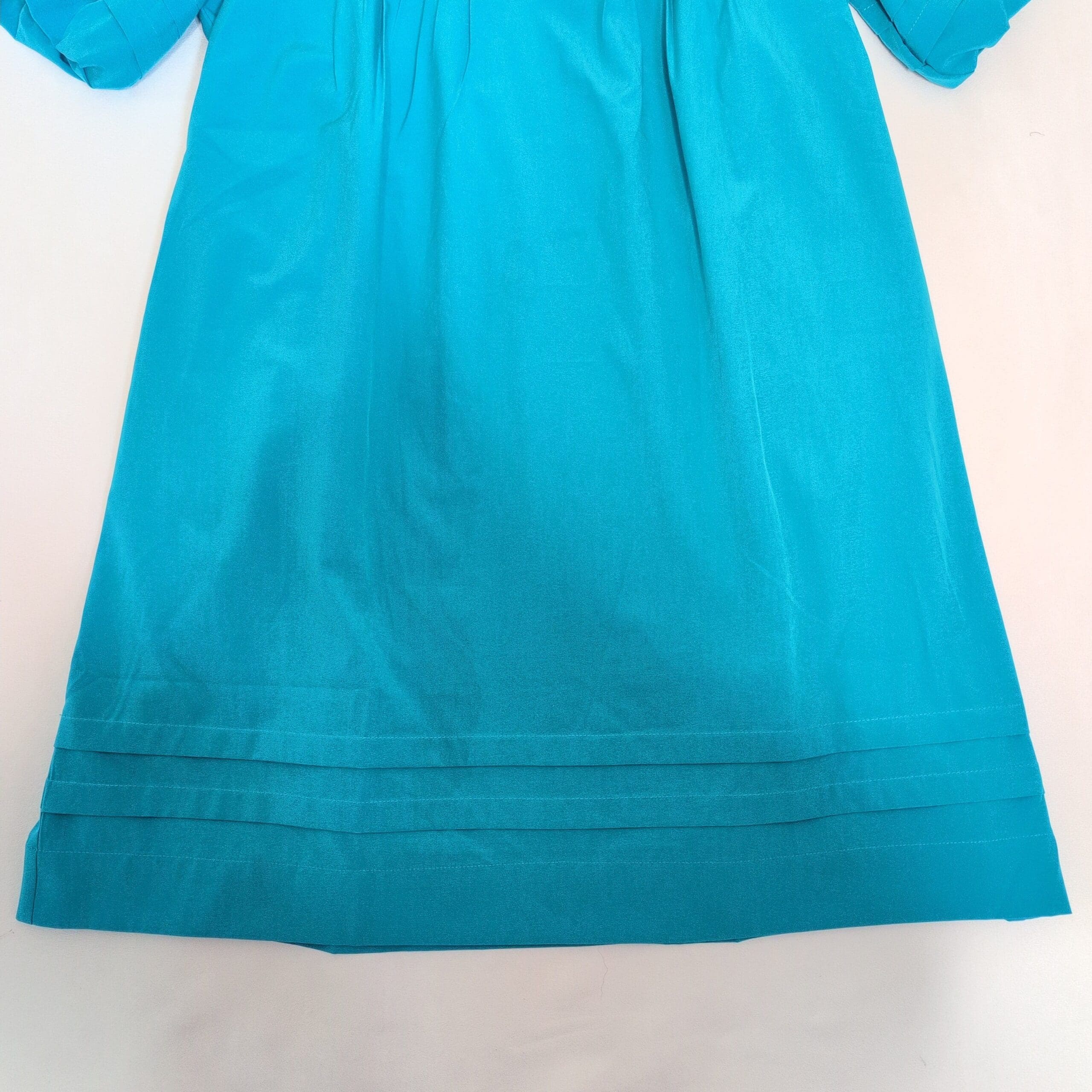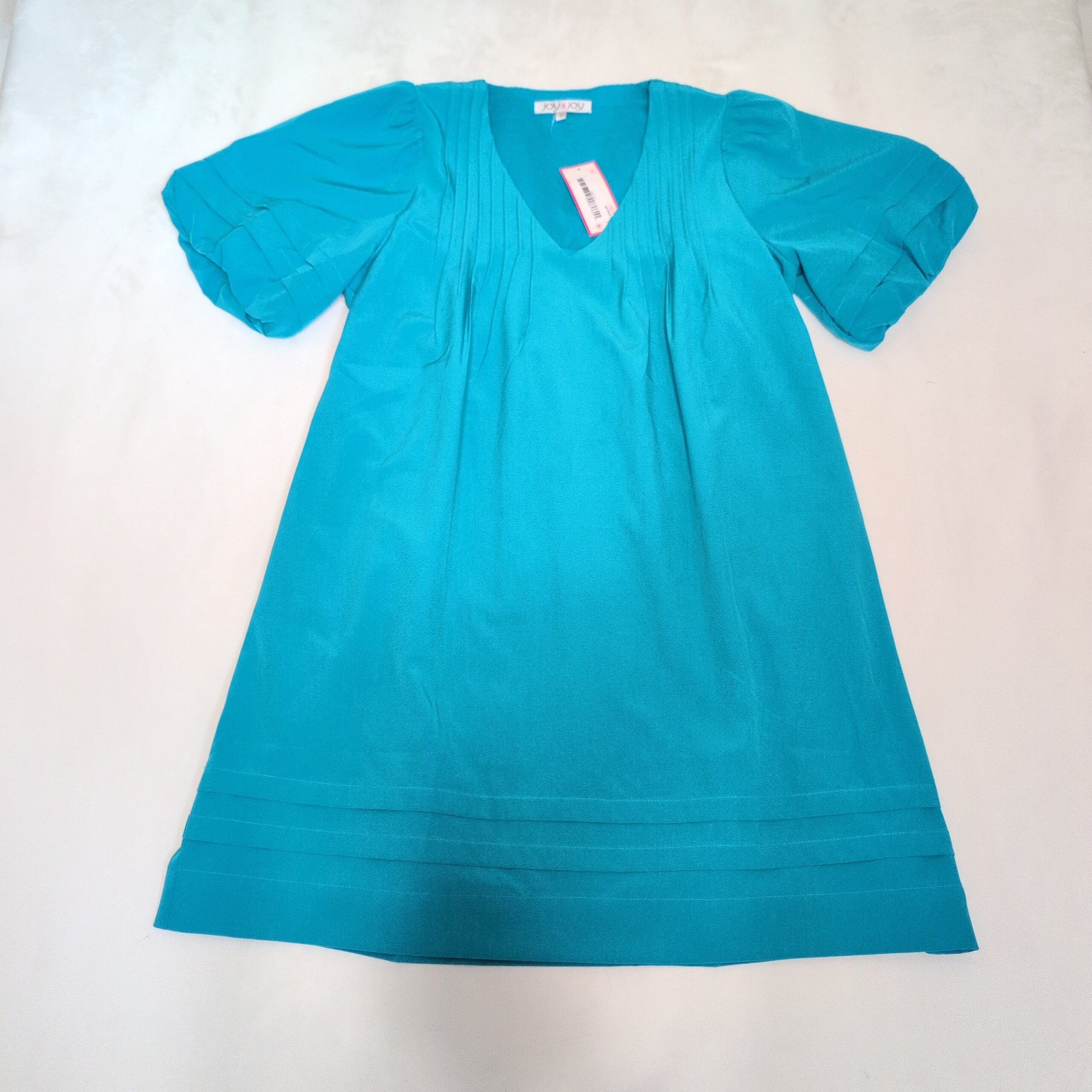 Joy Joy women’s dress in a bright blue, size M (standard). New with tags — original tag price $165 (MSRP). Features a V-neck, pintuck pleating across the bodice and at the hem, short puff sleeves with pleat detail, and a relaxed A-line silhouette. Clean, unworn condition with original tag attached. Great for daytime events or casual dress-up.