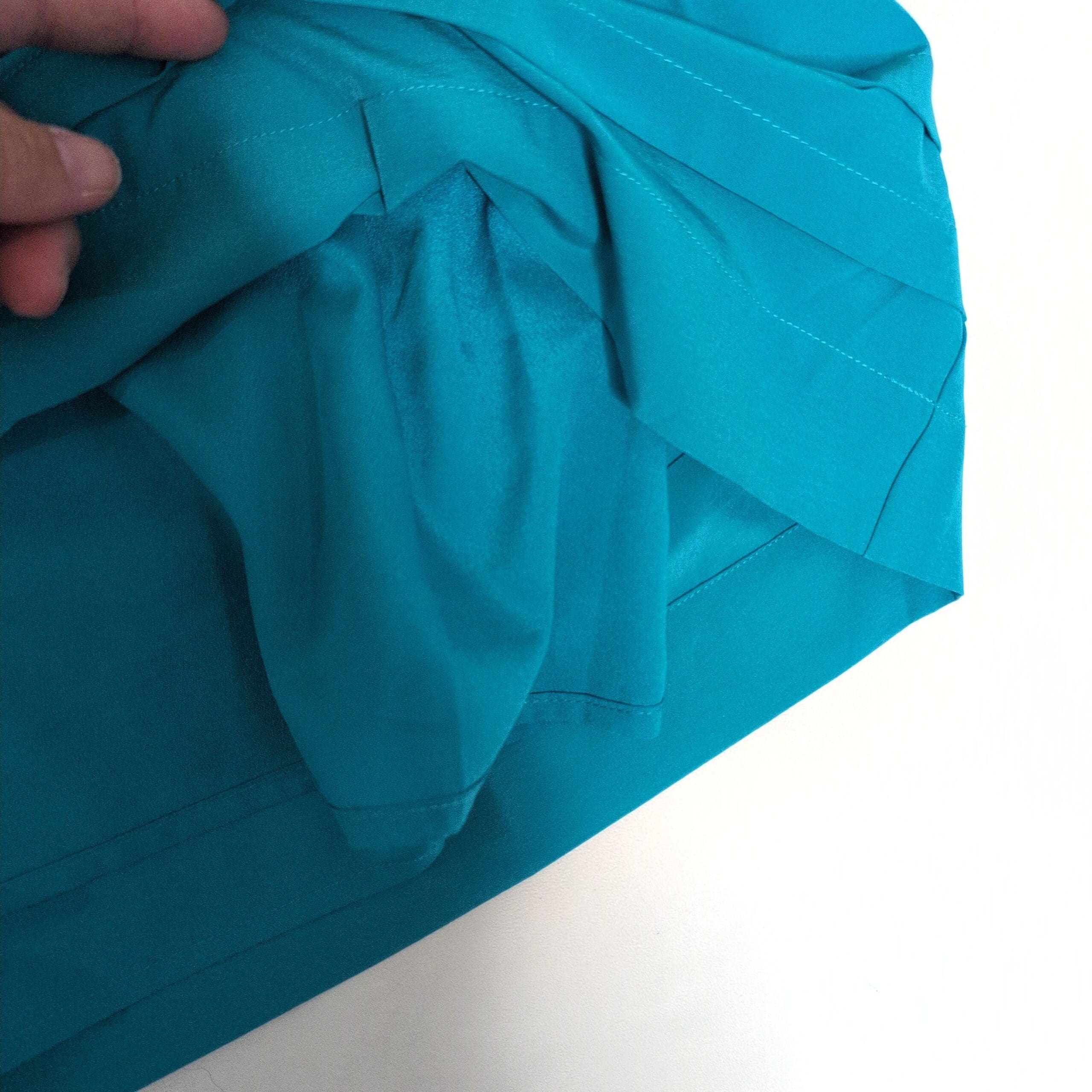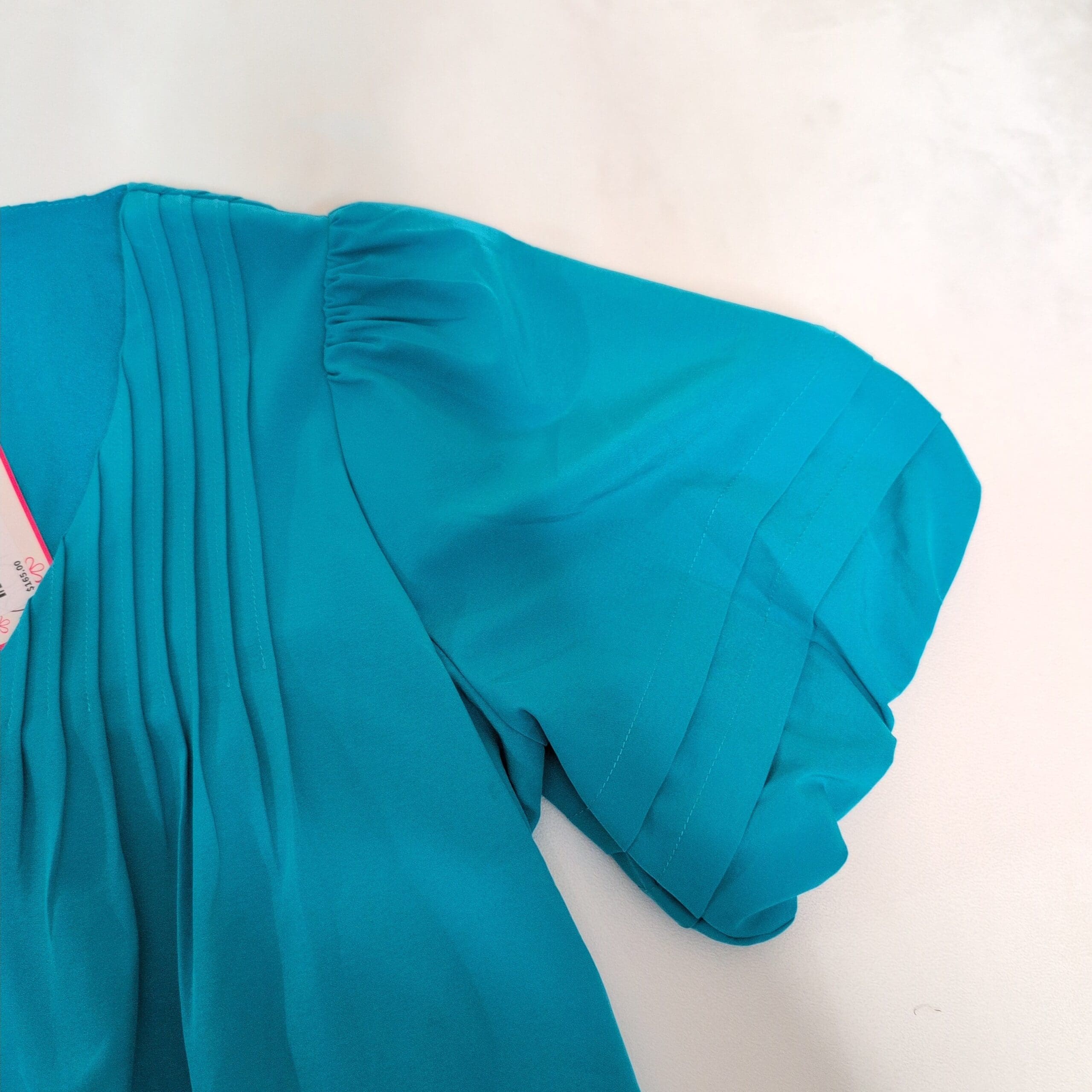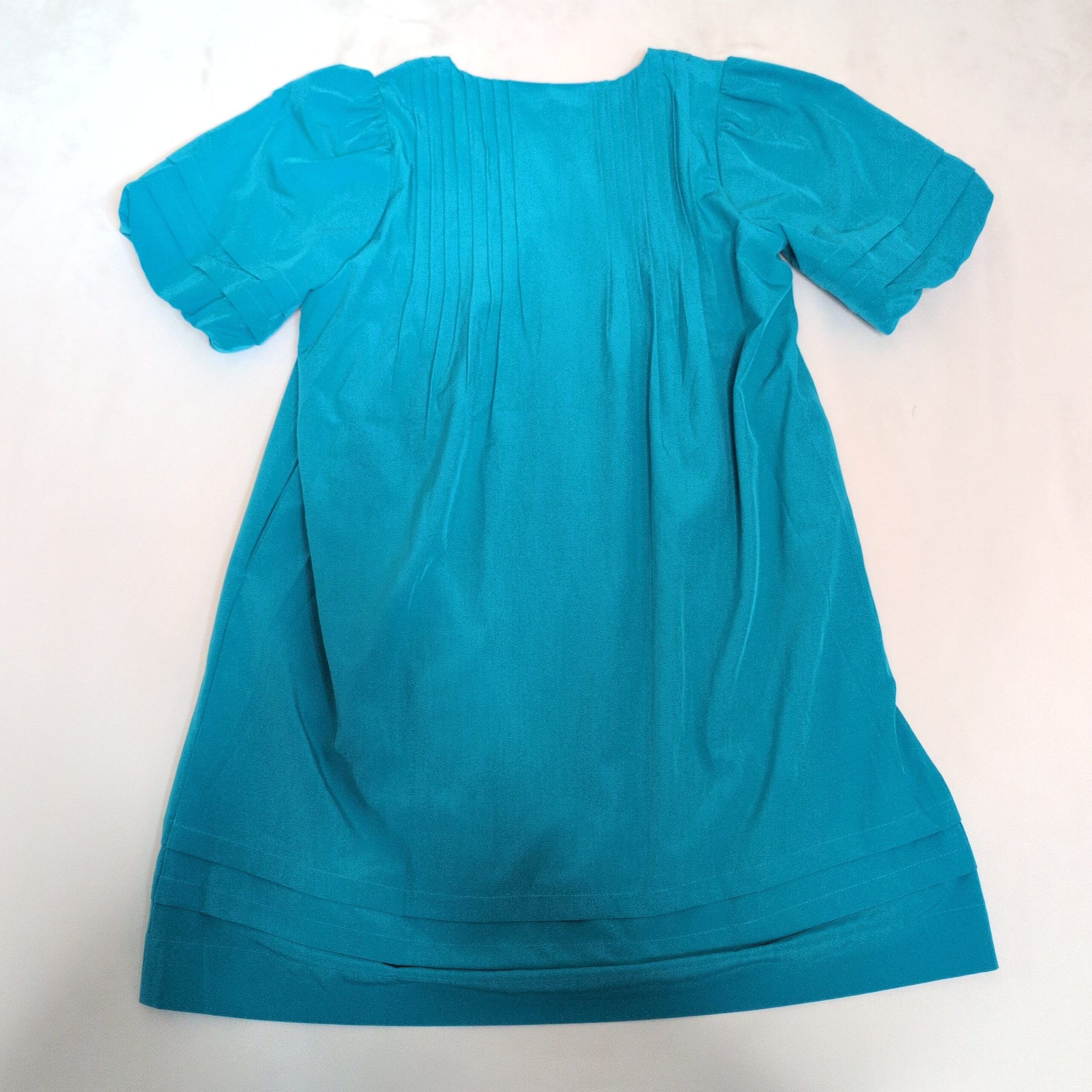 Joy Joy women’s dress in a bright blue, size M (standard). New with tags — original tag price $165 (MSRP). Features a V-neck, pintuck pleating across the bodice and at the hem, short puff sleeves with pleat detail, and a relaxed A-line silhouette. Clean, unworn condition with original tag attached. Great for daytime events or casual dress-up.