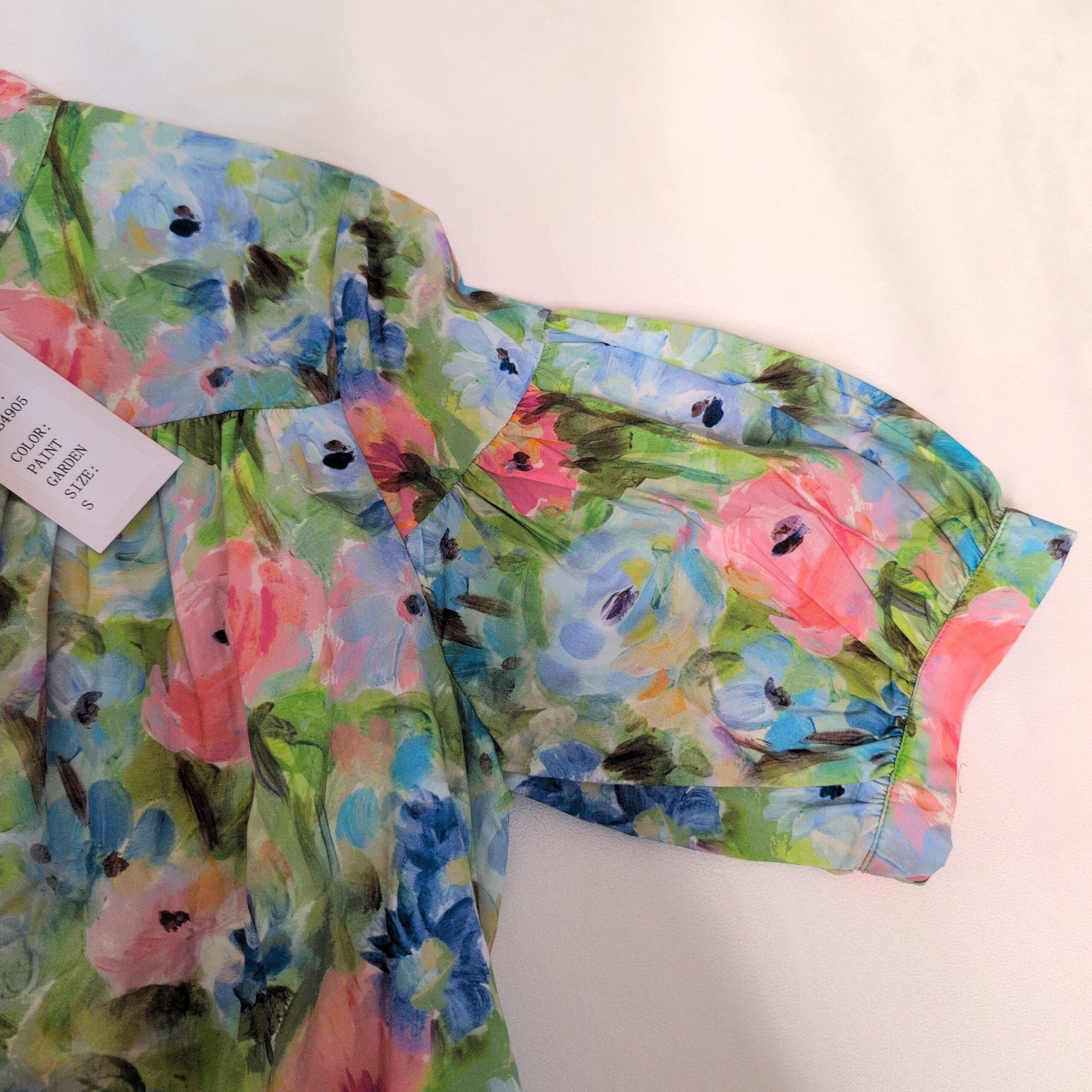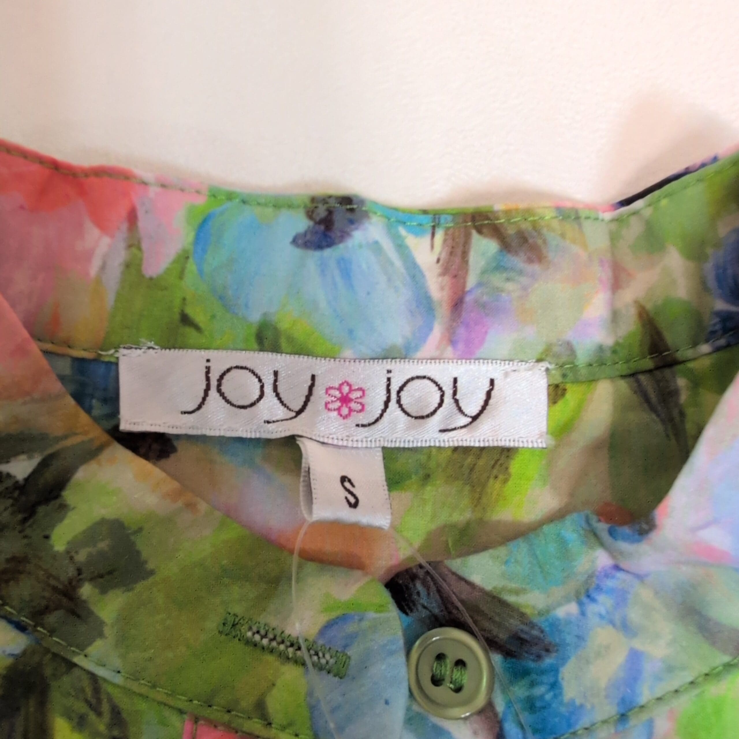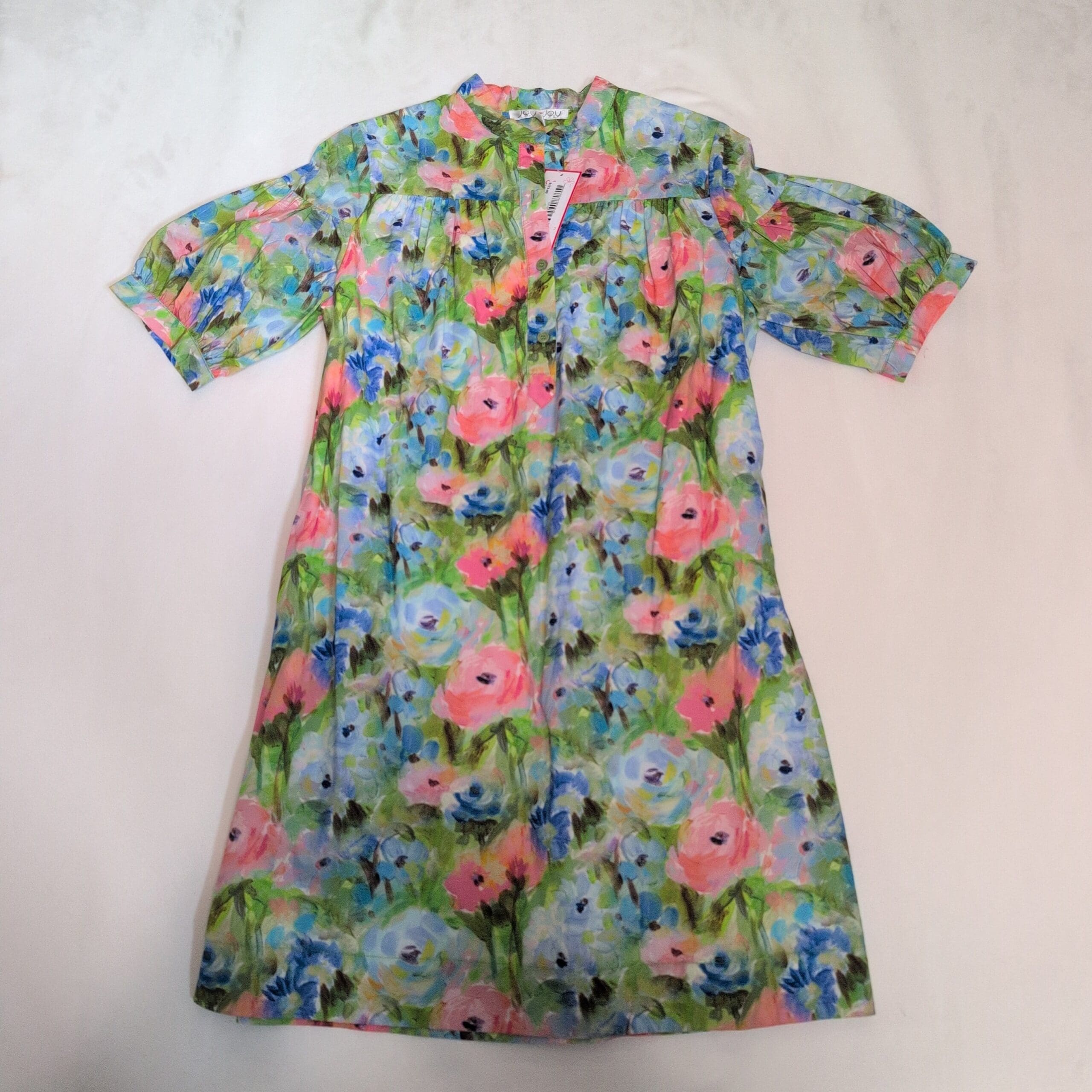 Joy Joy women’s floral dress in a vibrant green watercolor-inspired print. Size S (standard). New with tags and includes the detachable blue sash belt. Features button-front detail and short sleeves with a full skirt for a classic, feminine silhouette. Perfect for spring events, daytime outings, or dressed-up occasions. MSRP listed at $173.