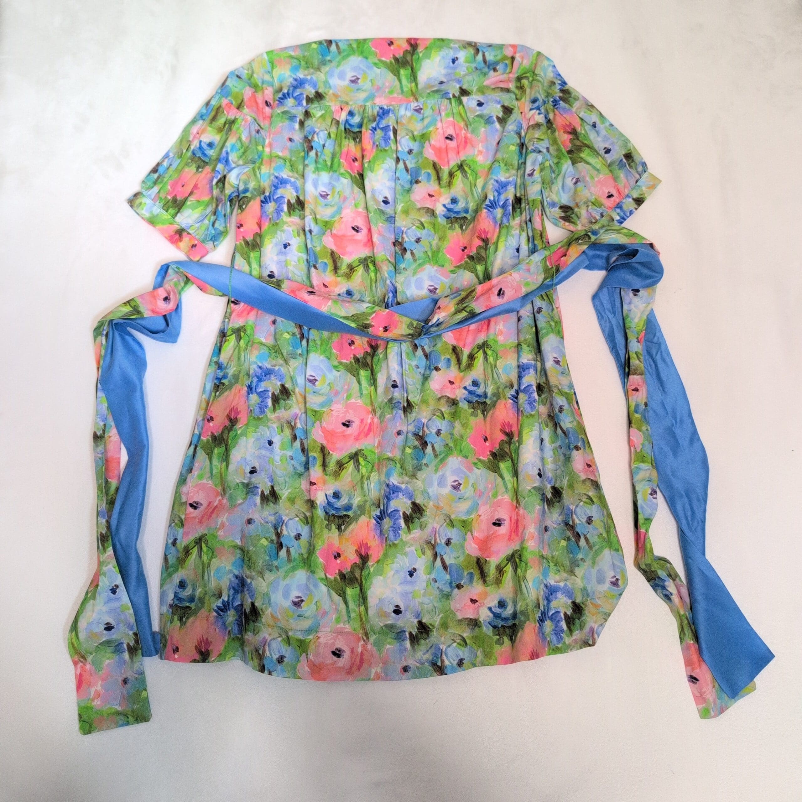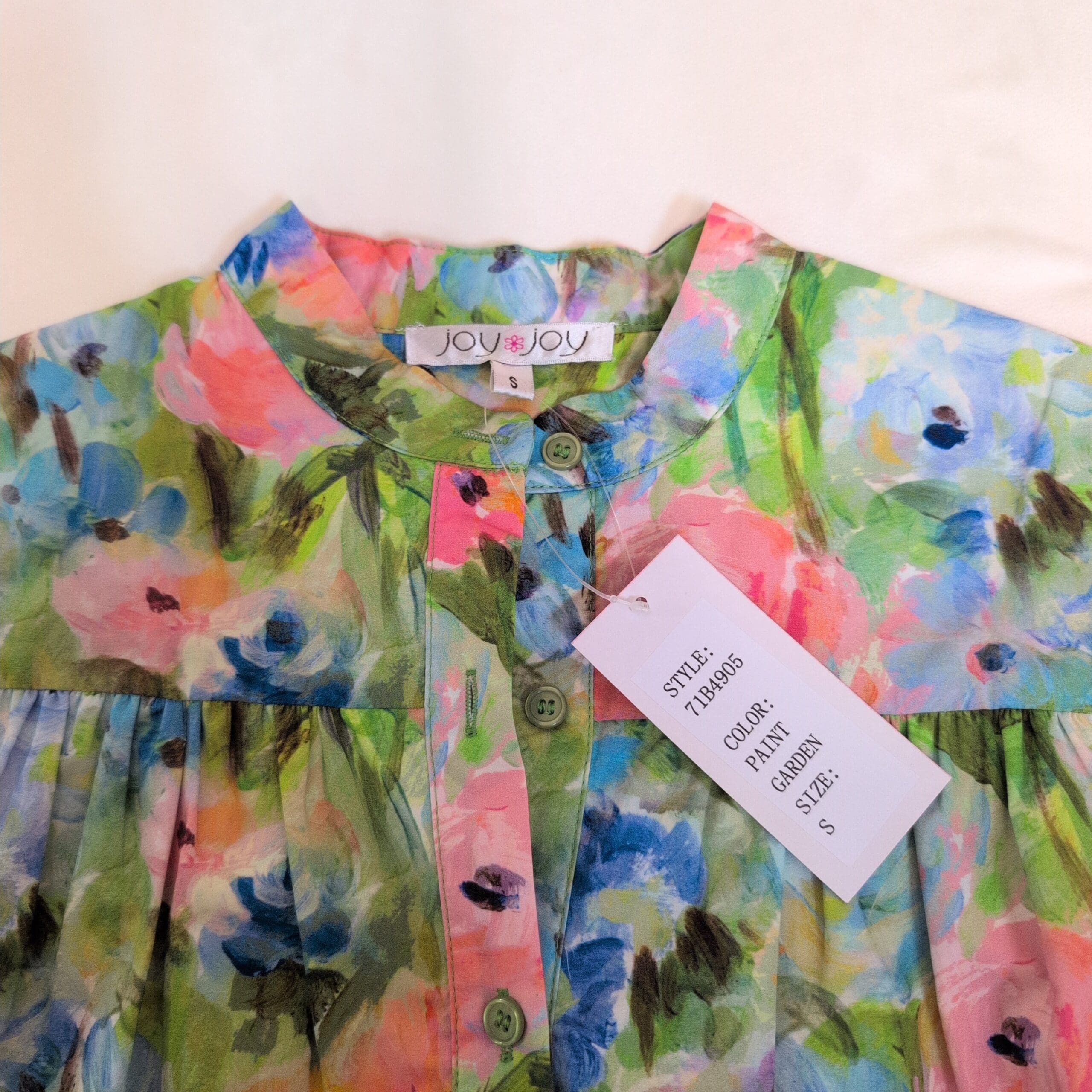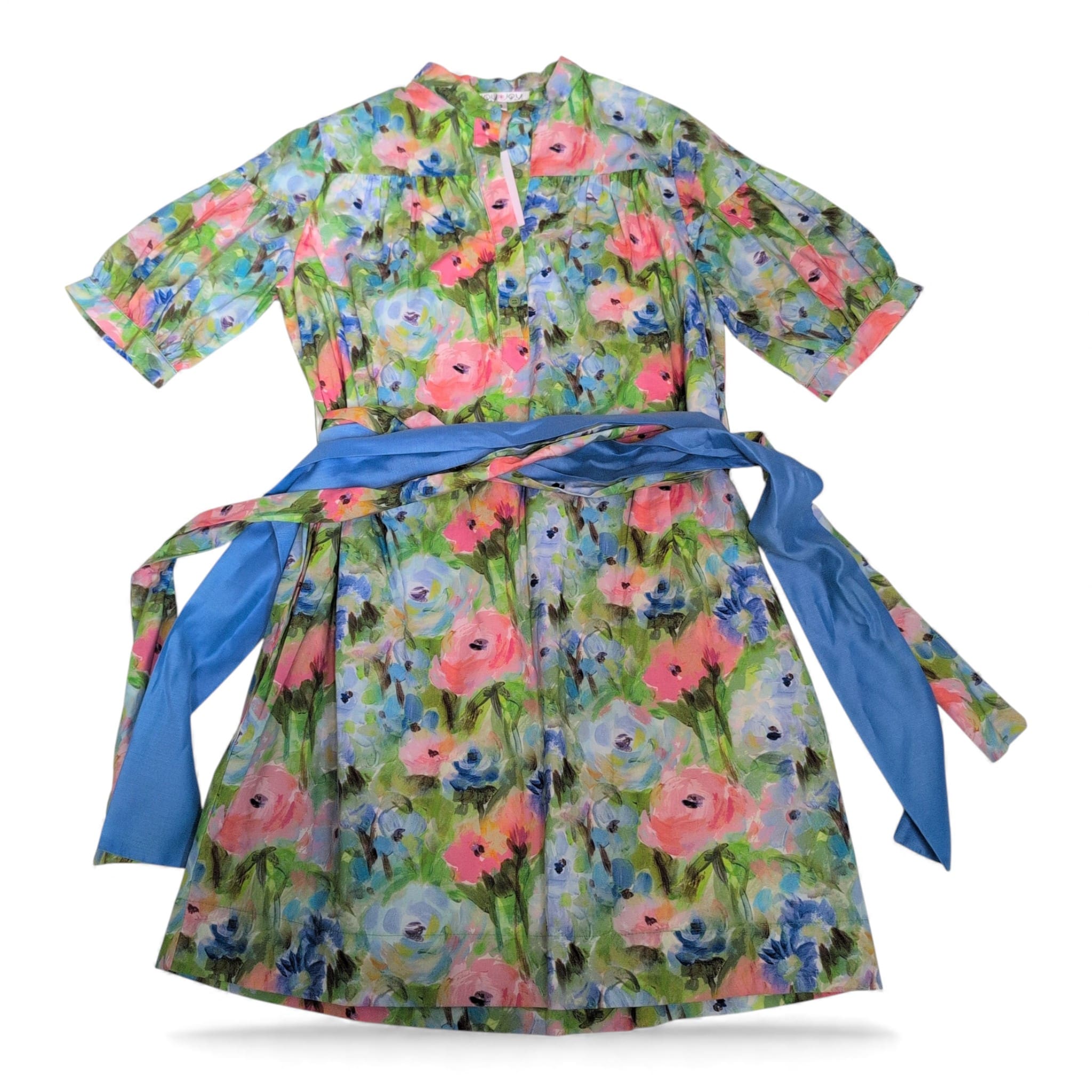 Joy Joy women’s floral dress in a vibrant green watercolor-inspired print. Size S (standard). New with tags and includes the detachable blue sash belt. Features button-front detail and short sleeves with a full skirt for a classic, feminine silhouette. Perfect for spring events, daytime outings, or dressed-up occasions. MSRP listed at $173.