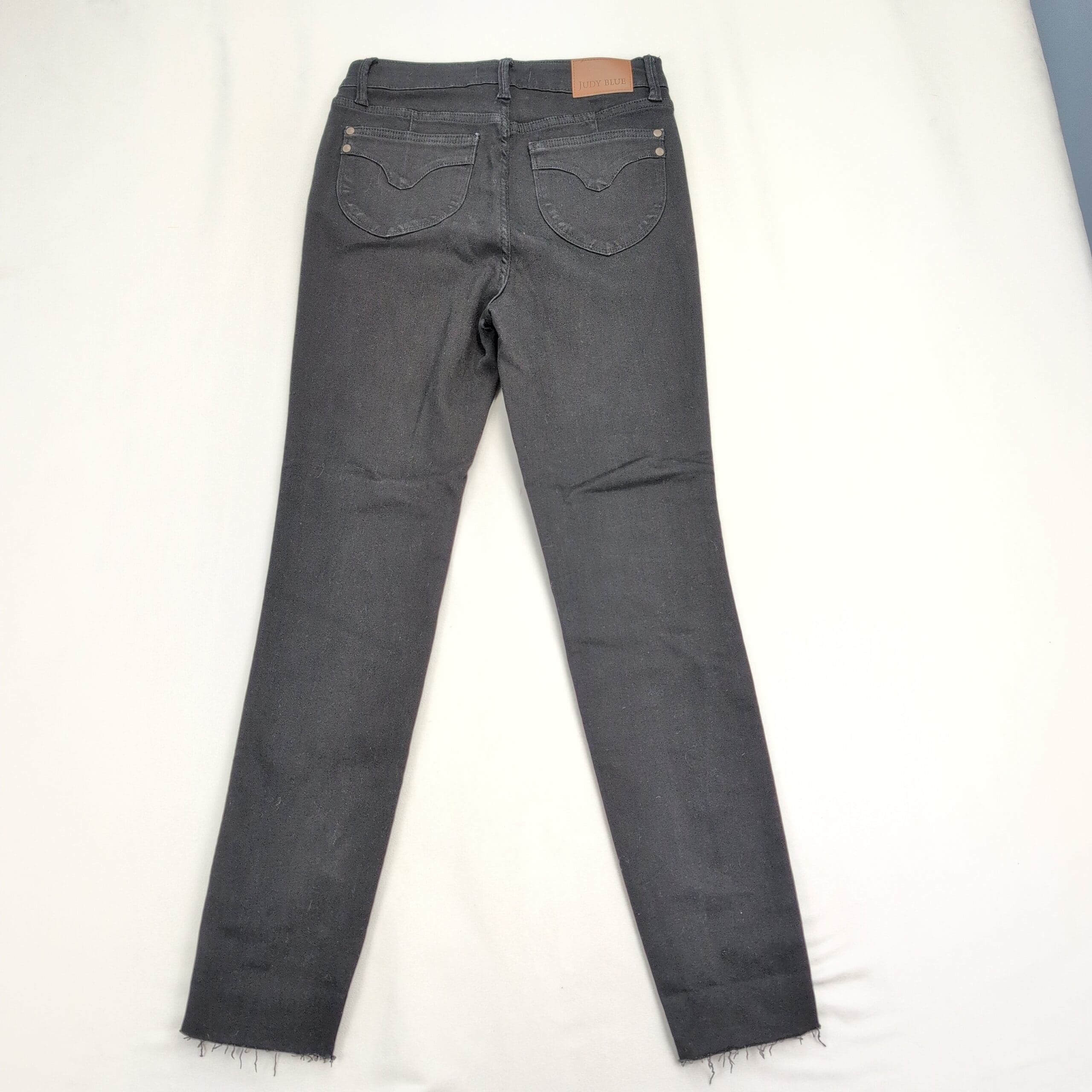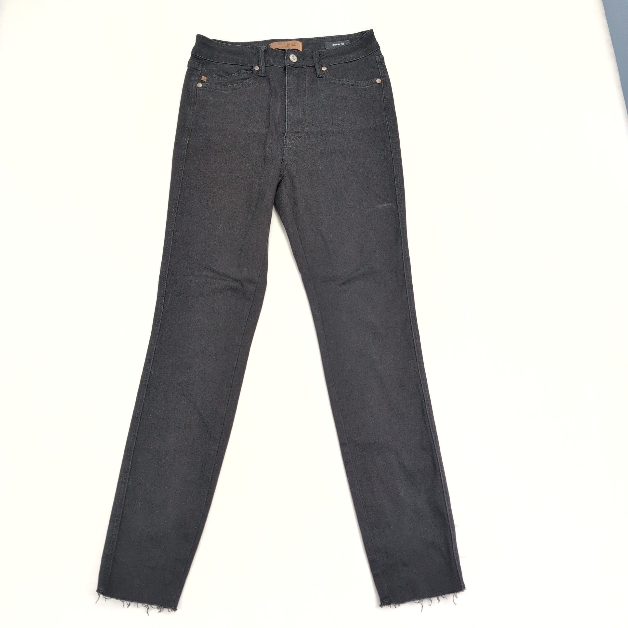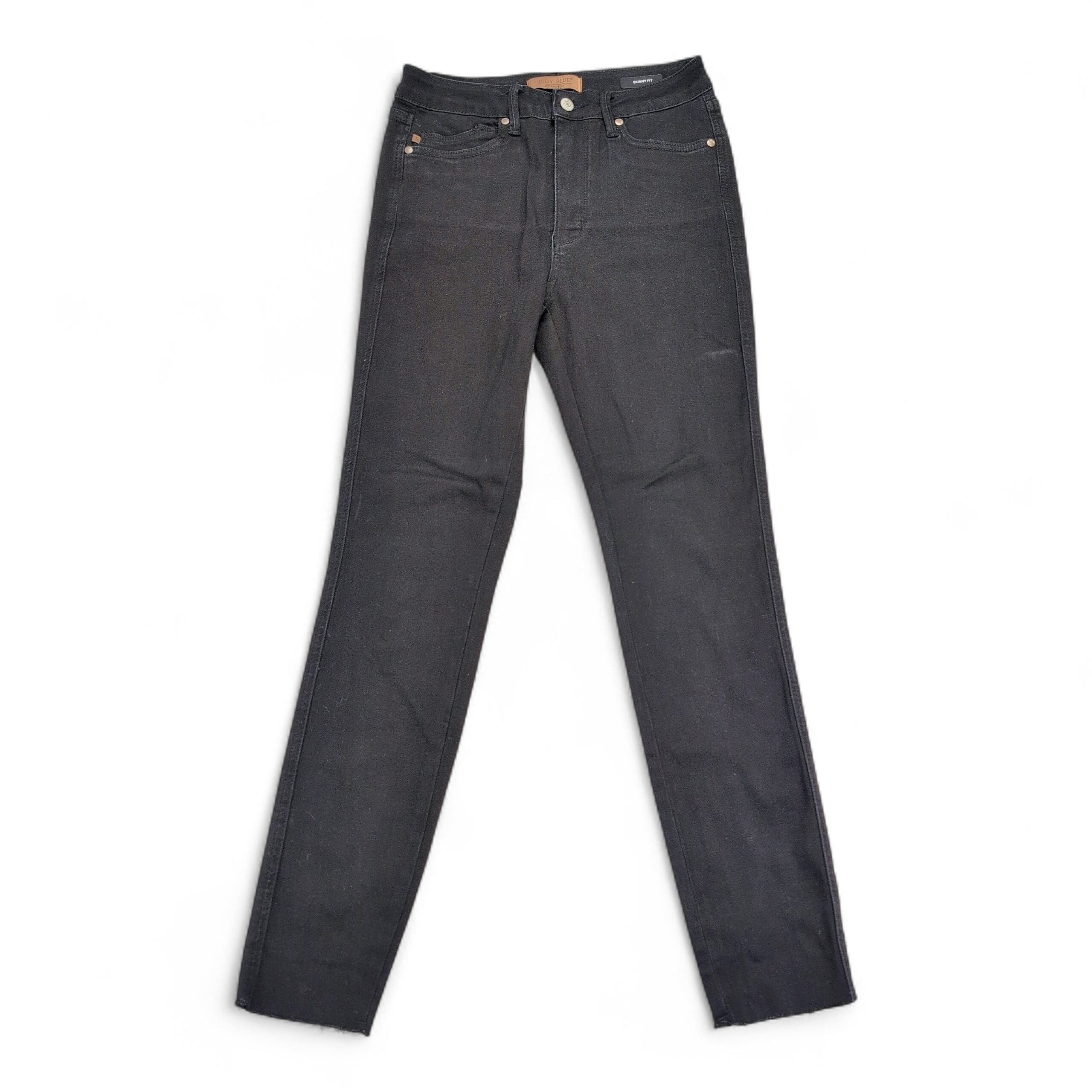 Judy Blue women’s black skinny jeans in size 28. Classic slim silhouette with a slightly cropped ankle and intentional raw/frayed hem detail for an on-trend look. Features five-pocket styling and a button fly. Excellent used condition — free of major rips, tears, or stains; shows typical light wear consistent with gentle use. See photos for details.