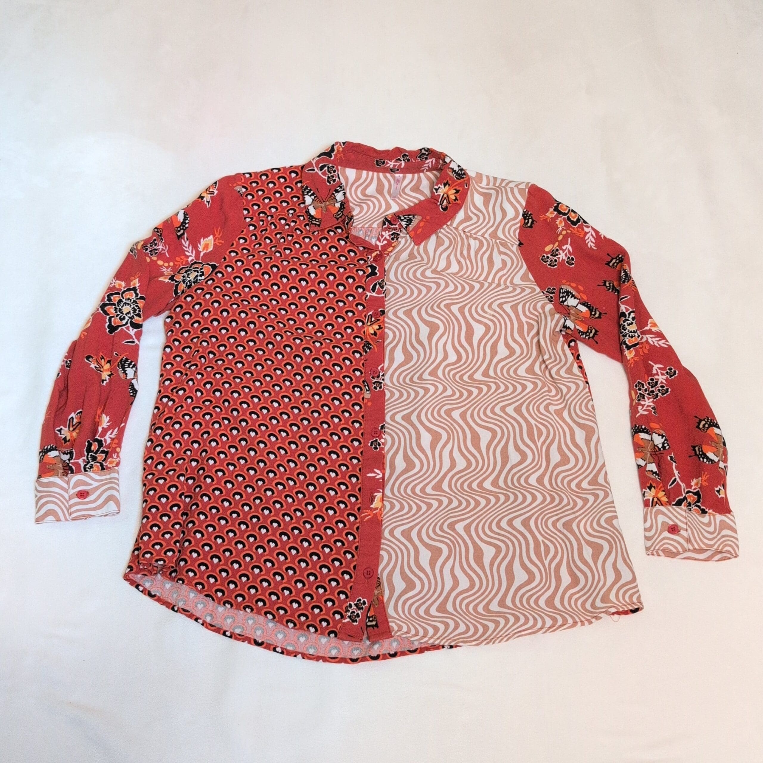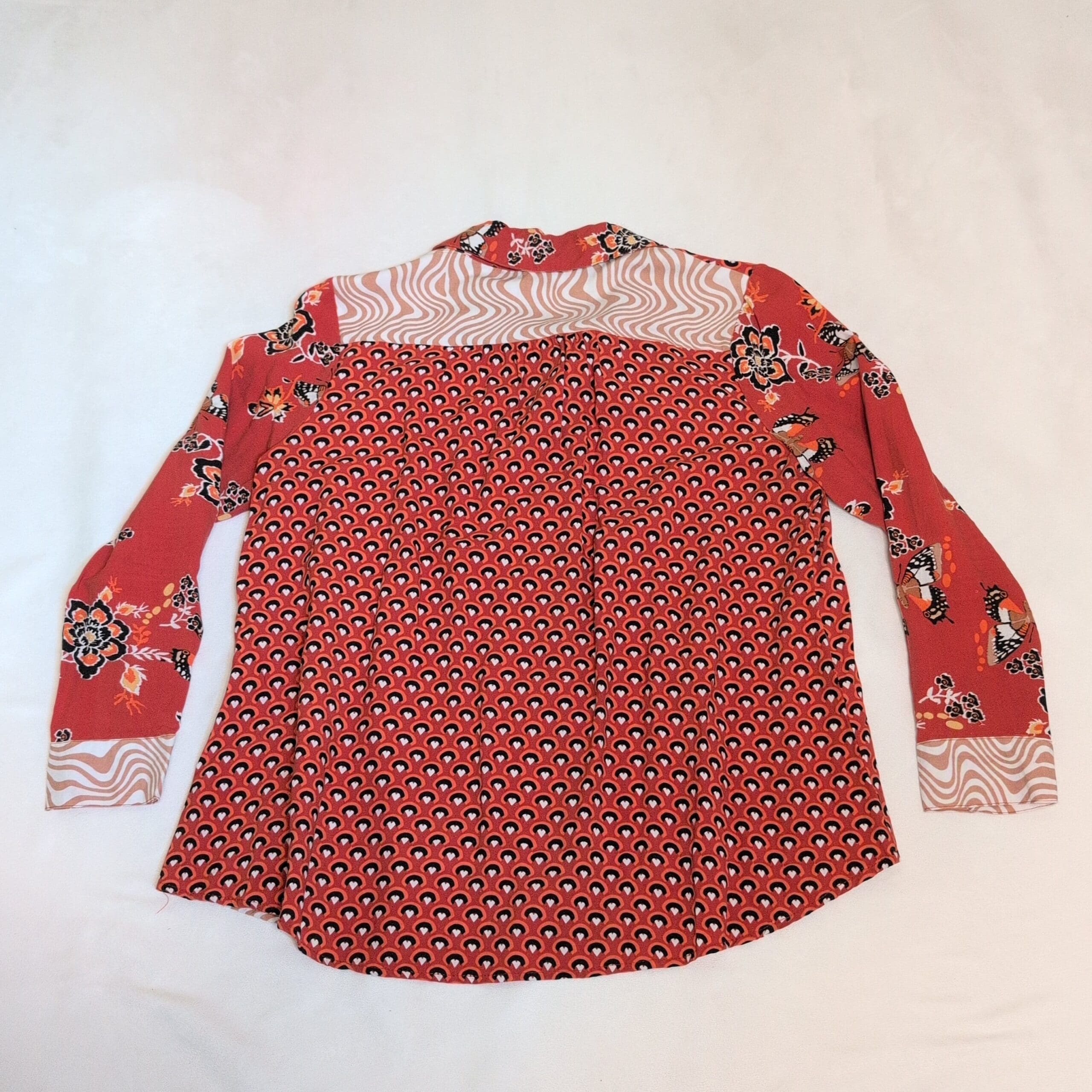 Vibrant orange button-front blouse from JW Style featuring contrasting mixed prints — geometric dots, wavy stripe panel, and floral sleeves. Collared neckline, long sleeves with button cuffs, and a lightweight drapey fabric that layers nicely for work or weekend styling. Size S; classic blouse silhouette with a slightly curved hem.