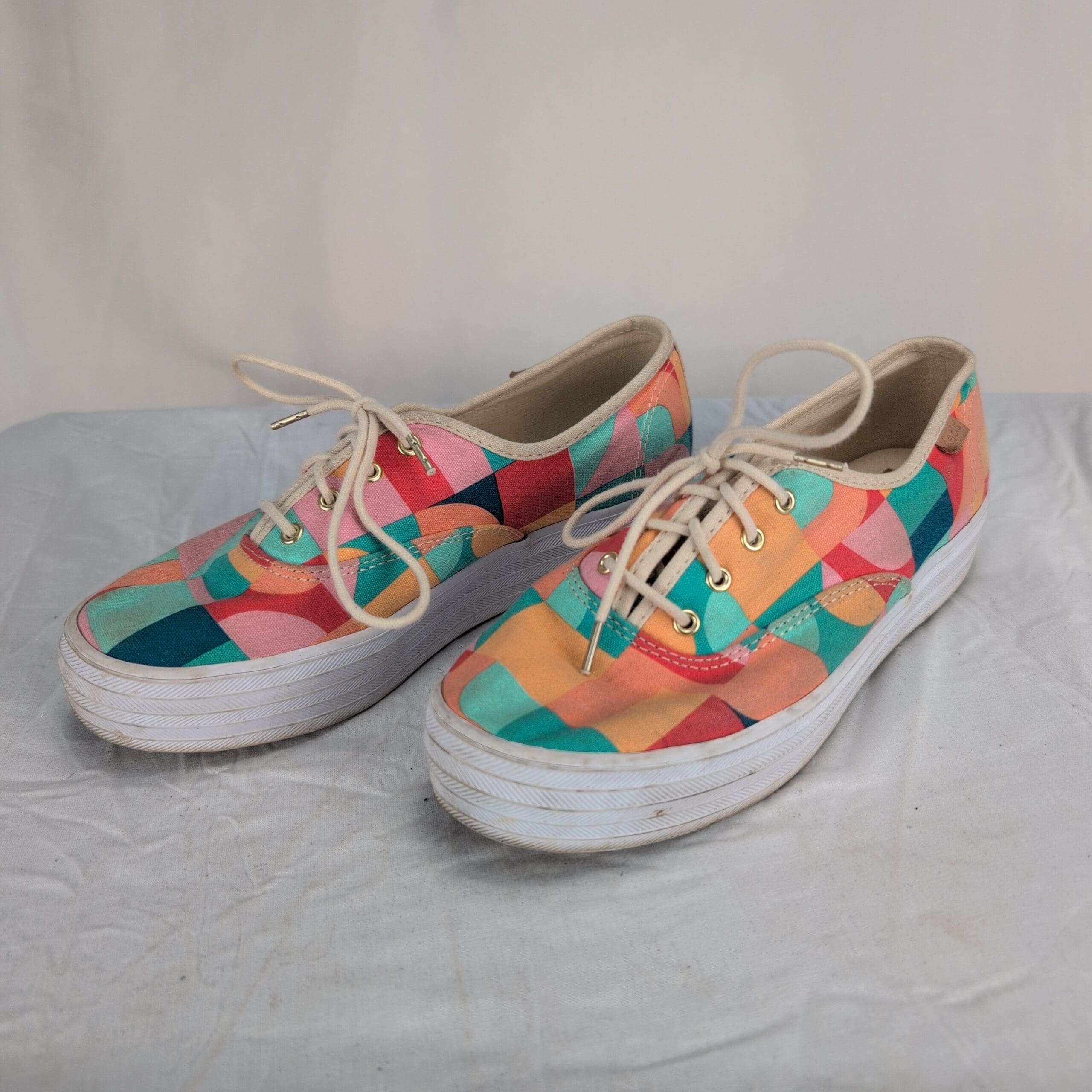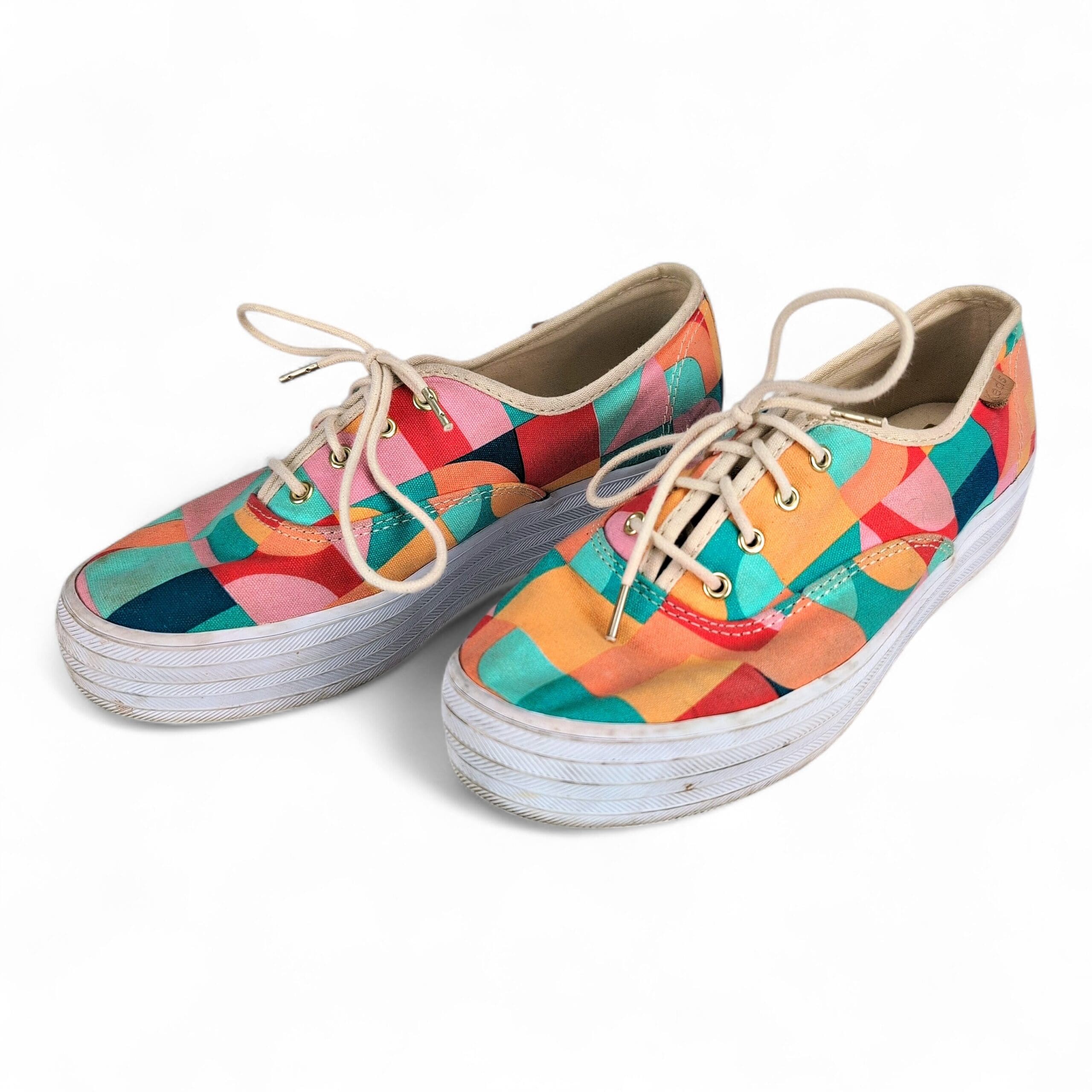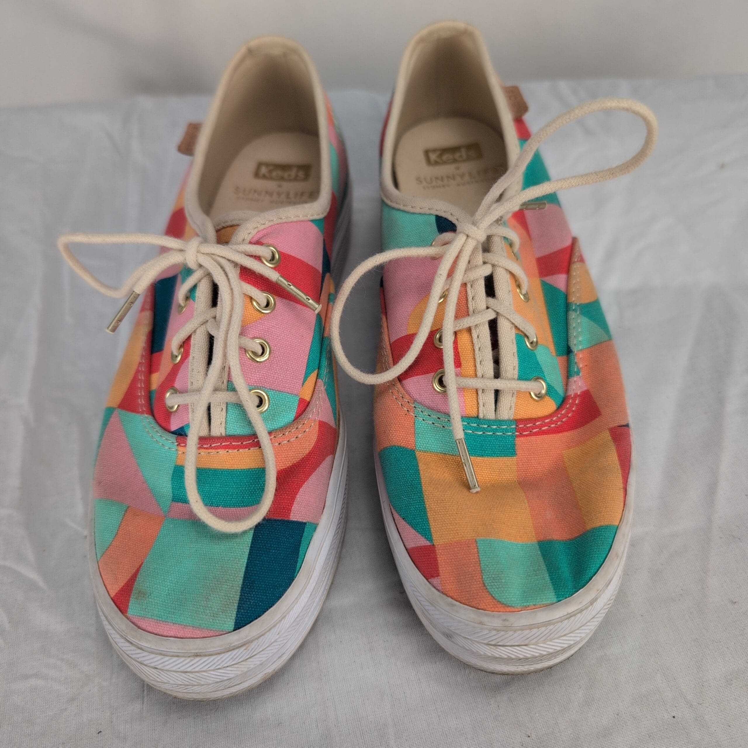 Keds x Sunnylife (Sydney, Australia) women’s canvas platform sneakers in size 6.5. Bright geometric print, low-top lace-up with gold-tone eyelets and thick white rubber platform sole. Structurally sound and wearable — used and in good shape but needs a good cleaning. Soles have surface dirt and light scuffing; canvas shows typical light wear consistent with normal use. No major rips, tears, or large stains. See photos for close-up wear details.