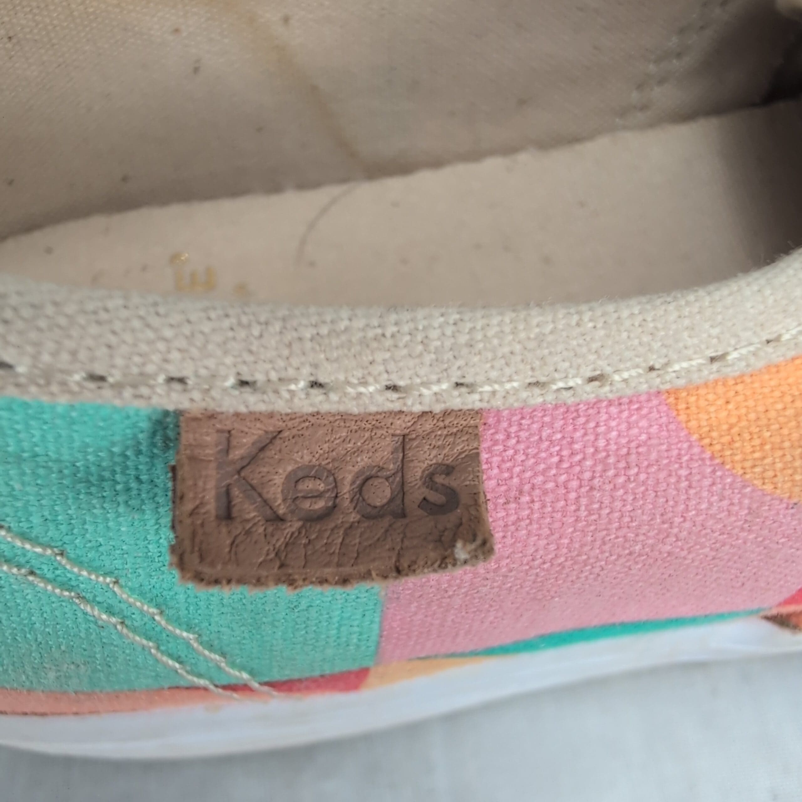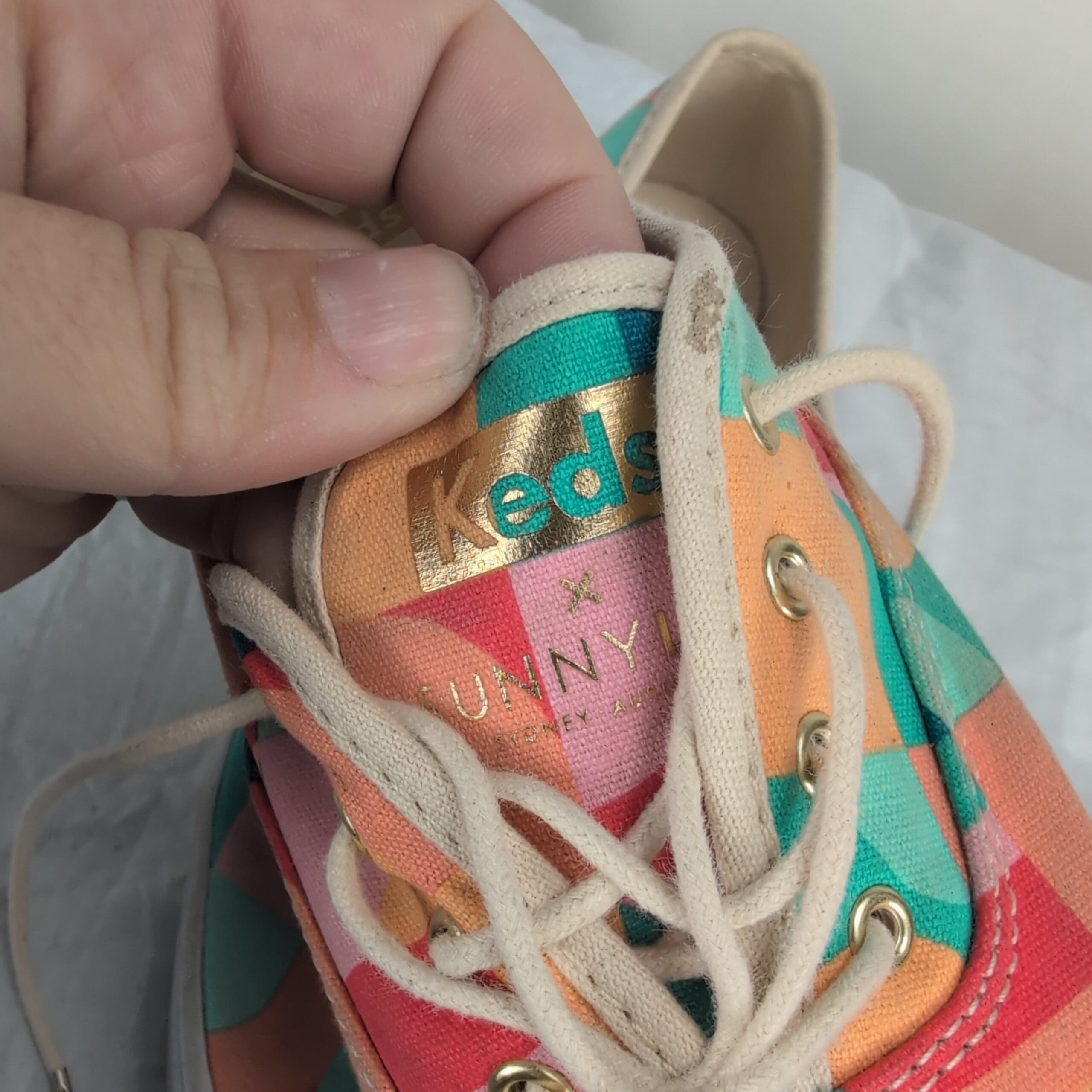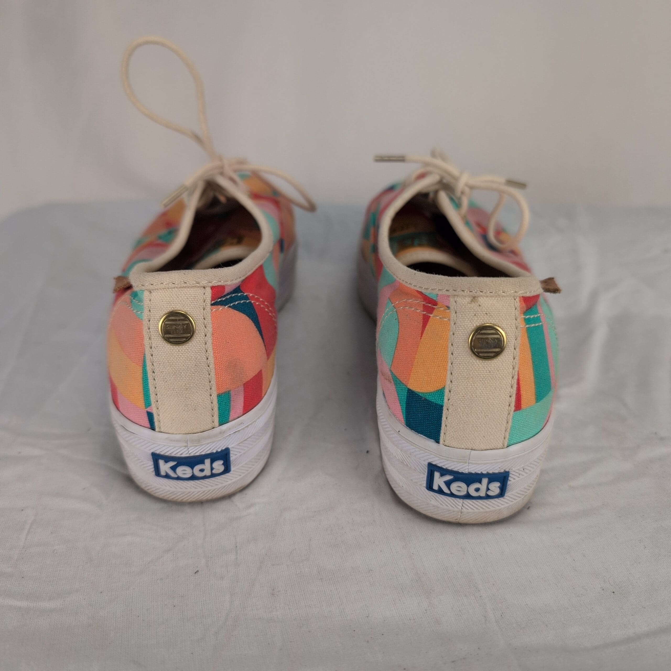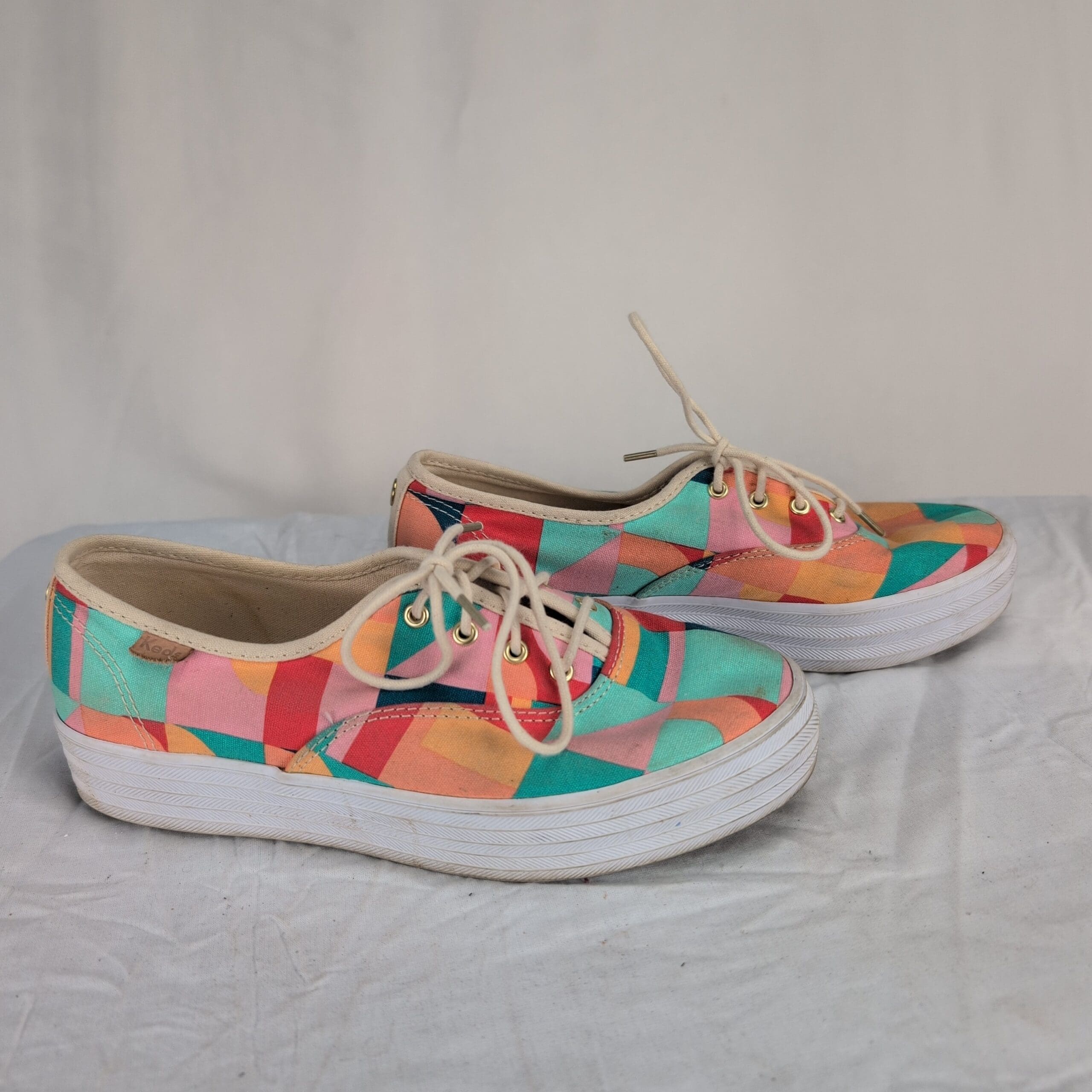 Keds x Sunnylife (Sydney, Australia) women’s canvas platform sneakers in size 6.5. Bright geometric print, low-top lace-up with gold-tone eyelets and thick white rubber platform sole. Structurally sound and wearable — used and in good shape but needs a good cleaning. Soles have surface dirt and light scuffing; canvas shows typical light wear consistent with normal use. No major rips, tears, or large stains. See photos for close-up wear details.