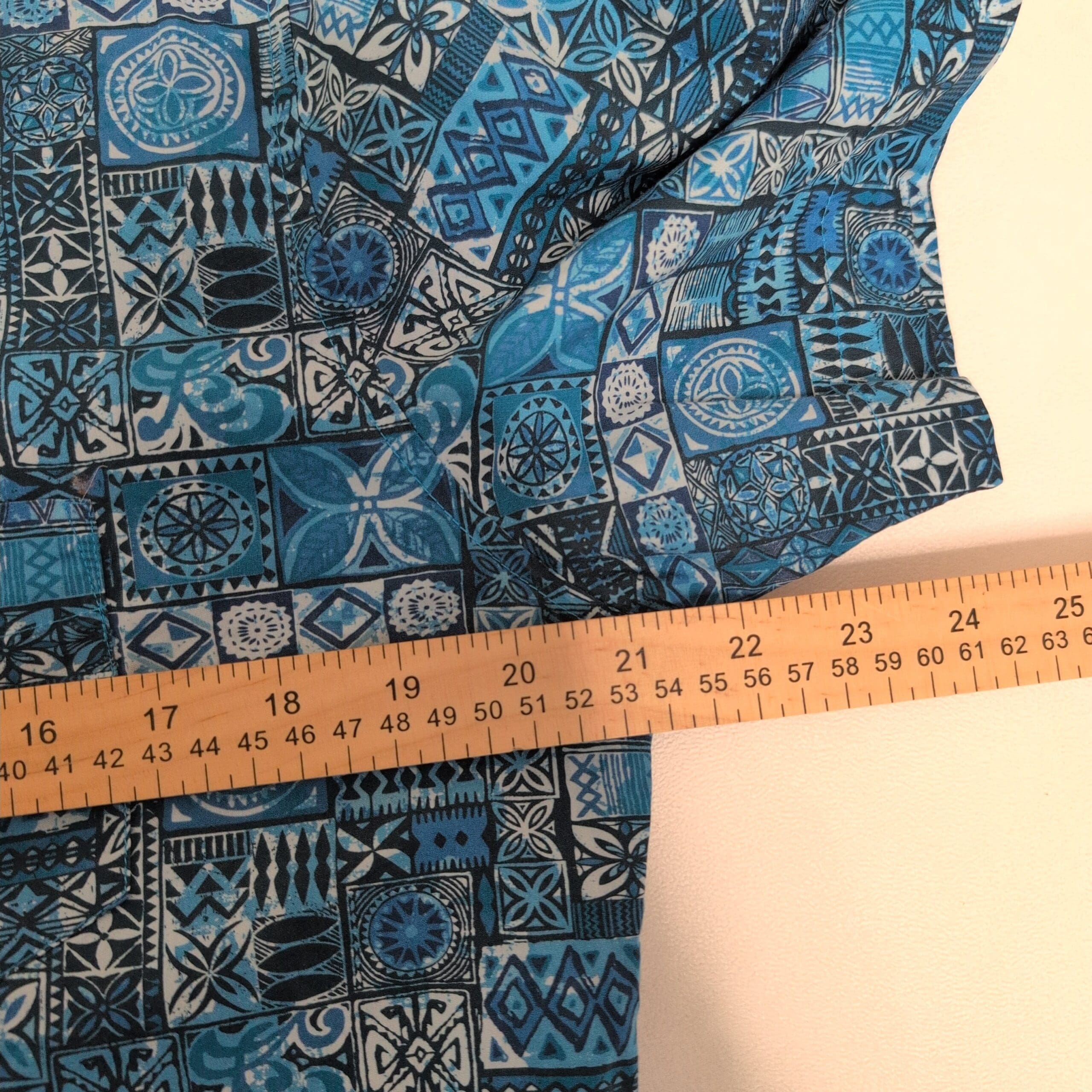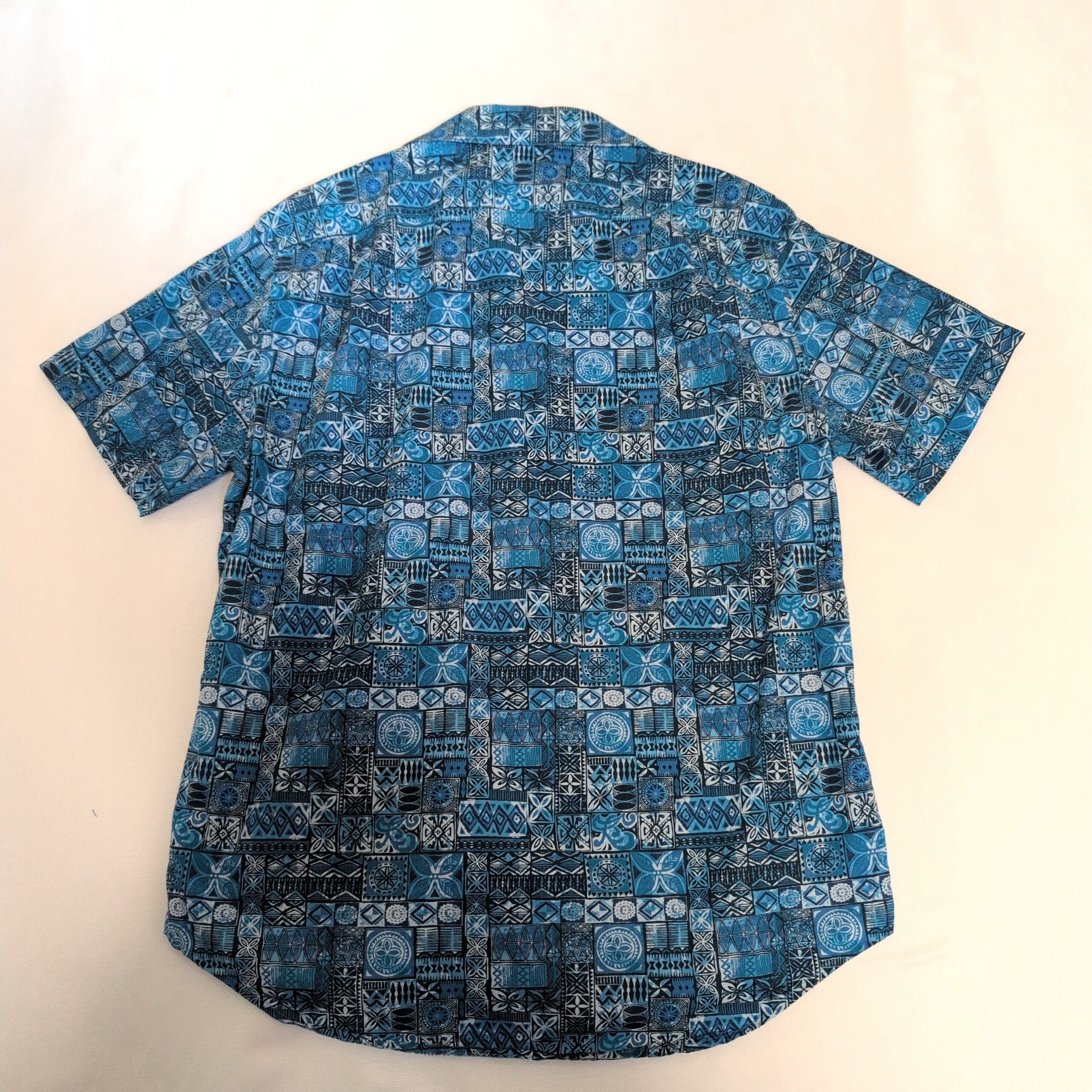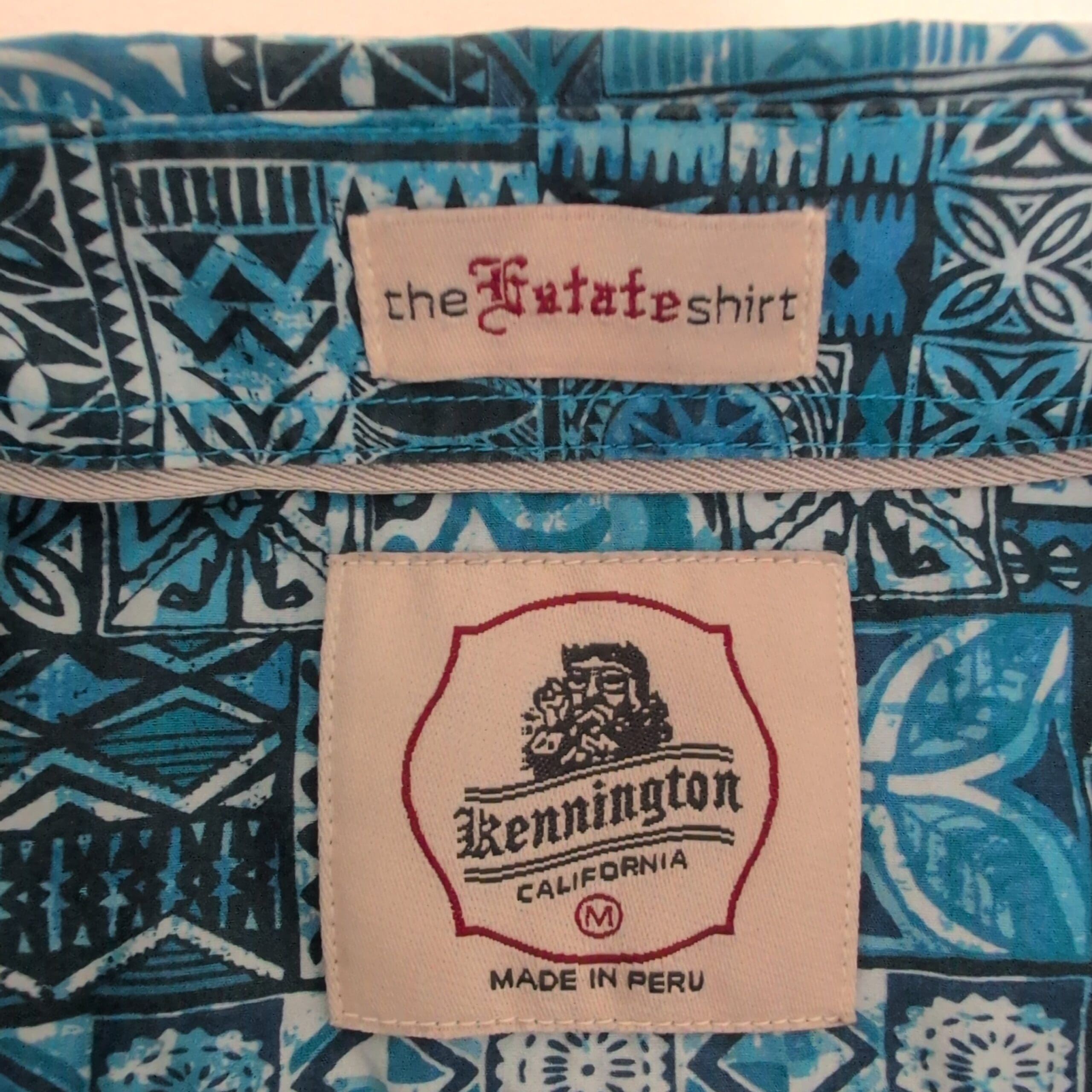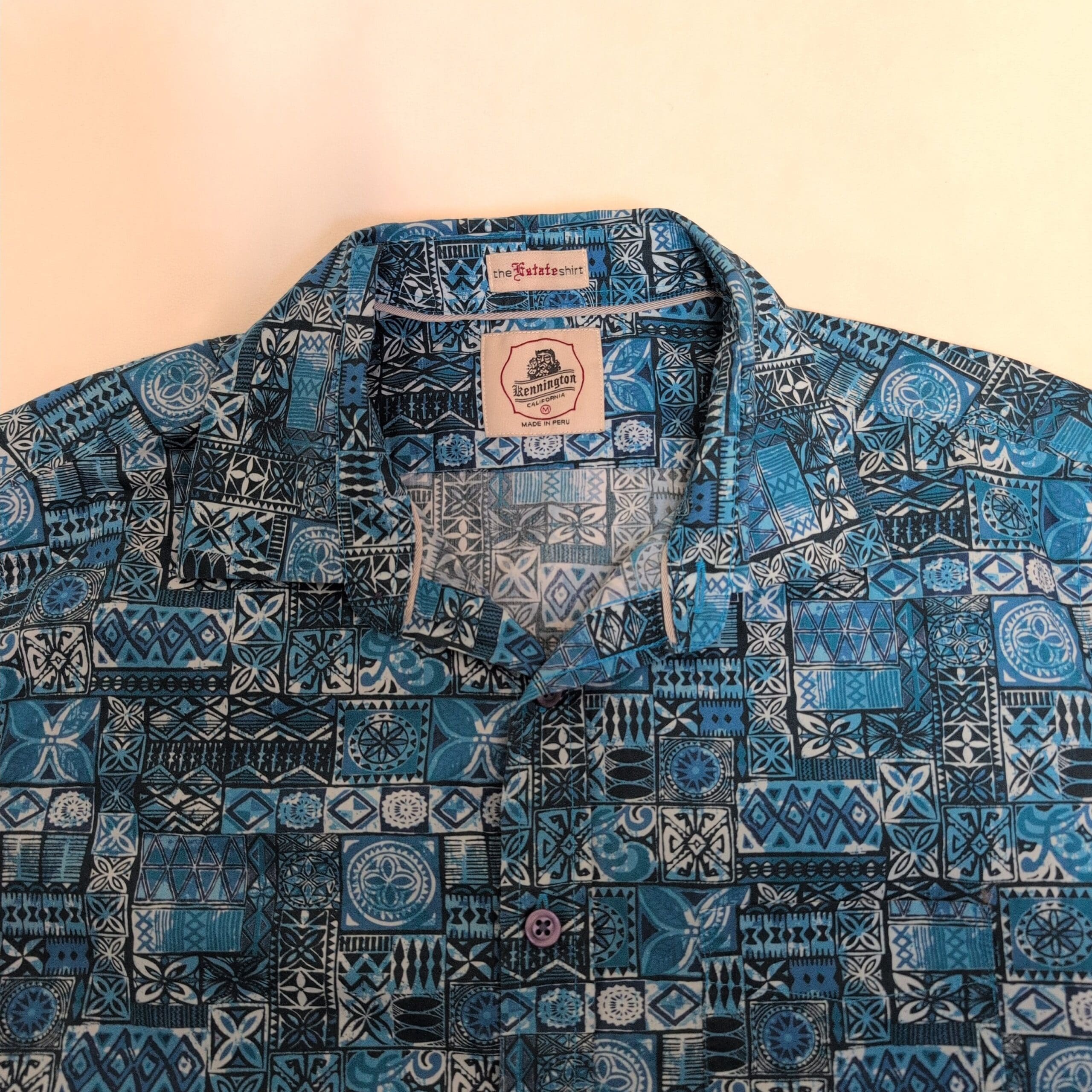 Kennington men’s short-sleeve button-down shirt in size M. Vibrant blue mosaic/tribal tile print on a lightweight woven fabric with a relaxed camp-style collar, full button front, short sleeves, and a curved hem — ideal for casual wear, weekend outings, or vacations. Size: M (standard). Pre-owned – overall very good condition with light, normal wear; no visible stains, tears, or odors seen in photos. Measurements available upon request.