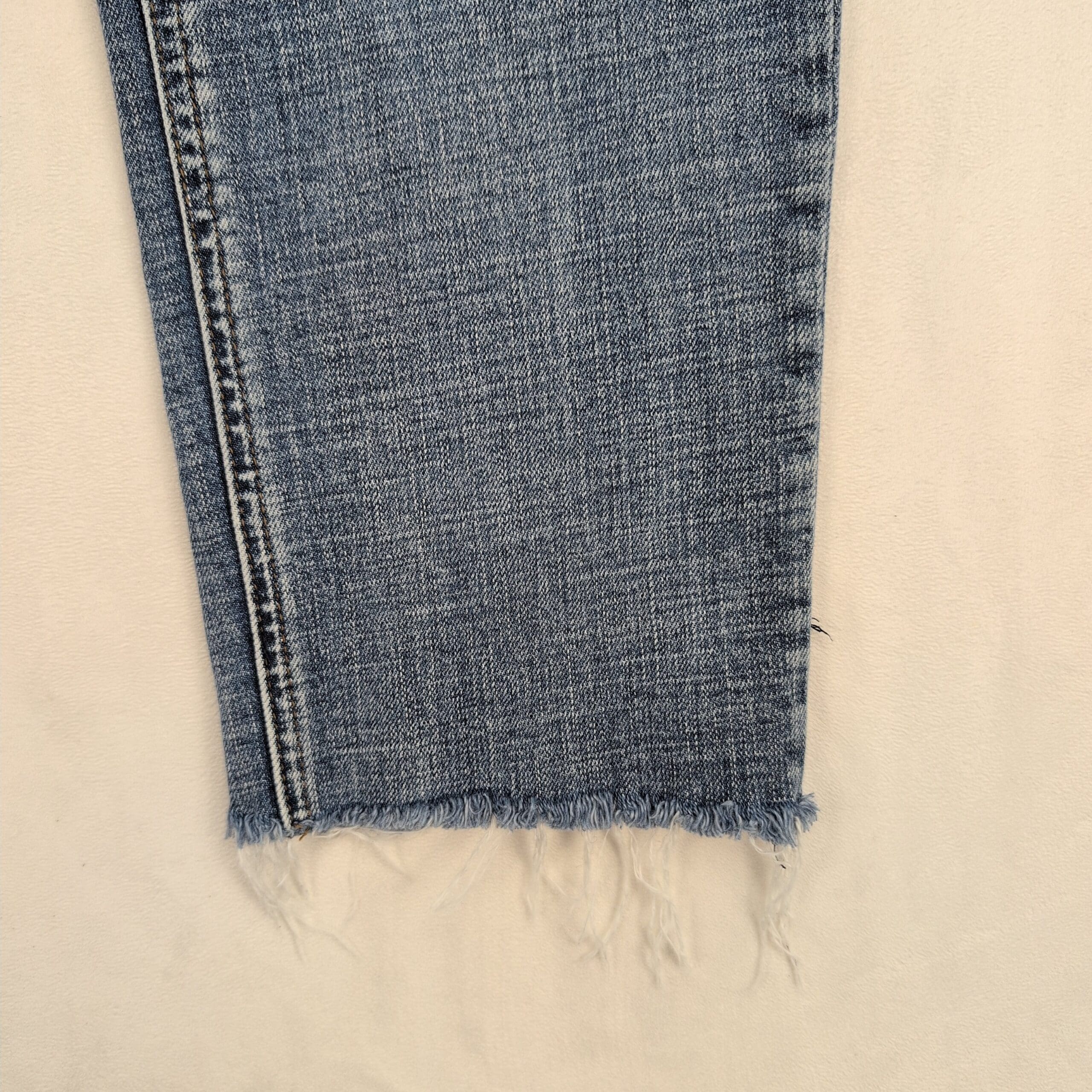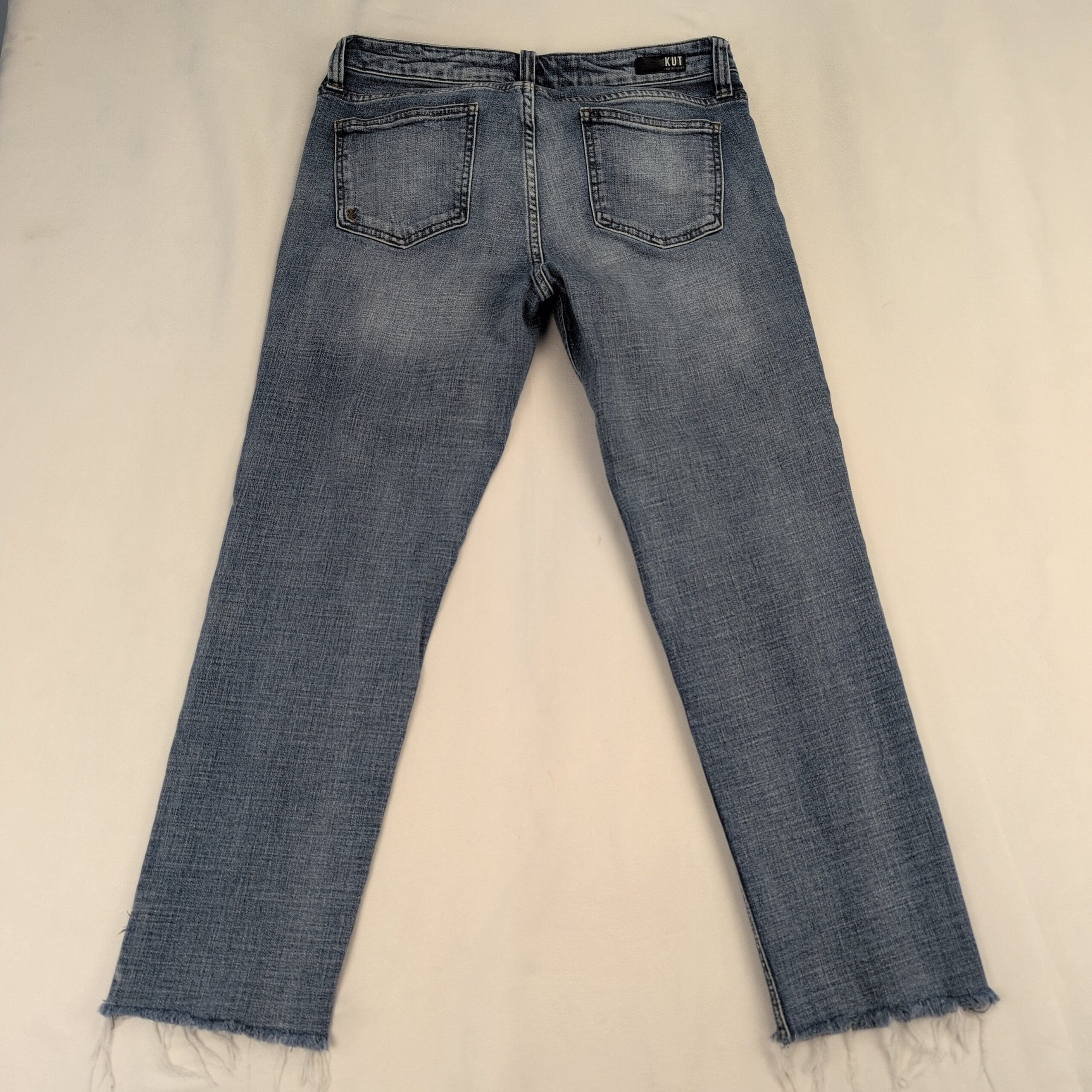 Kut From The Kloth “Catherine” boyfriend jeans in a light wash. Women’s size 10. Relaxed boyfriend fit with subtle whiskering, intentional knee distressing, and raw frayed ankle hems for a lived-in look. Five-pocket styling with zip-fly and button closure. Excellent used condition — no major rips, tears, or stains; minor piling and a few pulled threads consistent with the intentional distressed design (please review photos for detail).
