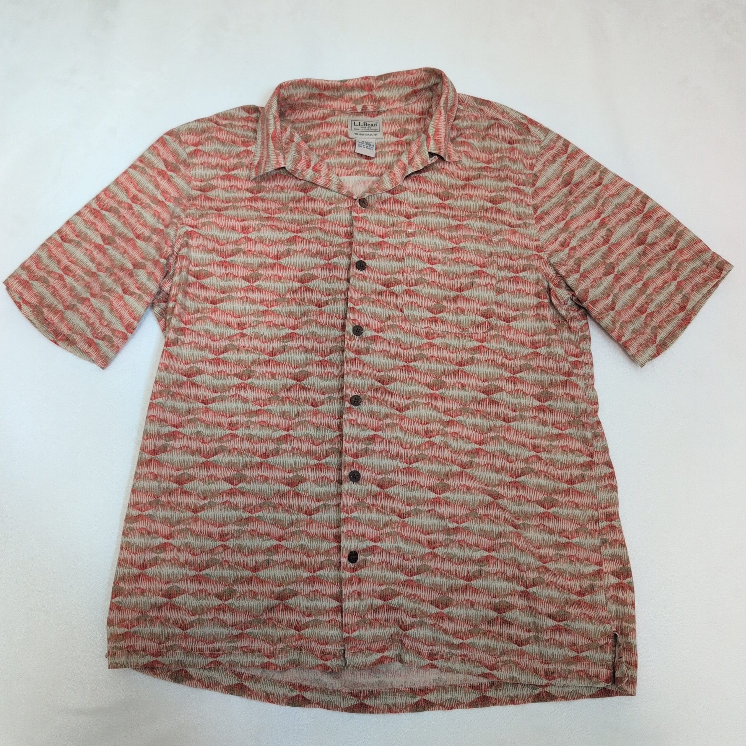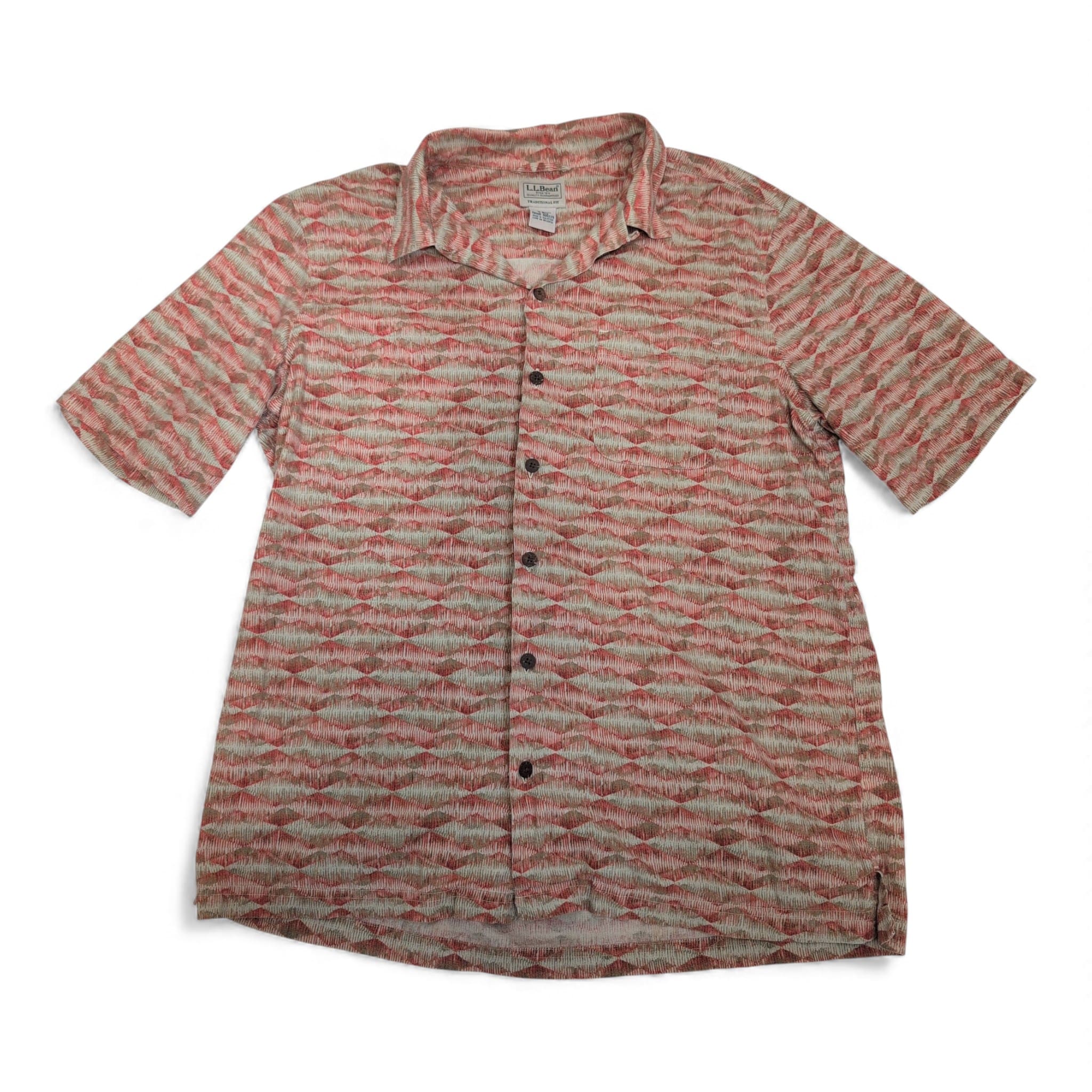 L.L.Bean men’s casual short-sleeve button-down shirt in size M (Standard). Tan patterned fabric with a relaxed camp collar and full button-front closure — a versatile pick for warm-weather and weekend wear. Check the care label for washing instructions.