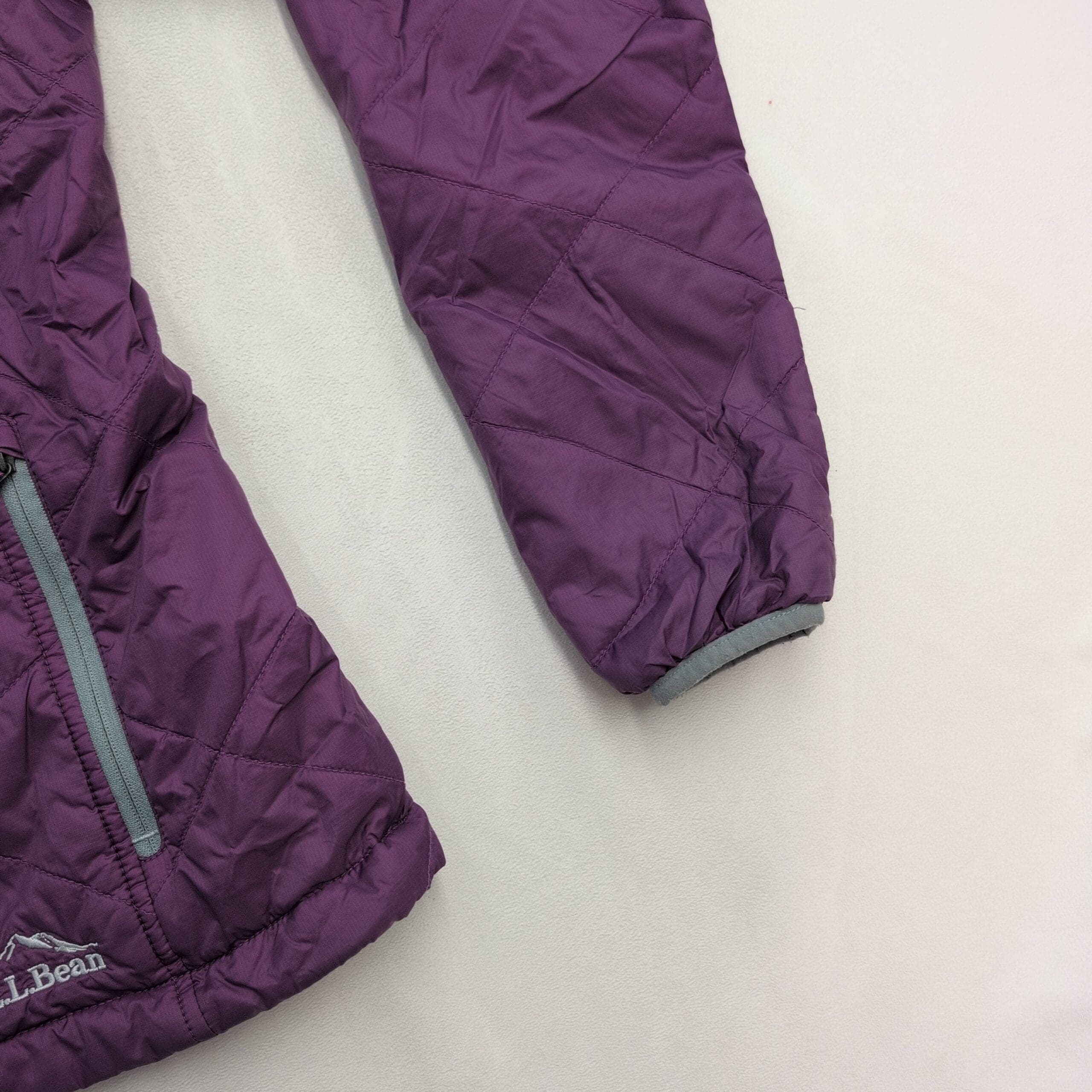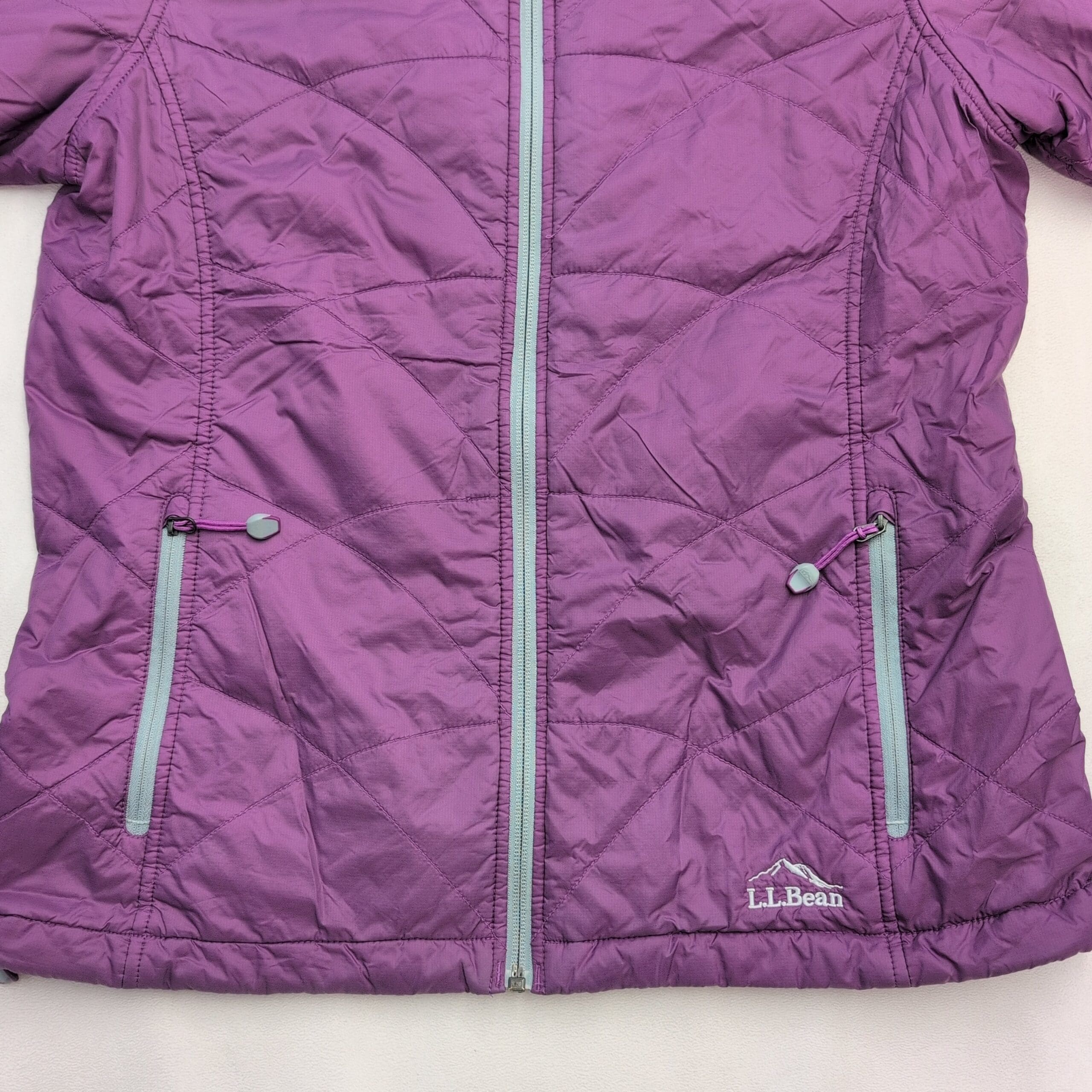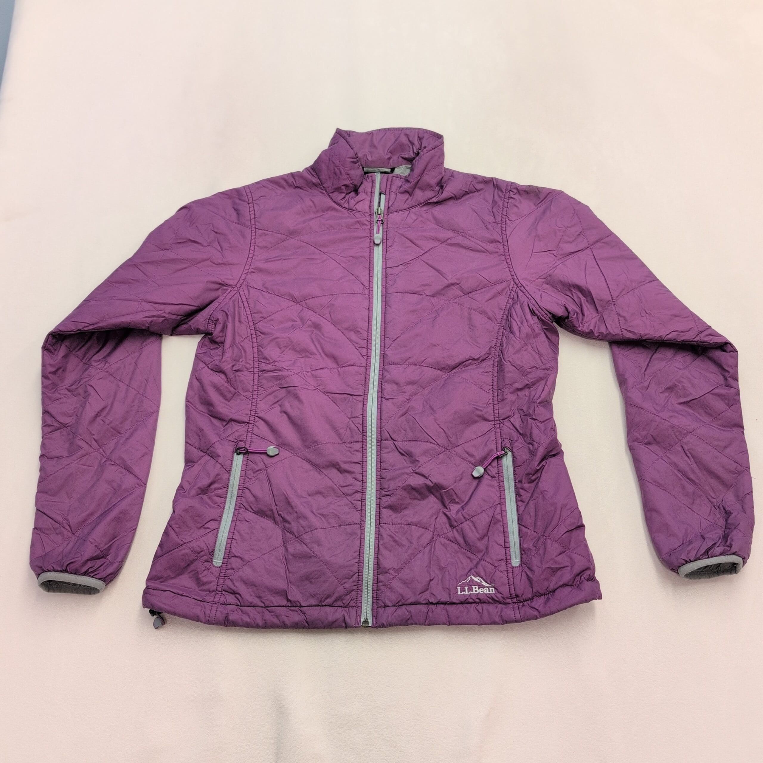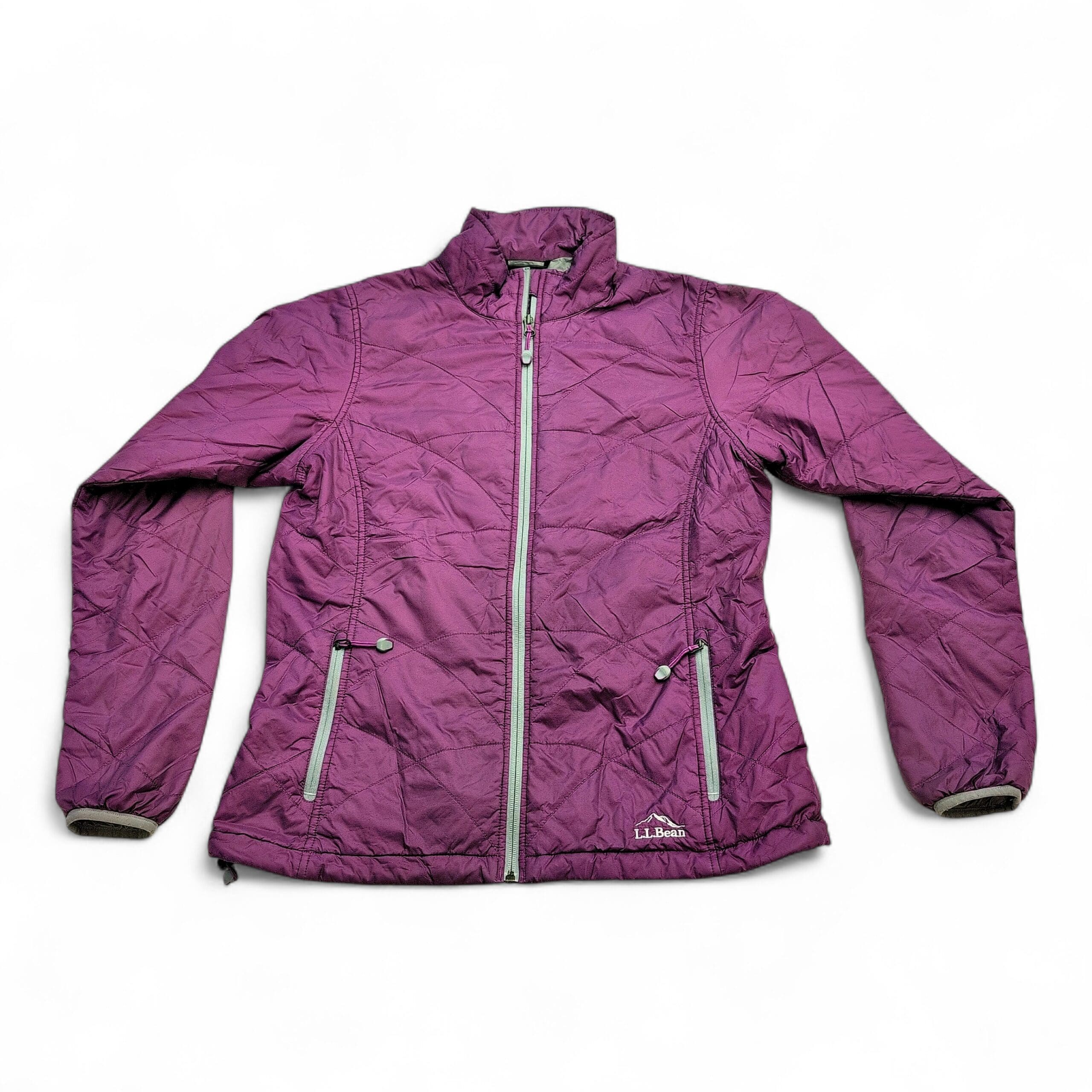 L.L.Bean women’s lightweight quilted insulated ski/snow jacket in size M. Features a full-length front zipper, stand collar, two zip hand pockets with contrast trim, elasticized cuffs, adjustable drawcord hem, and embroidered L.L.Bean logo at the lower hem. Color appears purple (see photos). Excellent used condition with typical light wear; no major rips or tears. Quality note: small stain on the right shoulder from a removed label (visible in photos).