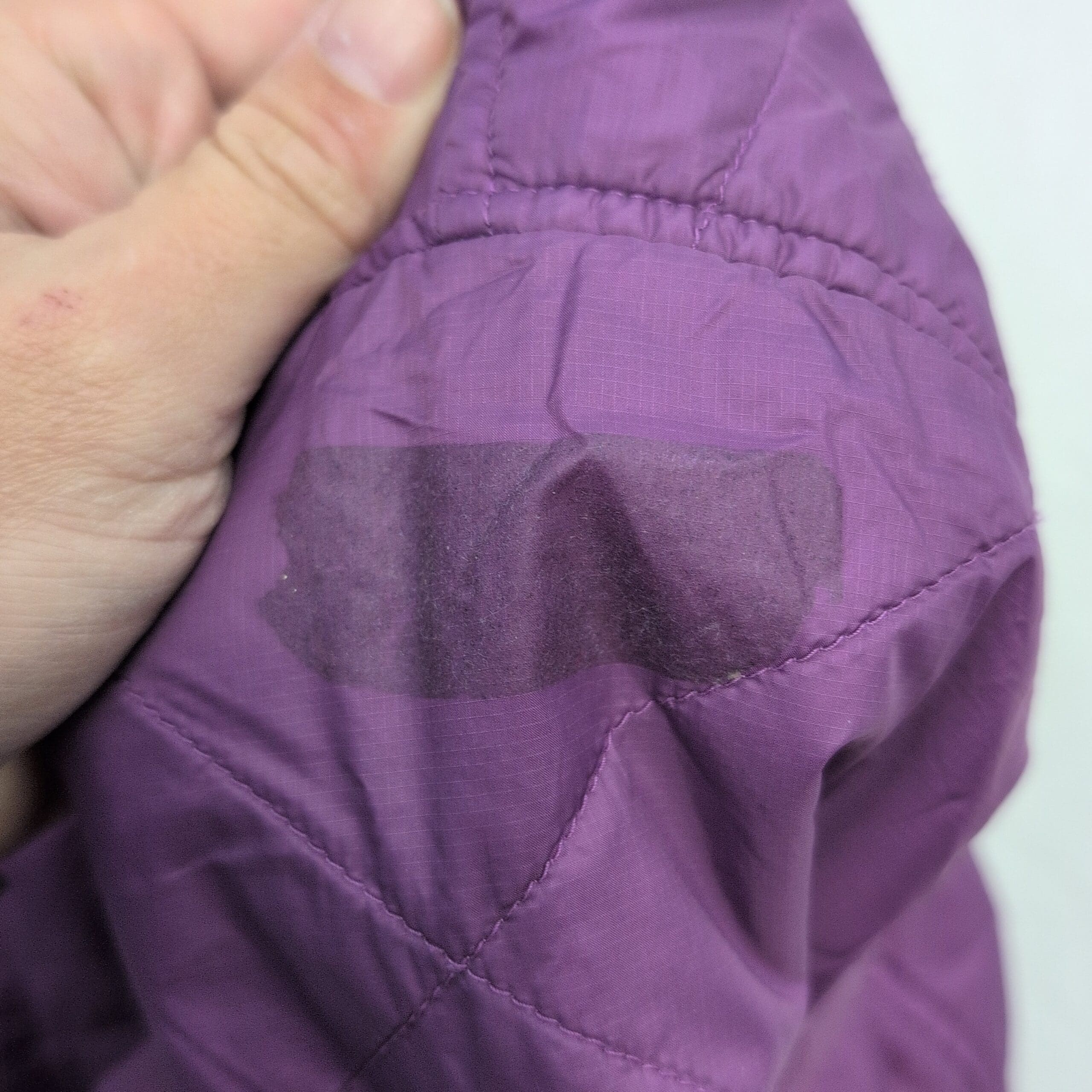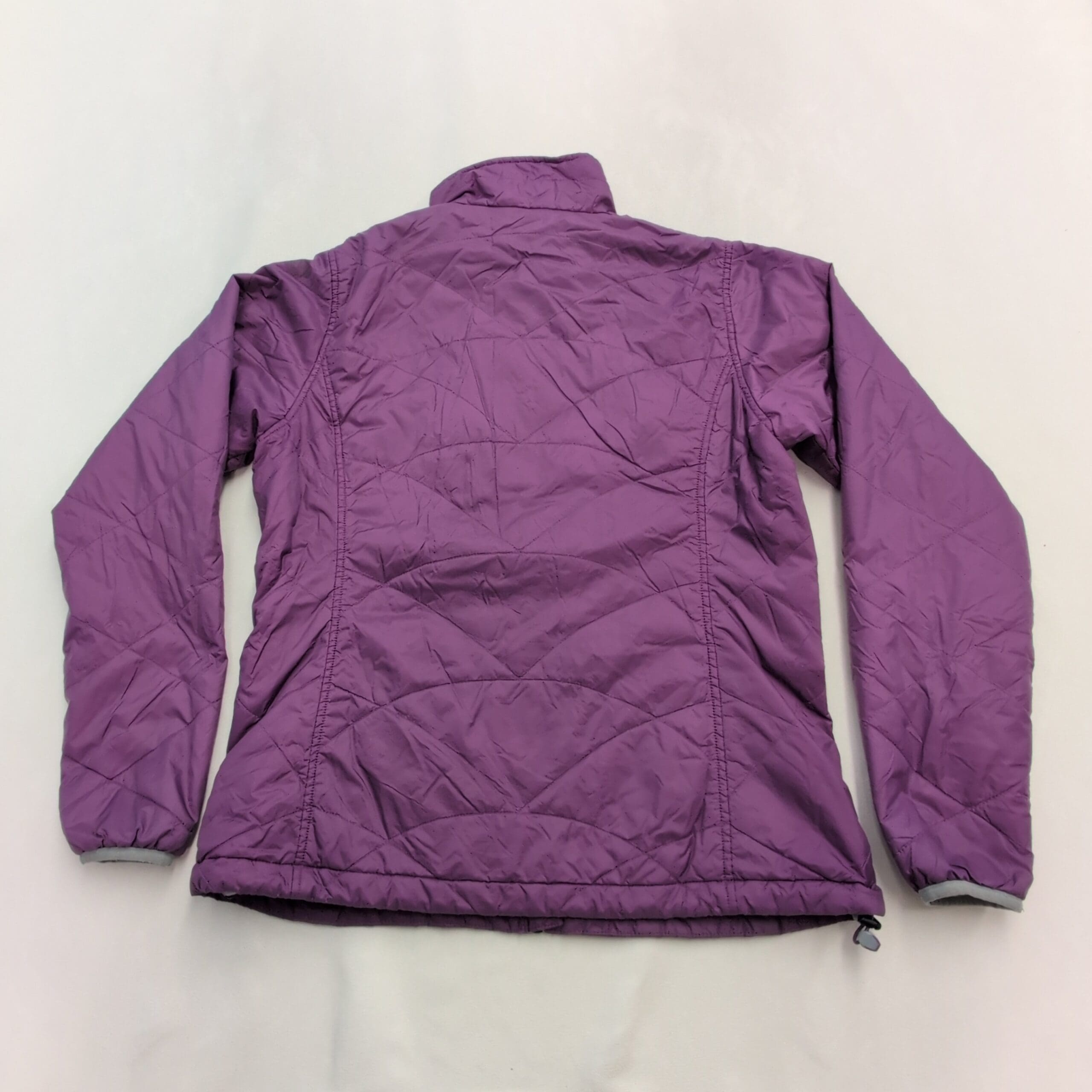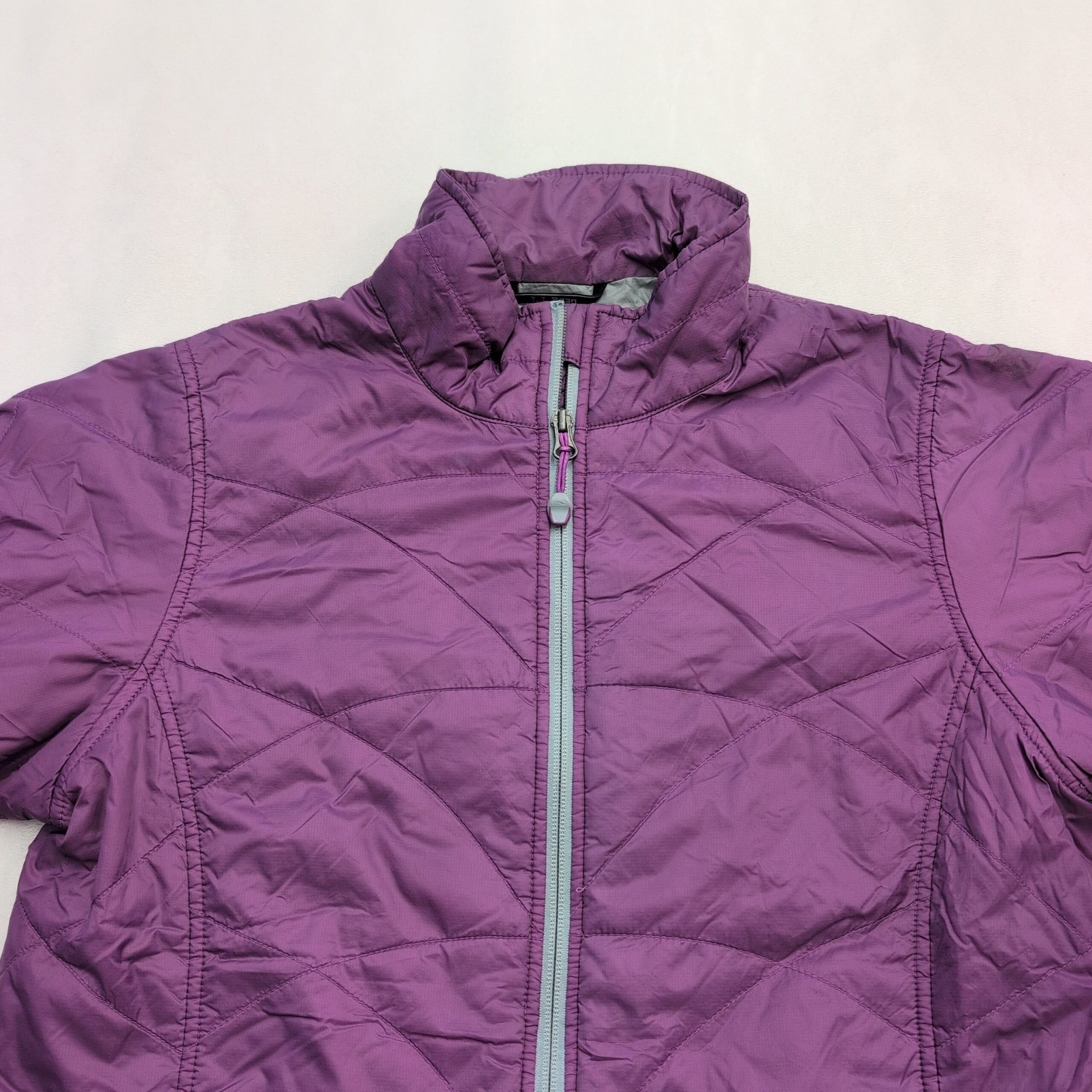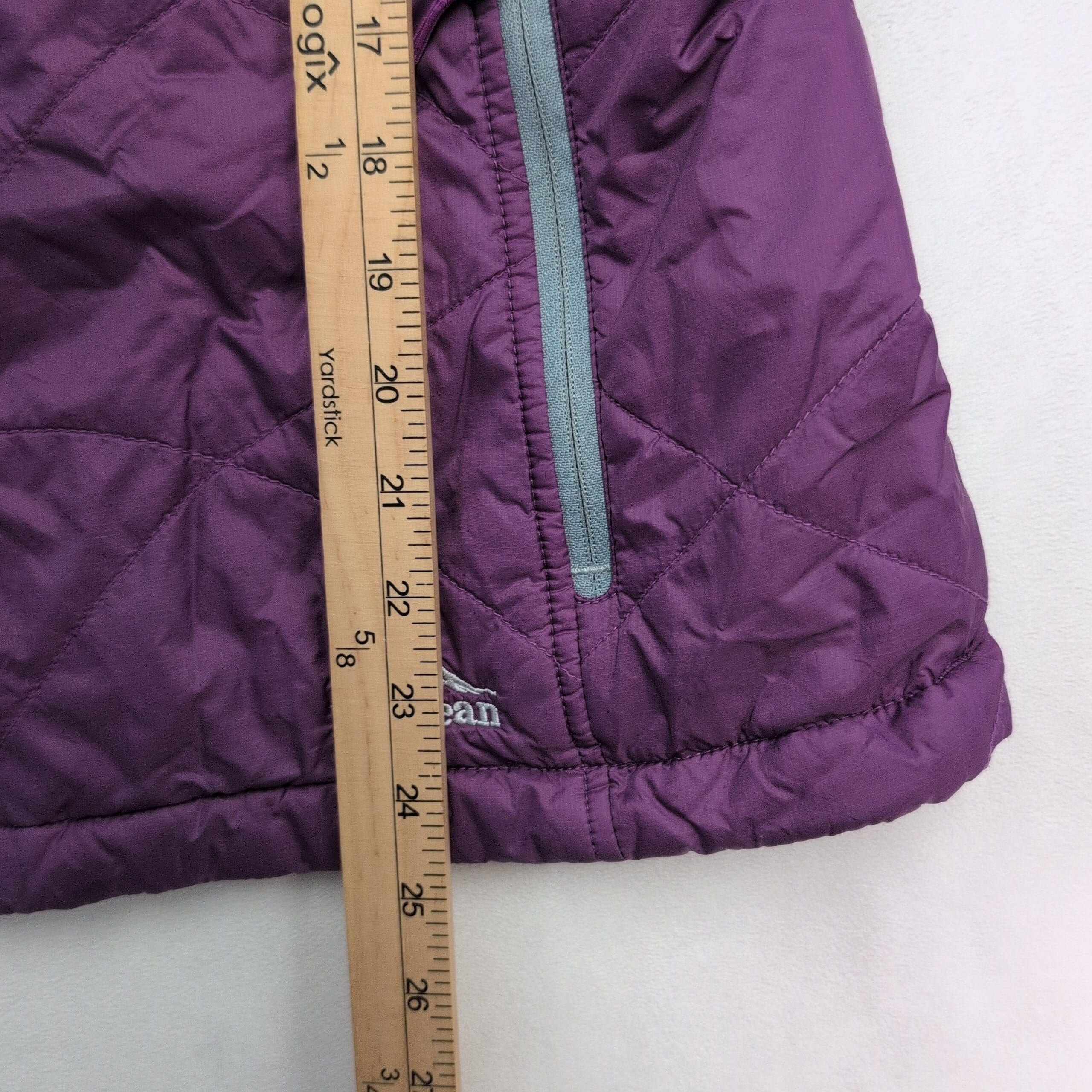 L.L.Bean women’s lightweight quilted insulated ski/snow jacket in size M. Features a full-length front zipper, stand collar, two zip hand pockets with contrast trim, elasticized cuffs, adjustable drawcord hem, and embroidered L.L.Bean logo at the lower hem. Color appears purple (see photos). Excellent used condition with typical light wear; no major rips or tears. Quality note: small stain on the right shoulder from a removed label (visible in photos).