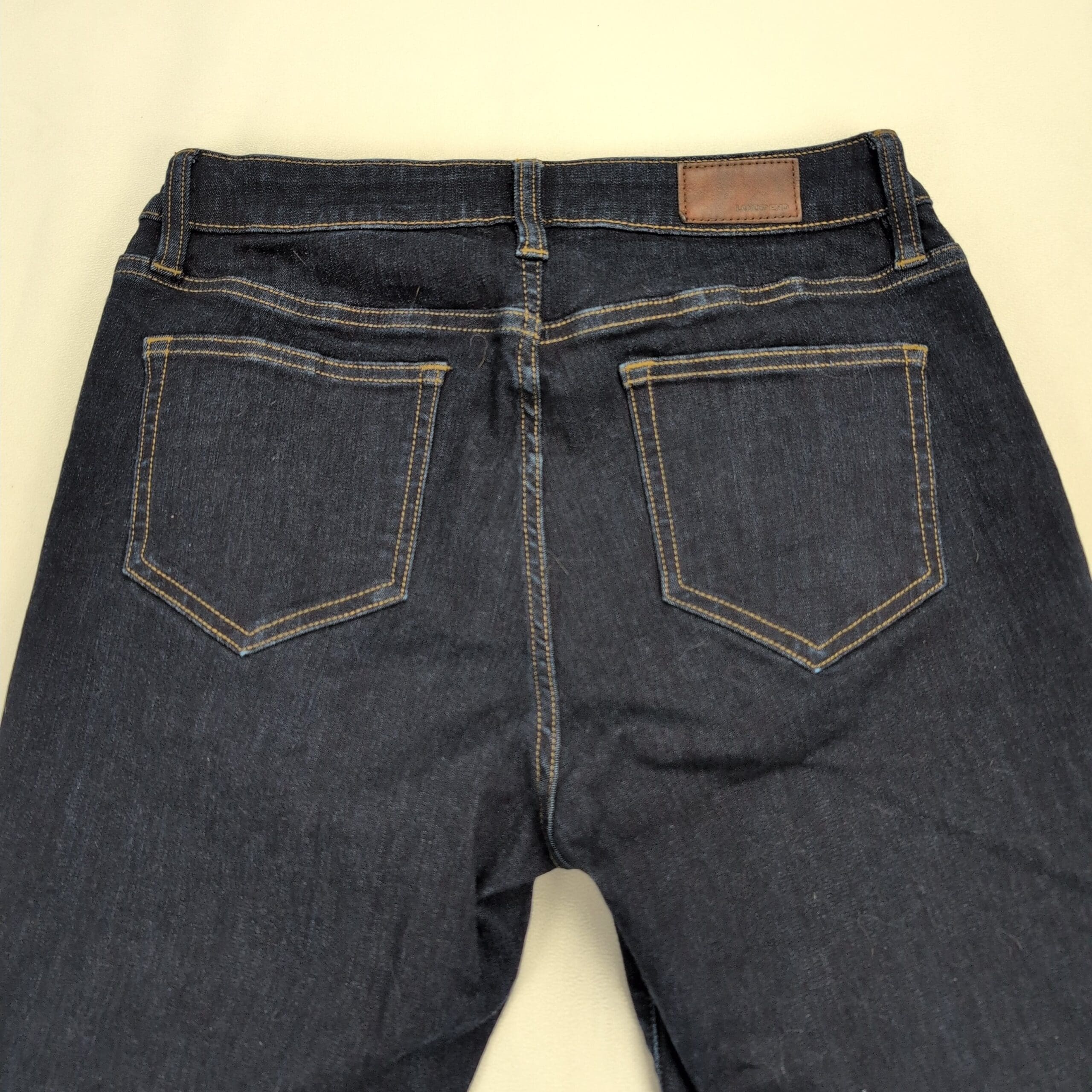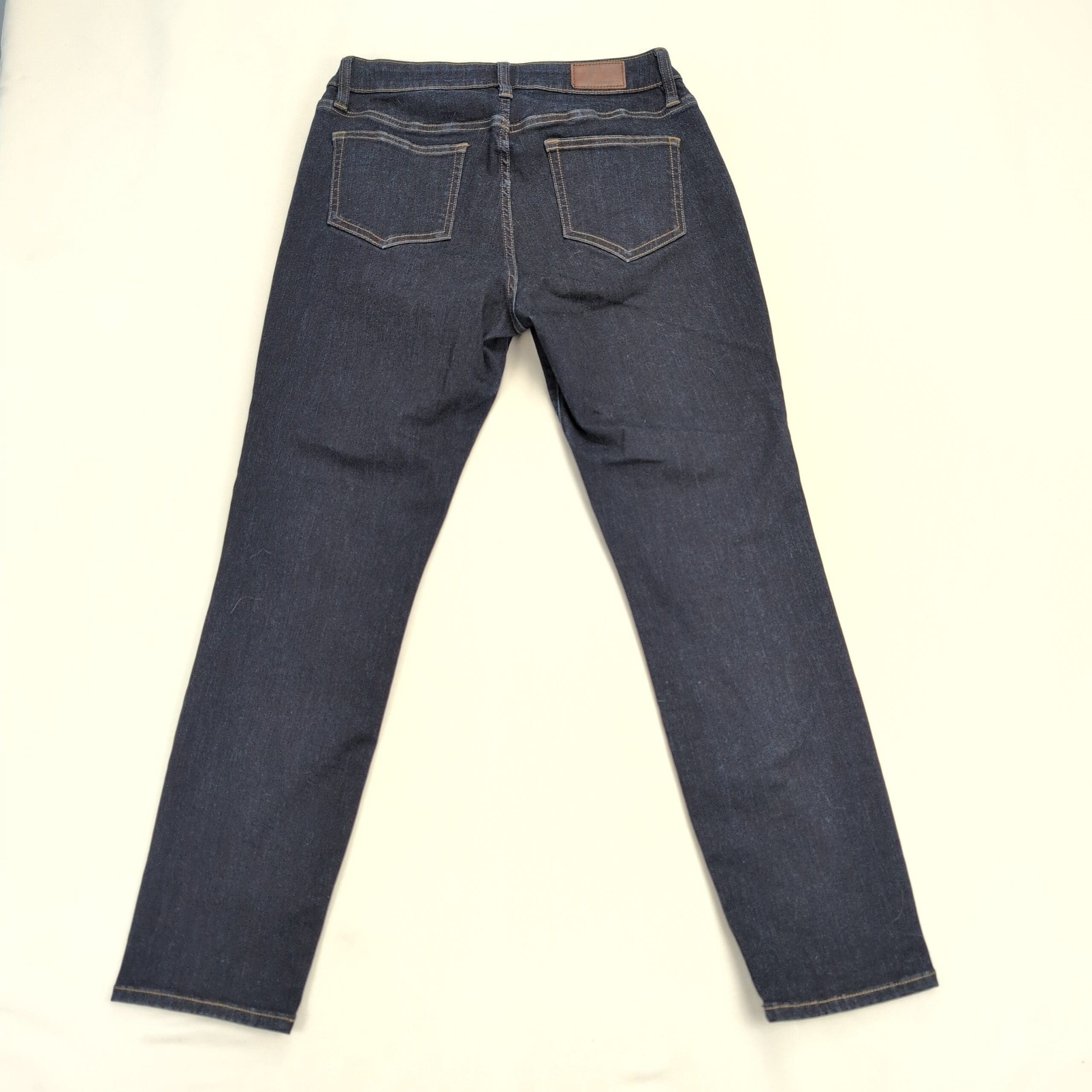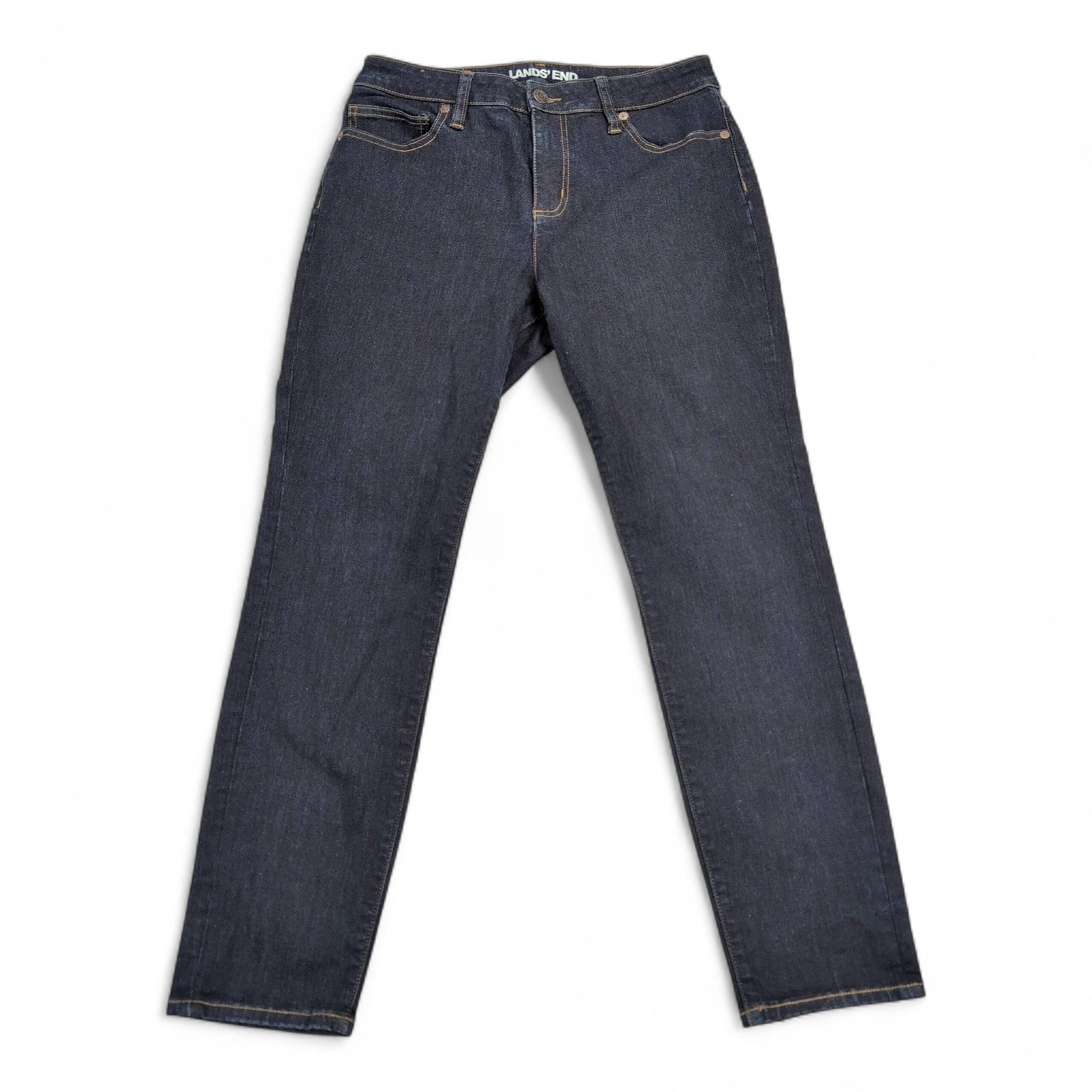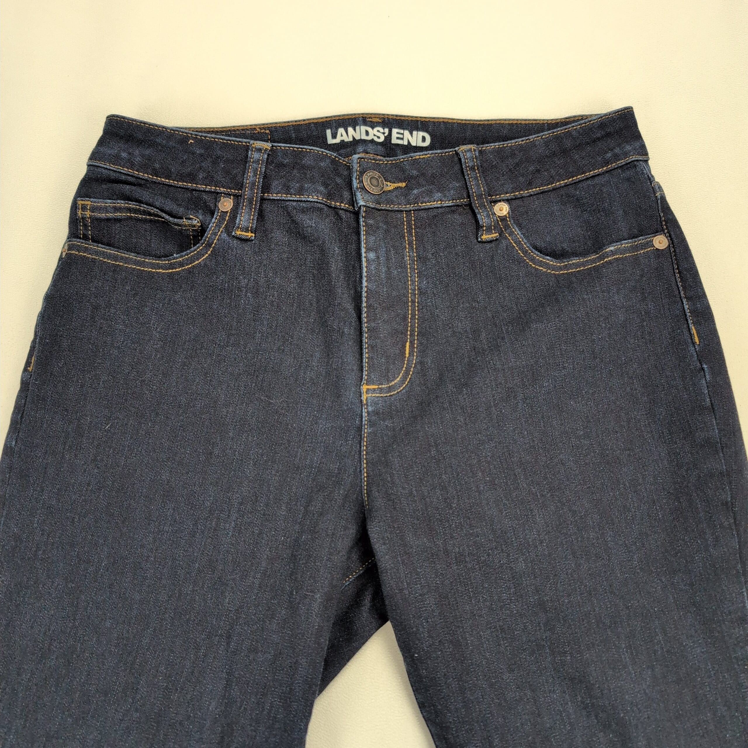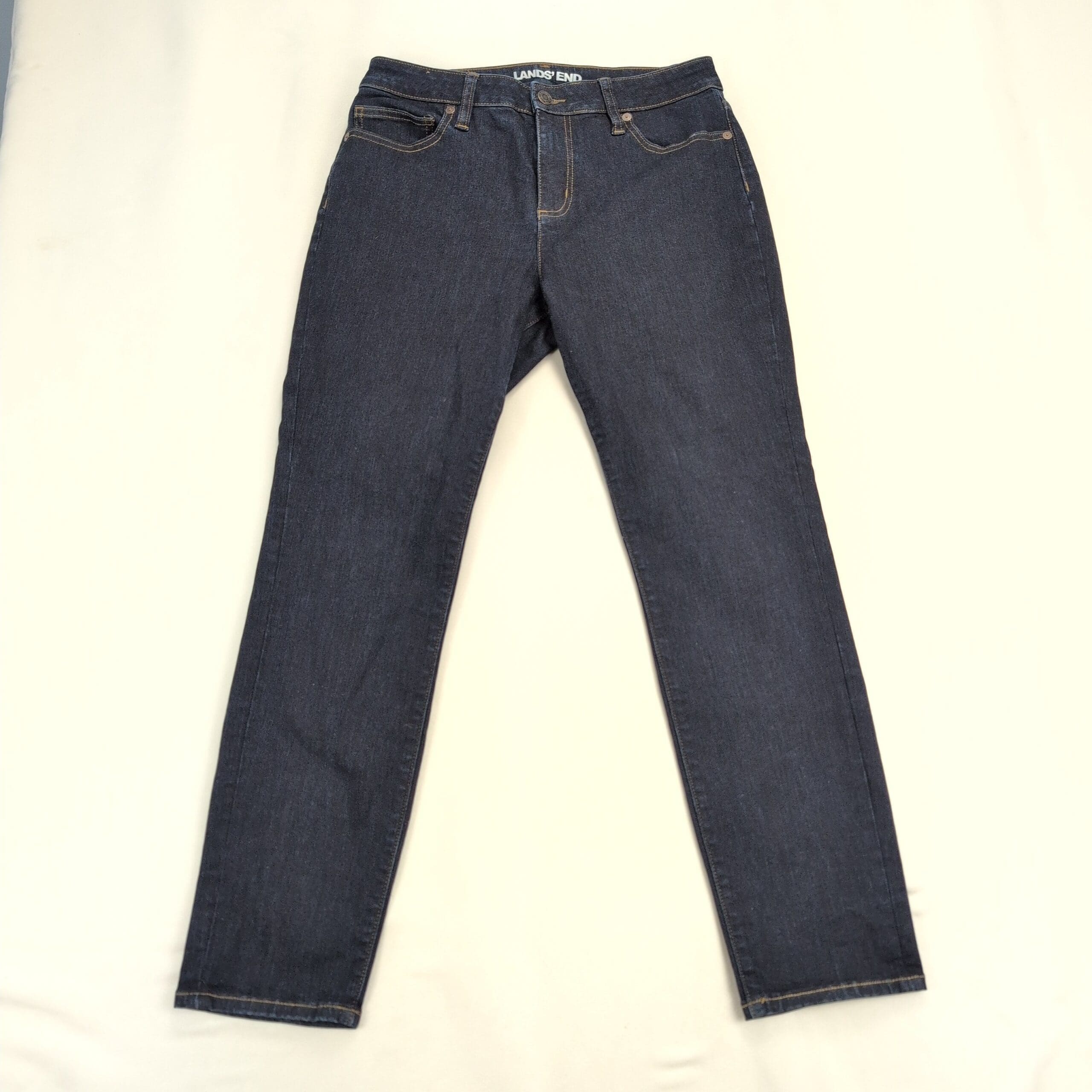 Lands’ End mid rise curvy skinny jeans in size 10P (petite). Dark indigo wash with classic five-pocket styling, zip fly and button closure. Slim, flattering fit designed for a curvy silhouette with petite inseam proportions. Excellent used condition — free of major rips, tears, stains, or flaws; may show typical light wear consistent with gentle use.