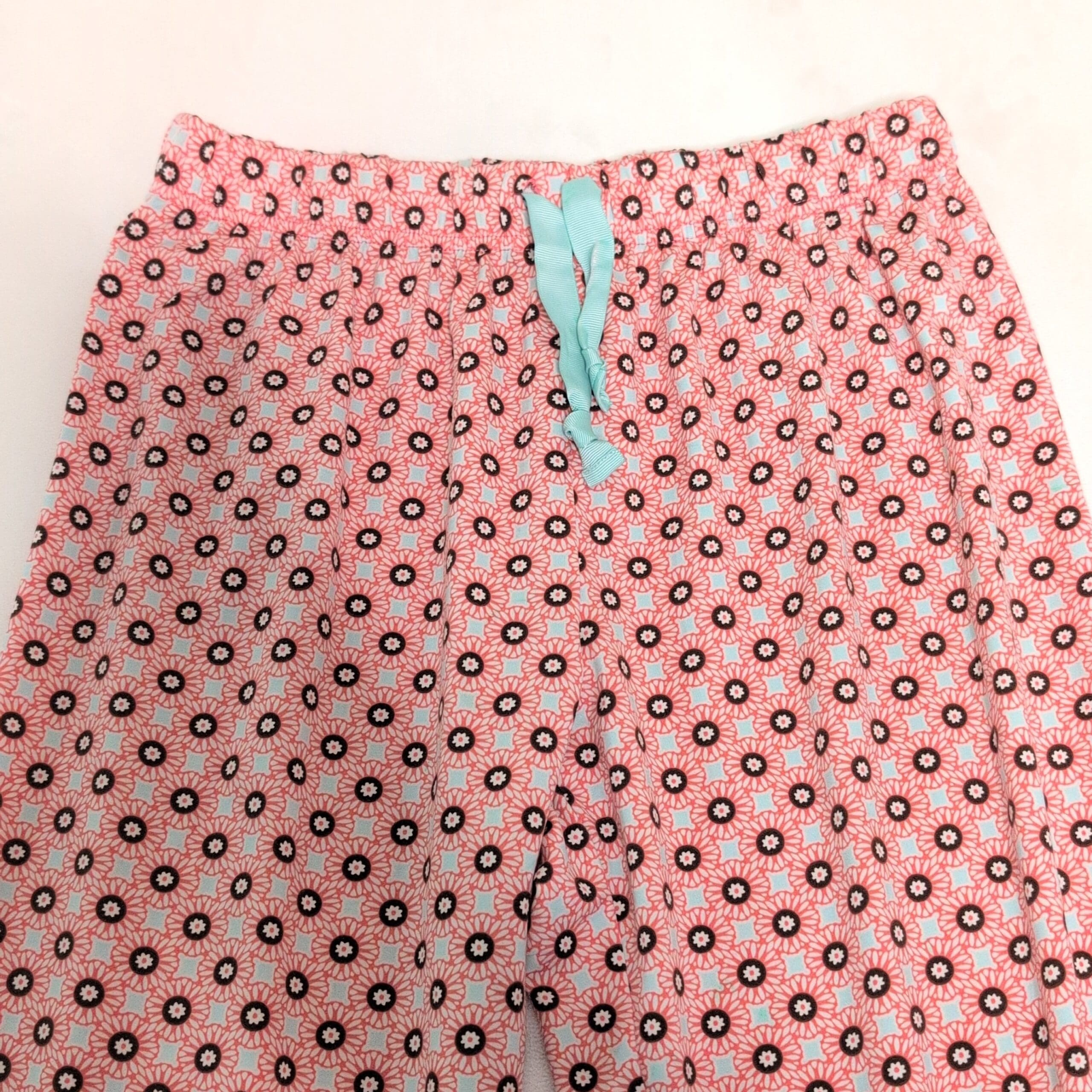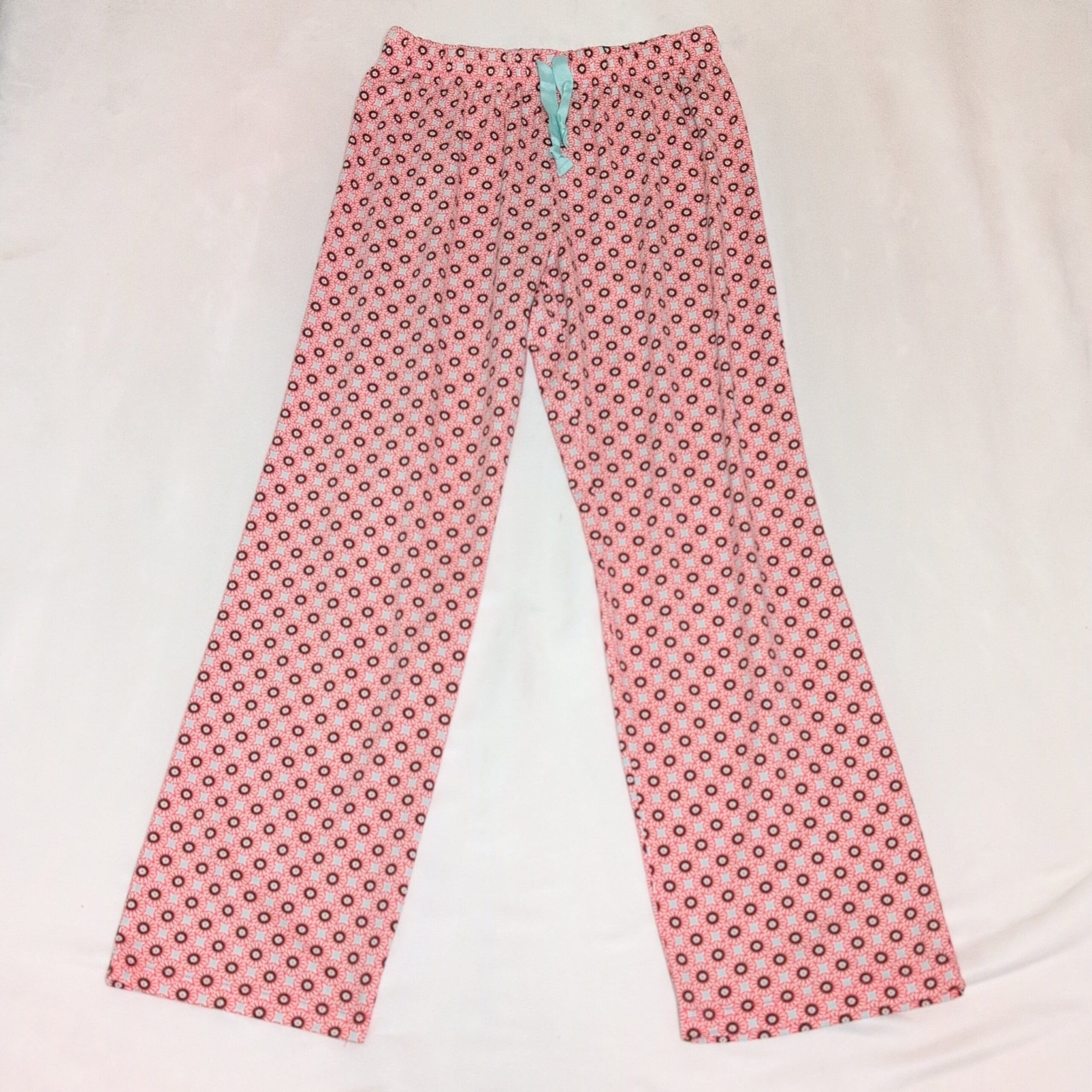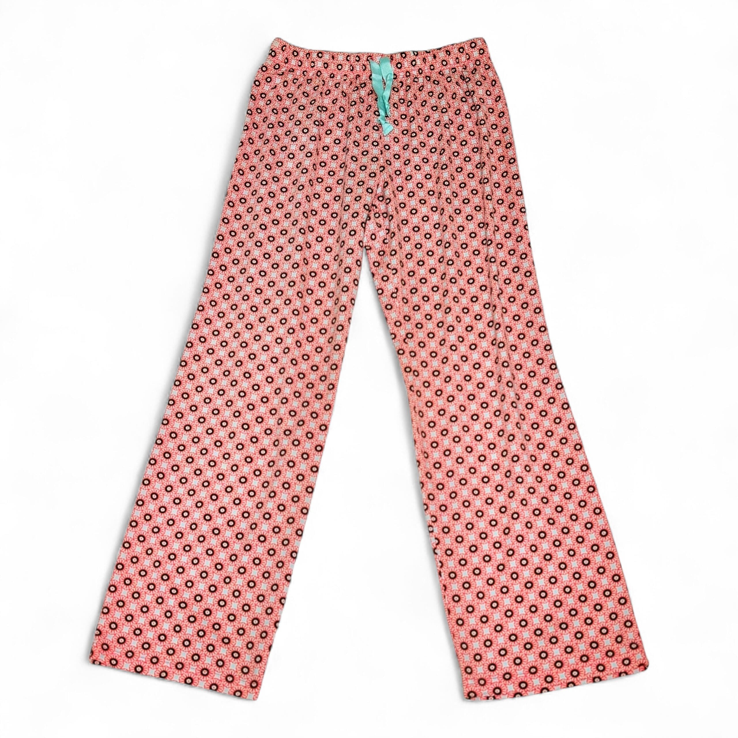 Lands’ End women’s pajama pants in pink with an all-over small floral/circle print. Straight leg, full-length lounge pants with an elastic waistband and a contrasting light turquoise drawstring ribbon at the front. Comfortable, lightweight sleepwear ideal for lounging or bedtime. Size S (standard), women’s department.