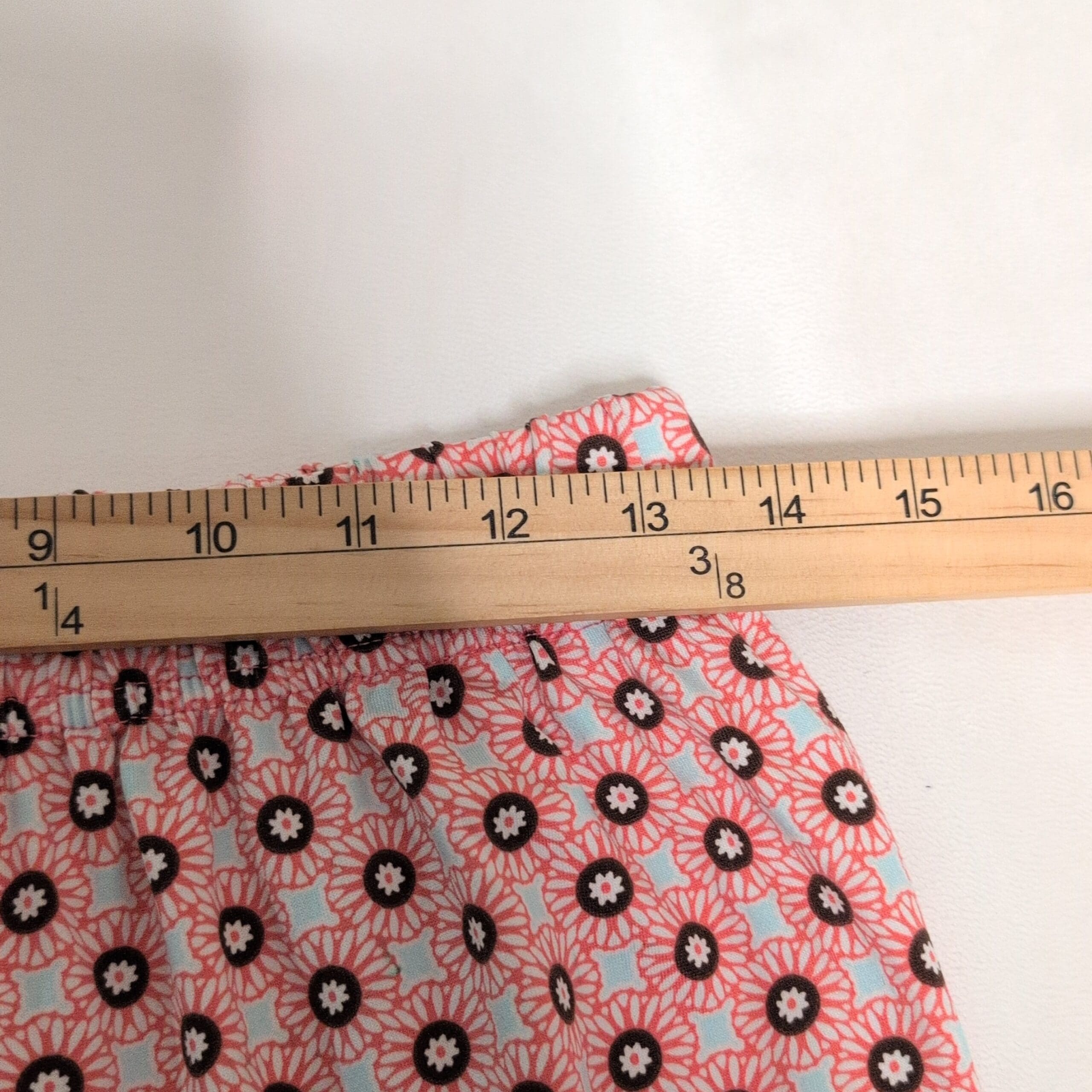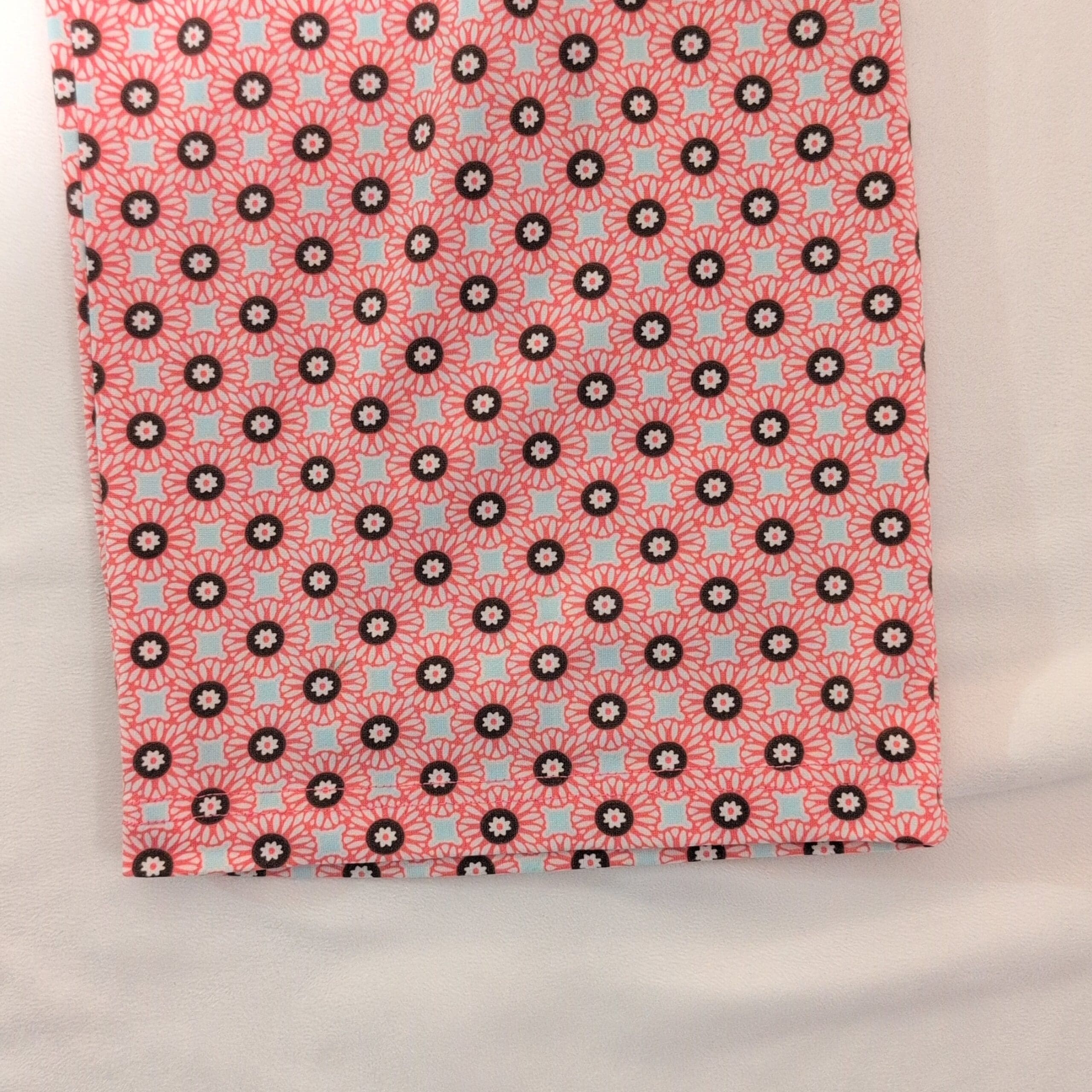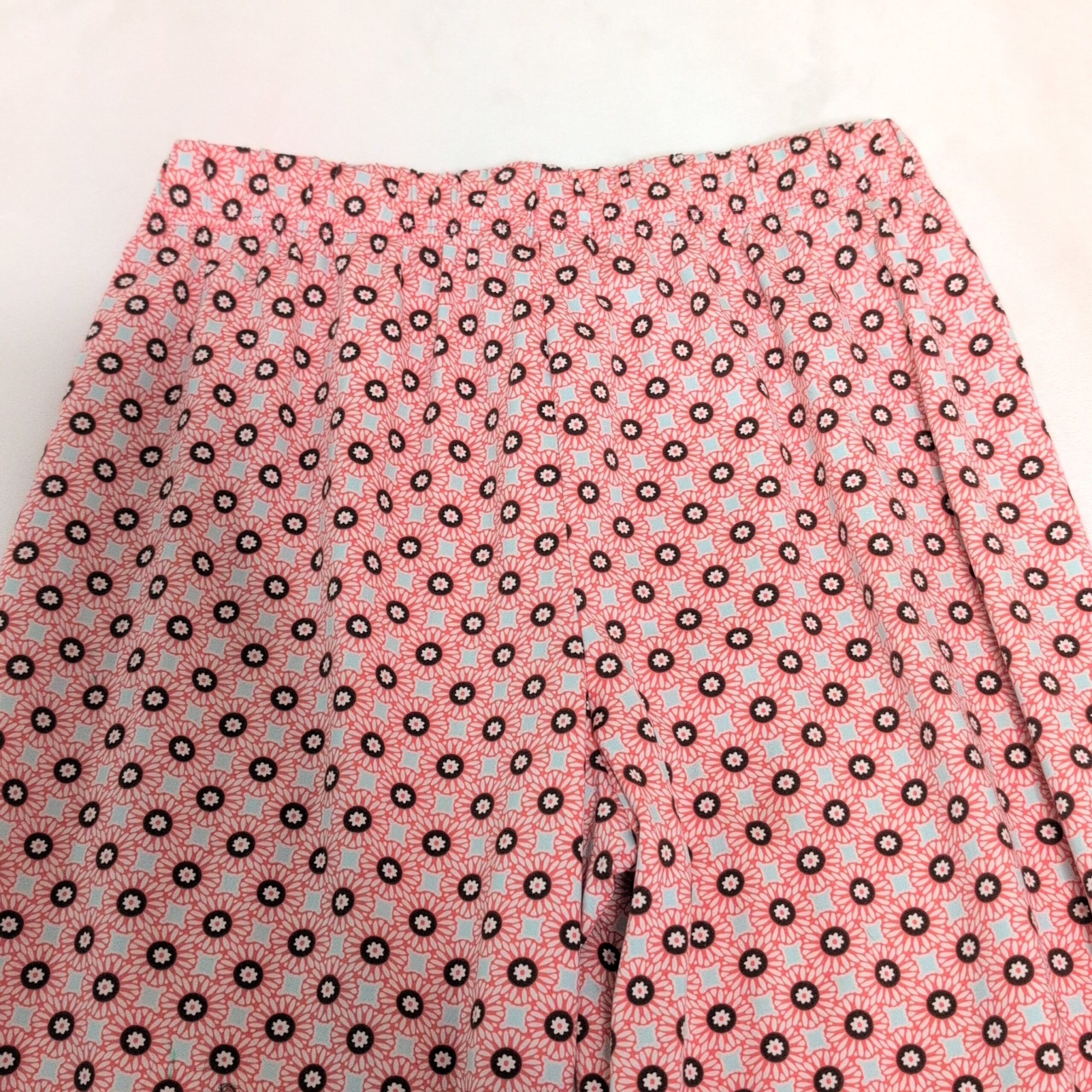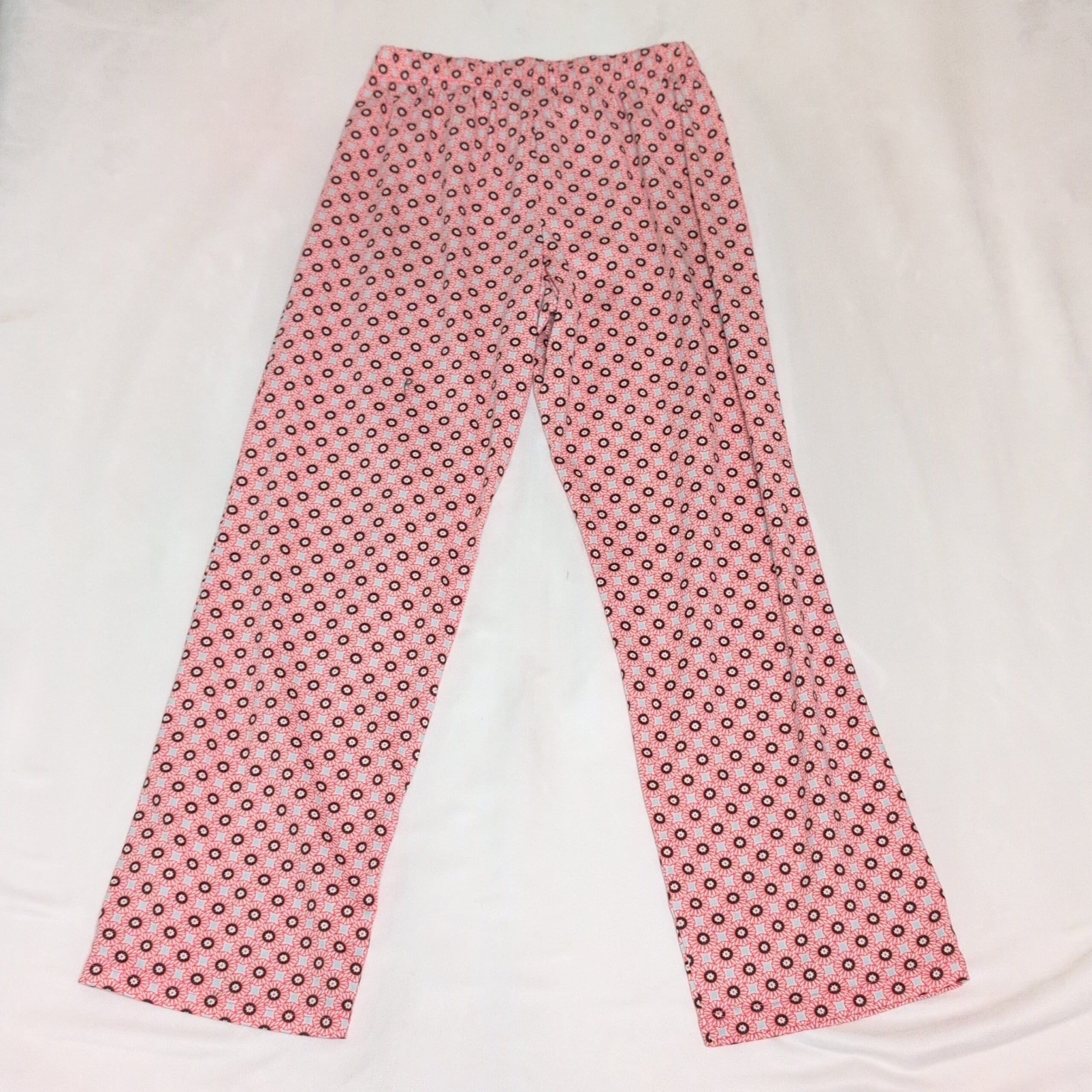 Lands’ End women’s pajama pants in pink with an all-over small floral/circle print. Straight leg, full-length lounge pants with an elastic waistband and a contrasting light turquoise drawstring ribbon at the front. Comfortable, lightweight sleepwear ideal for lounging or bedtime. Size S (standard), women’s department.