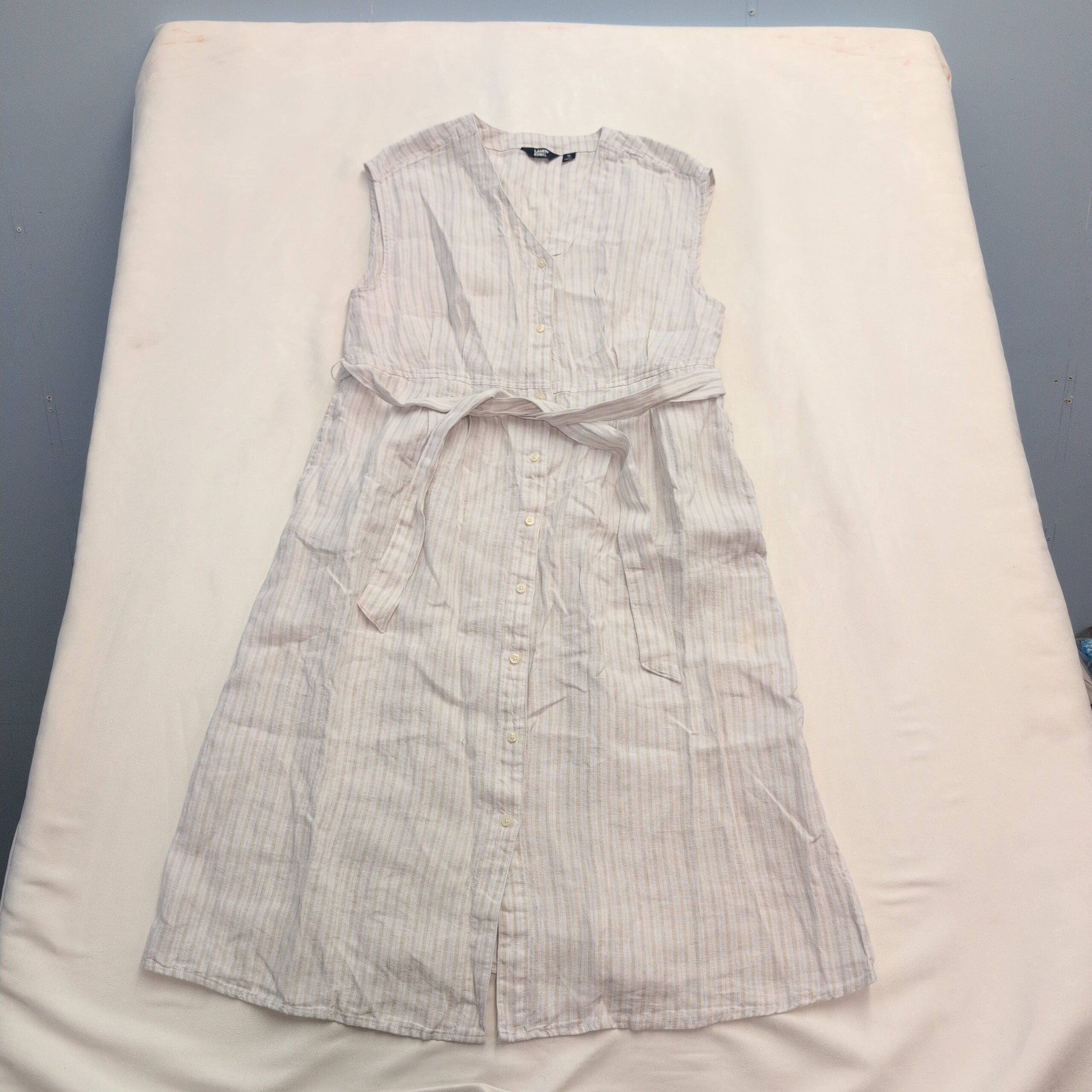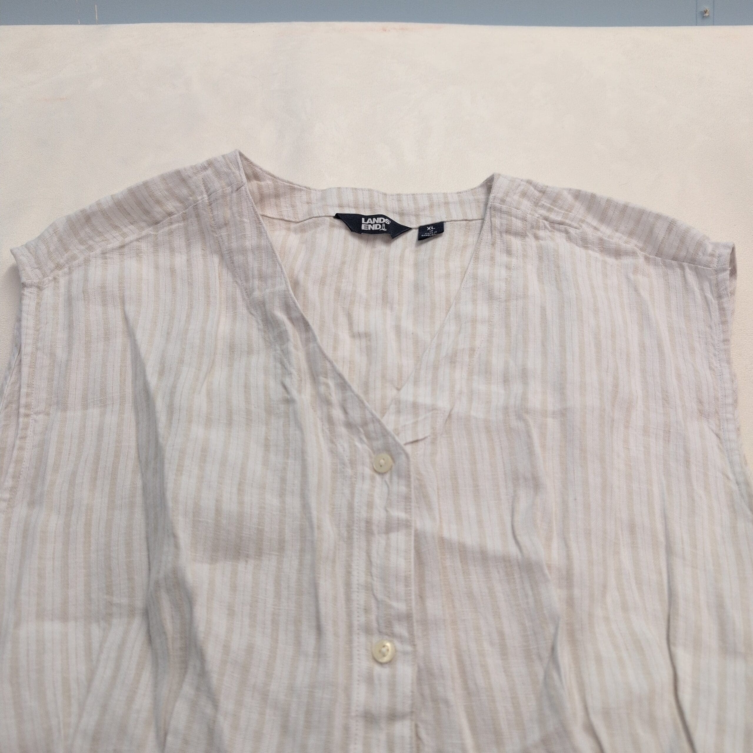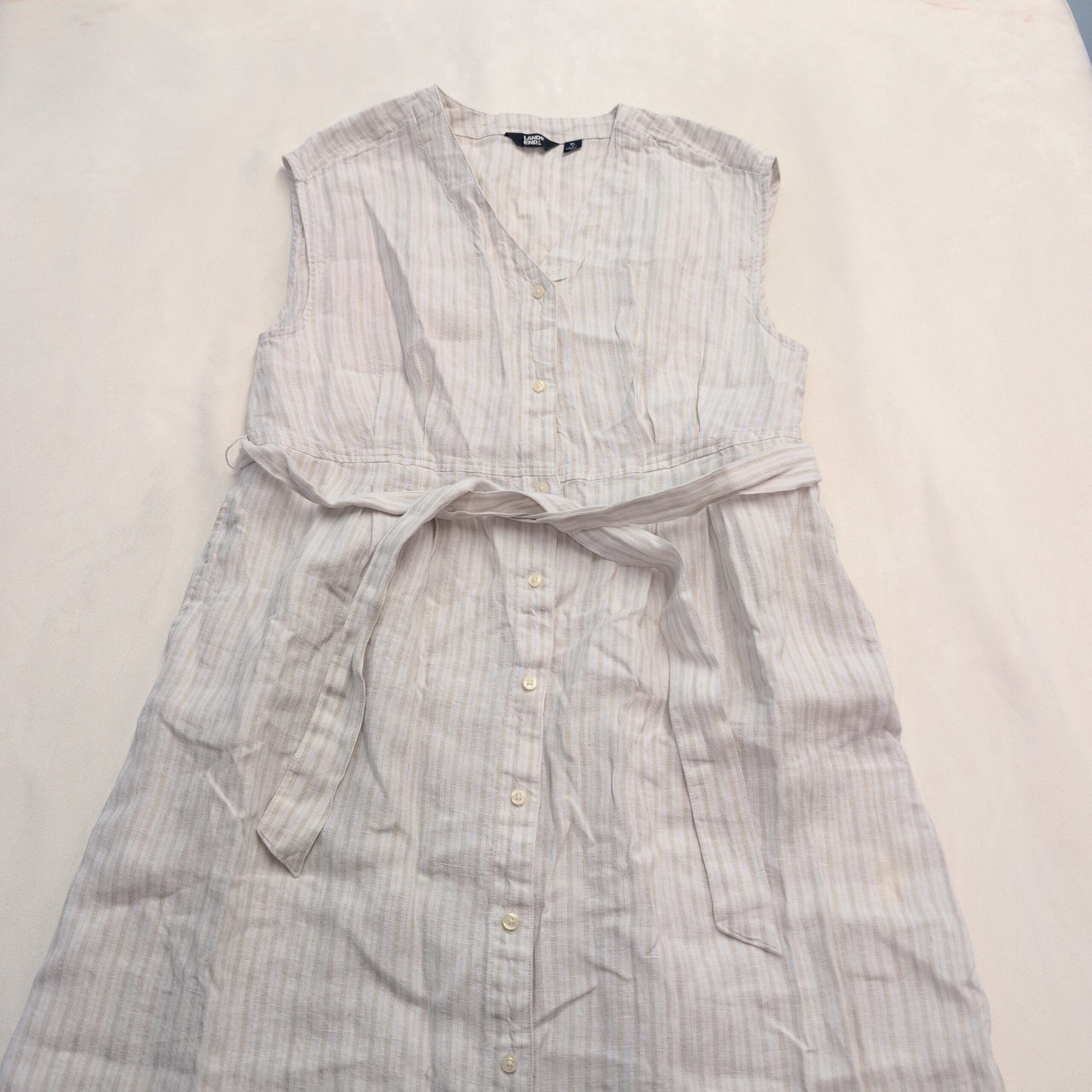 Lands’ End sleeveless button-front dress in white with subtle vertical stripes. Size XL (Standard). Features a V-neck, full button front, self-tie waist belt, and a relaxed A-line silhouette in a lightweight woven fabric. Belt included.