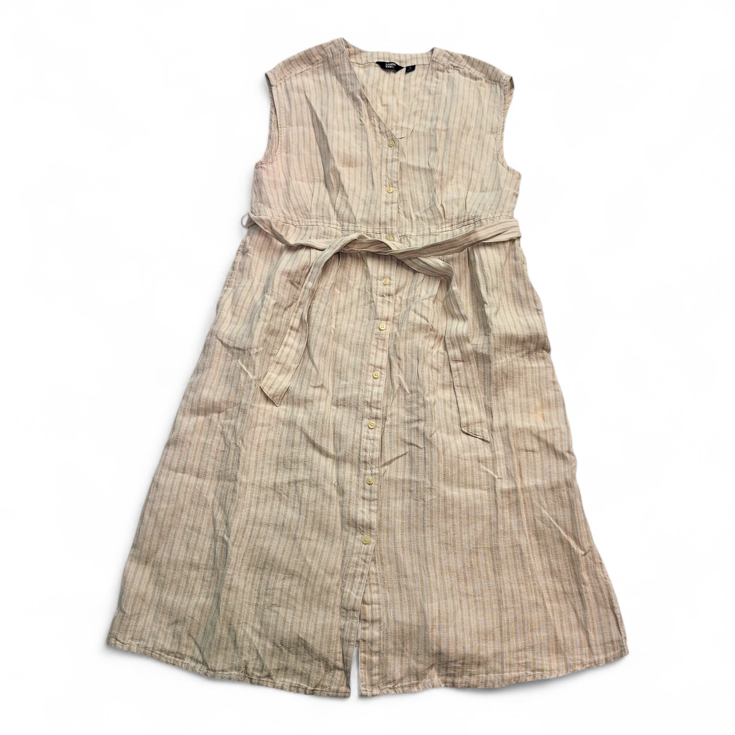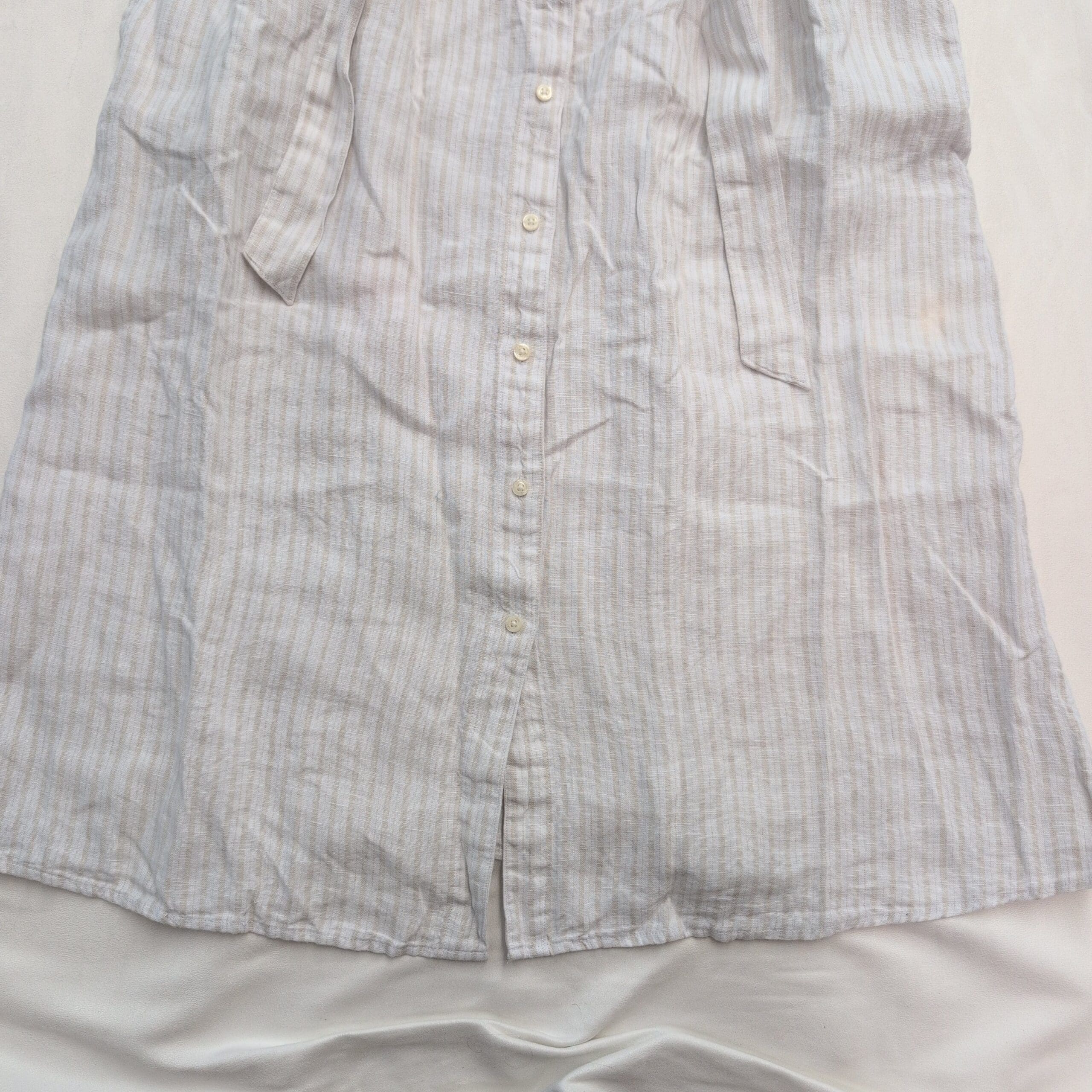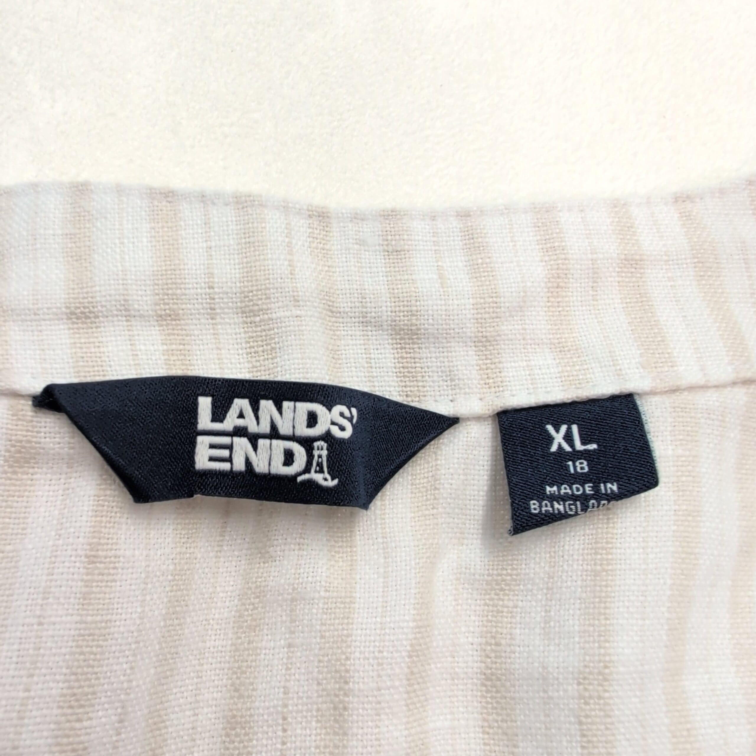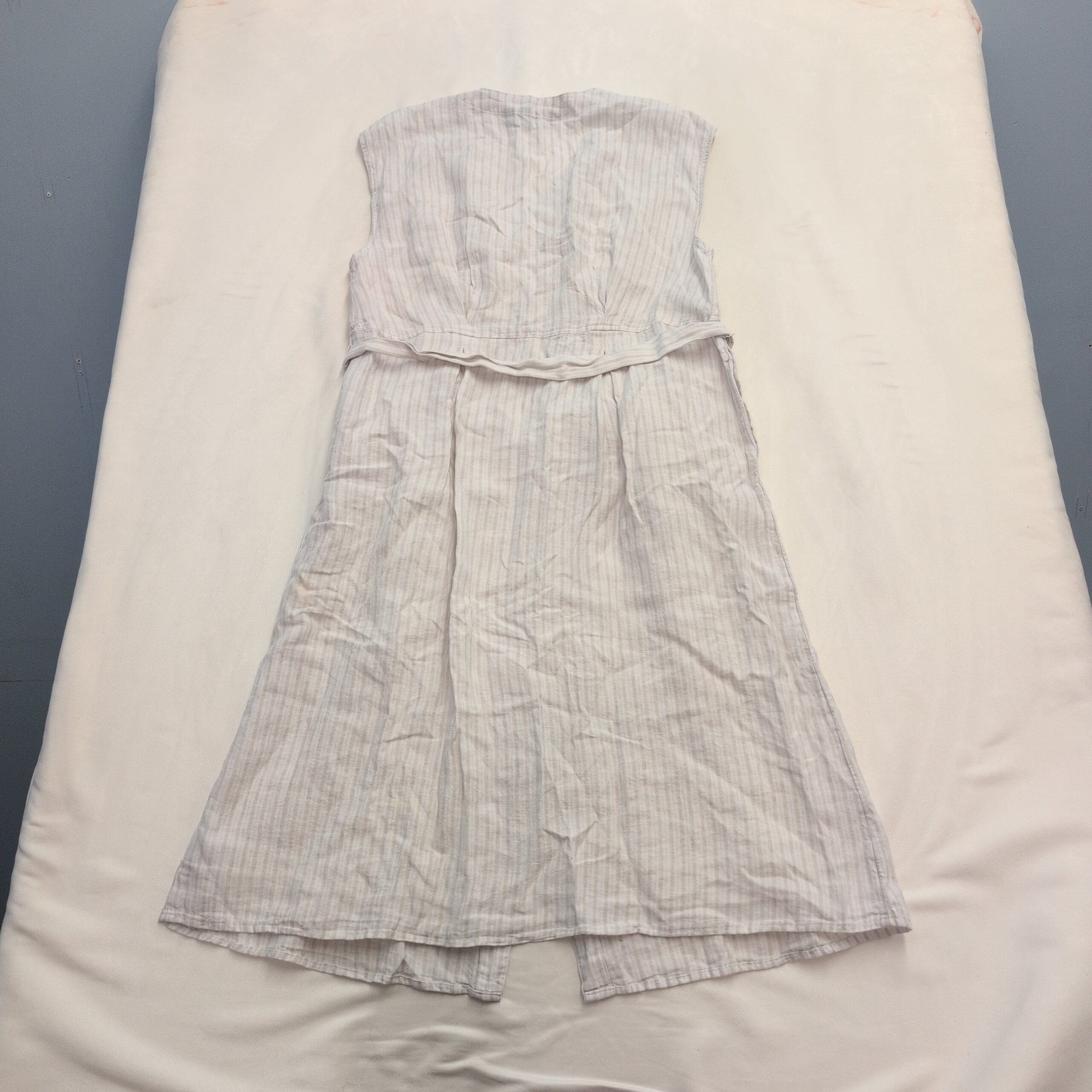 Lands’ End sleeveless button-front dress in white with subtle vertical stripes. Size XL (Standard). Features a V-neck, full button front, self-tie waist belt, and a relaxed A-line silhouette in a lightweight woven fabric. Belt included.