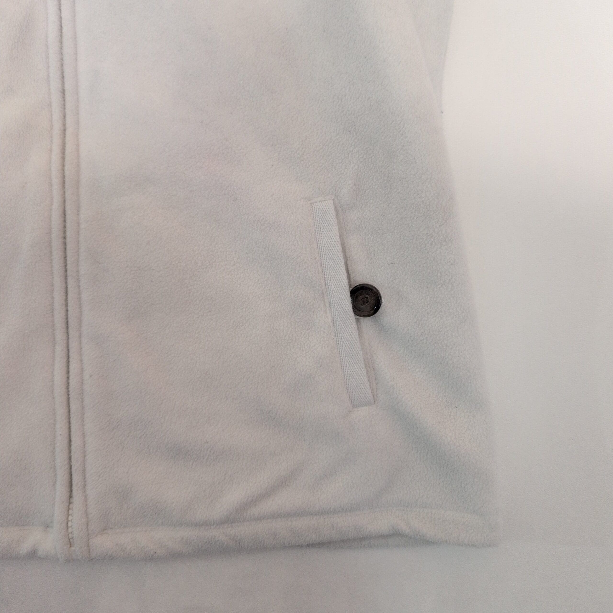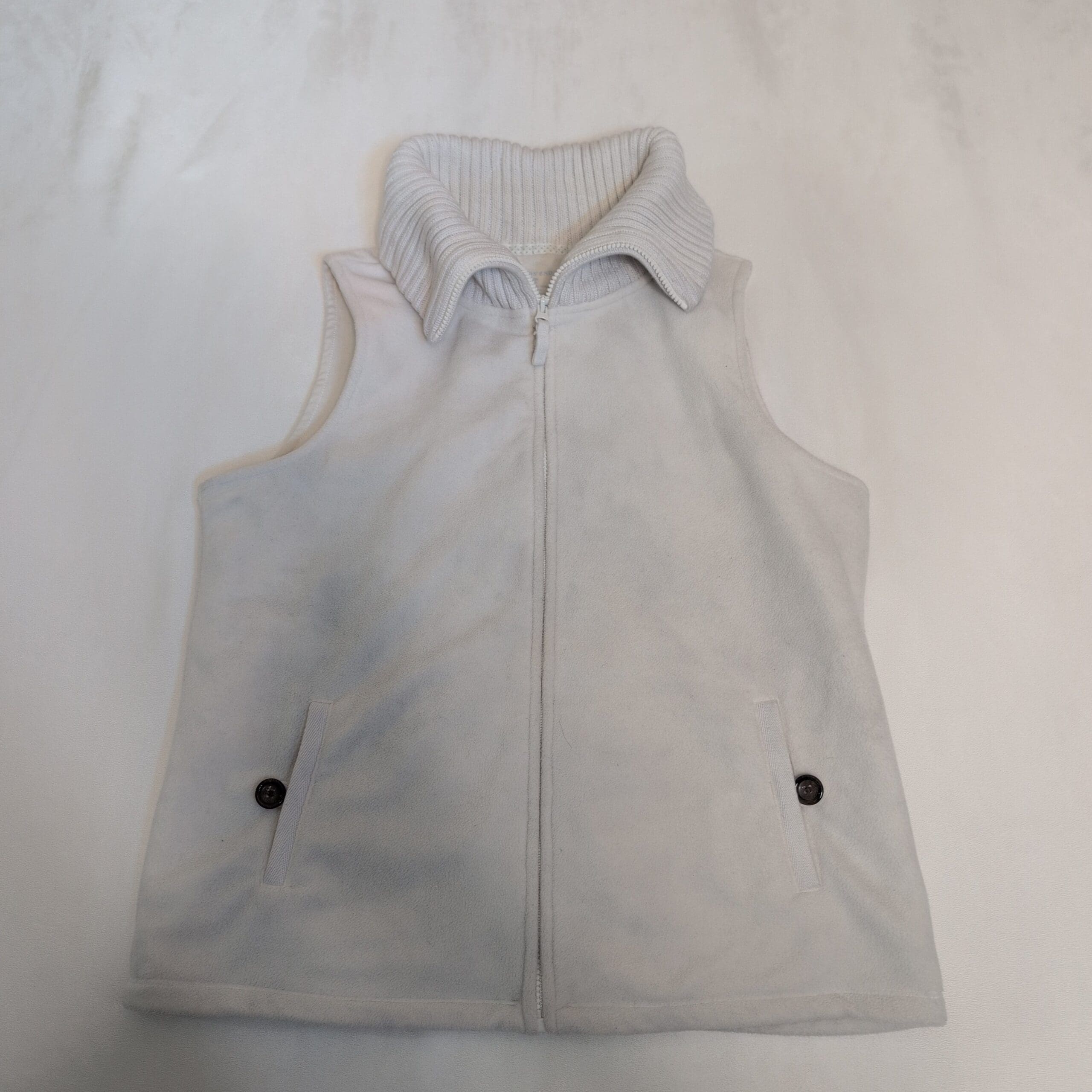 Lands’ End women’s fleece vest in white, size M. Full-zip front with a cozy ribbed funnel collar, sleeveless silhouette and two front welt pockets with button accents for a classic look. Soft fleece layer perfect for layering over long sleeves or under jackets. Neutral white pairs easily with casual and dressier outfits.