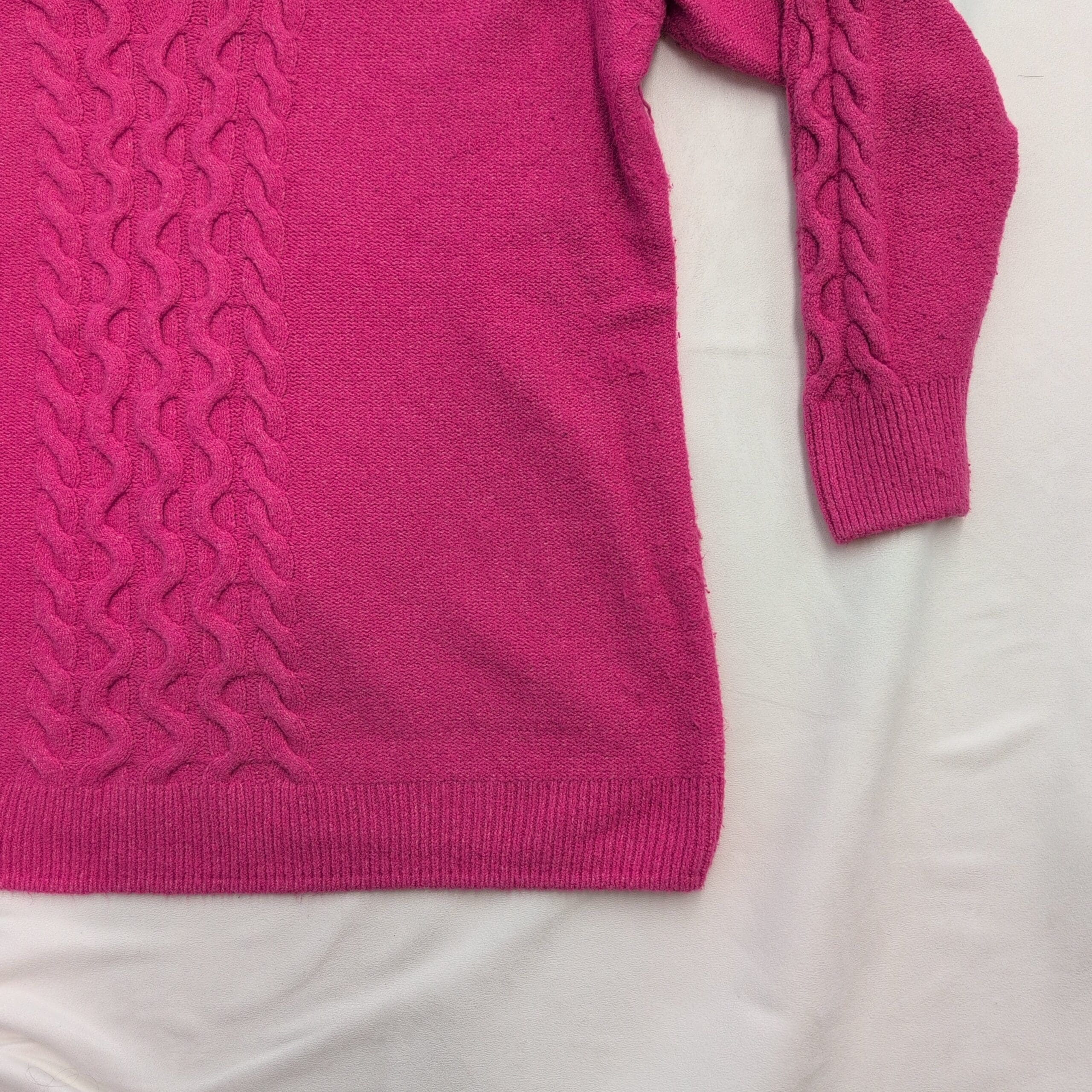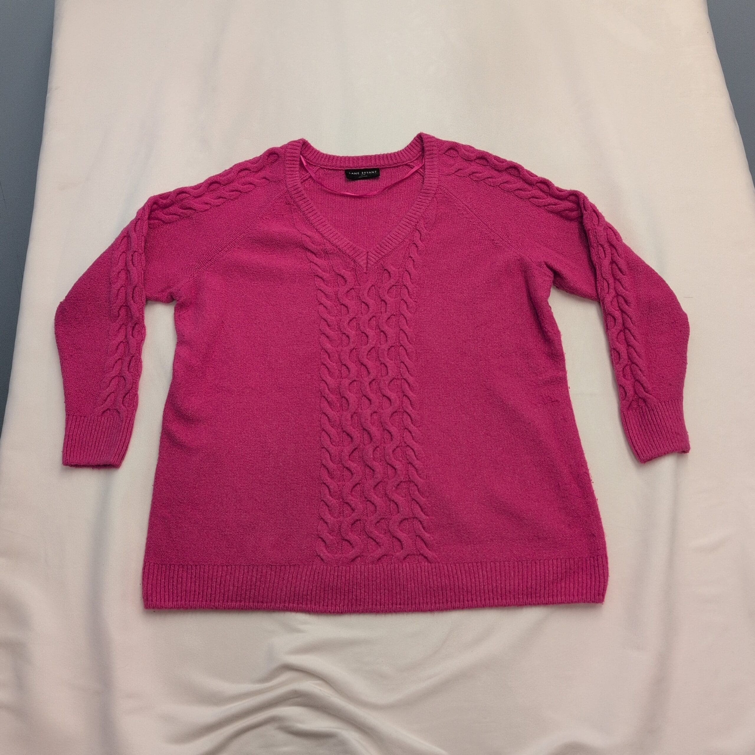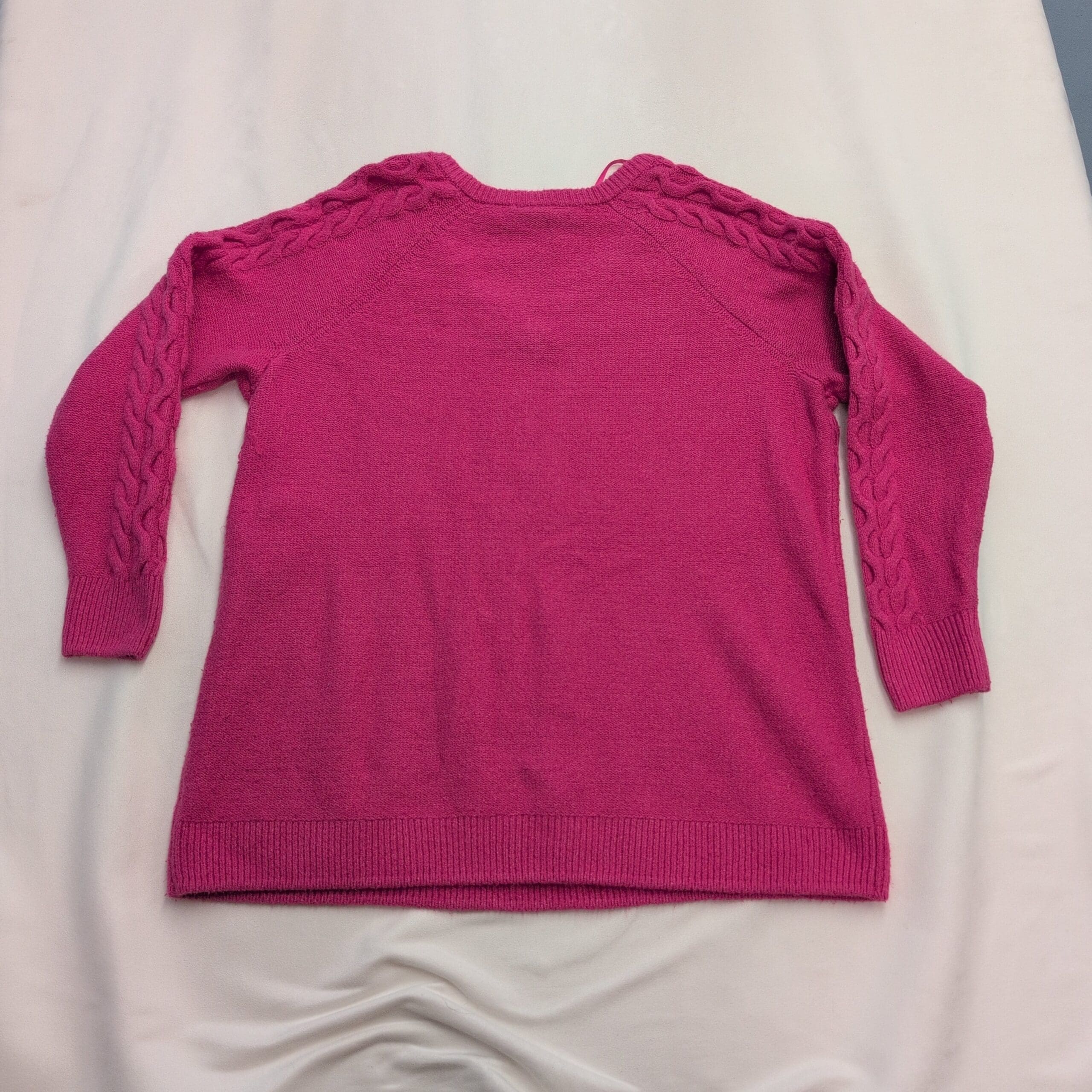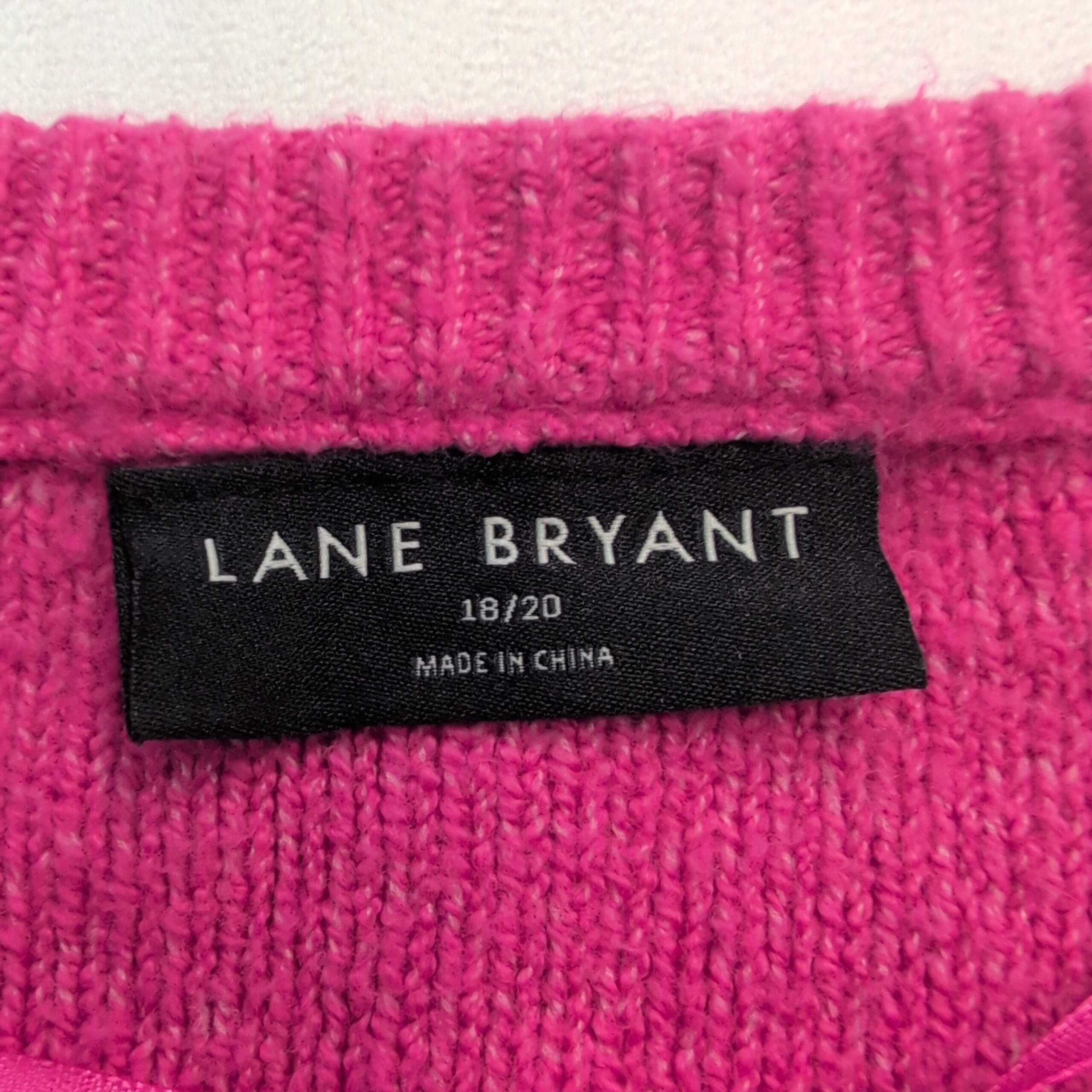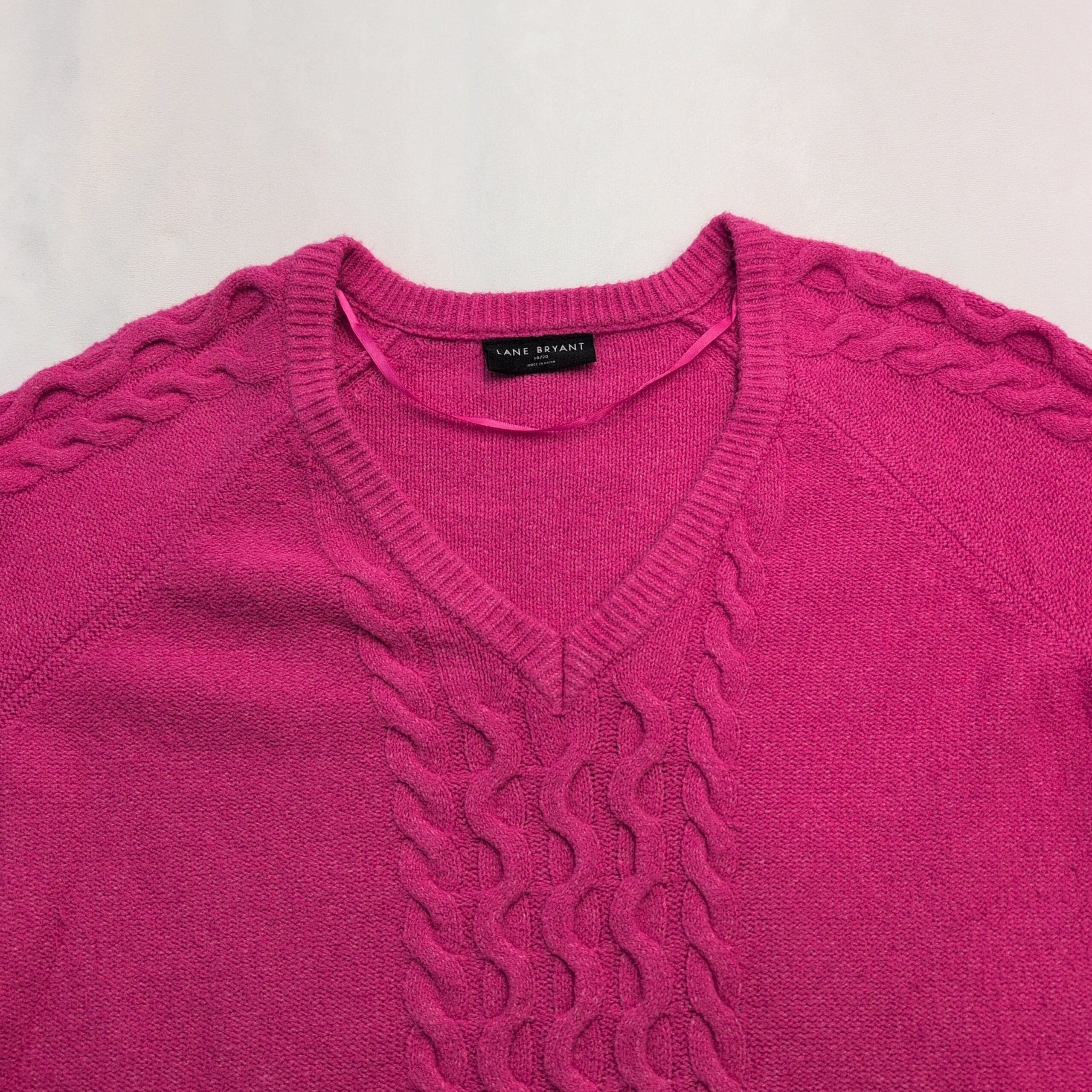 Lane Bryant women’s cable-knit V-neck sweater in a bright pink hue. Size 18 (Plus). Features a decorative cable stitch down the center and along the sleeves, with ribbed cuffs and hem for a classic, cozy look. Gently used condition with minor piling pictured; free of major rips, stains, or tears. Typical wear may be present.