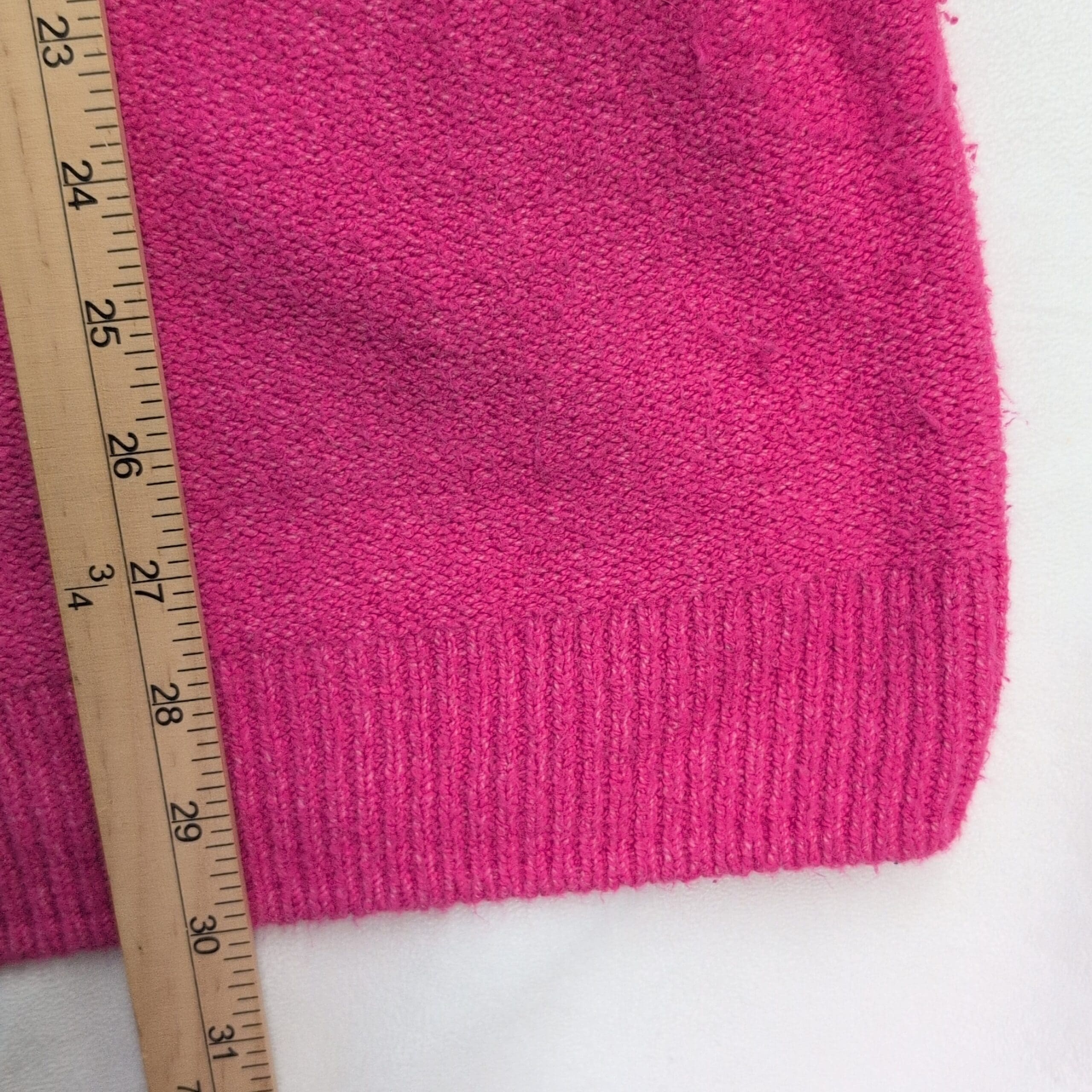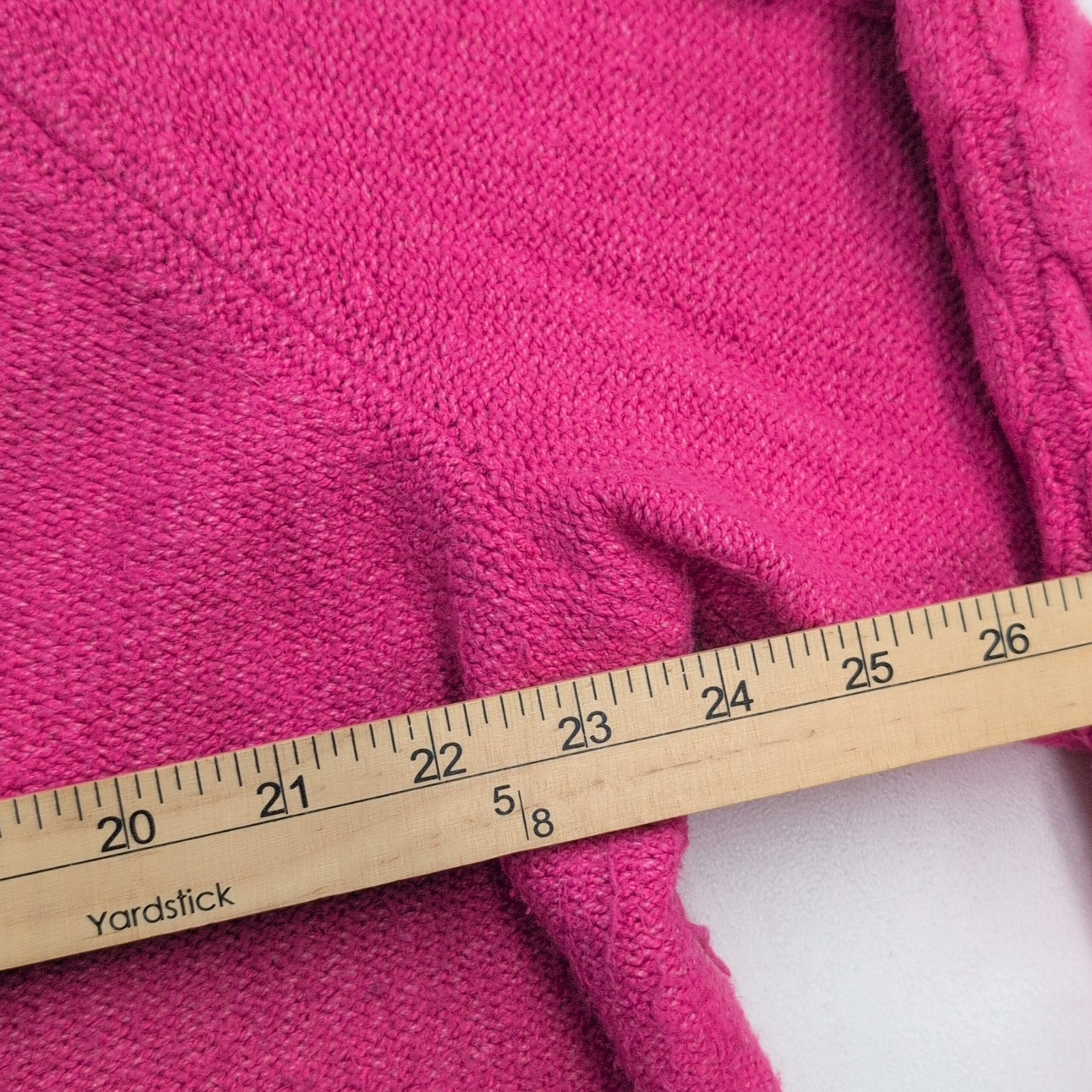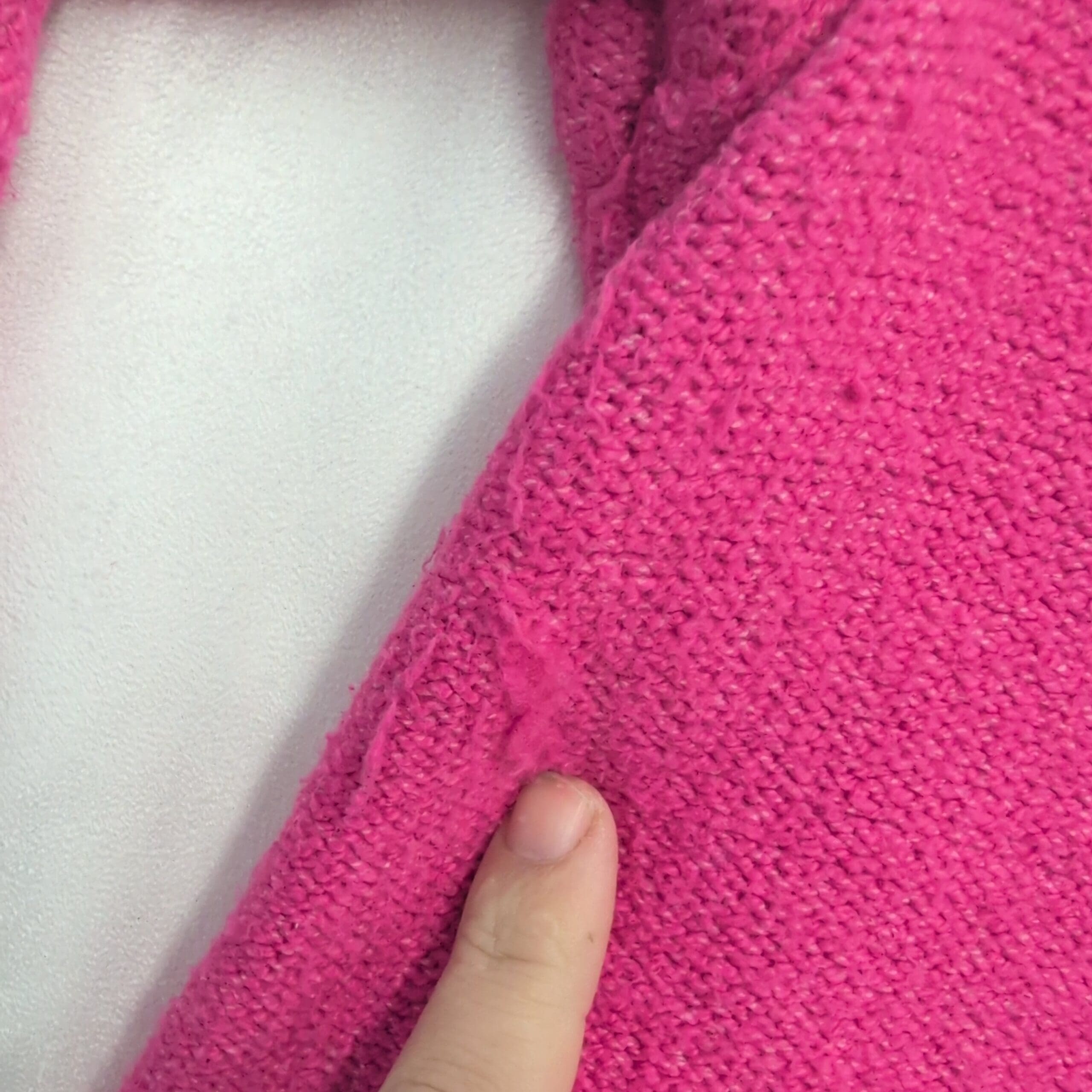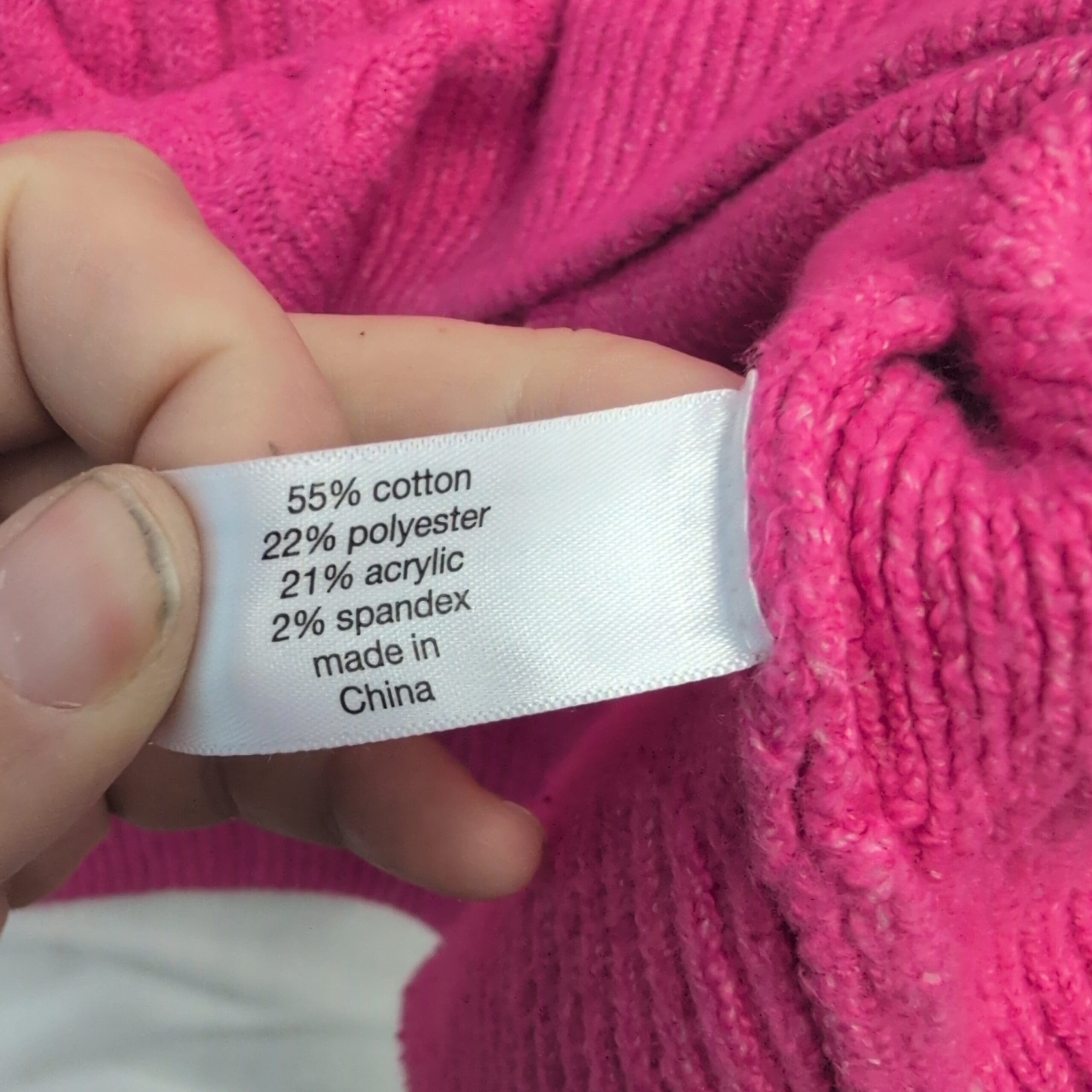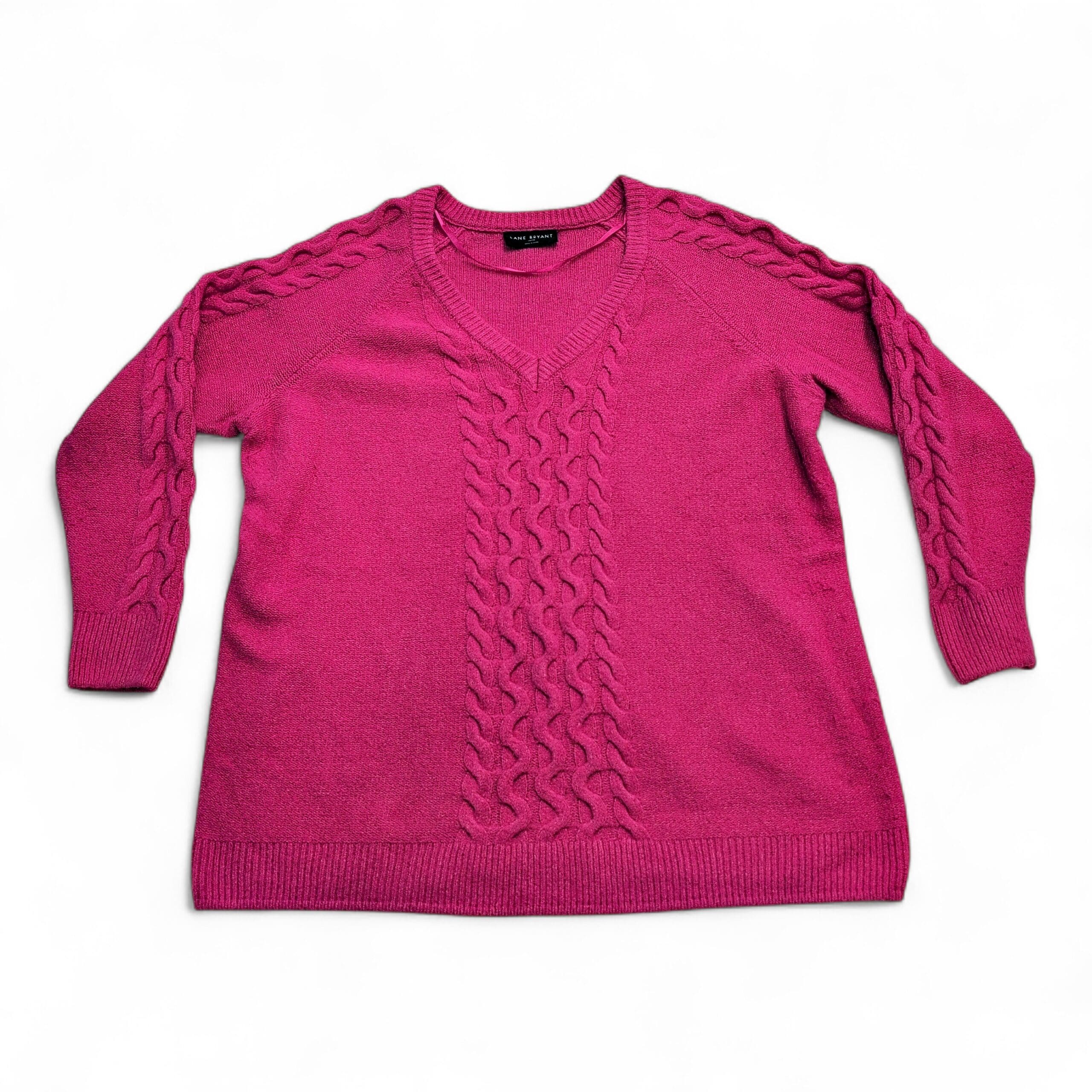 Lane Bryant women’s cable-knit V-neck sweater in a bright pink hue. Size 18 (Plus). Features a decorative cable stitch down the center and along the sleeves, with ribbed cuffs and hem for a classic, cozy look. Gently used condition with minor piling pictured; free of major rips, stains, or tears. Typical wear may be present.
