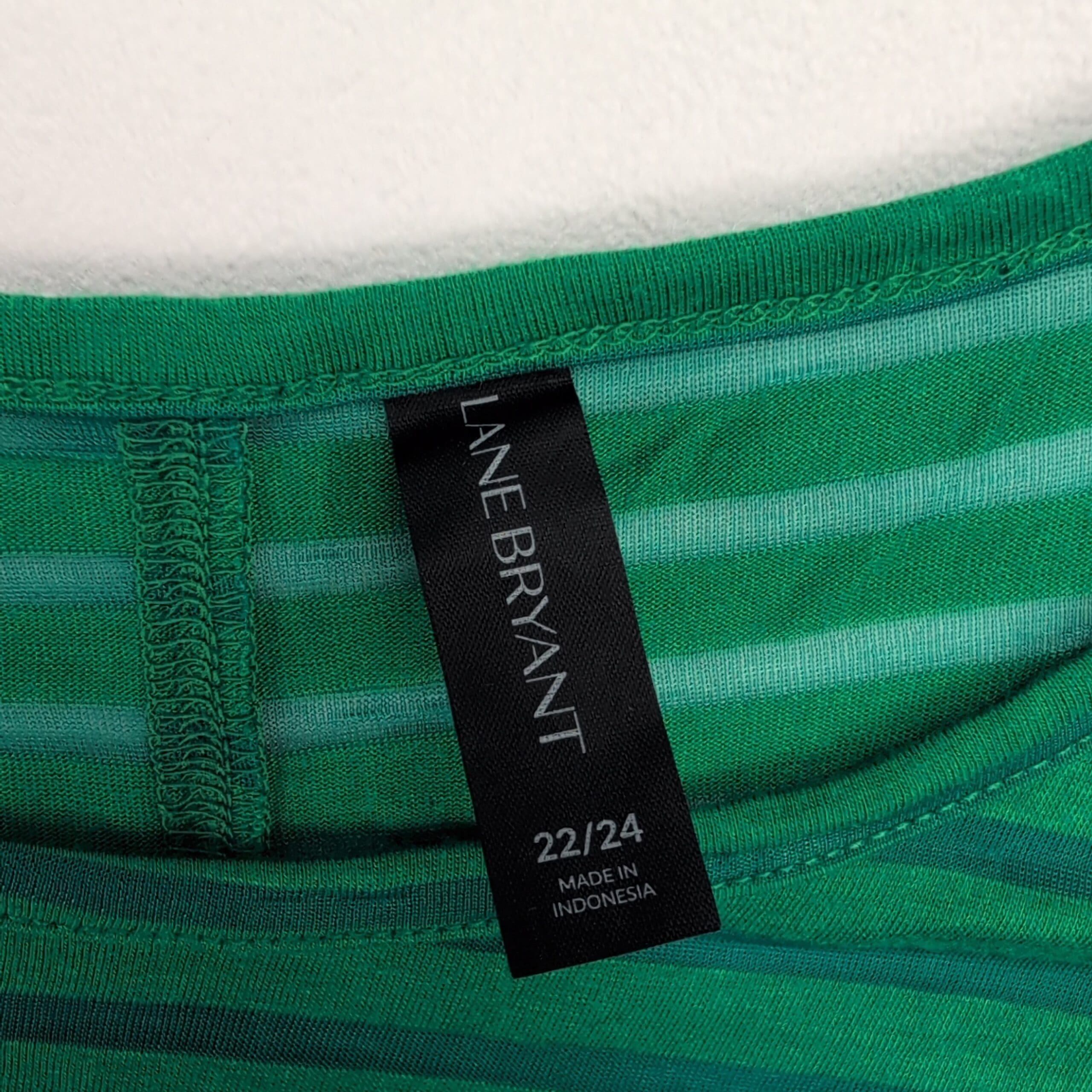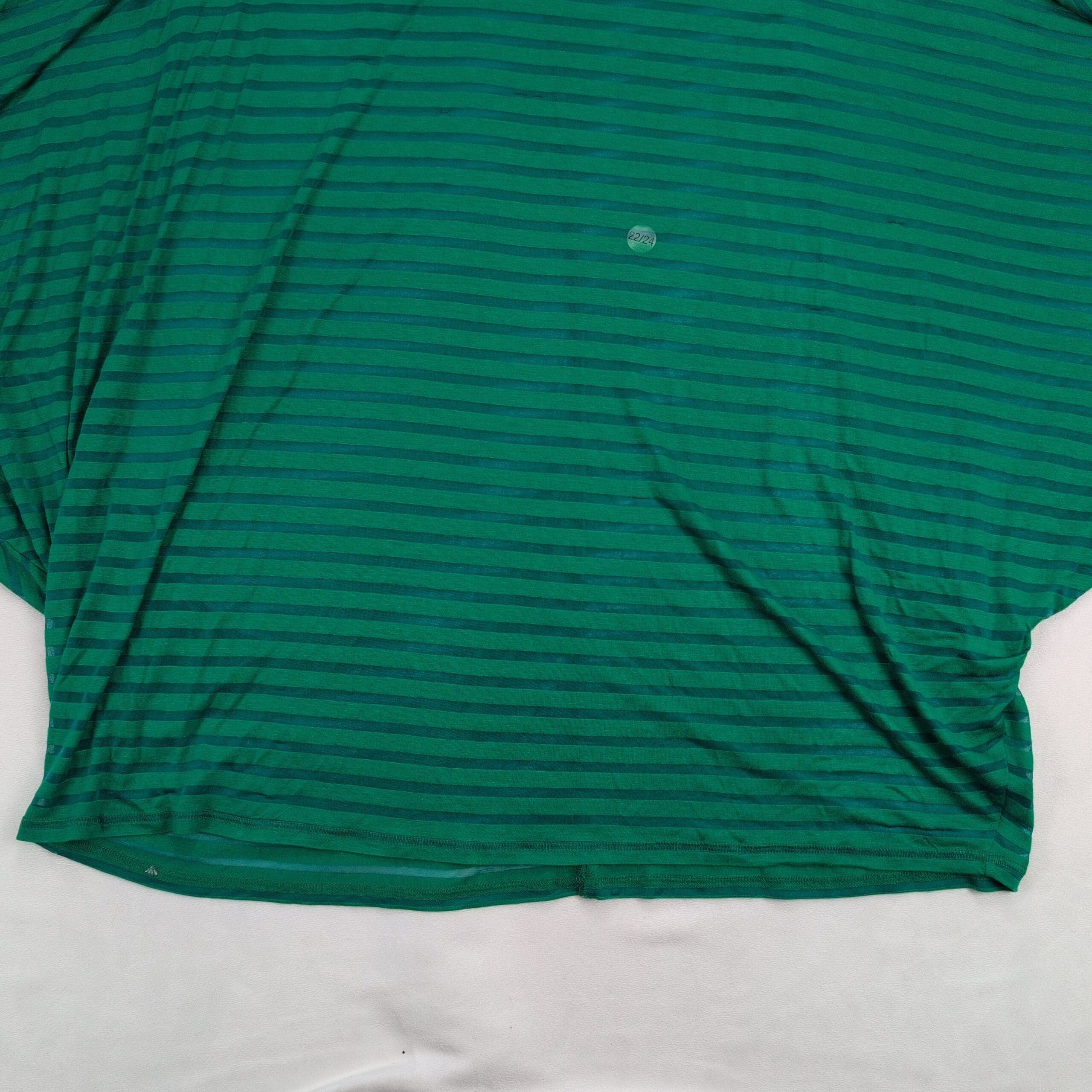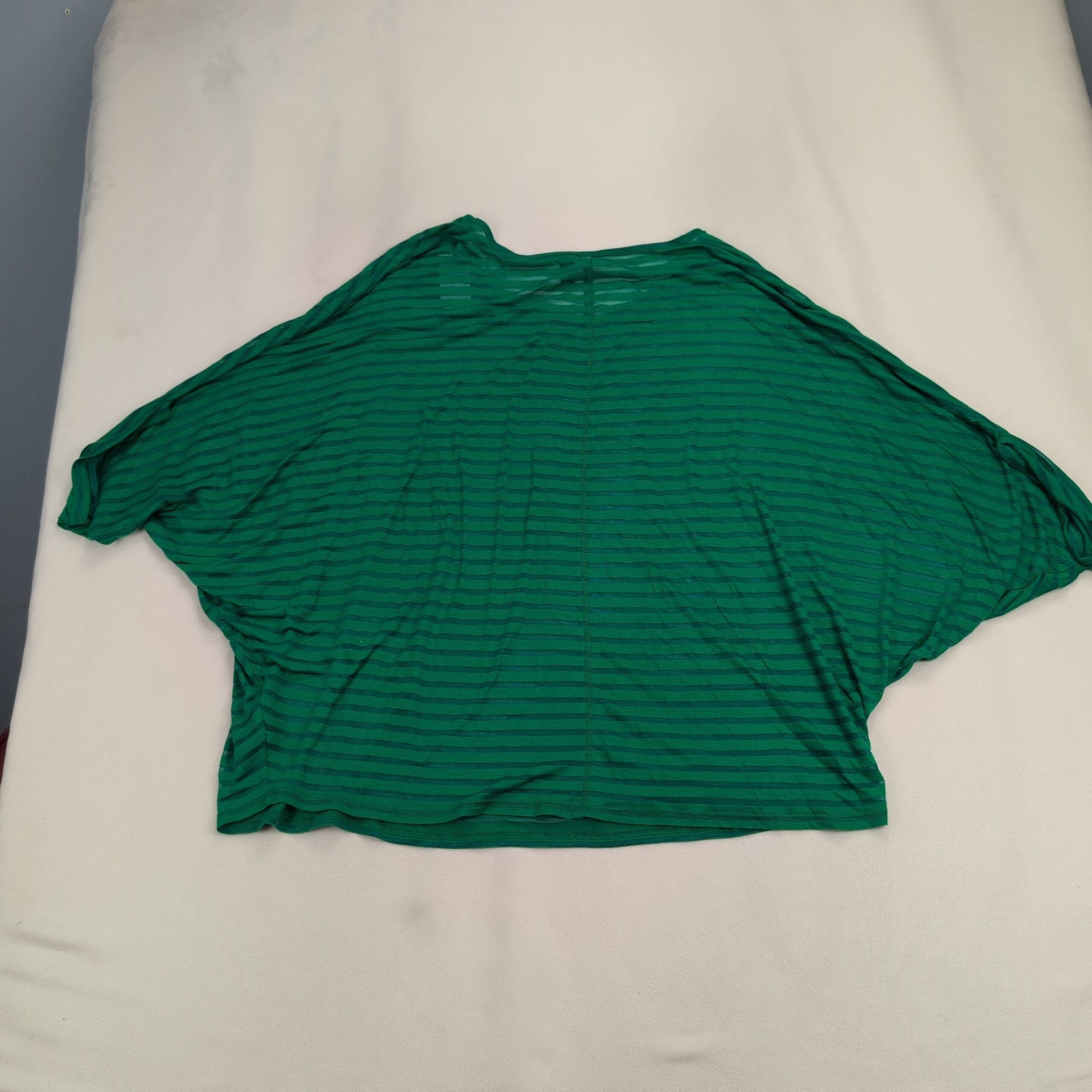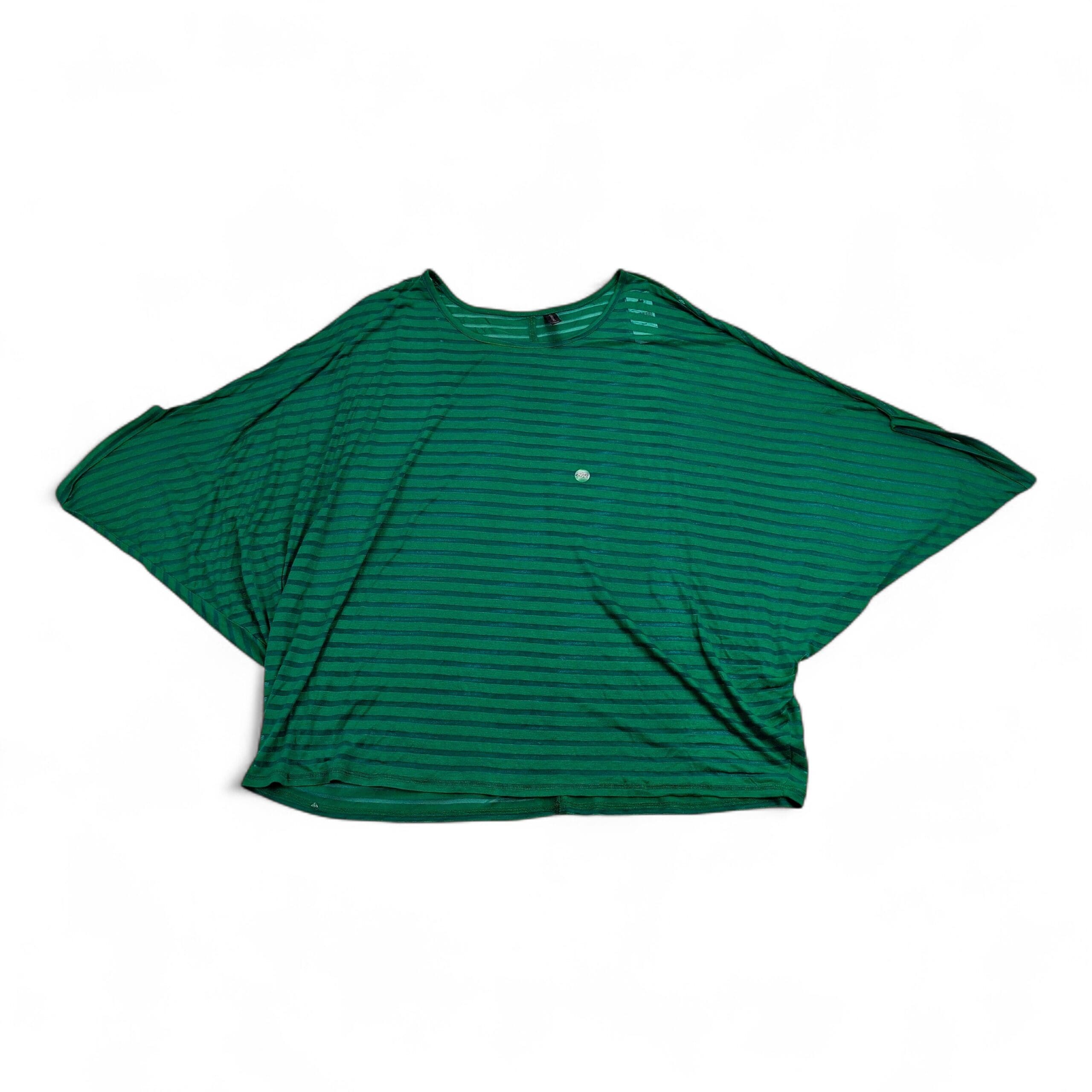 Lane Bryant plus-size women’s top, size 22. Lightweight green with darker green horizontal stripes. Relaxed boxy silhouette with dolman/batwing sleeves and a crew neckline — great for casual wear or easy layering.