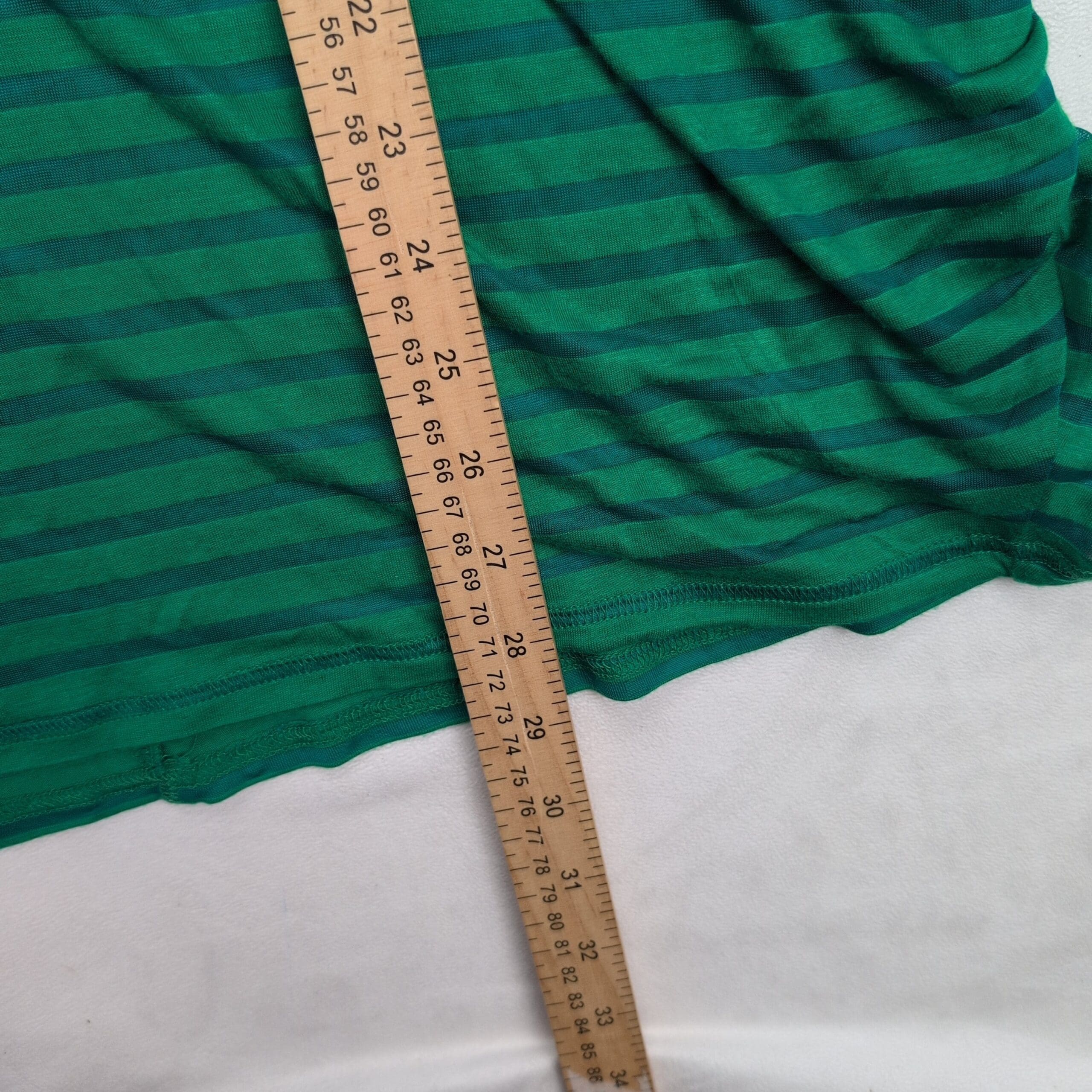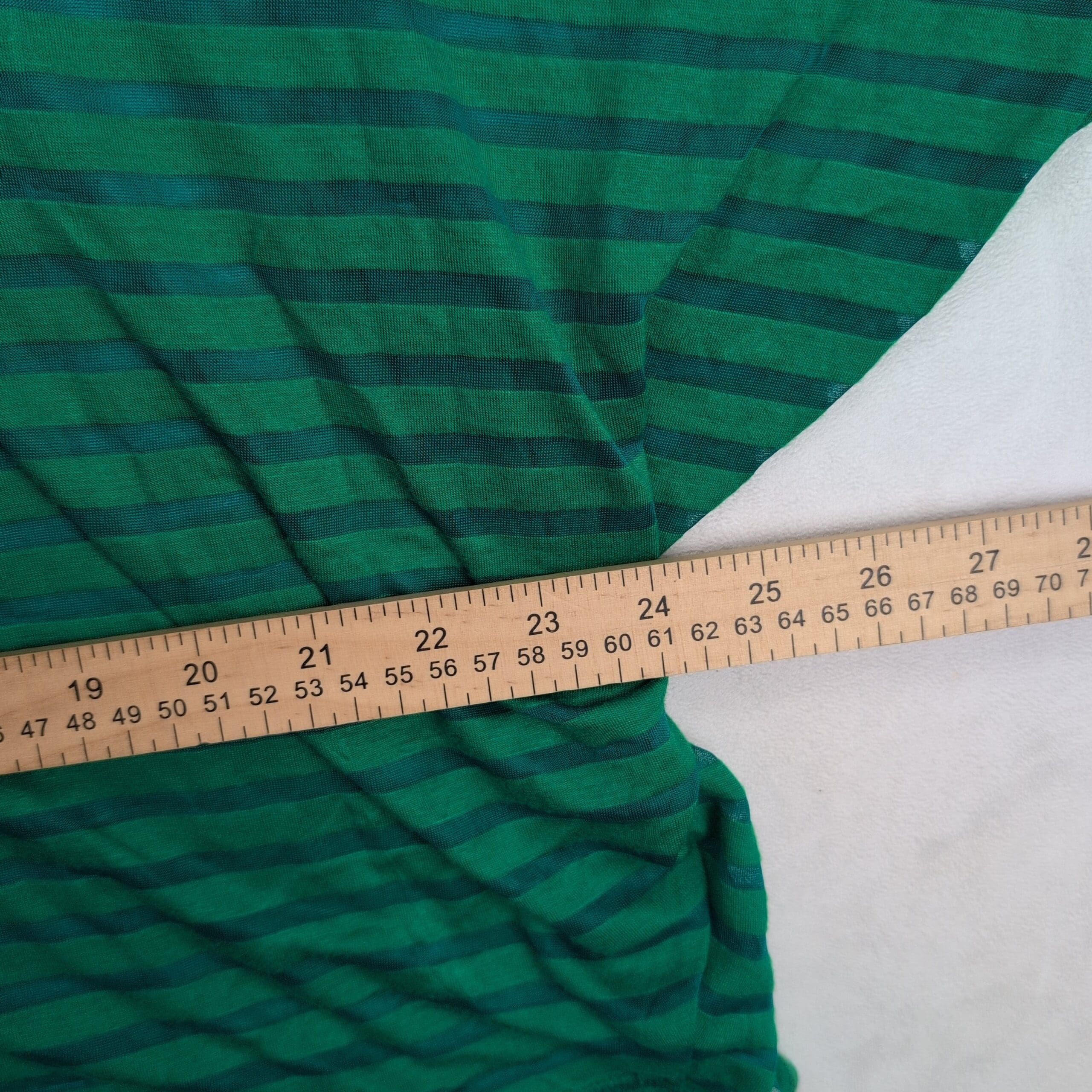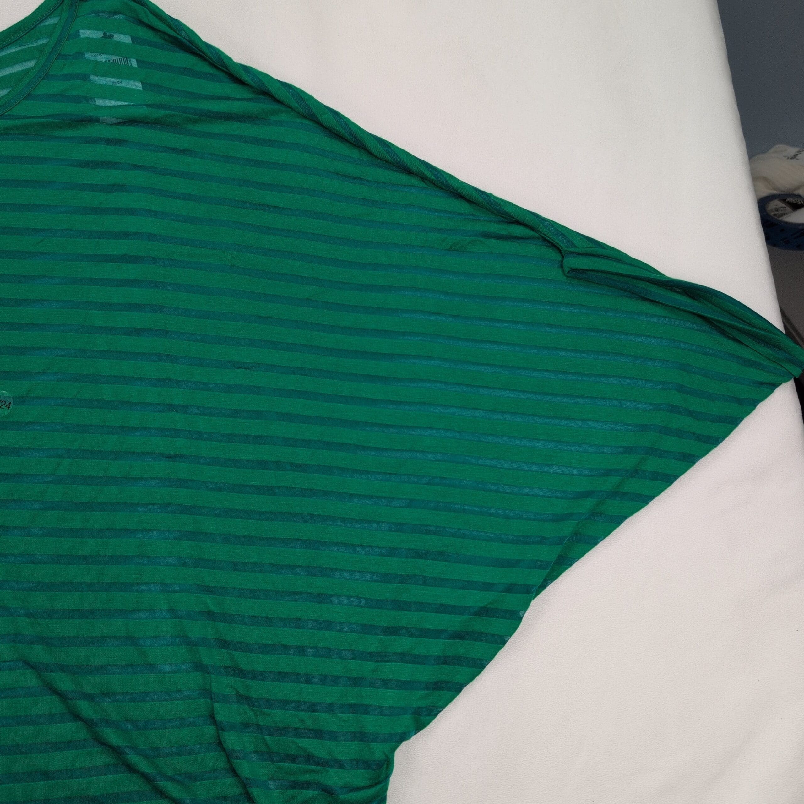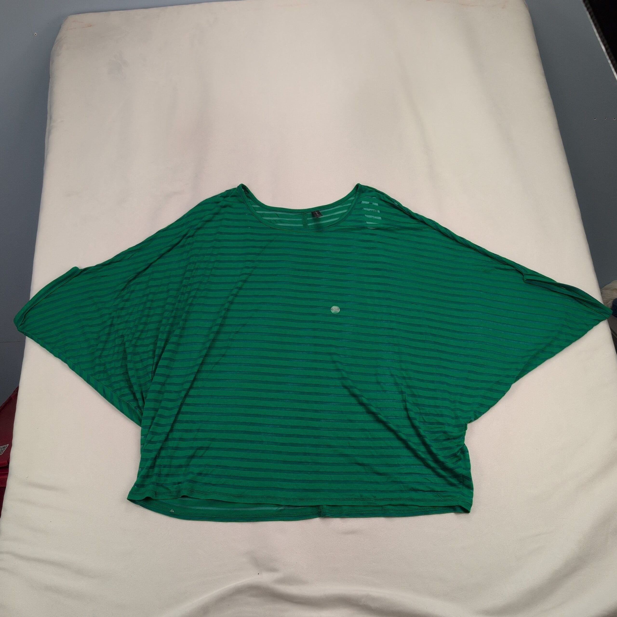 Lane Bryant plus-size women’s top, size 22. Lightweight green with darker green horizontal stripes. Relaxed boxy silhouette with dolman/batwing sleeves and a crew neckline — great for casual wear or easy layering.