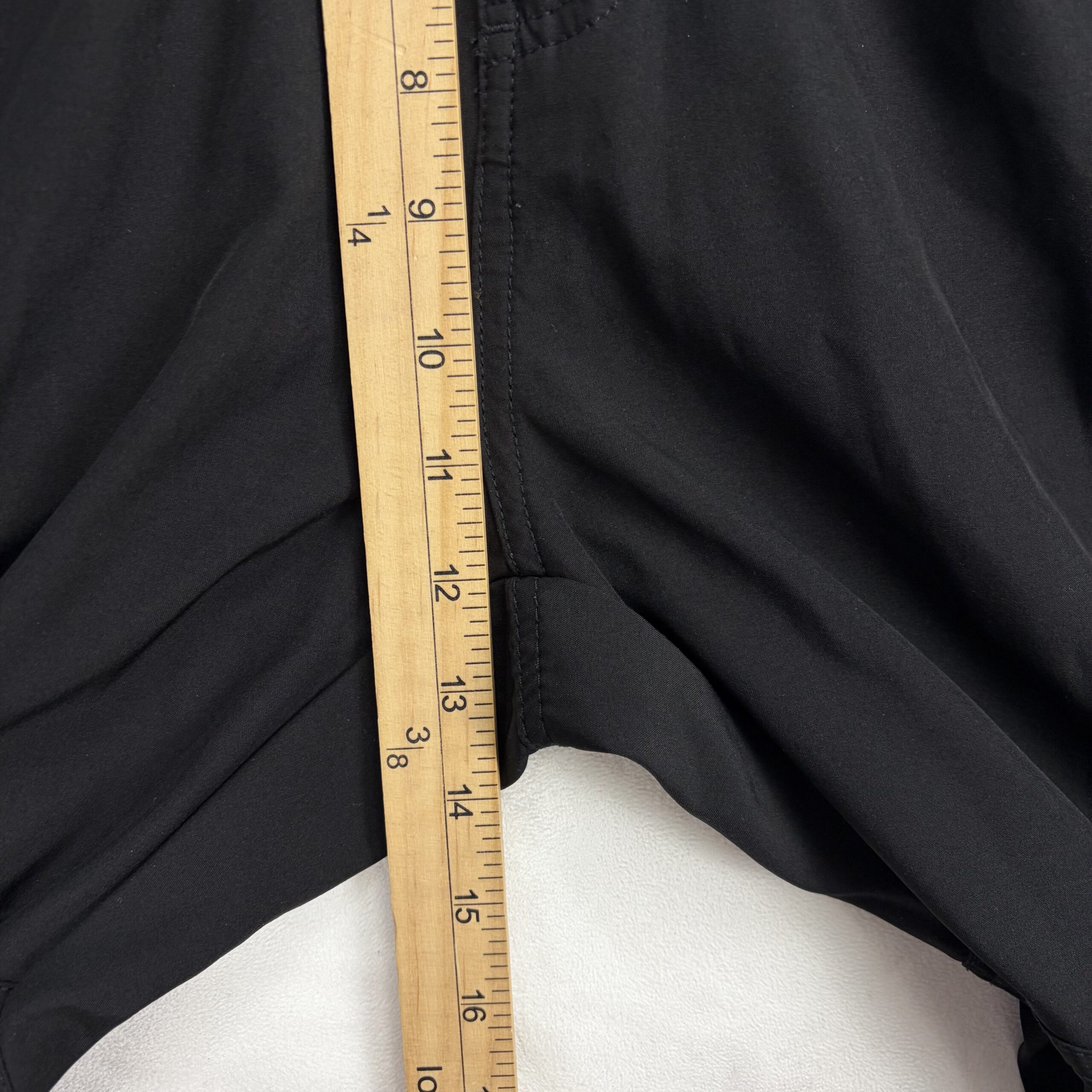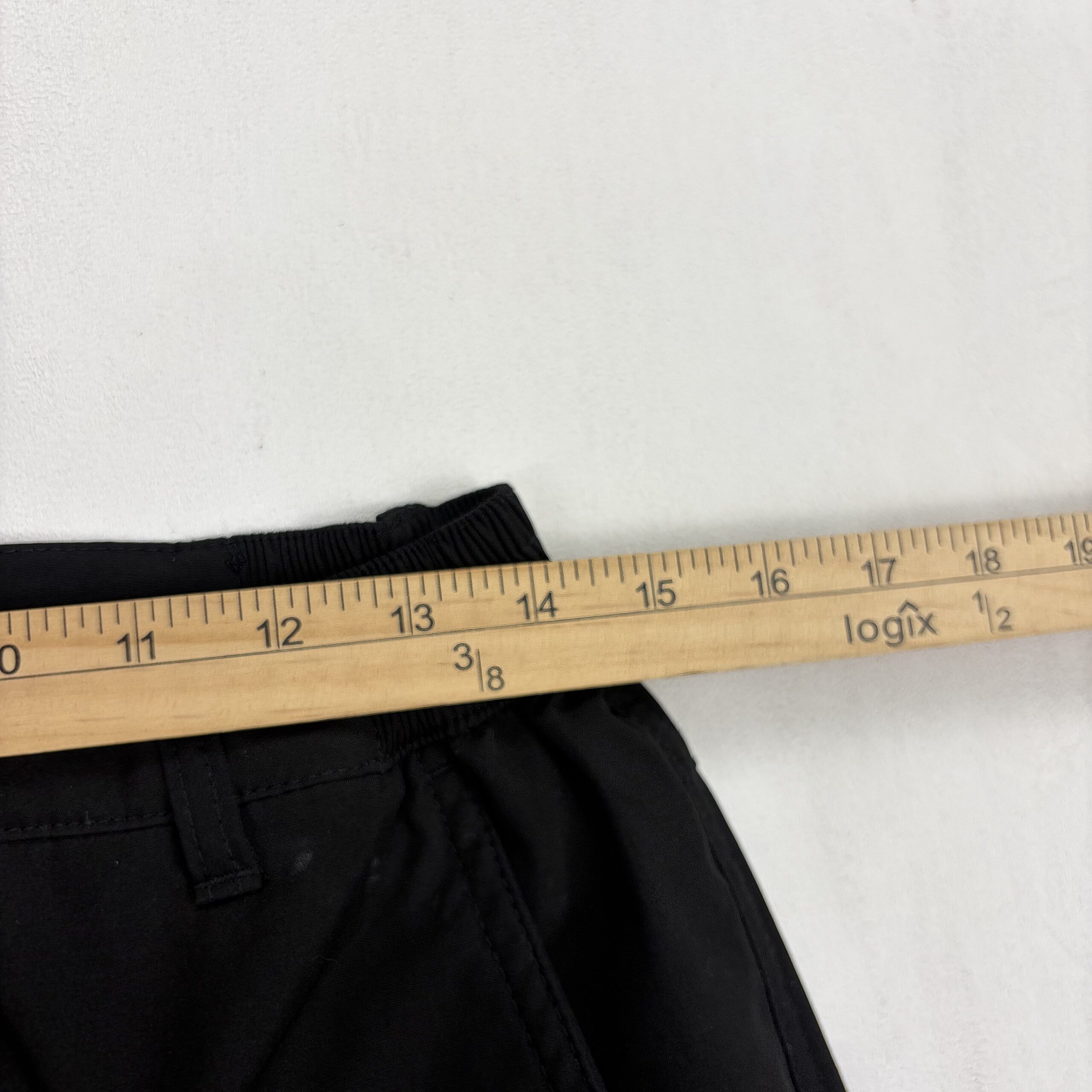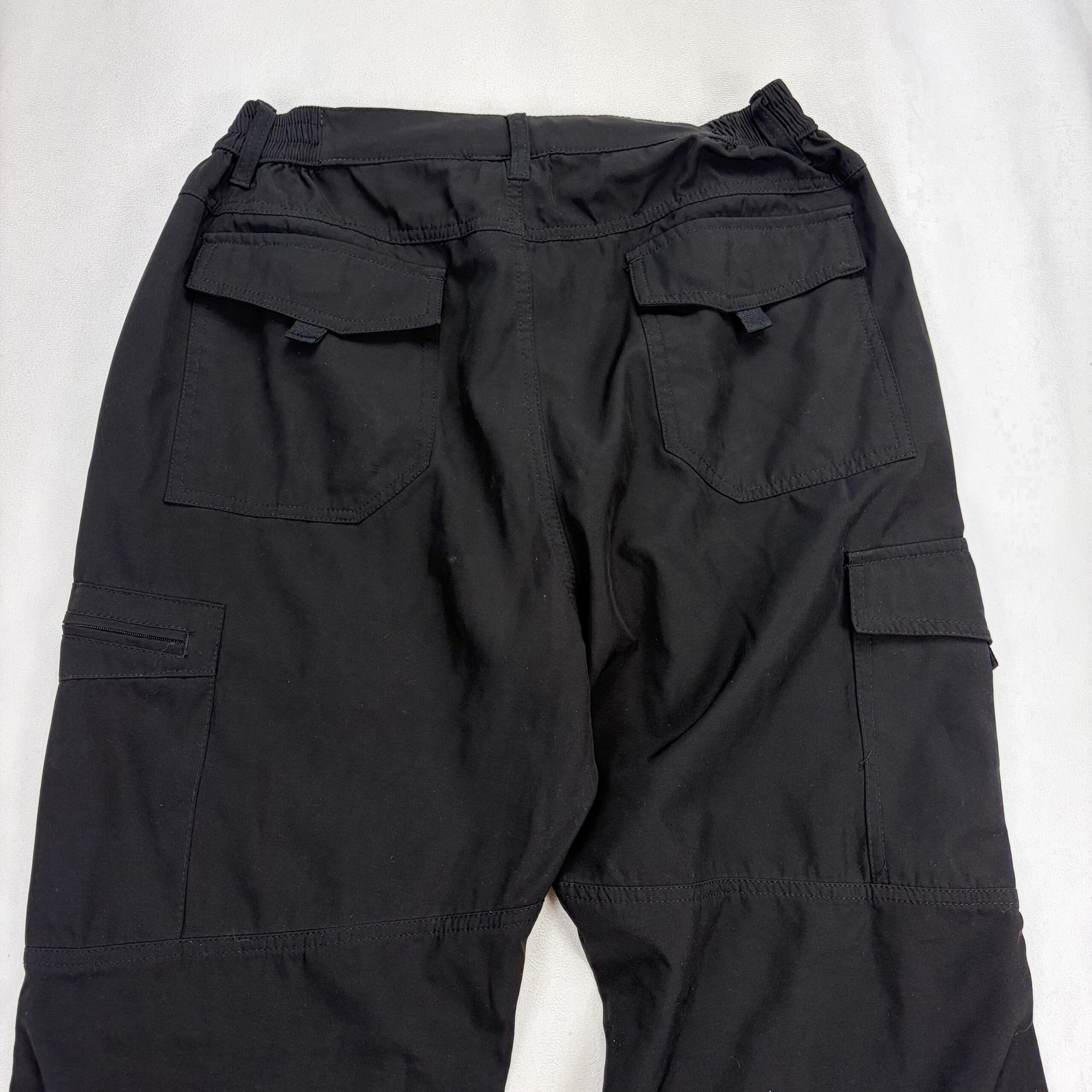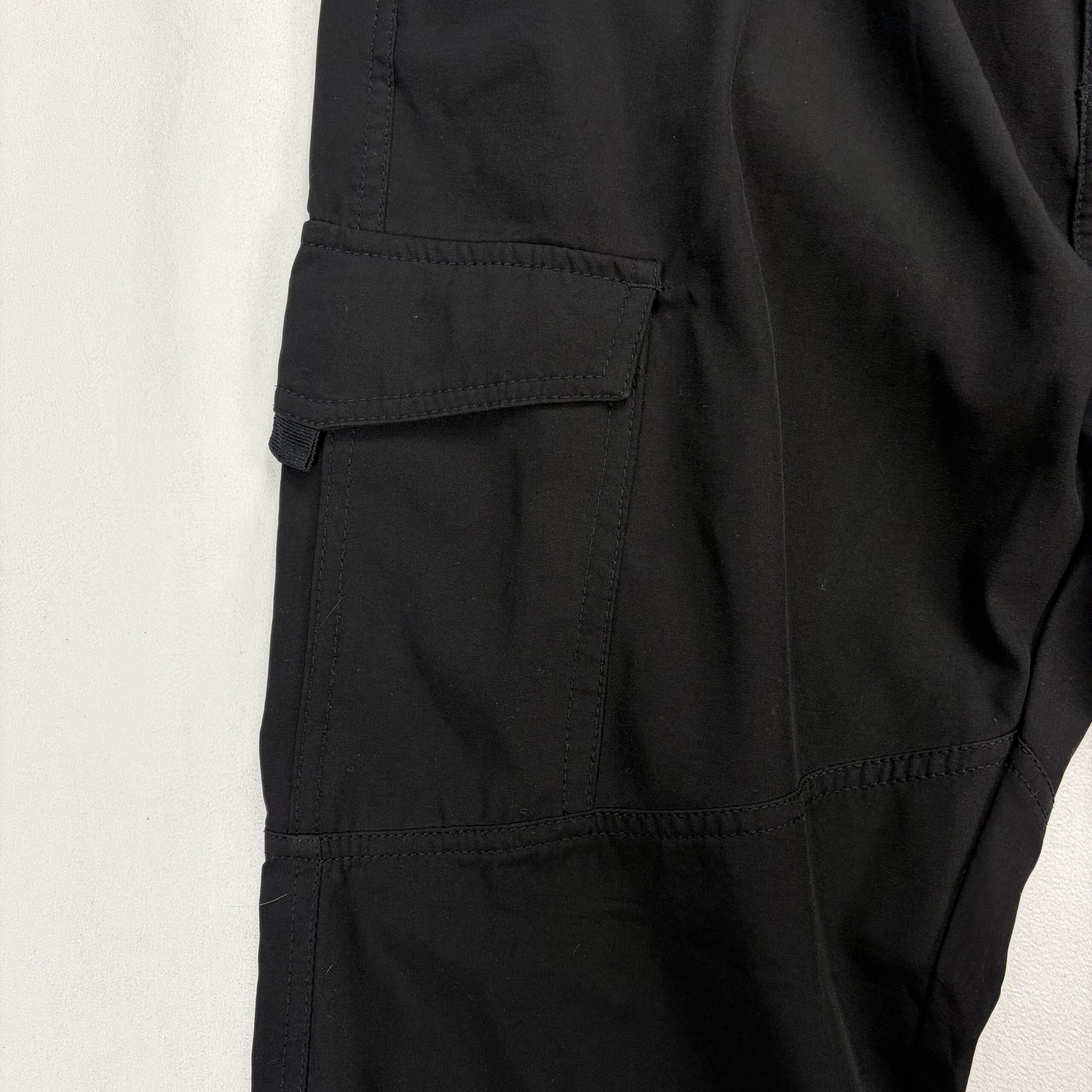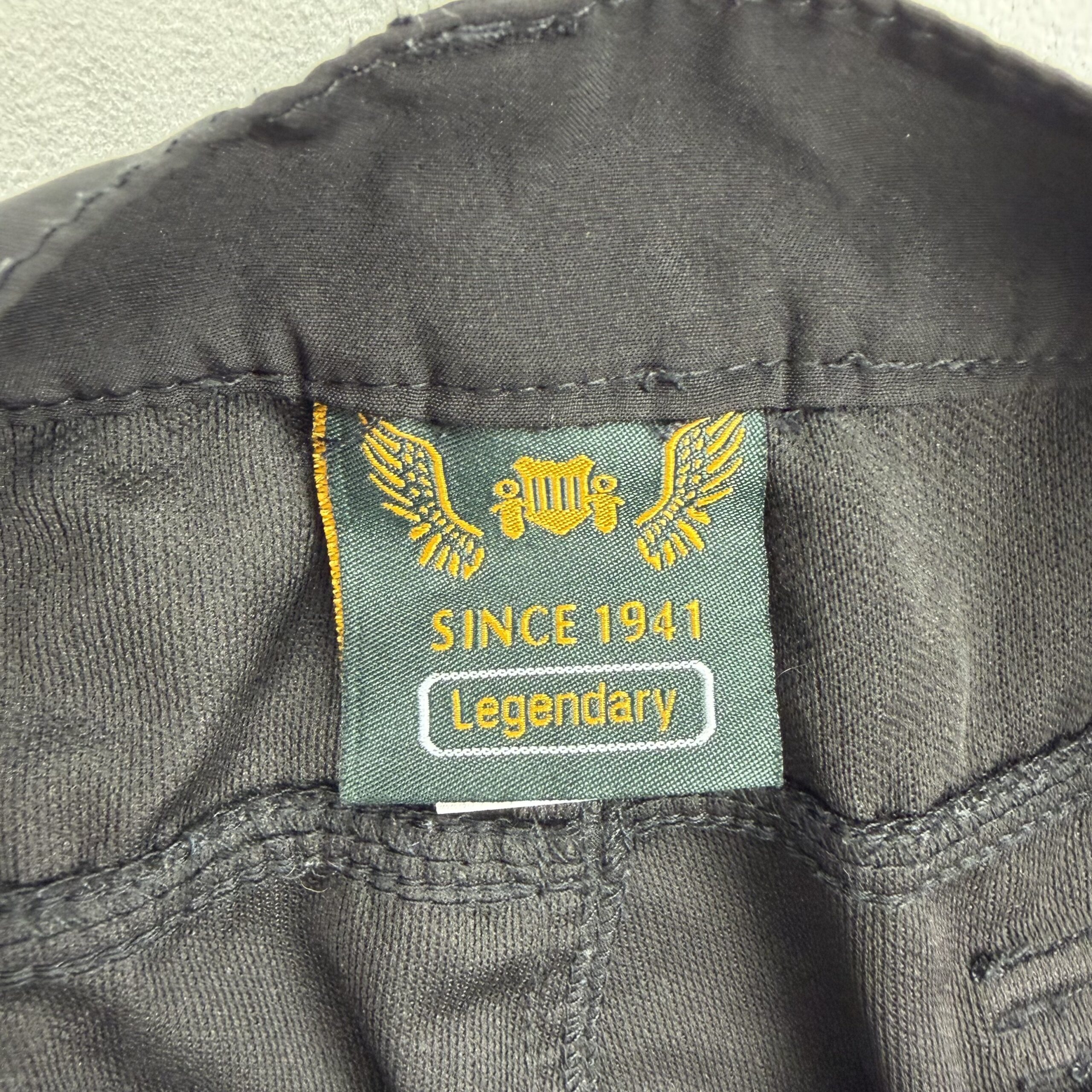 Legendary women’s black cargo joggers in size L. Track-style tapered fit with elasticized back waist, belt loops, button-and-zip fly, front hand pockets and cargo flap pockets for extra storage. Subtle embroidered logo at the hip. Fabric content not labeled.