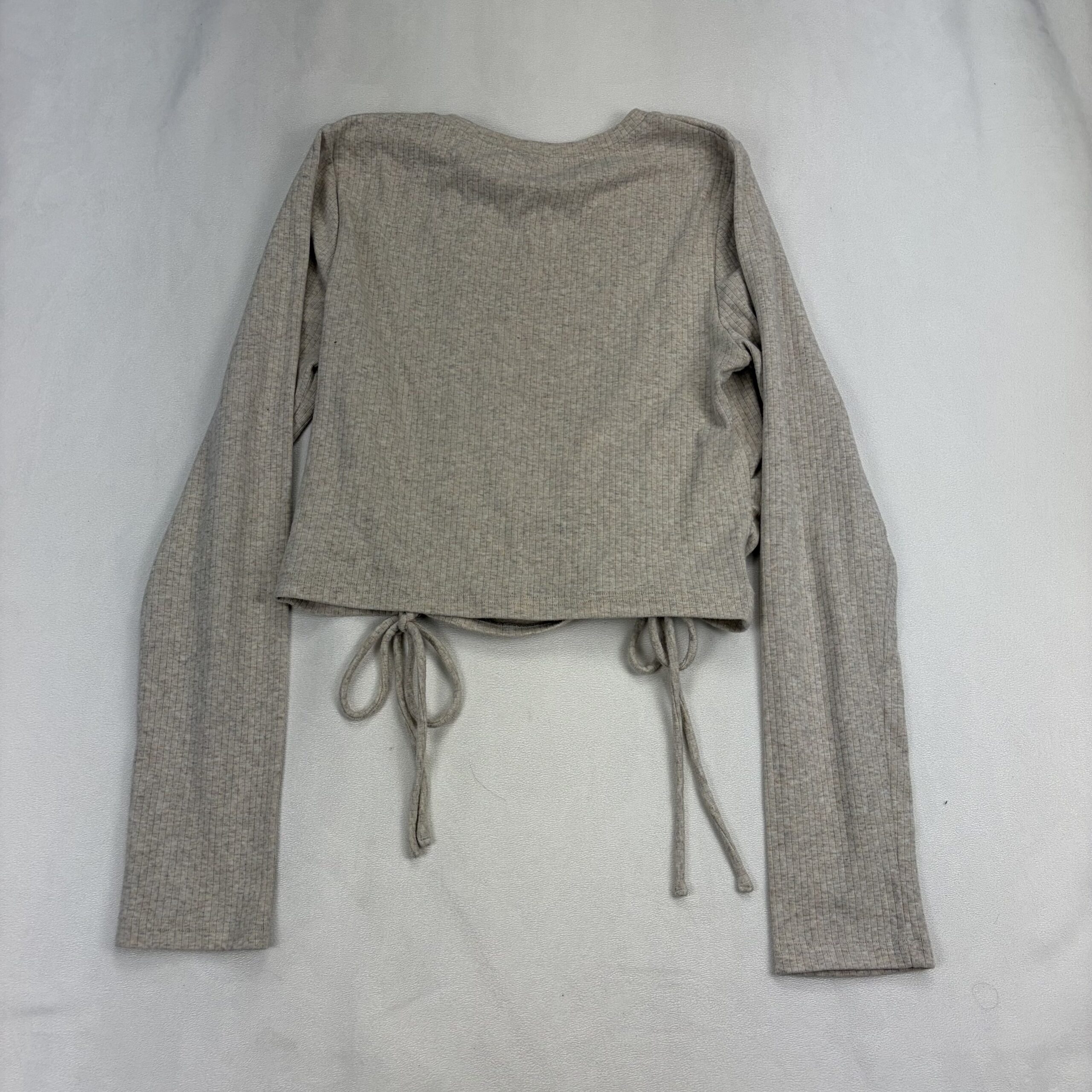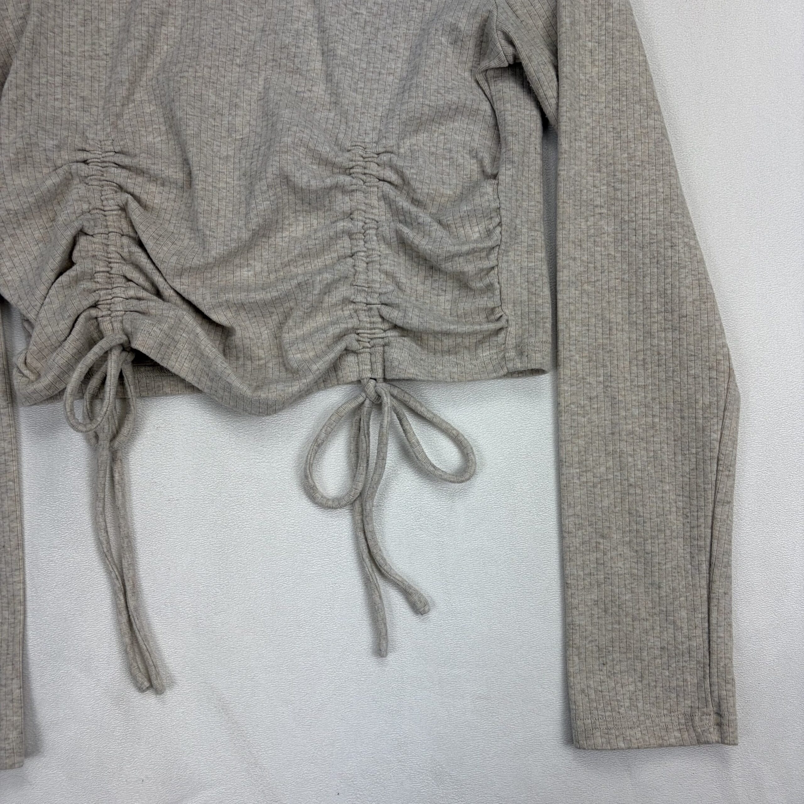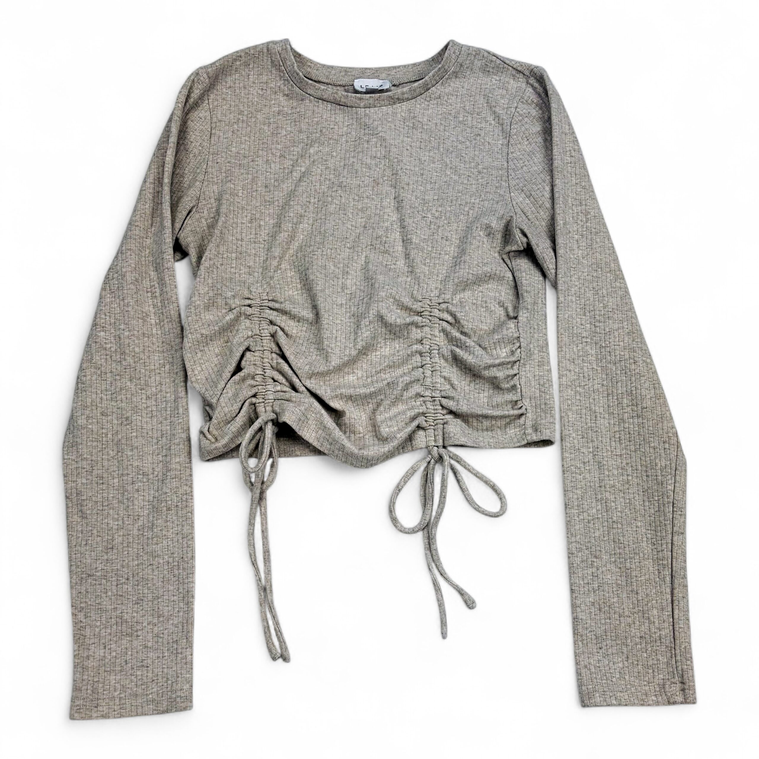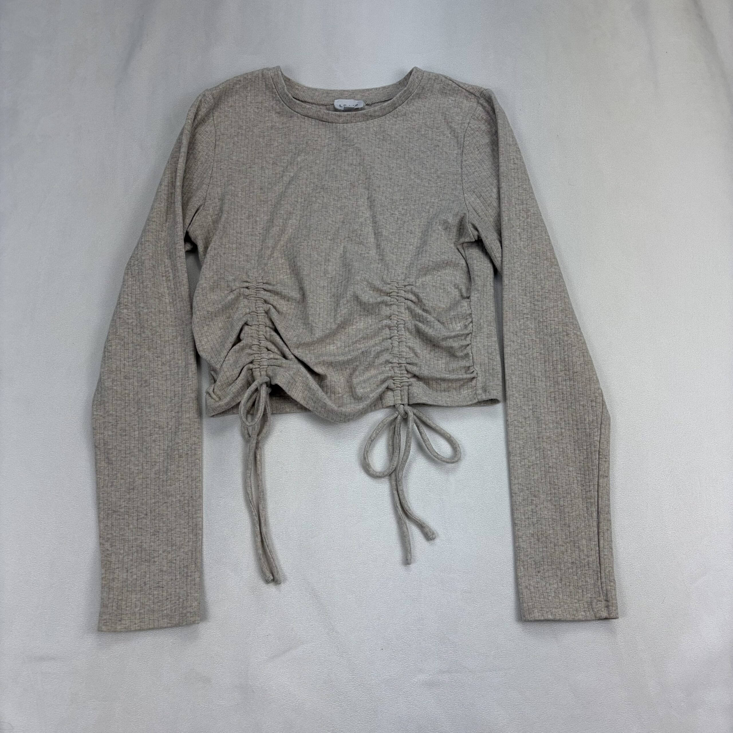 Light heather taupe ribbed knit long sleeve cropped top by Lelis. Features a crew neckline, full-length sleeves, and adjustable ruched drawstring detail at the front for a flattering gathered look and tied bows. Casual, soft-stretch feel — great for layering or pairing with high-waisted jeans or skirts. Size: L (standard).
