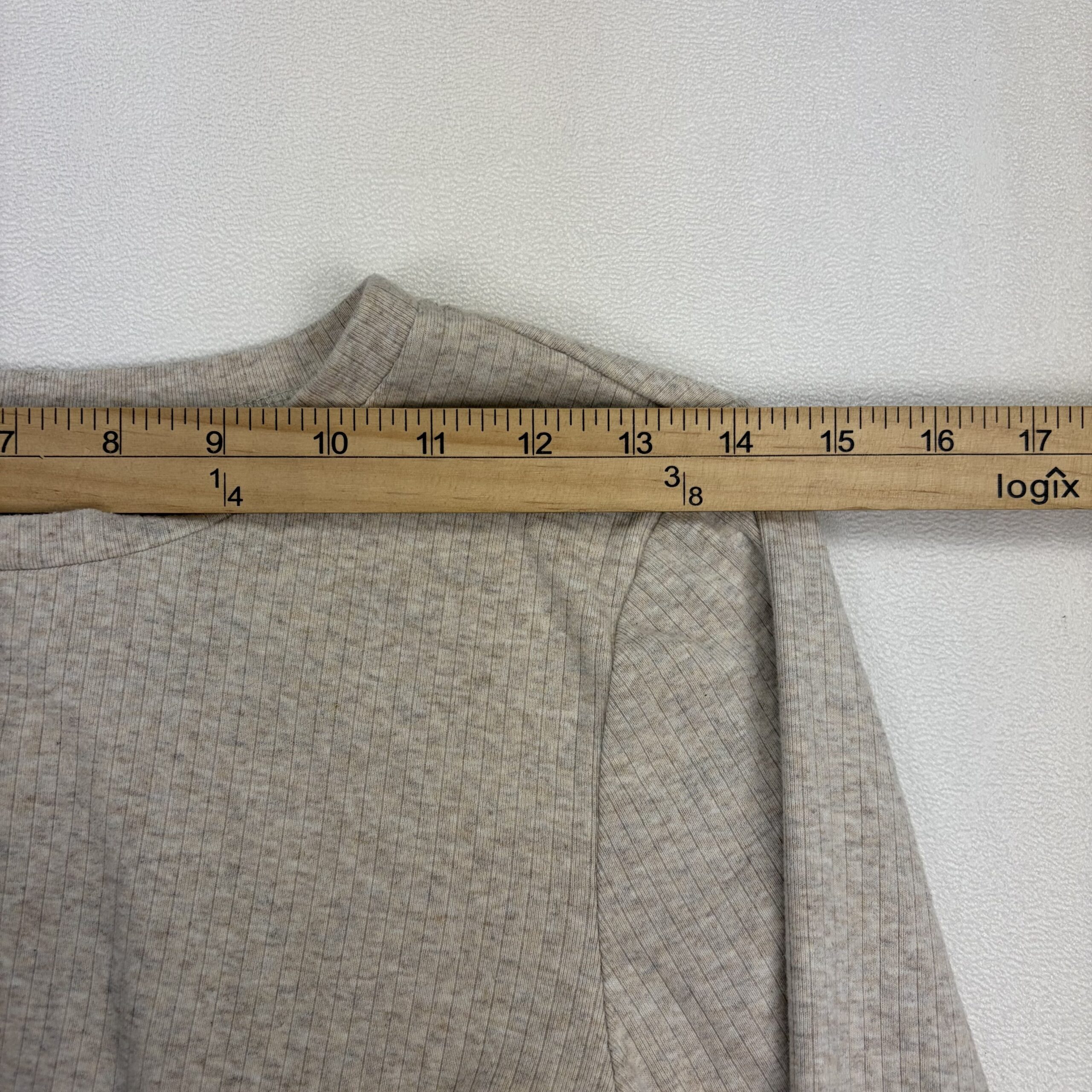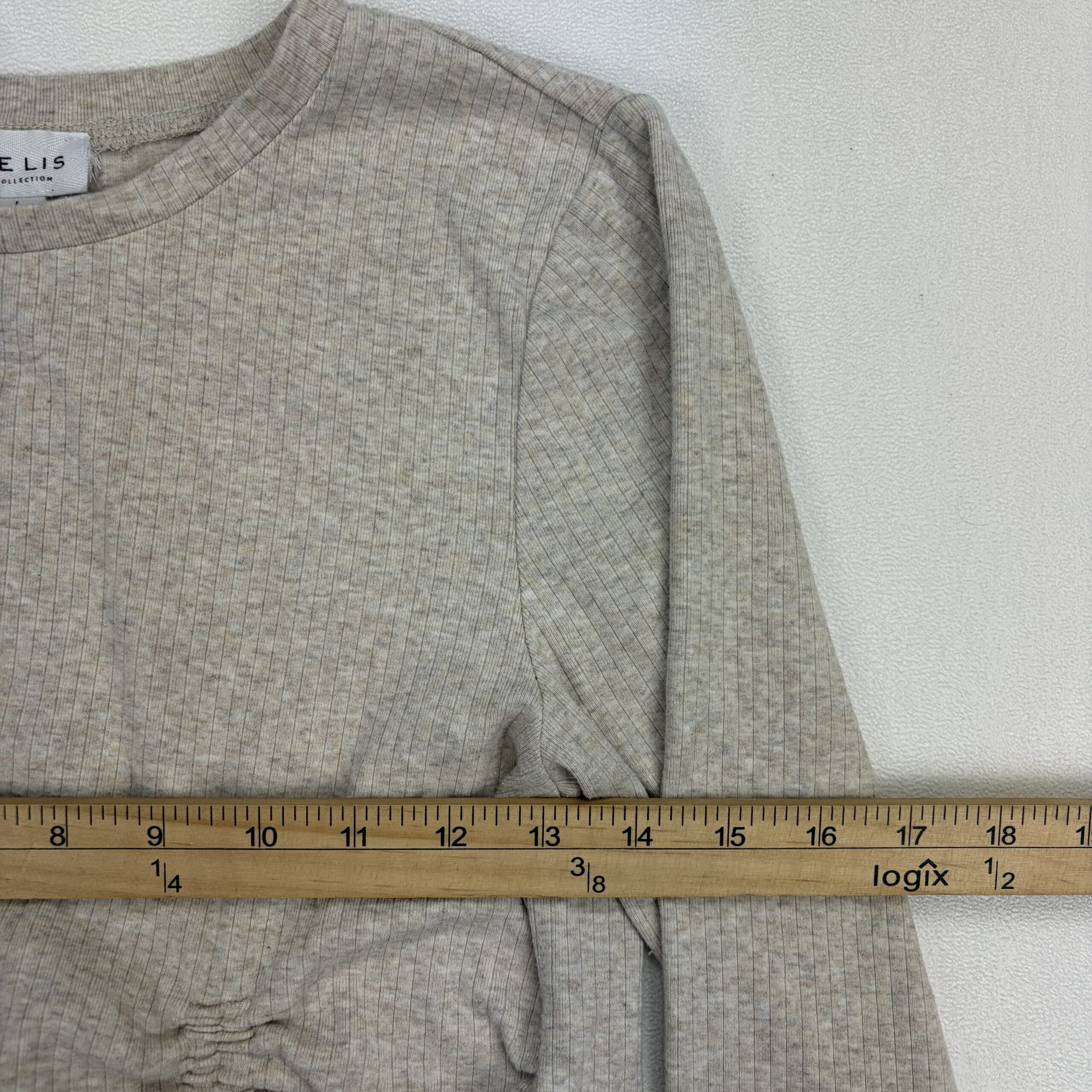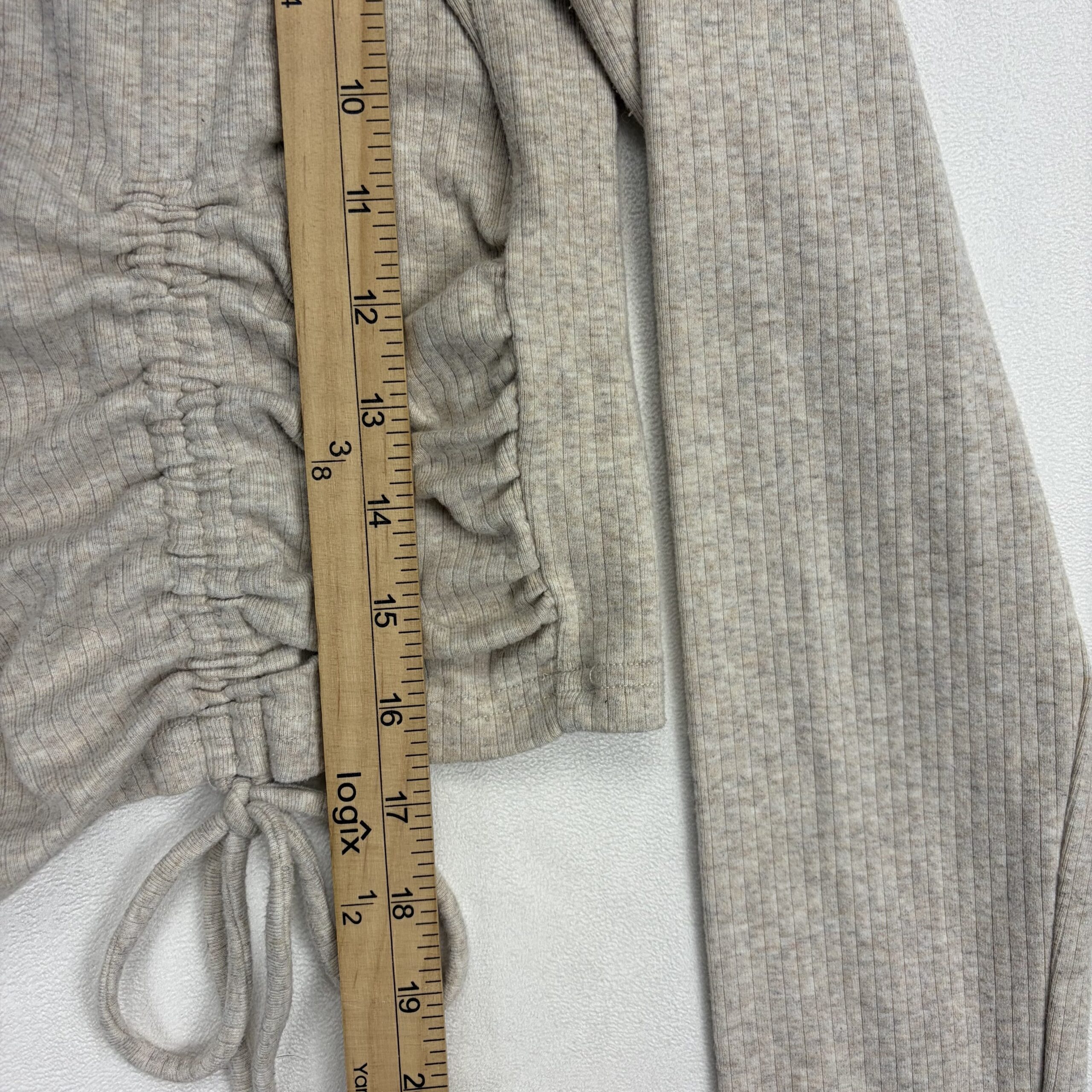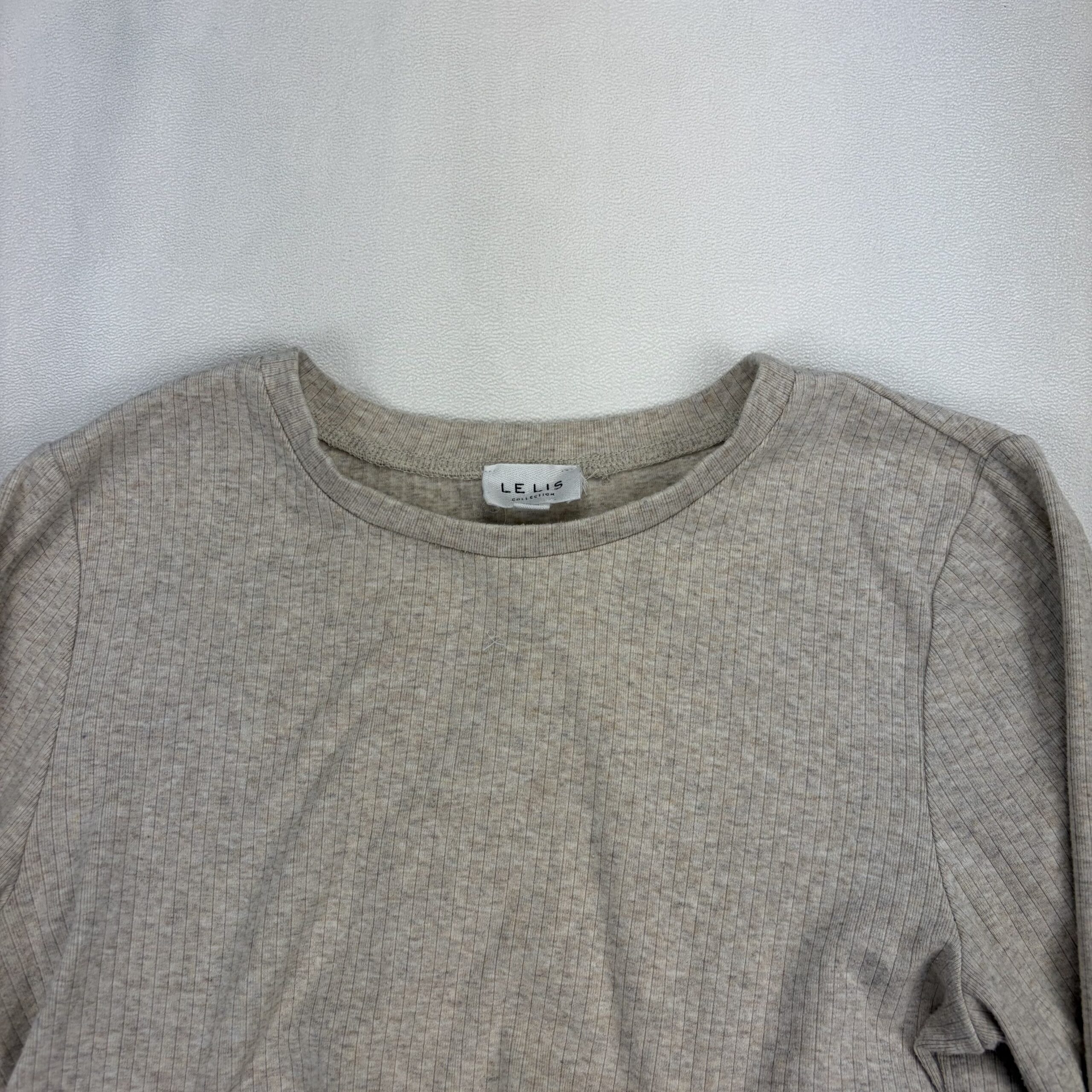 Light heather taupe ribbed knit long sleeve cropped top by Lelis. Features a crew neckline, full-length sleeves, and adjustable ruched drawstring detail at the front for a flattering gathered look and tied bows. Casual, soft-stretch feel — great for layering or pairing with high-waisted jeans or skirts. Size: L (standard).