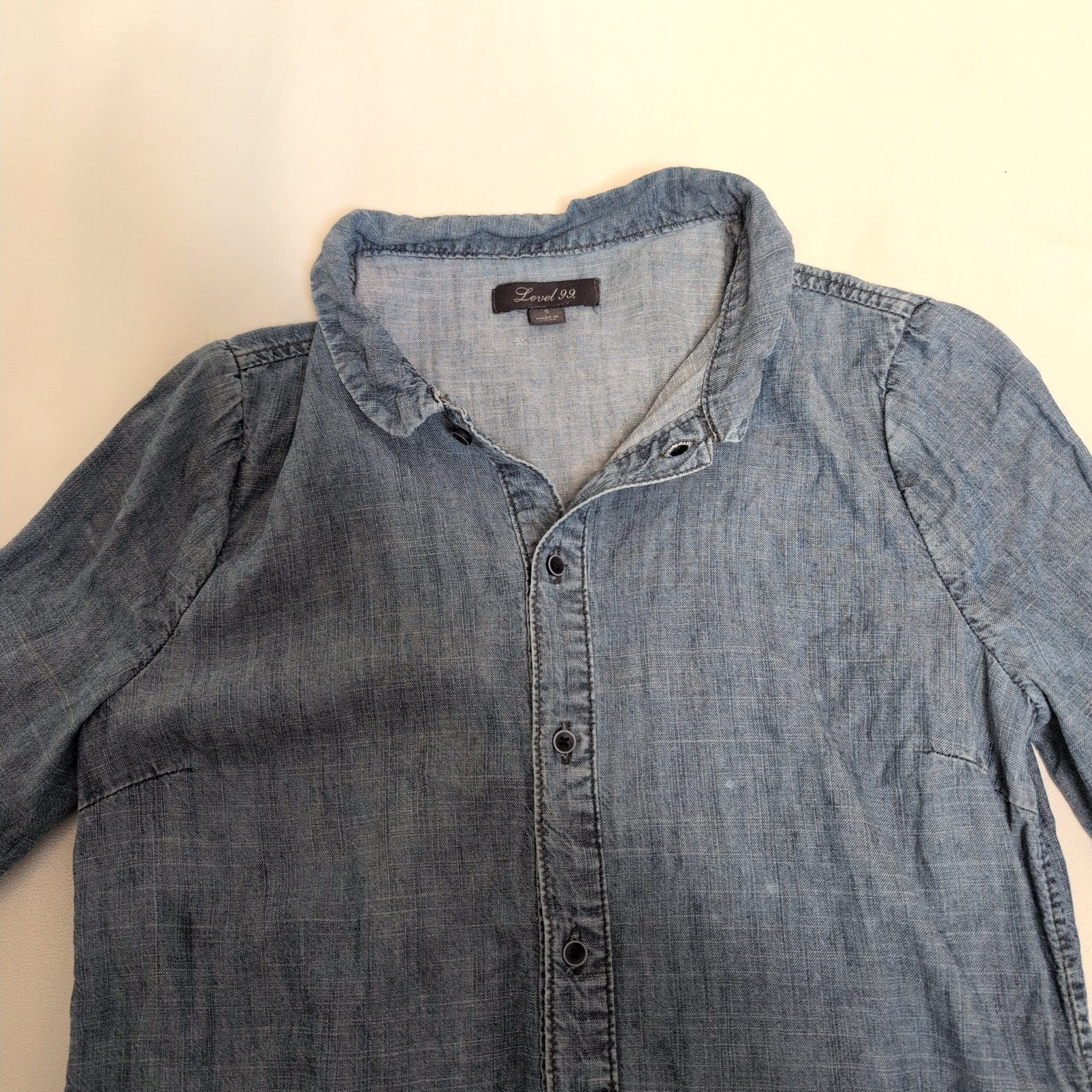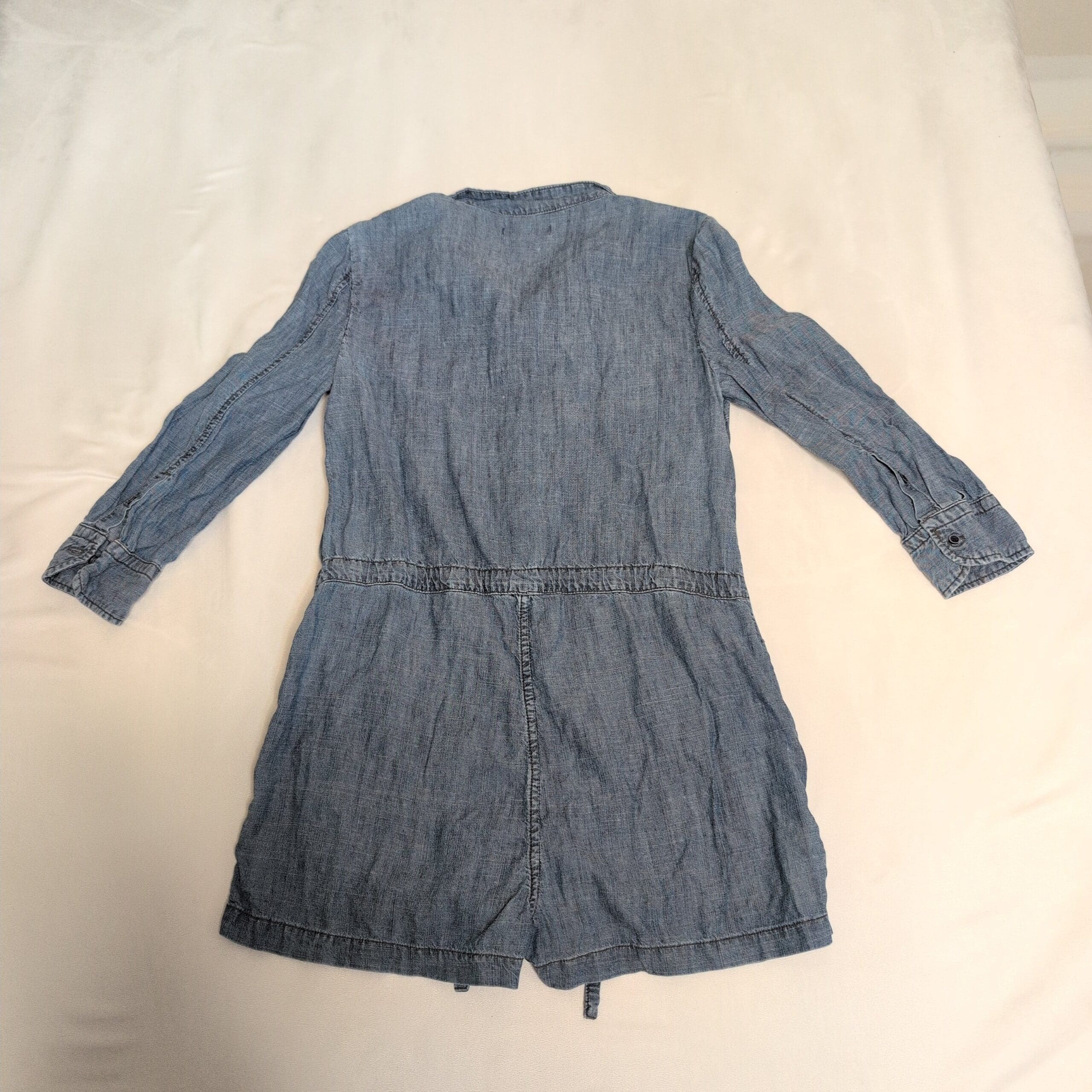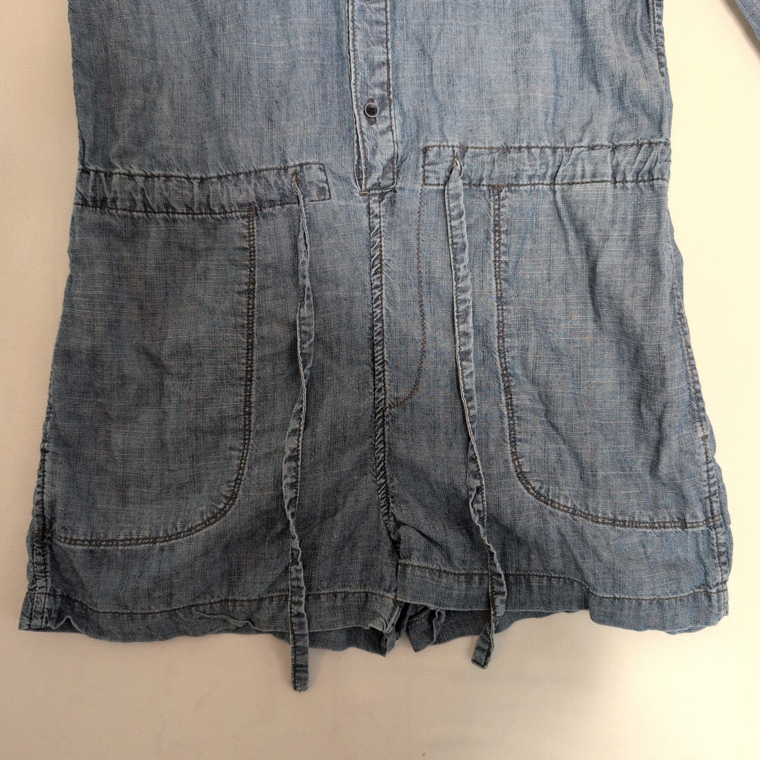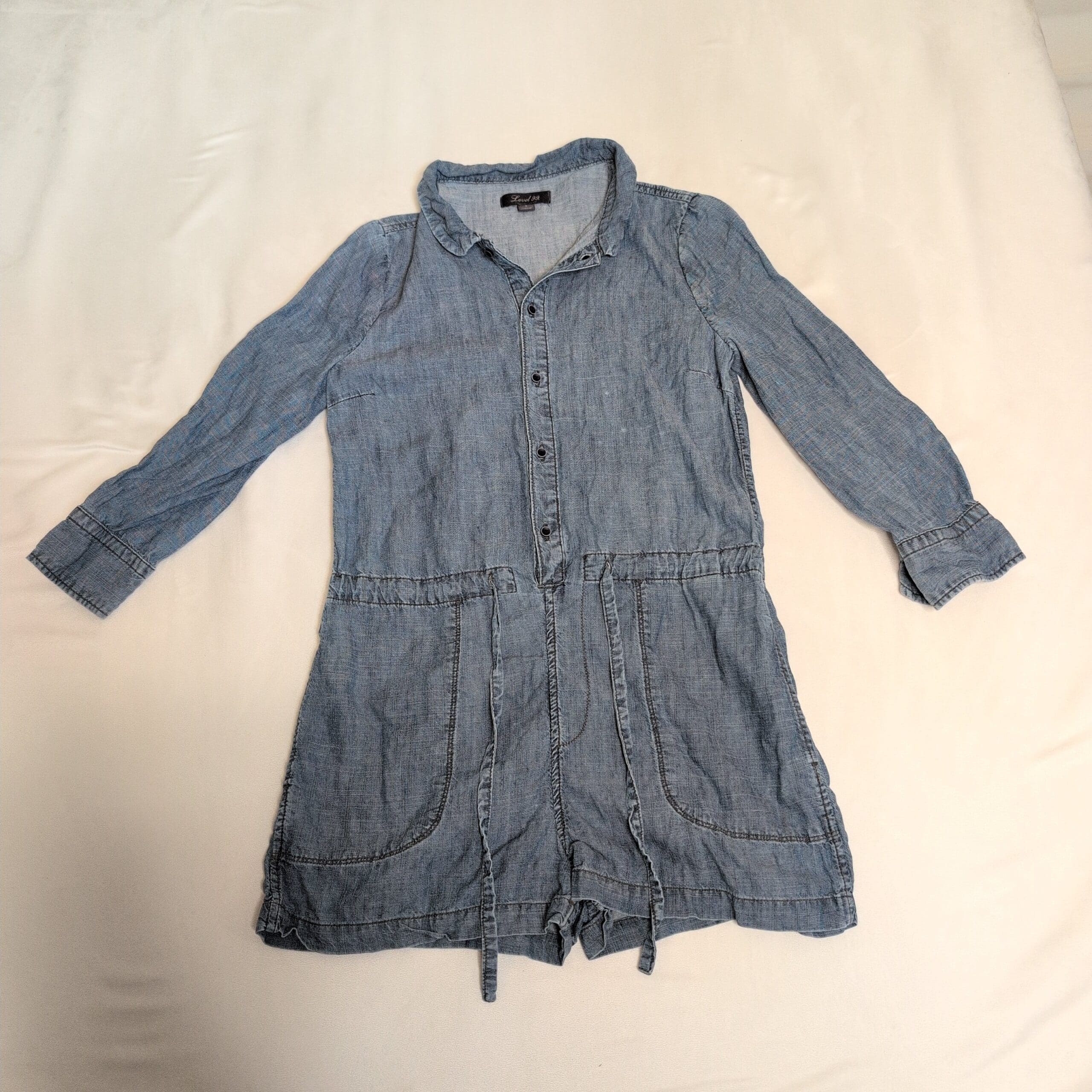 Lightweight chambray Level 99 button-front shirt dress/romper in size S. Features a classic collar, long sleeves with cuffs, front patch pockets, drawstring waist for adjustable fit, and a relaxed, easy silhouette—great for casual everyday wear or layered looks. Soft, broken-in denim feel.