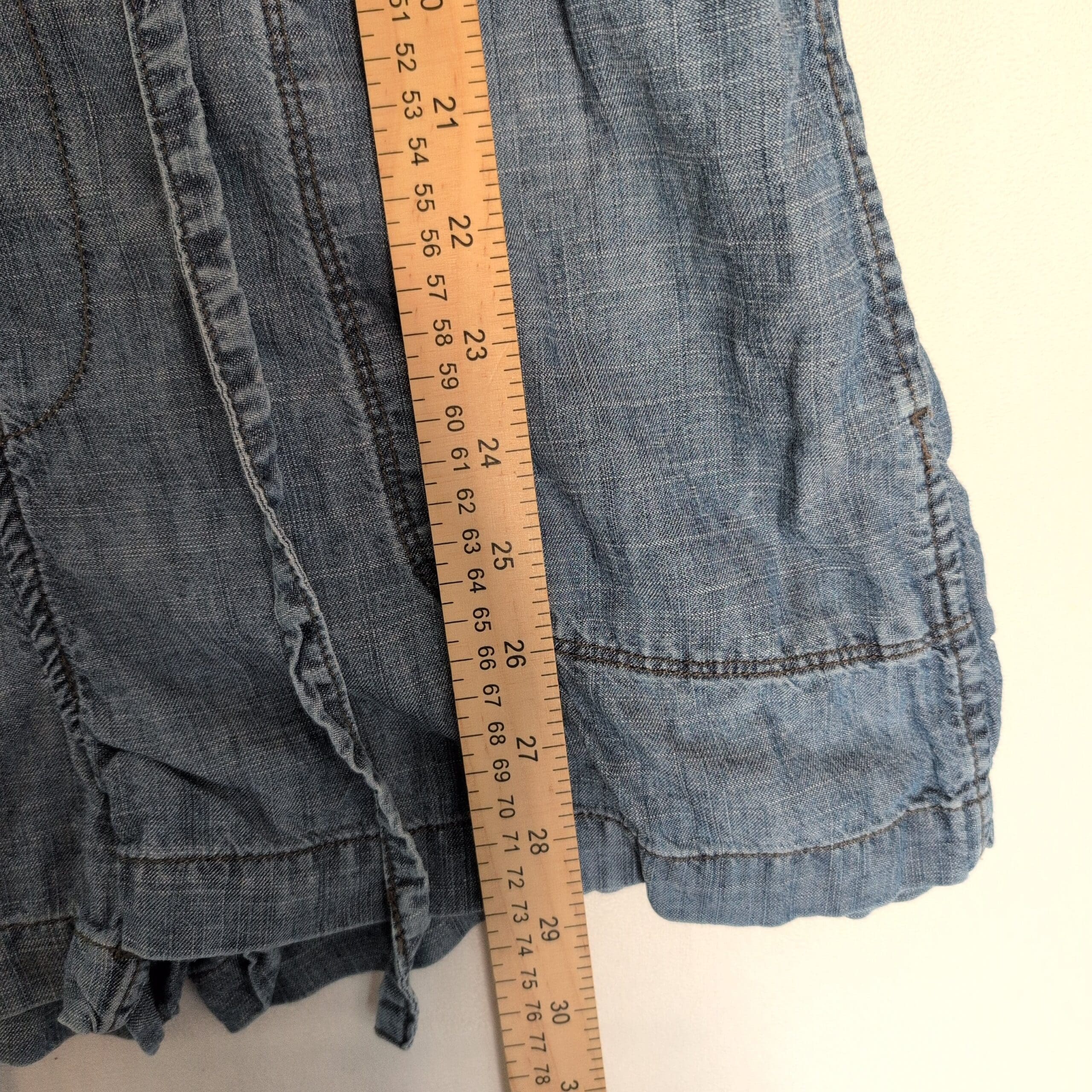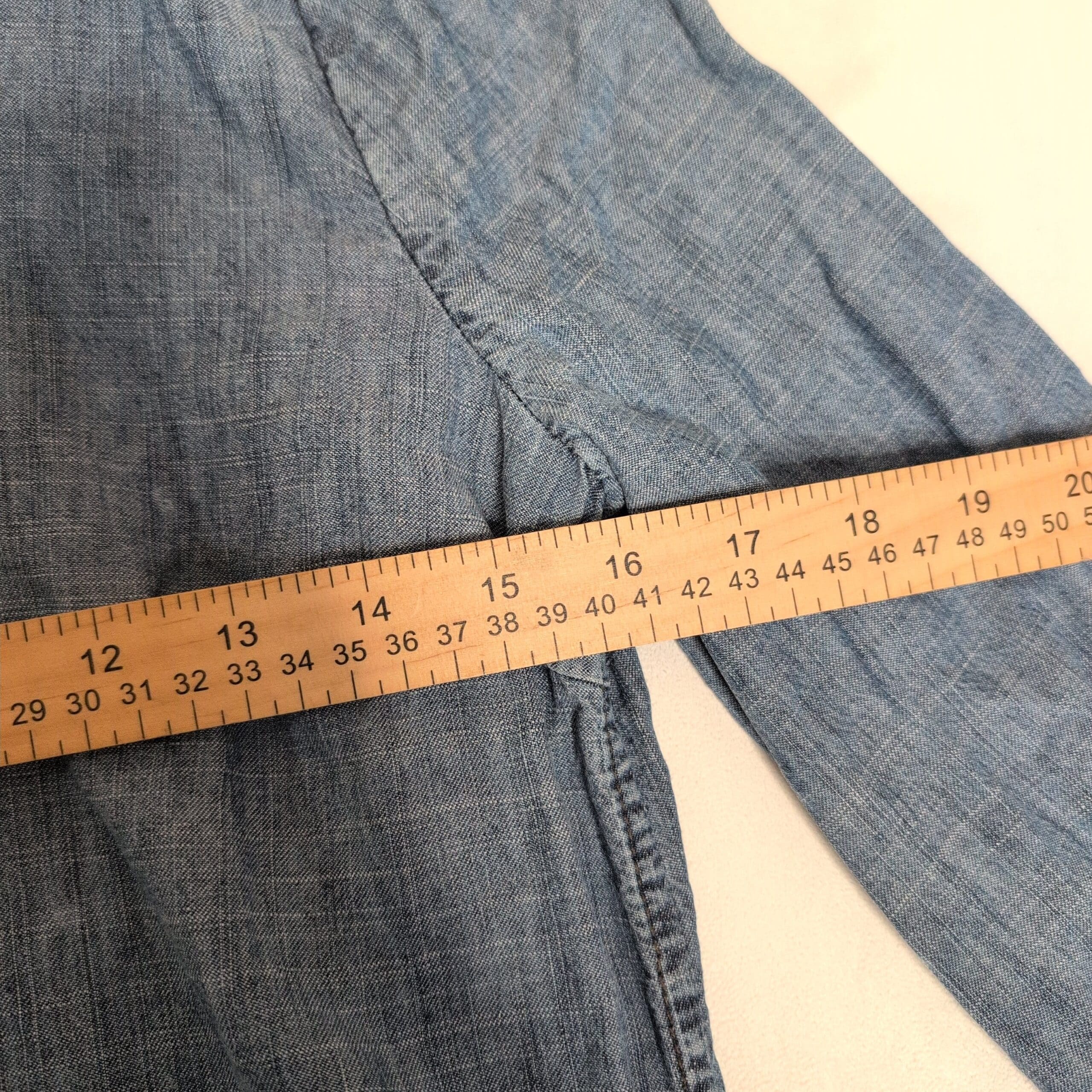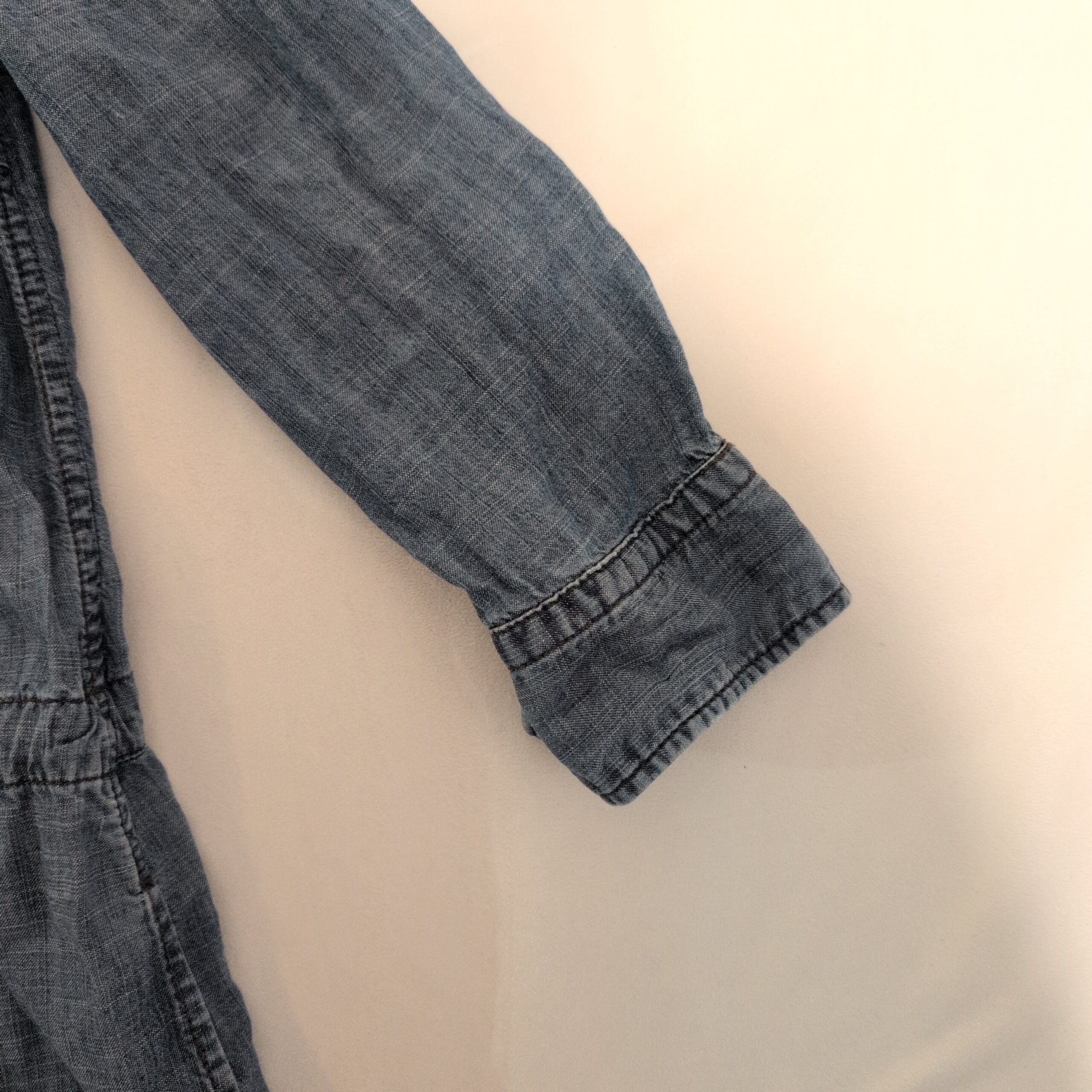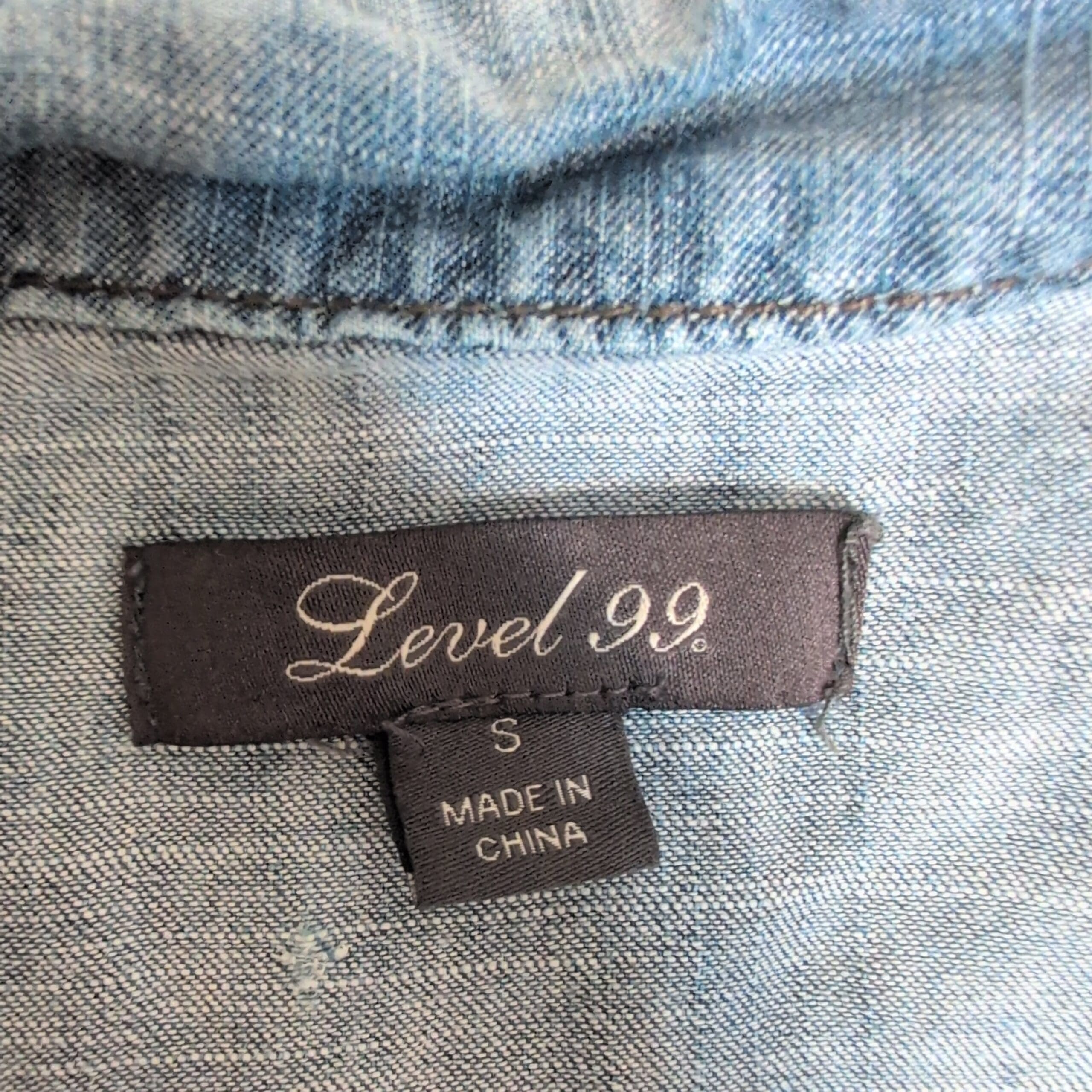 Lightweight chambray Level 99 button-front shirt dress/romper in size S. Features a classic collar, long sleeves with cuffs, front patch pockets, drawstring waist for adjustable fit, and a relaxed, easy silhouette—great for casual everyday wear or layered looks. Soft, broken-in denim feel.