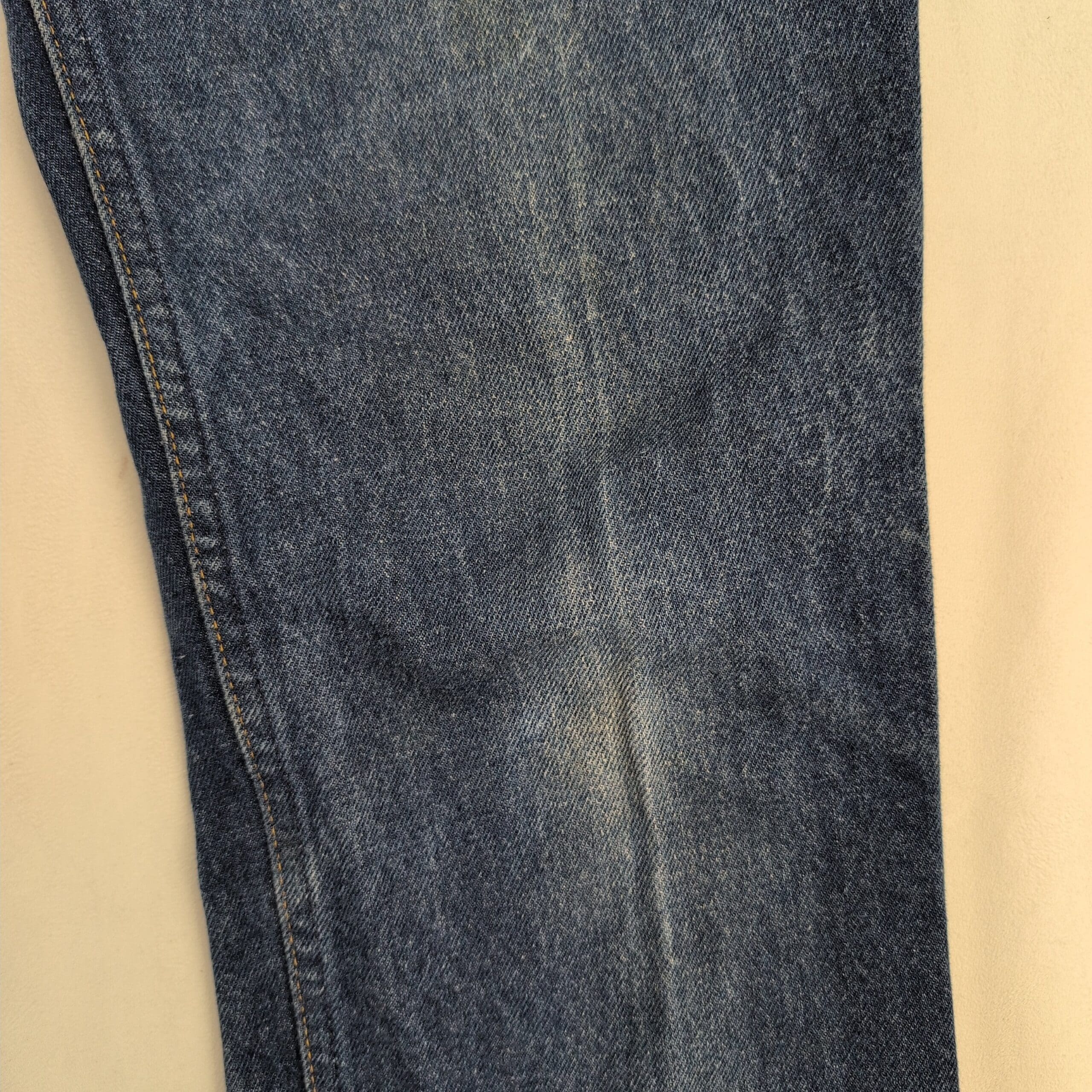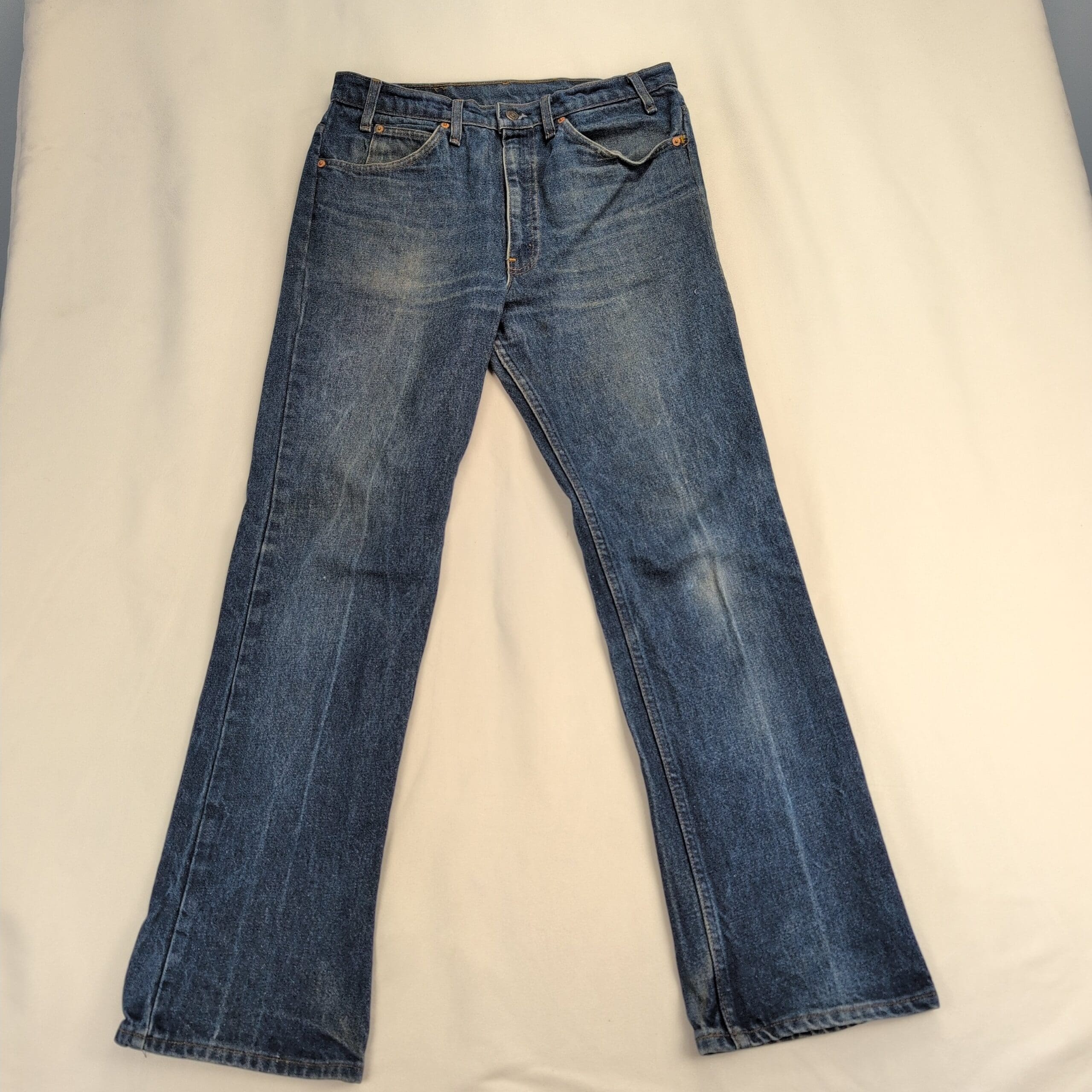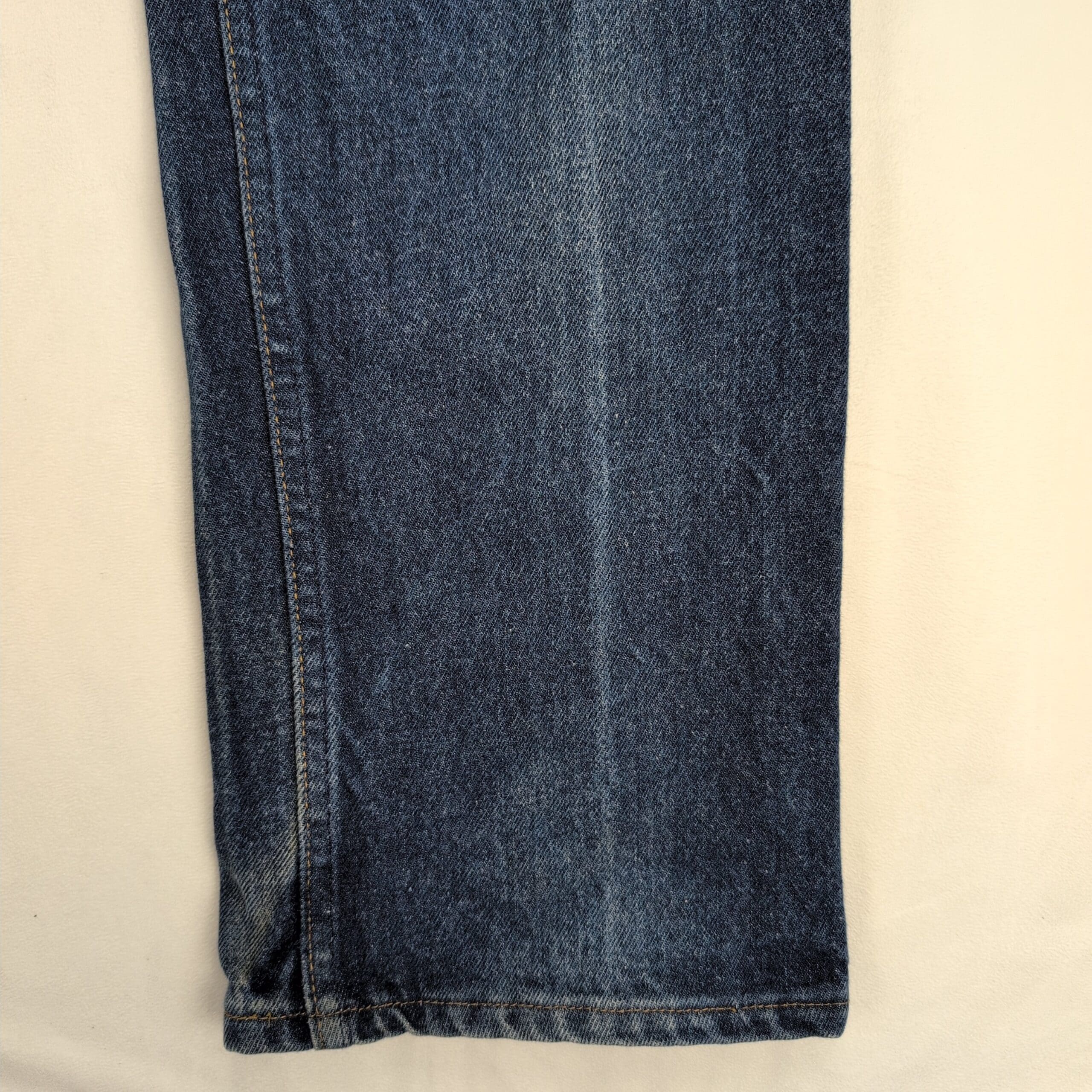 Levi’s men’s slim straight jeans in classic medium blue denim. Size: Waist 34 (standard). Slim-straight cut offers a clean, tailored look through the thigh with a straight leg. Good pre-owned condition — two small faint stains on the front that are most noticeable under bright studio lighting (see photos). Otherwise free of major rips, tears, or odors; typical wear and natural fading consistent with regular use.