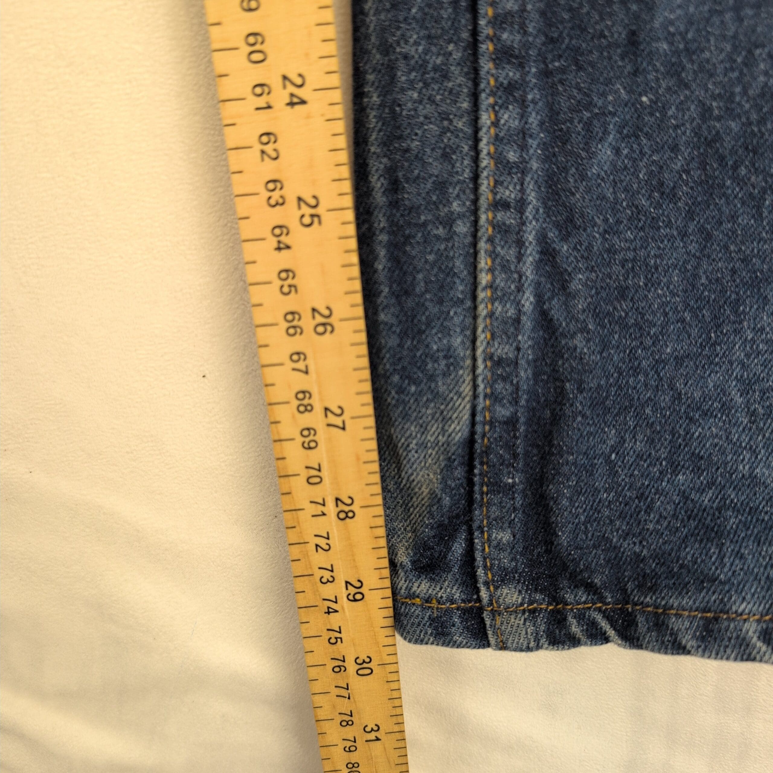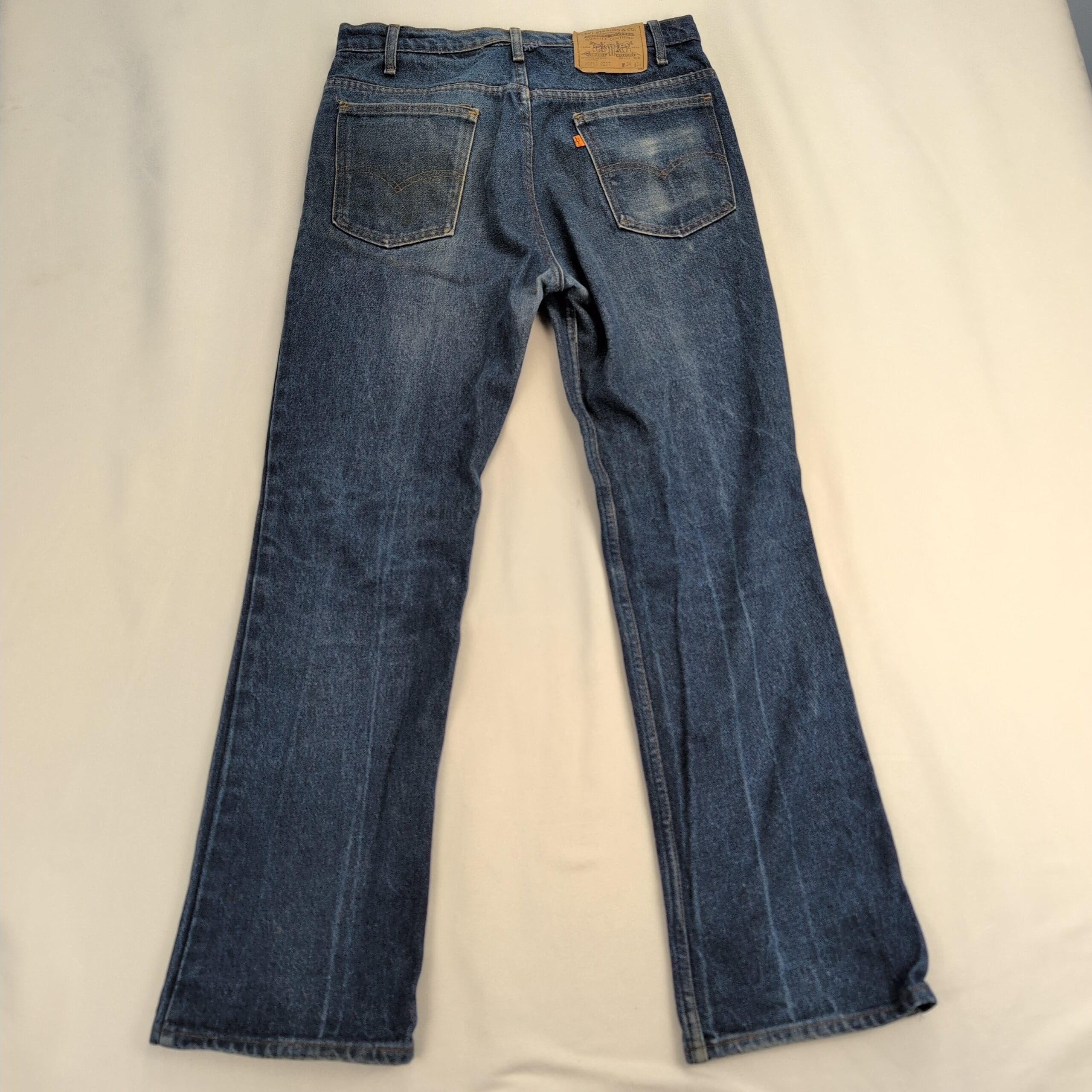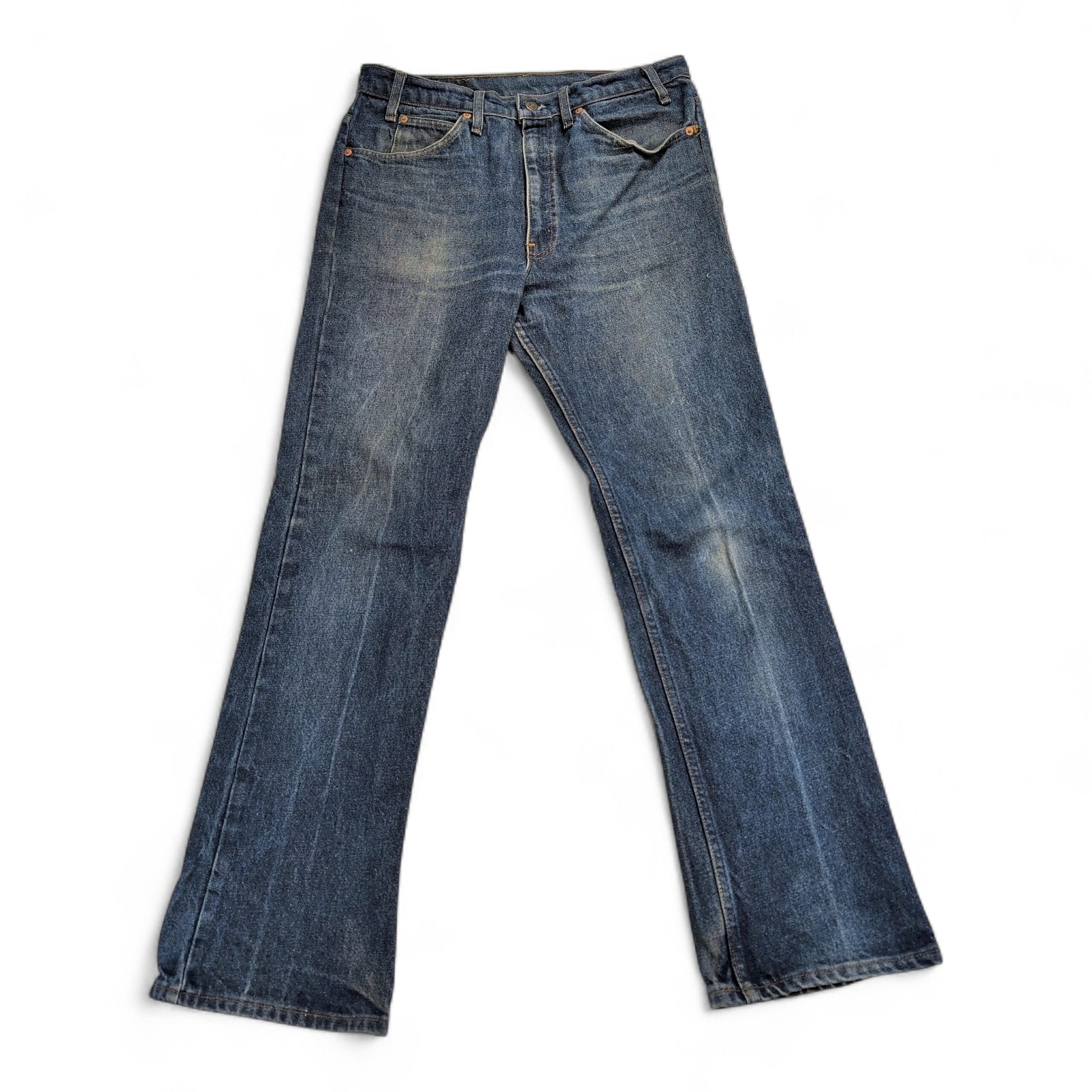Levi’s men’s slim straight jeans in classic medium blue denim. Size: Waist 34 (standard). Slim-straight cut offers a clean, tailored look through the thigh with a straight leg. Good pre-owned condition — two small faint stains on the front that are most noticeable under bright studio lighting (see photos). Otherwise free of major rips, tears, or odors; typical wear and natural fading consistent with regular use.