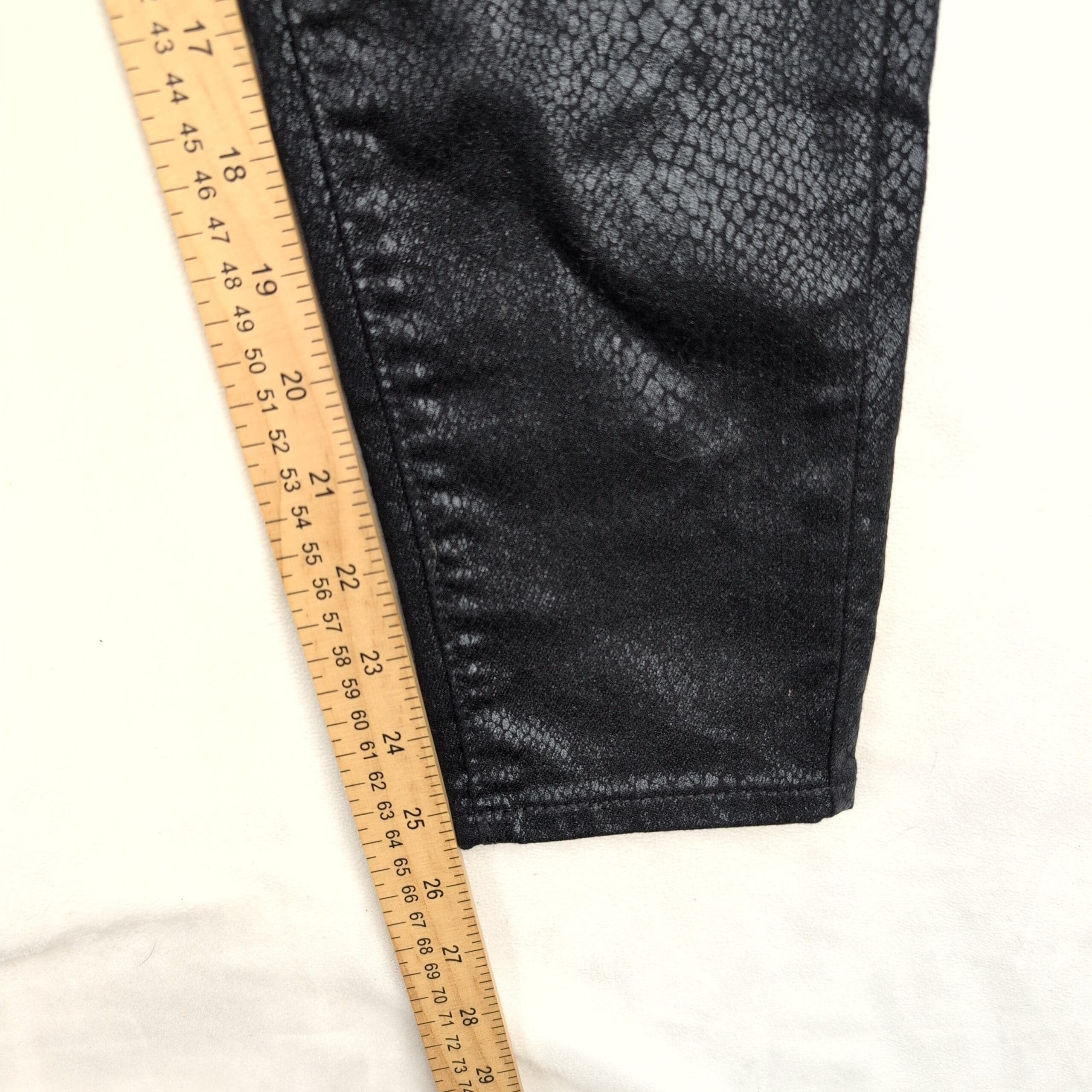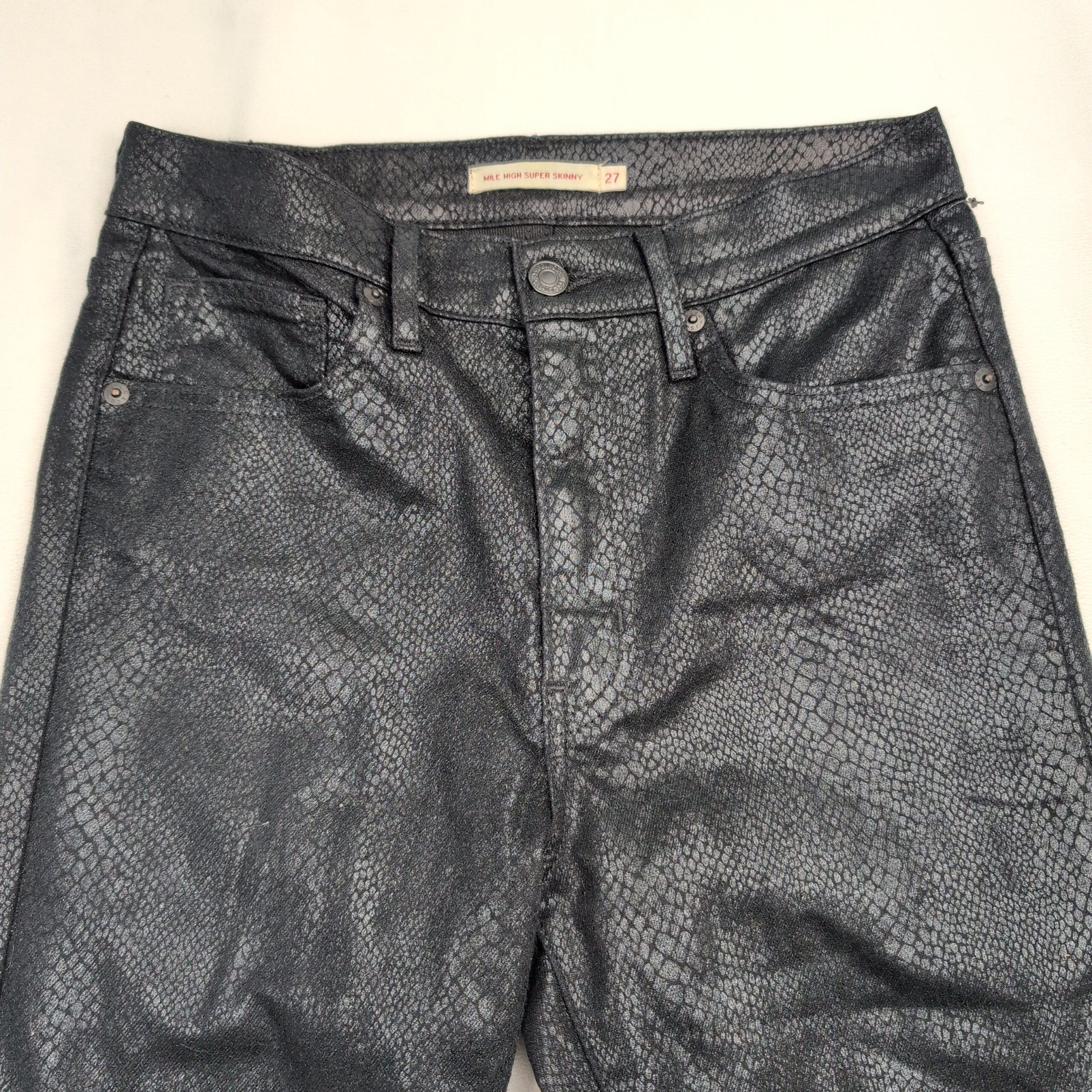 Excellent used condition Levi’s Mile High Super Skinny jeans in size 27. High-rise, super-skinny silhouette with a subtle black snake-skin pattern and coated finish for a textured, modern look. Five-pocket styling, belt loops, and zip-fly with button closure. Style name: Mile High Super Skinny. Free of major rips, tears, stains, or flaws; typical light wear/crease consistent with pre-owned use.