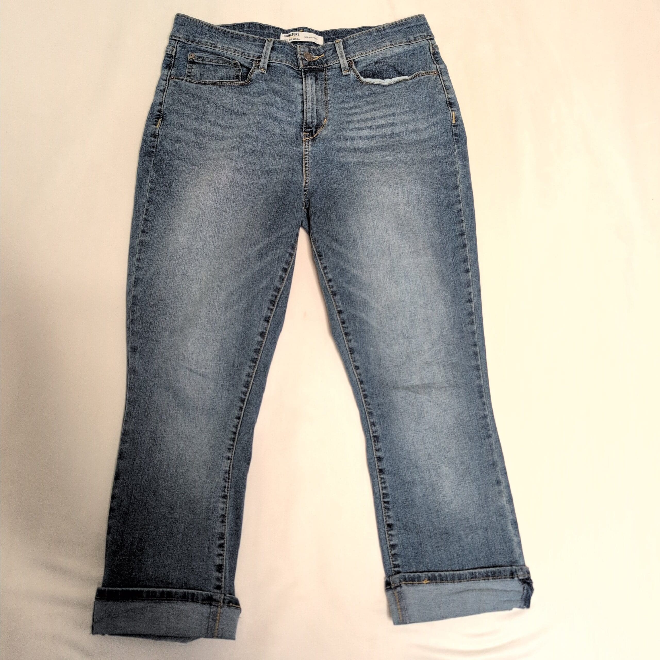 Levi’s mid-rise cropped capri jeans in classic blue denim — Size 10. Features a mid-rise waist, straight-to-tapered cropped leg and cuffed hem for a casual, versatile look. Gently used with light, even fading consistent with normal wear; no holes, stains, or major defects observed. Great for everyday wear and warm-weather outfits.