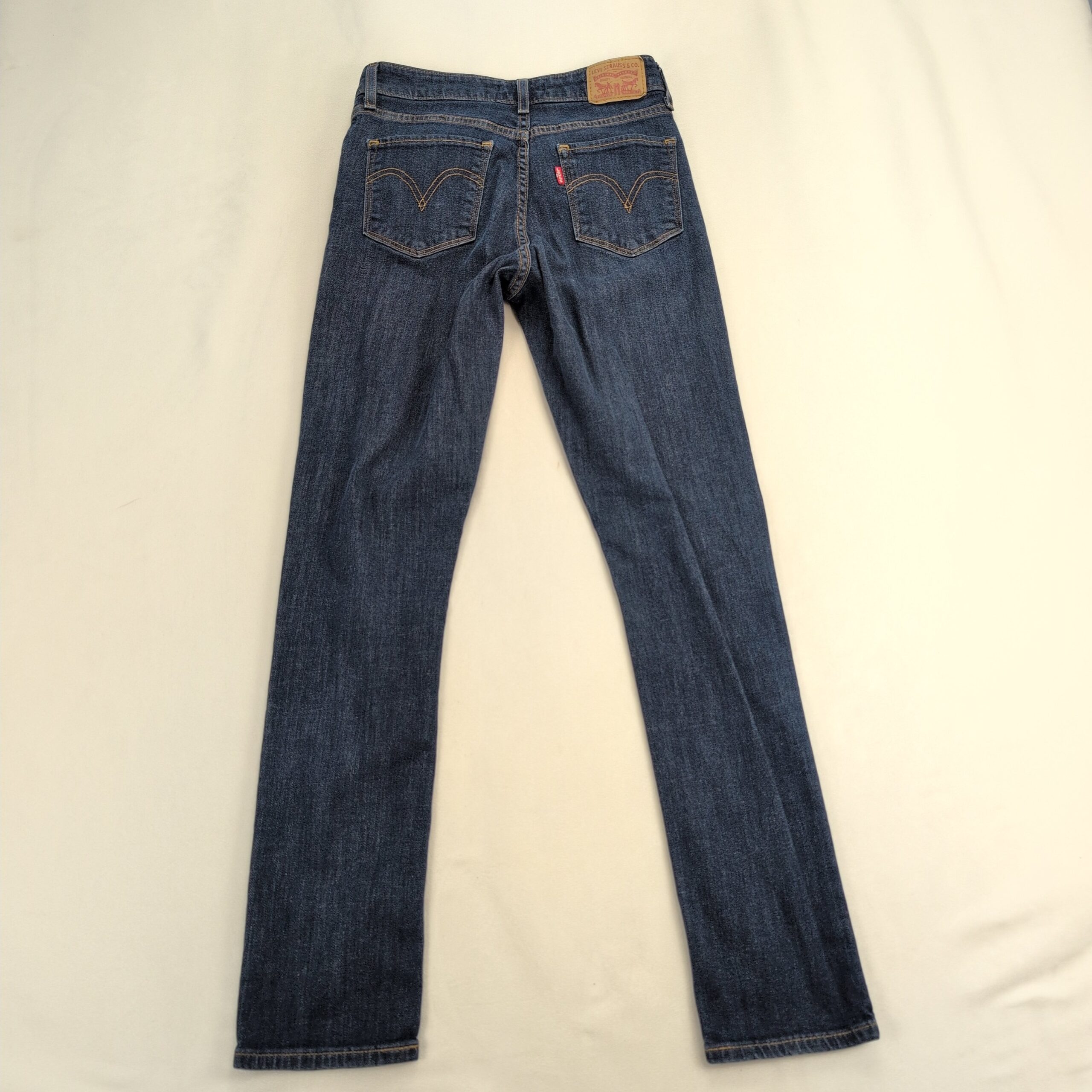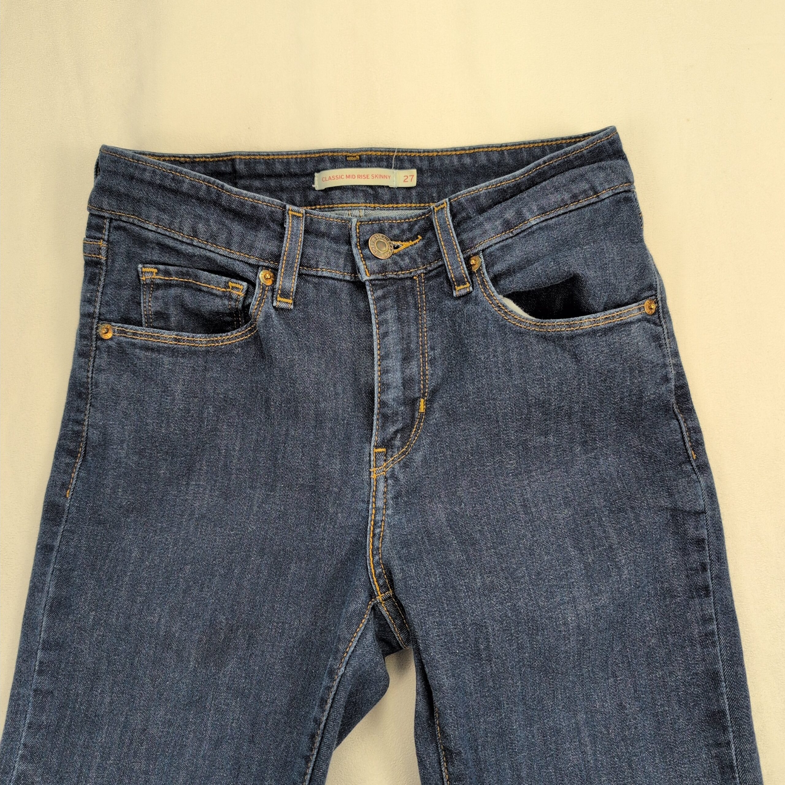 Levi’s women’s skinny jeans in a classic medium indigo wash. Slim, full-length silhouette with five-pocket styling, zip fly and button closure. Excellent used condition — free of major rips, tears, or stains; shows typical light wear and subtle fading consistent with normal use. Size: 27 (standard).