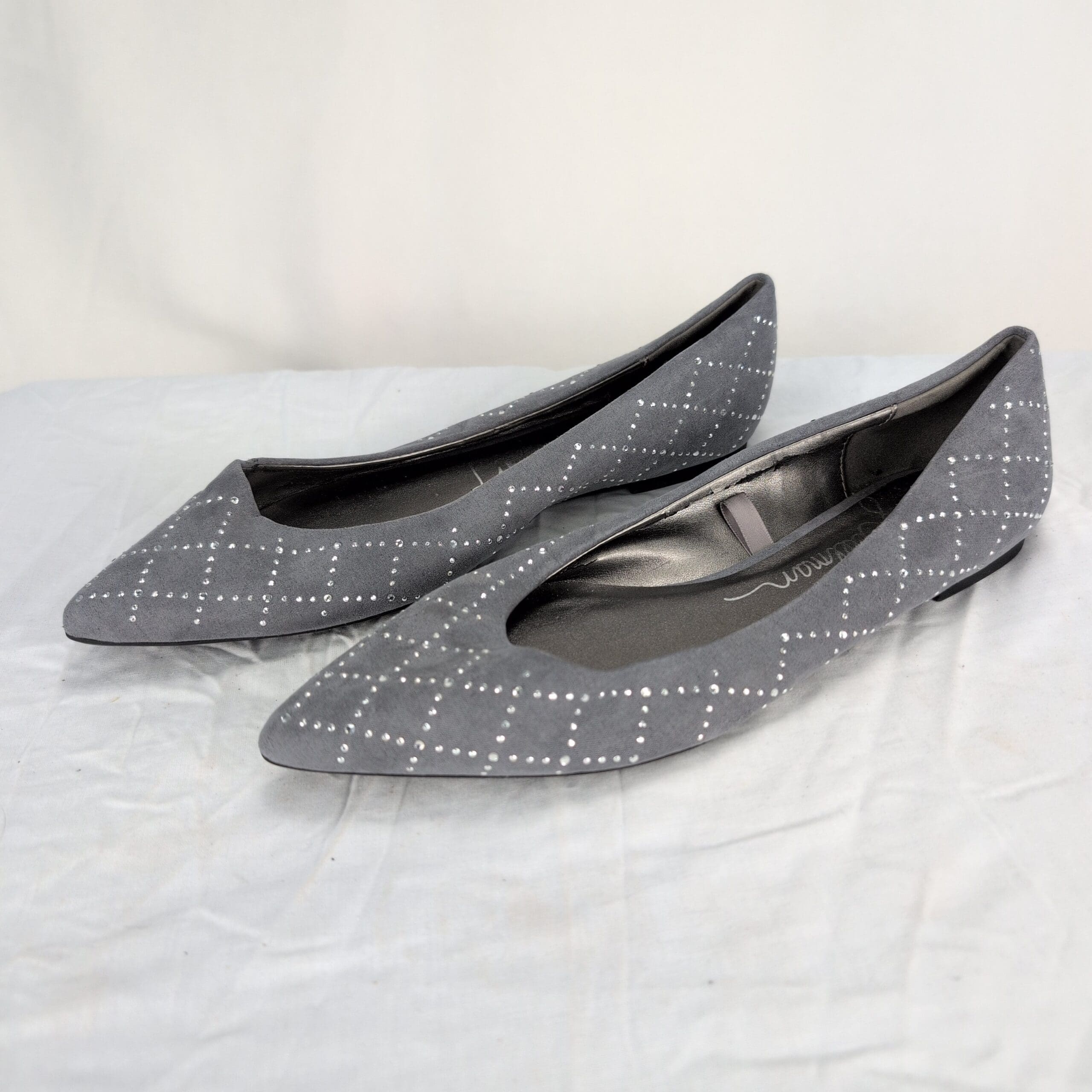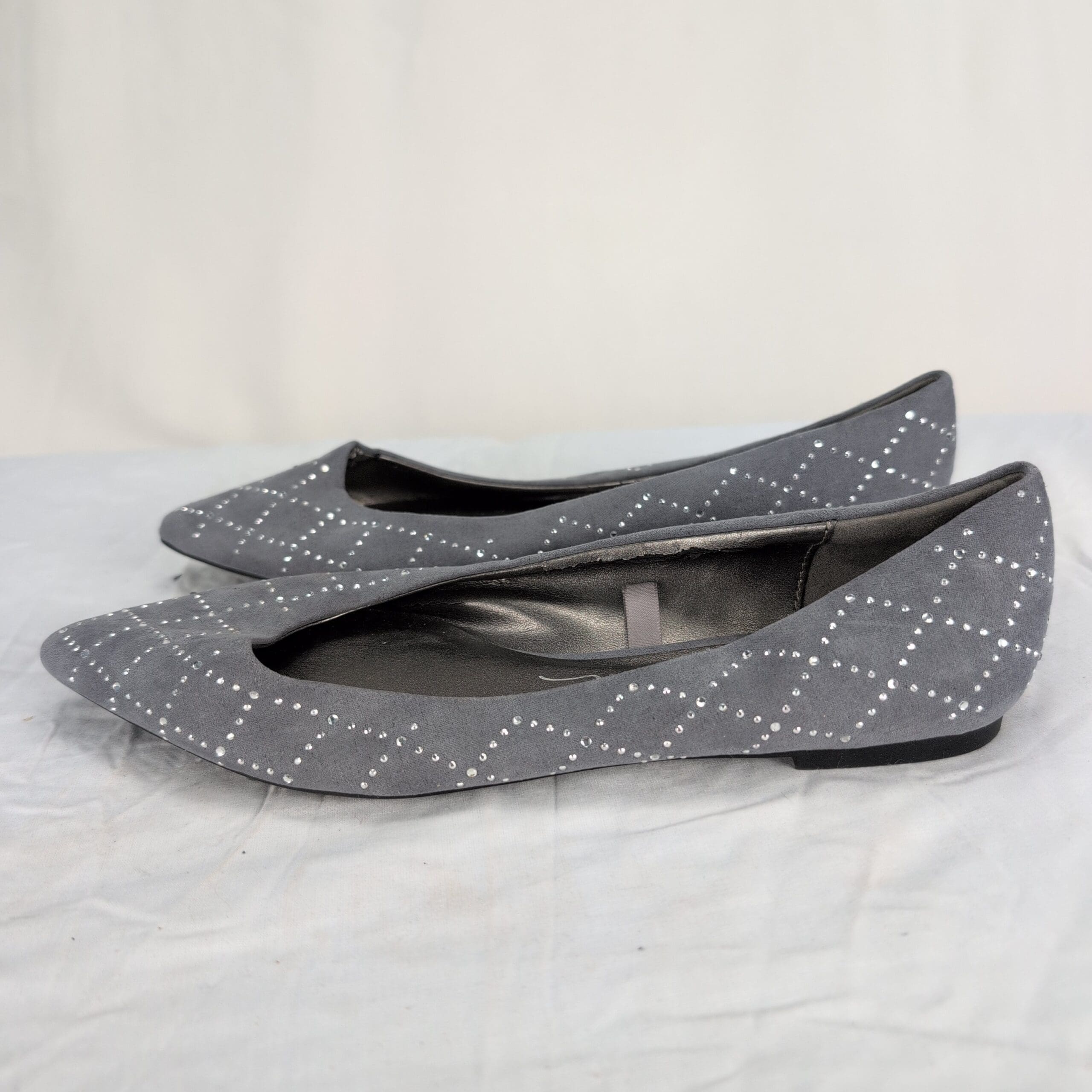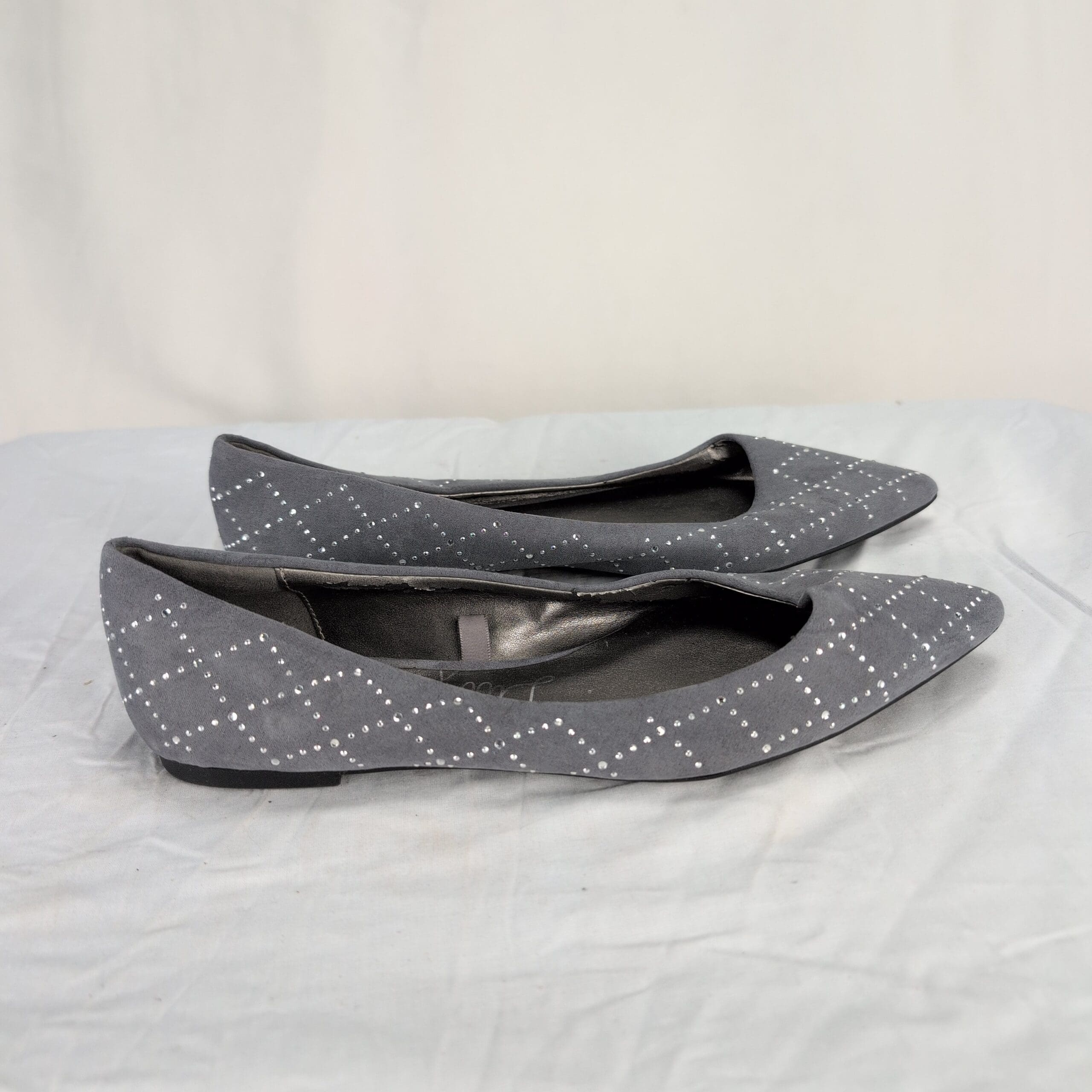 Libby Edelman women’s gray pointed-toe flats with cloth upper and silver-tone studded diamond pattern. Size 8 (US). Slip-on ballet/flat silhouette with a low-profile sole — a versatile pair for work or everyday wear.