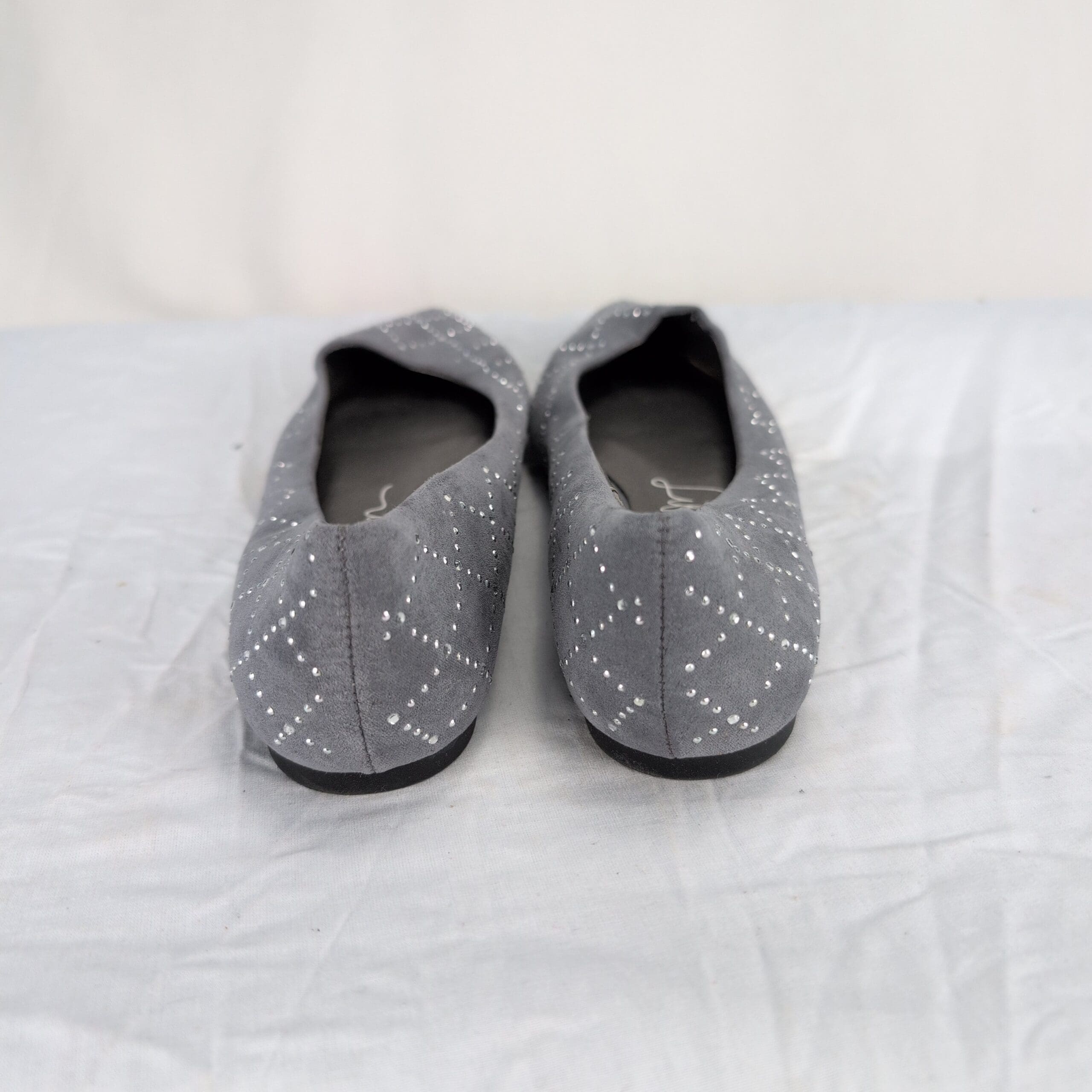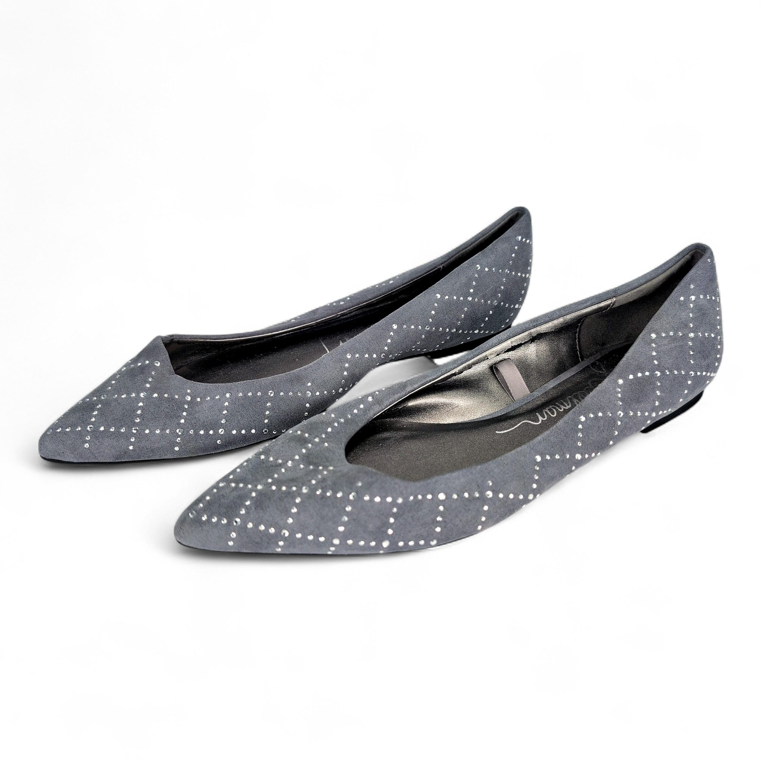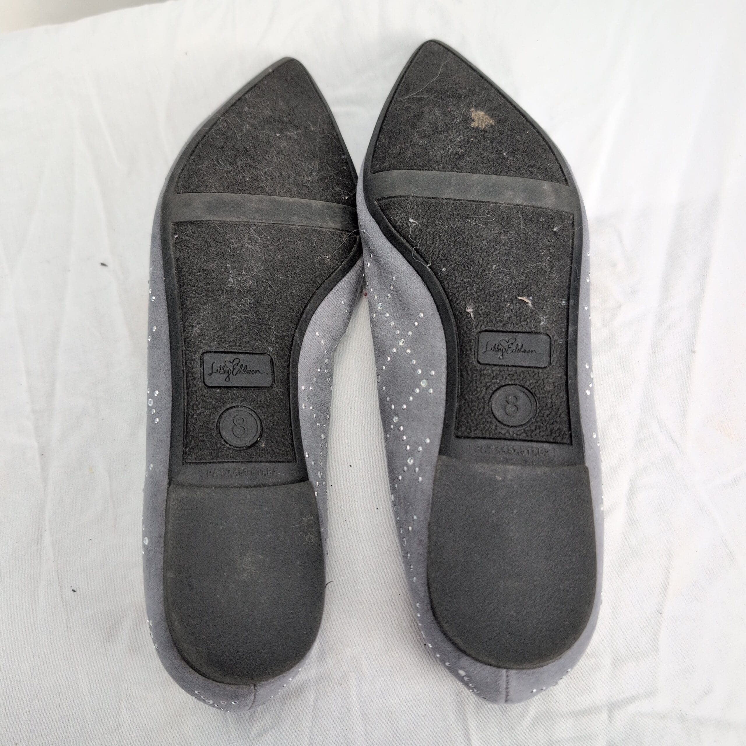 Libby Edelman women’s gray pointed-toe flats with cloth upper and silver-tone studded diamond pattern. Size 8 (US). Slip-on ballet/flat silhouette with a low-profile sole — a versatile pair for work or everyday wear.