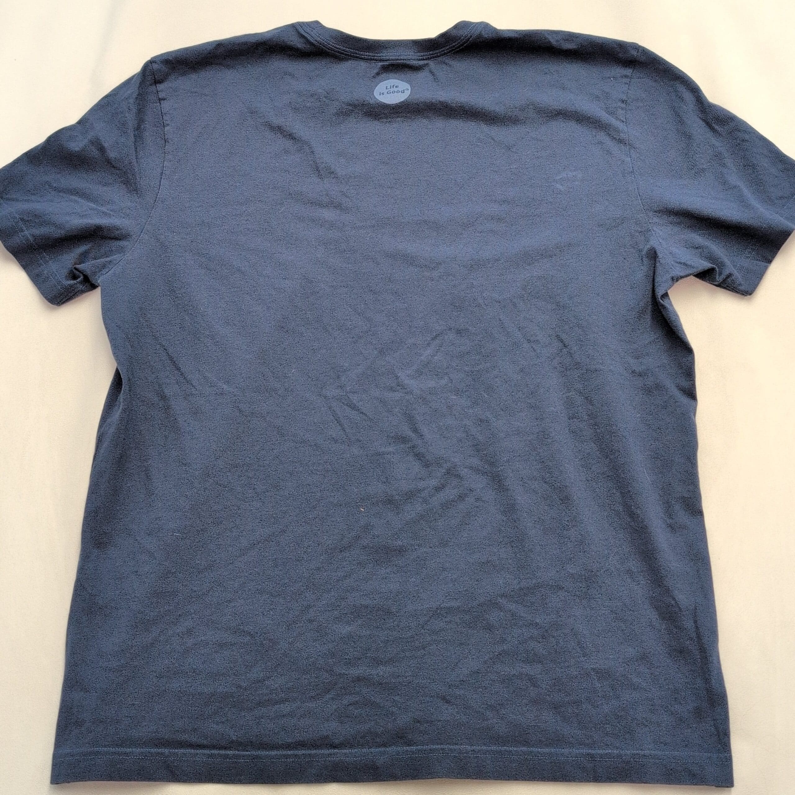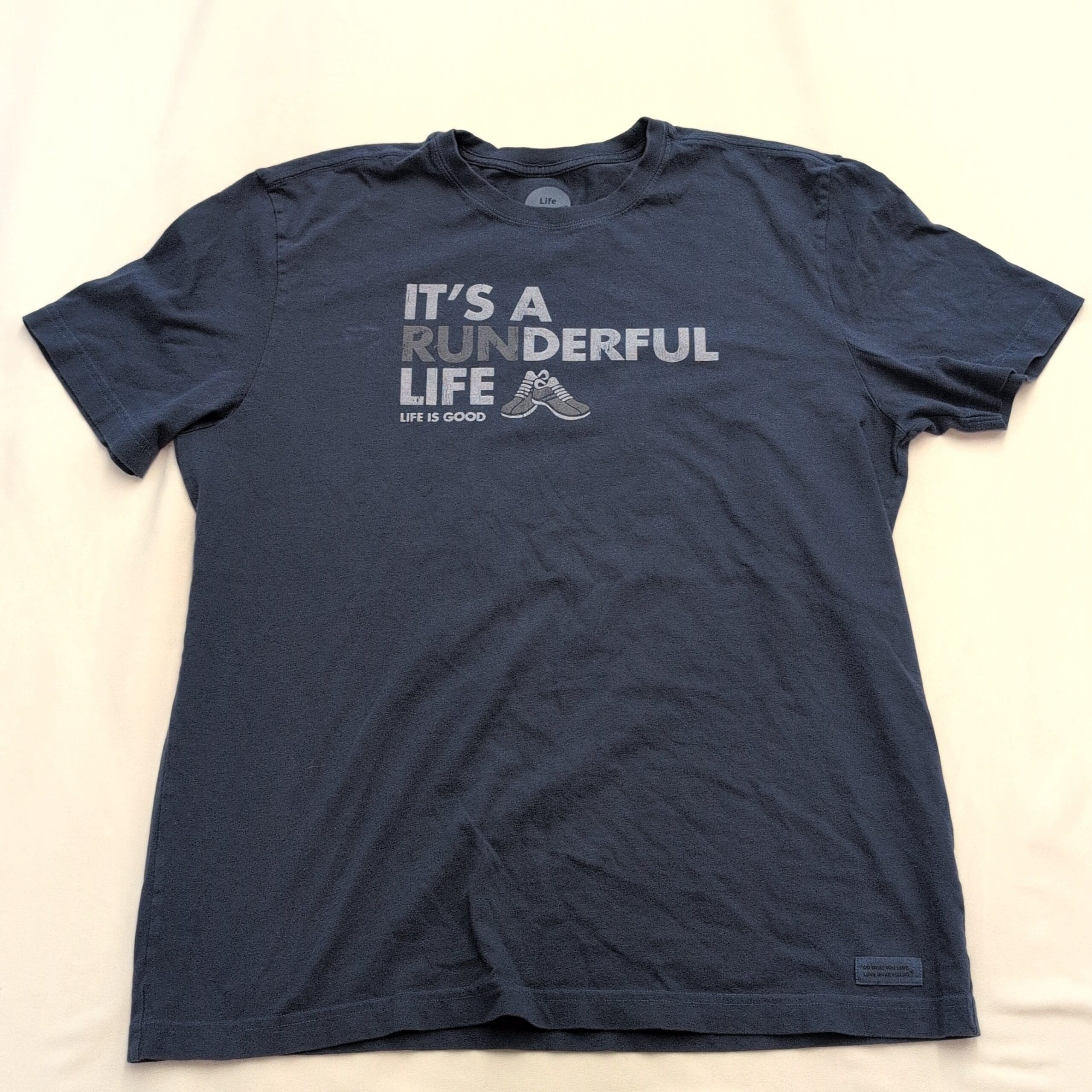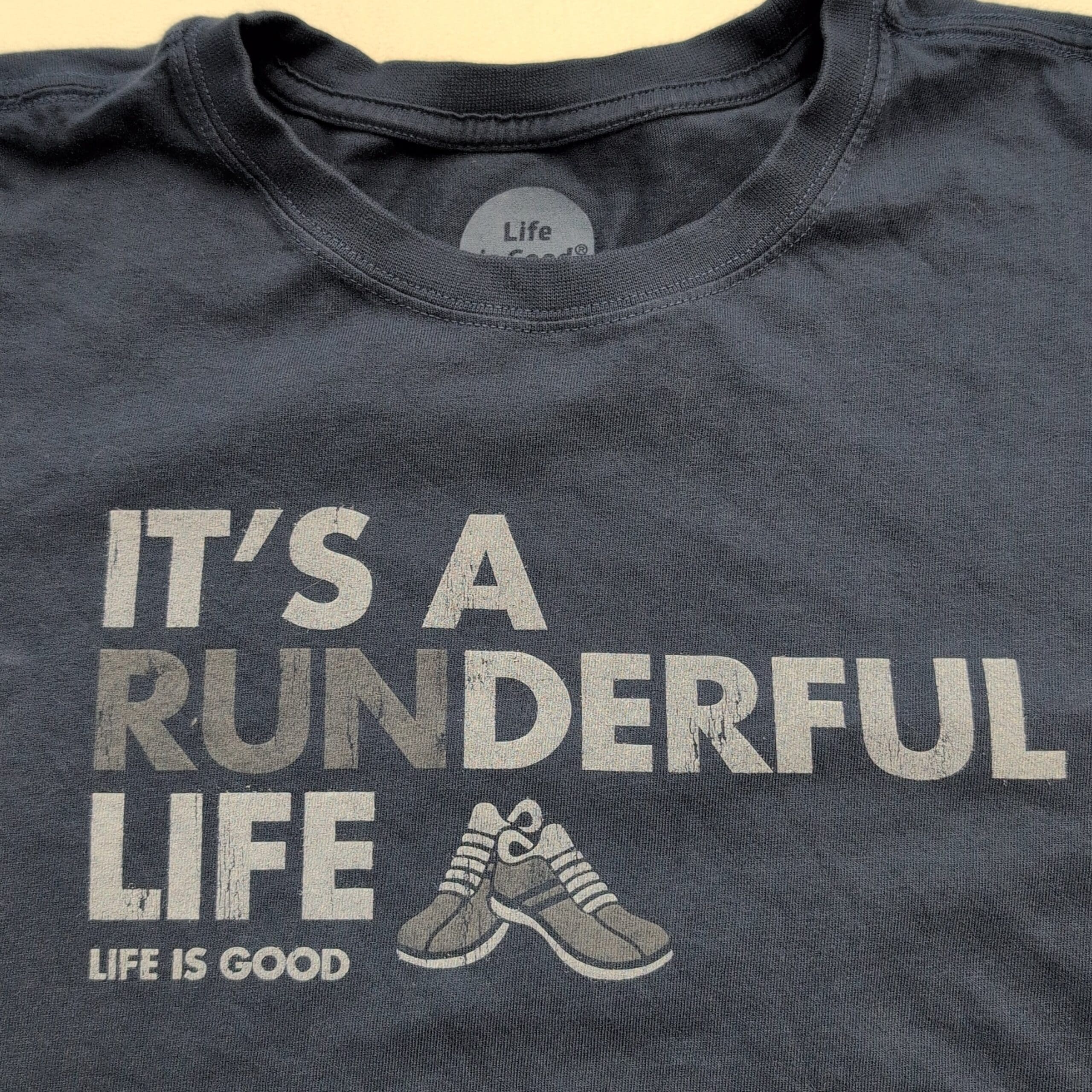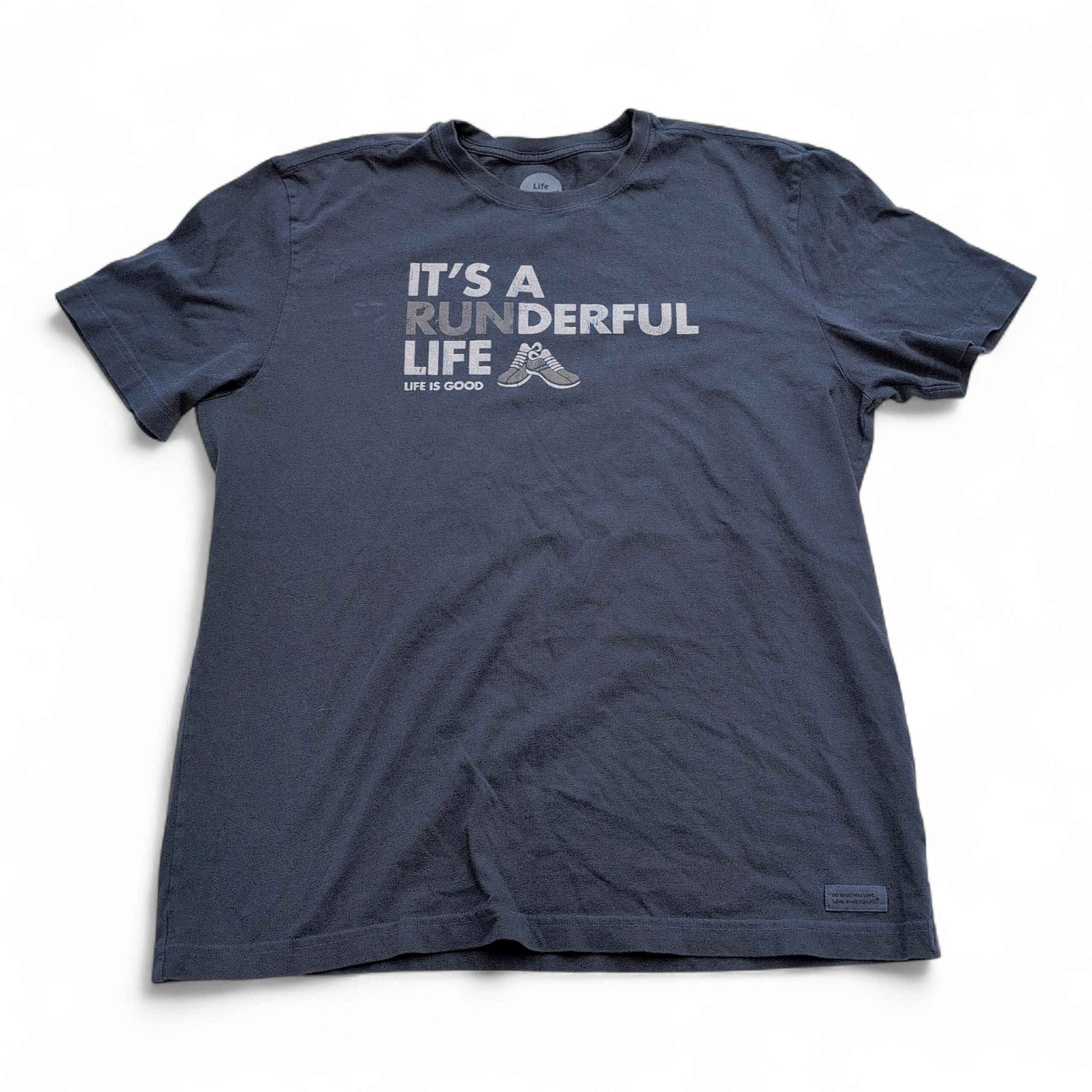 Life Is Good men’s short-sleeve crewneck graphic tee in size L (standard). Navy color with center chest “IT’S A RUNDERFUL LIFE” print and running shoe graphic. Excellent used condition with no major rips or tears; a few small discolorations are present as shown in photos. Light, everyday wear overall — classic casual tee perfect for running or relaxed outfits.
