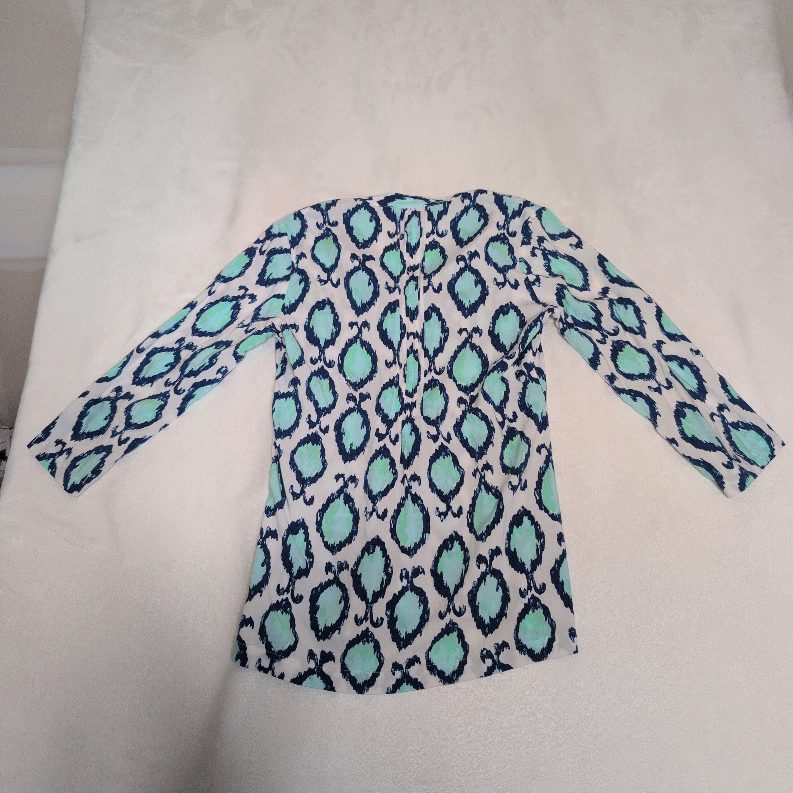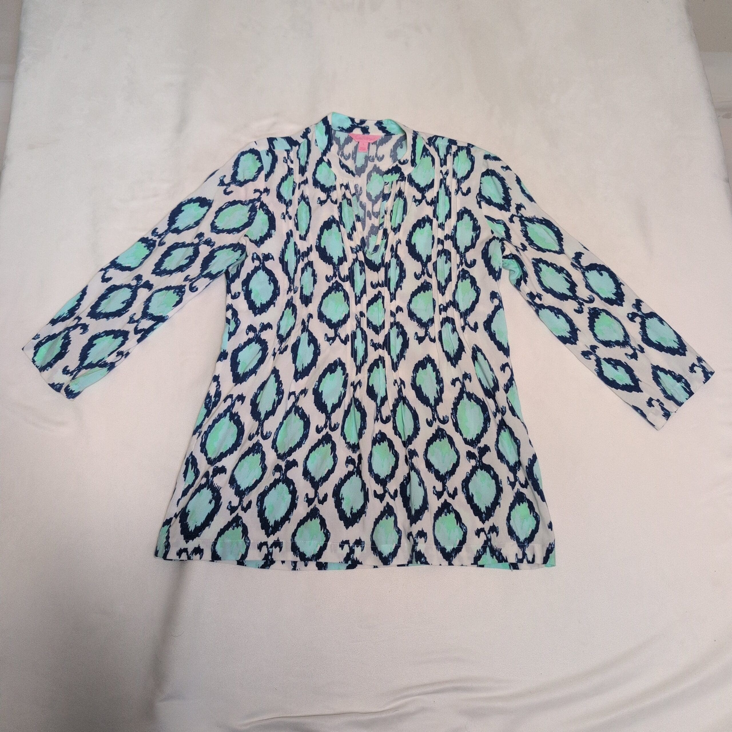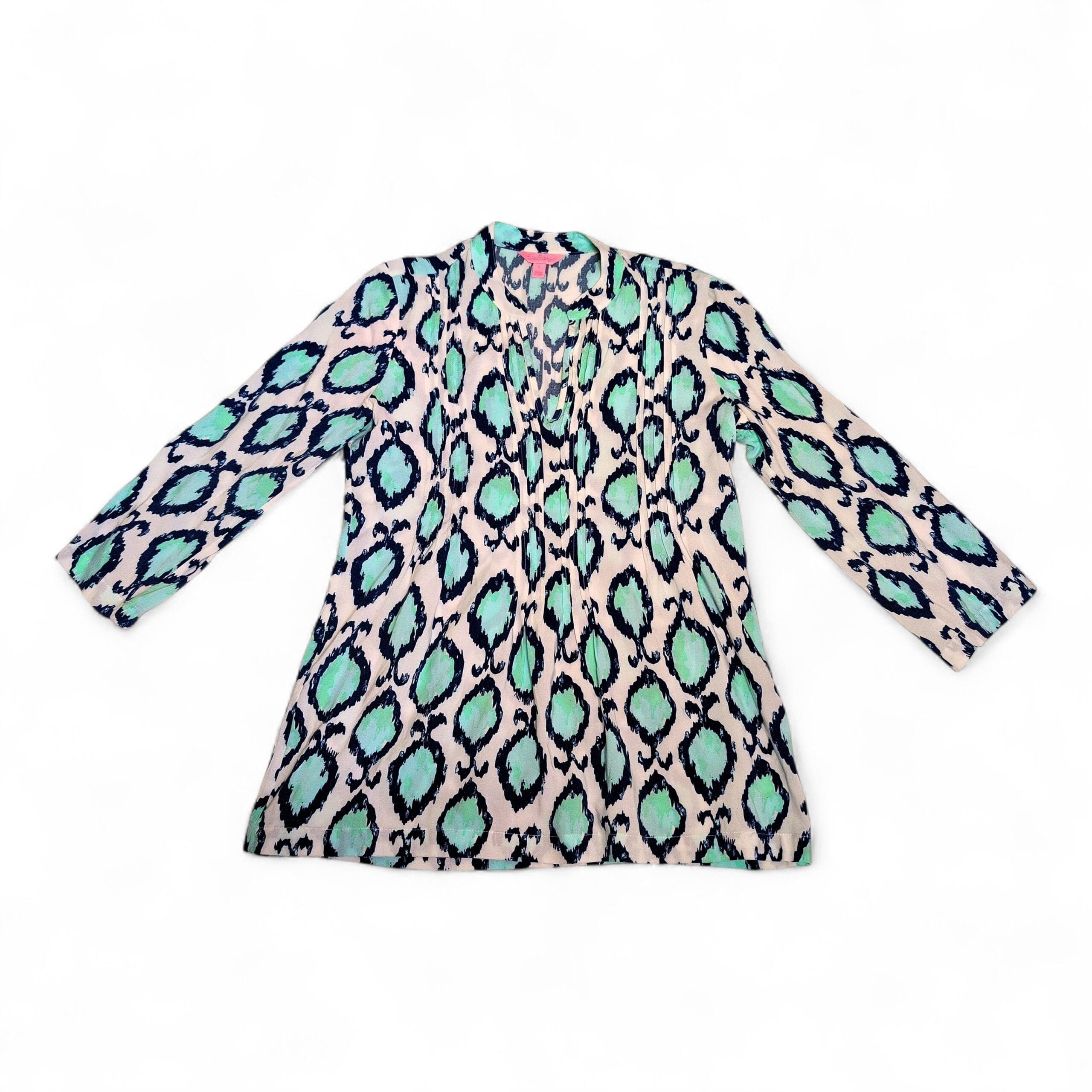 Lilly Pulitzer women’s tunic in size S. White background with aqua/teal and navy ikat-inspired print. V-neck with soft center pleating, three-quarter sleeves, and a relaxed A-line silhouette — perfect for warm-weather layering or resort wear. Gently used and free of major rips, tears, stains, or flaws; typical light wear consistent with pre-owned condition may be present.